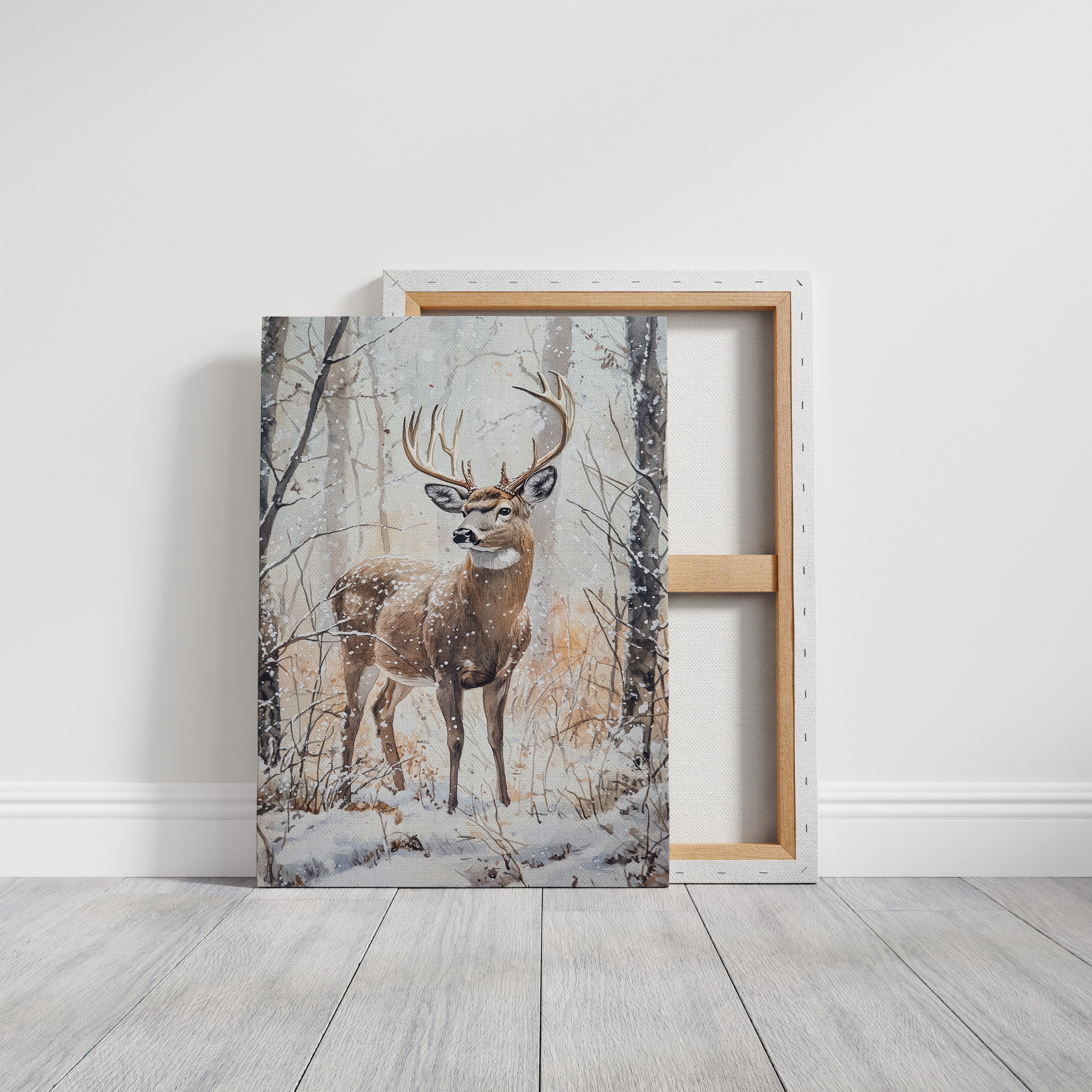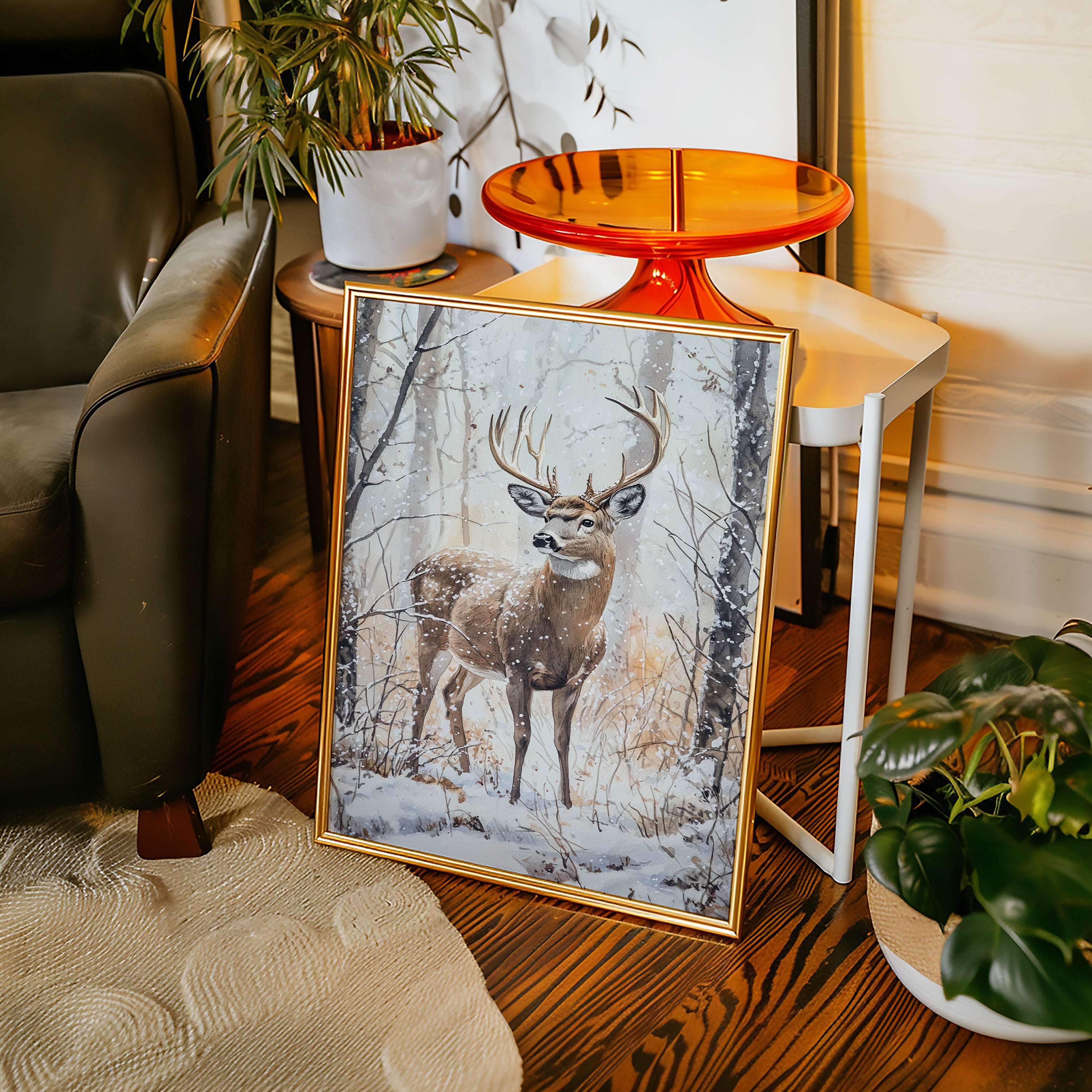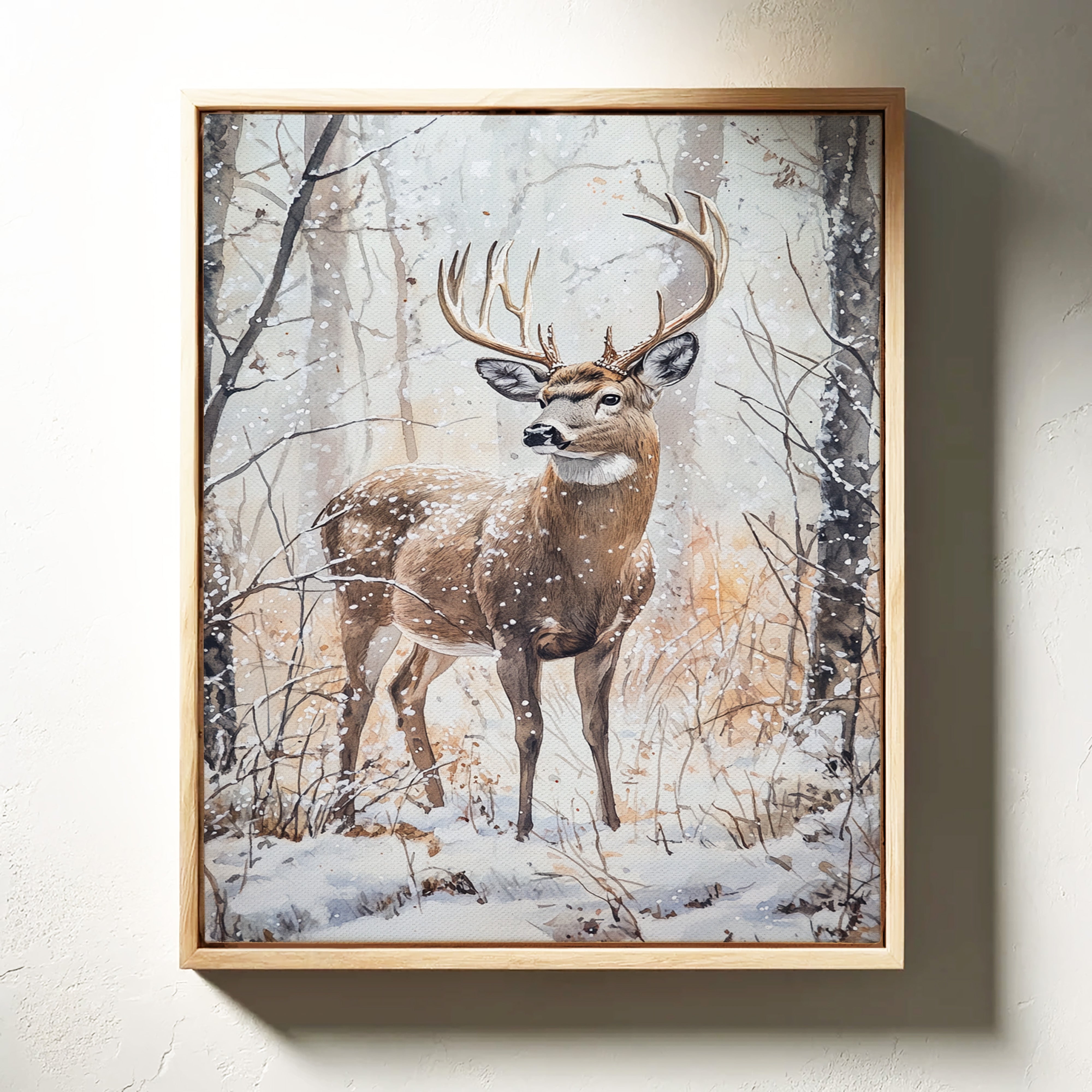 Amidst a gentle snowfall, a majestic deer stands poised, embodying the stillness of winter's embrace. This piece captures the essence of the wild, drawing you into its serene, snowy landscape. Each brush stroke reveals soft browns and whites, the warm fur contrasting beautifully with the coolness of the falling snow, evoking a sense of tranquility and awe. Imagine this captivating scene gracing your living room or study, inviting nature's peace into your home.