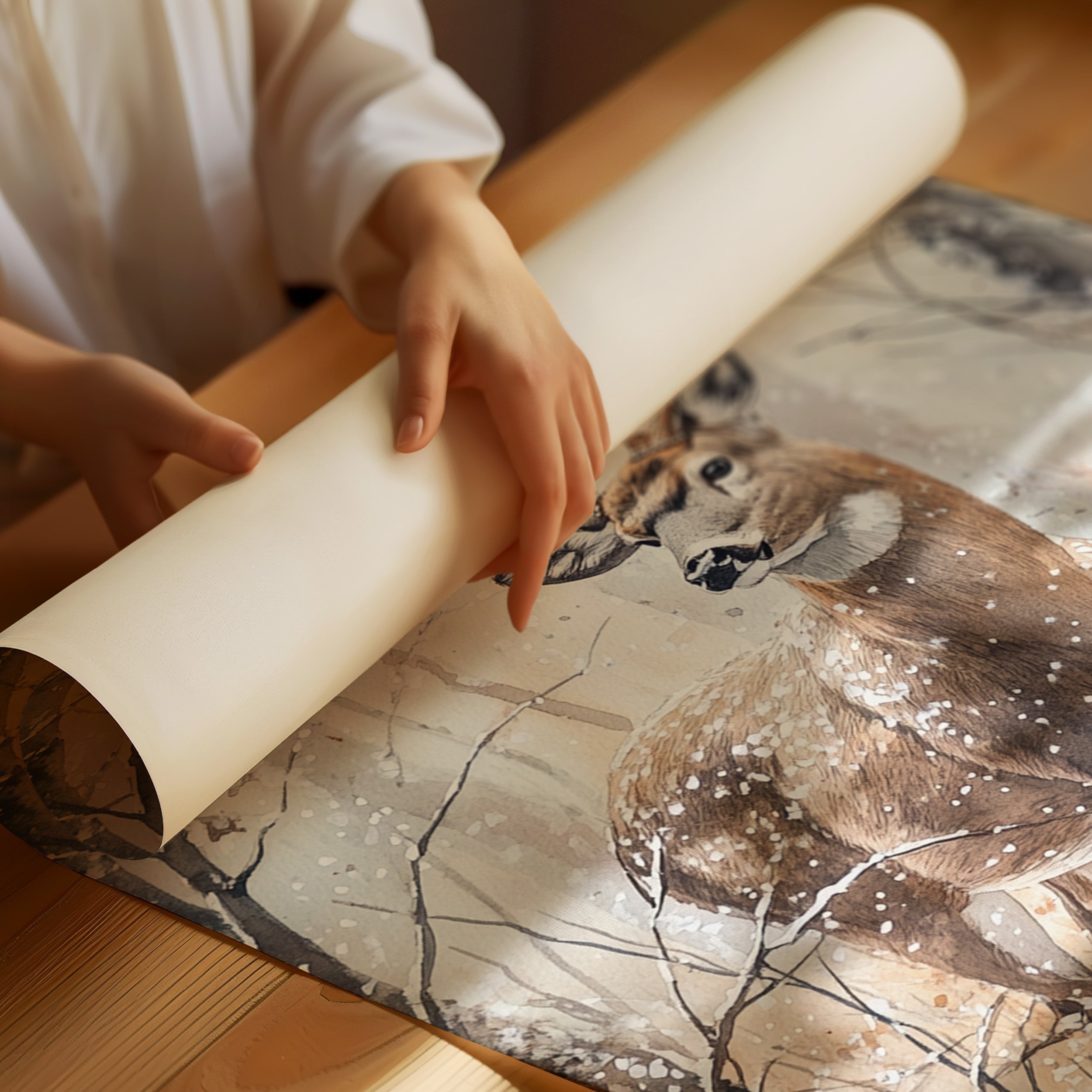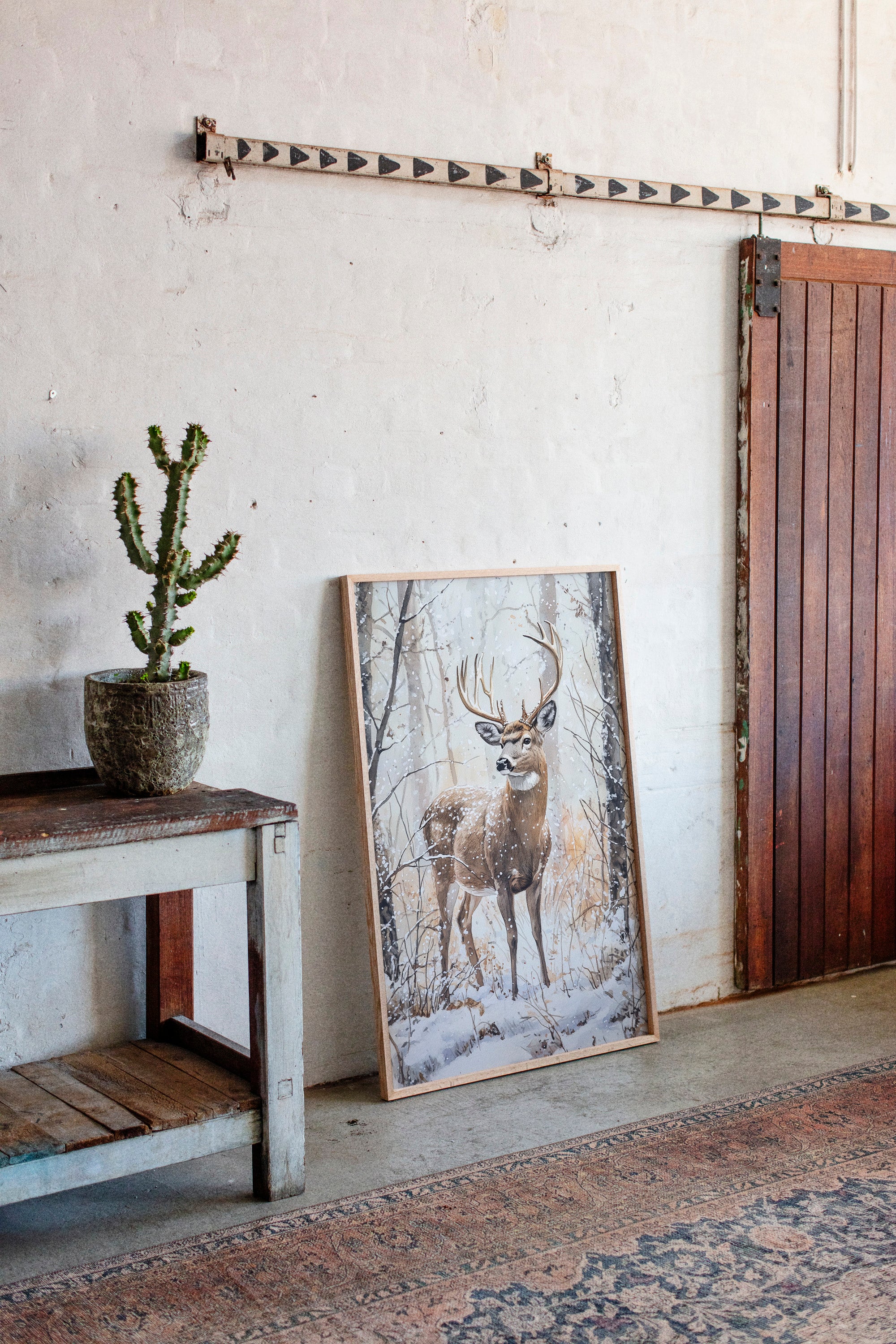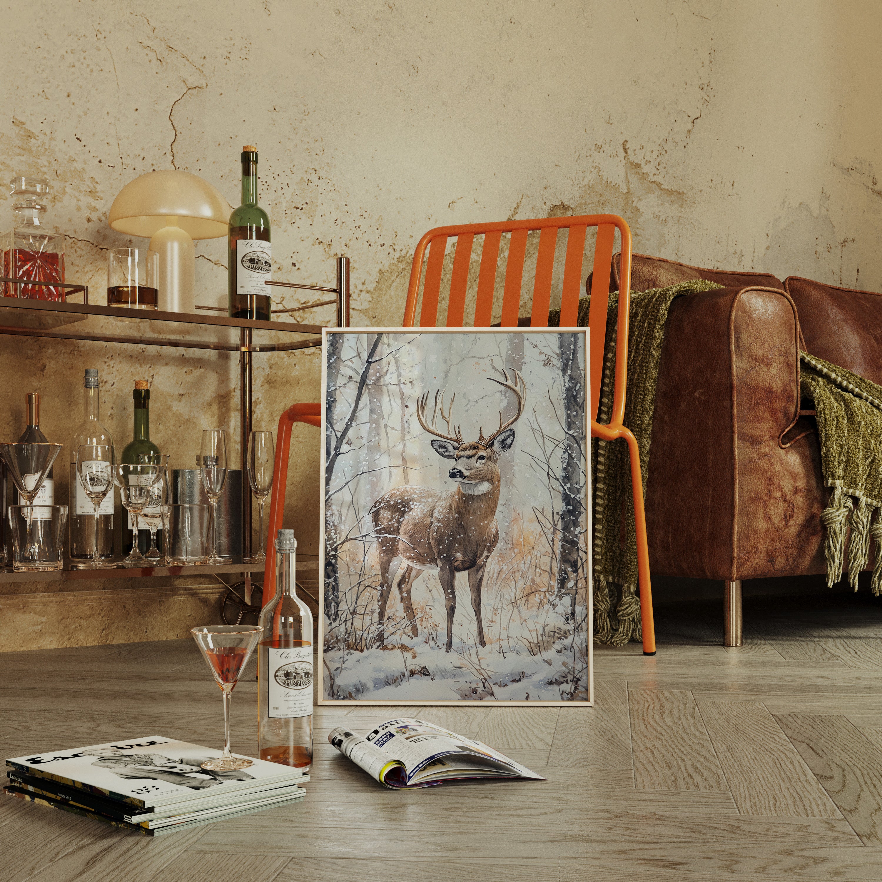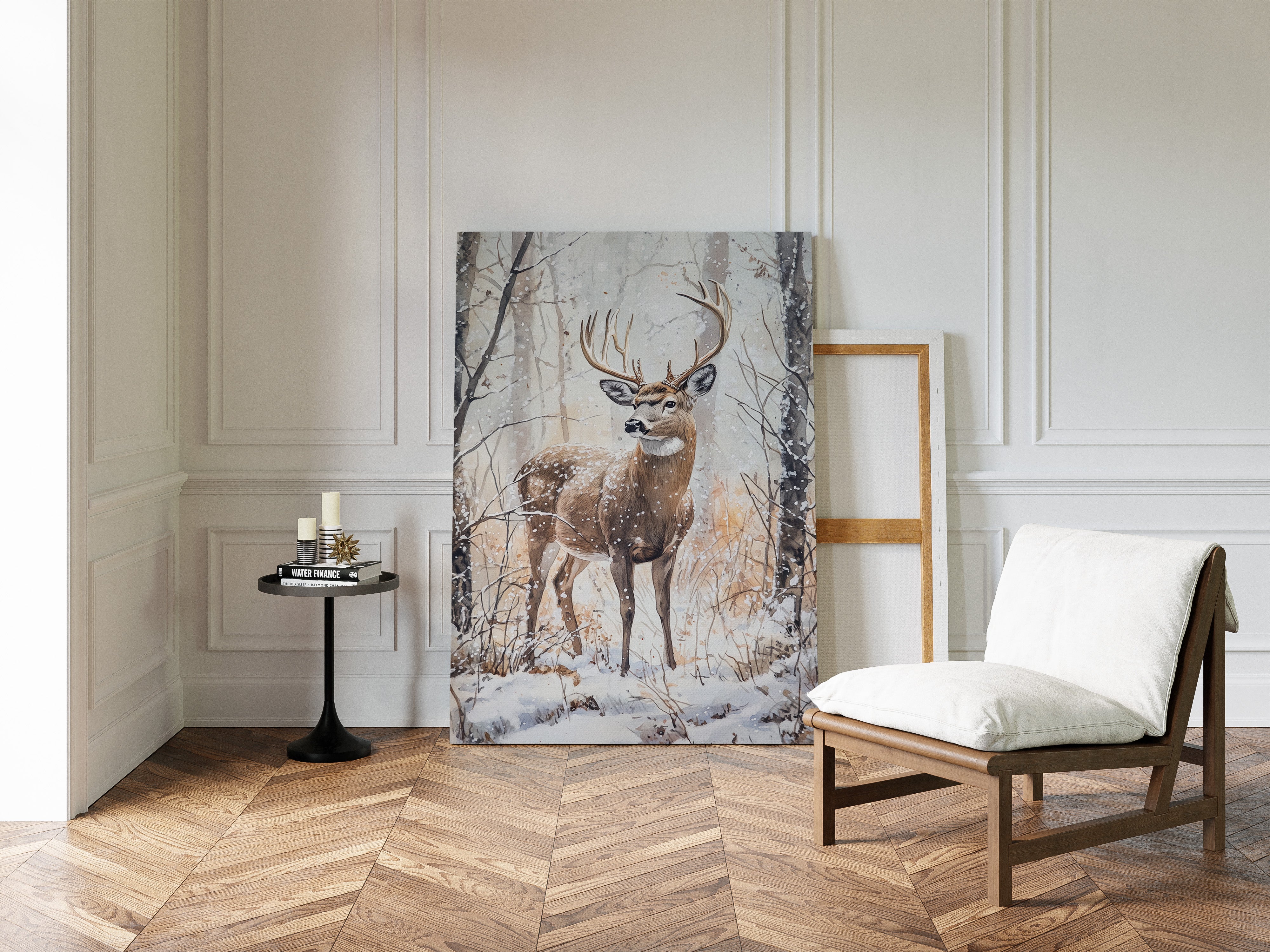 Amidst a gentle snowfall, a majestic deer stands poised, embodying the stillness of winter's embrace. This piece captures the essence of the wild, drawing you into its serene, snowy landscape. Each brush stroke reveals soft browns and whites, the warm fur contrasting beautifully with the coolness of the falling snow, evoking a sense of tranquility and awe. Imagine this captivating scene gracing your living room or study, inviting nature's peace into your home.