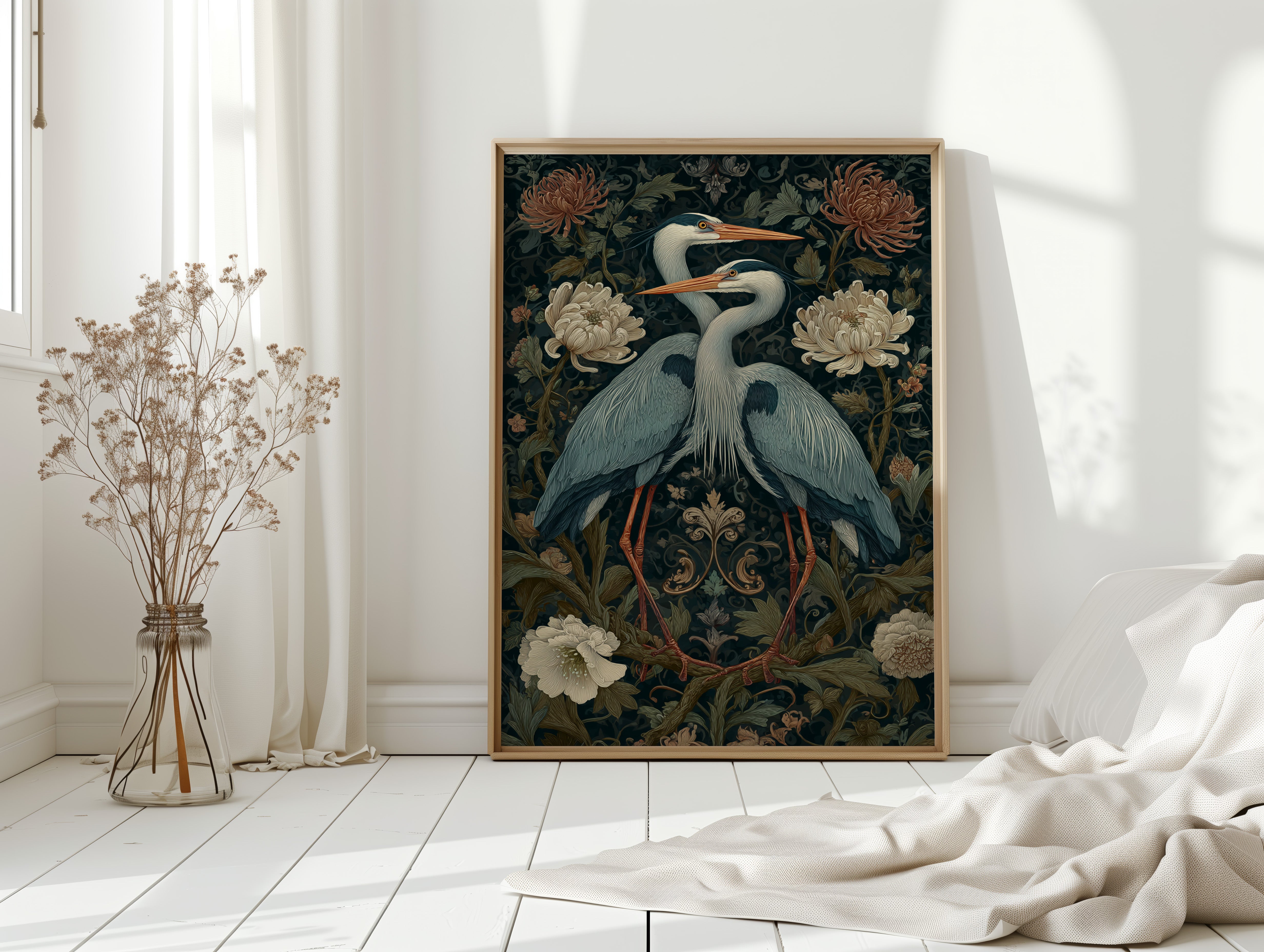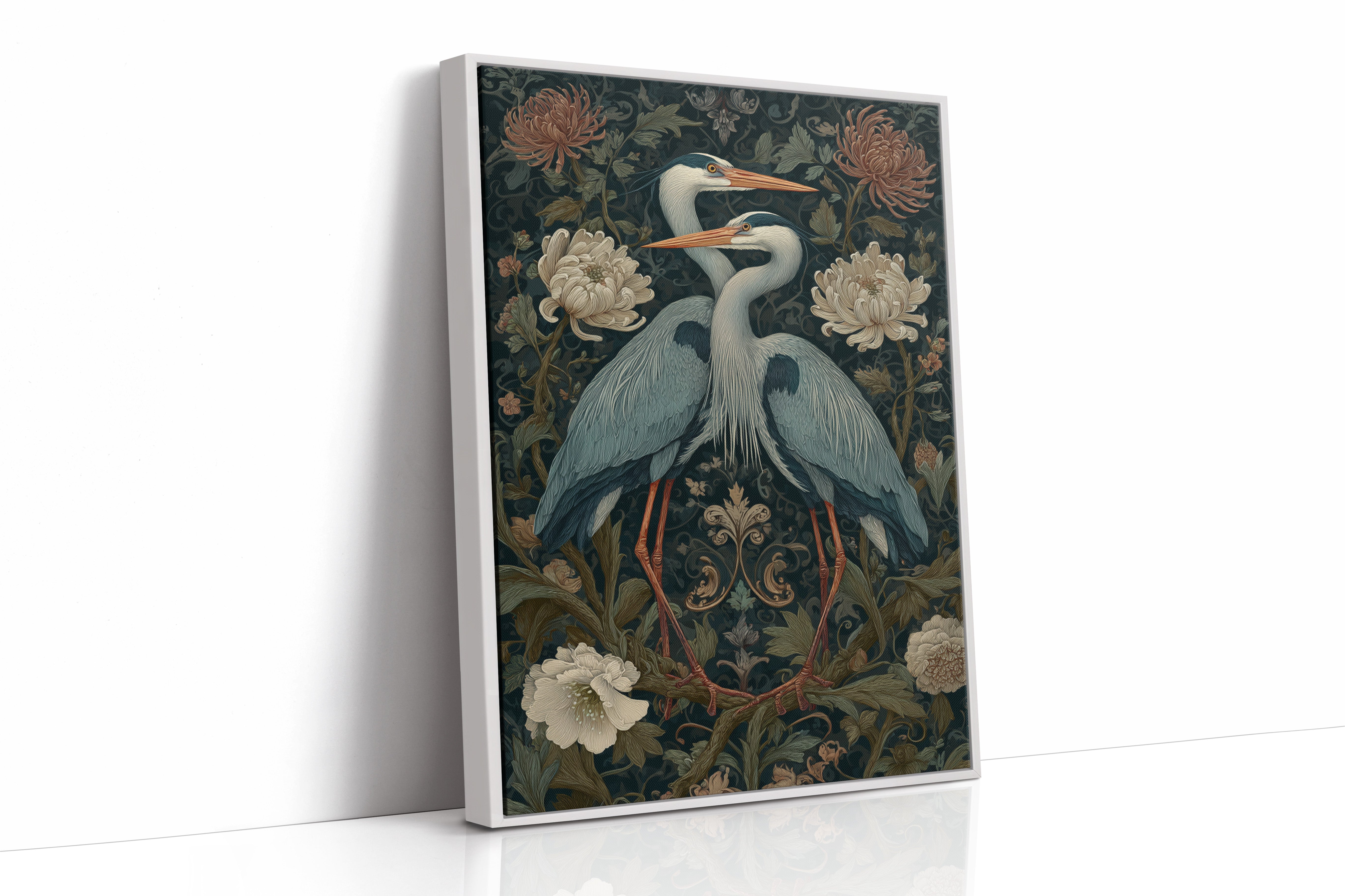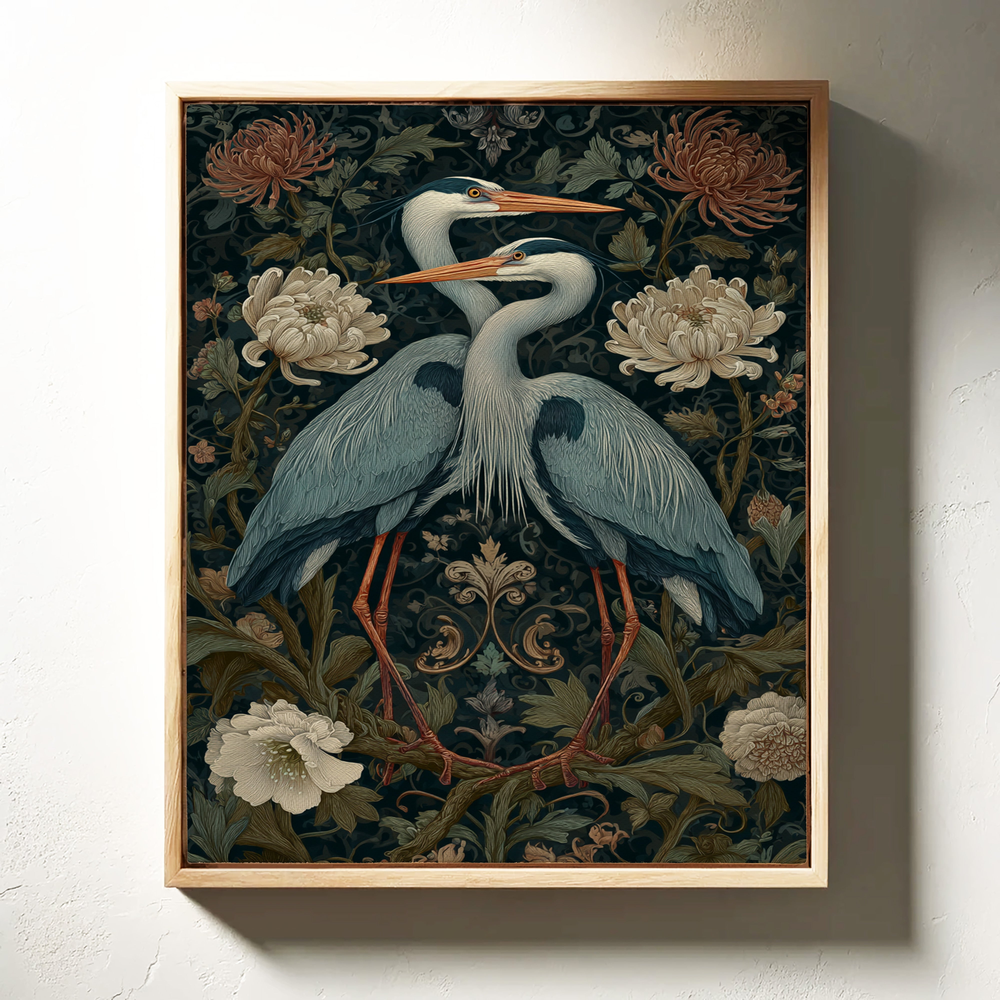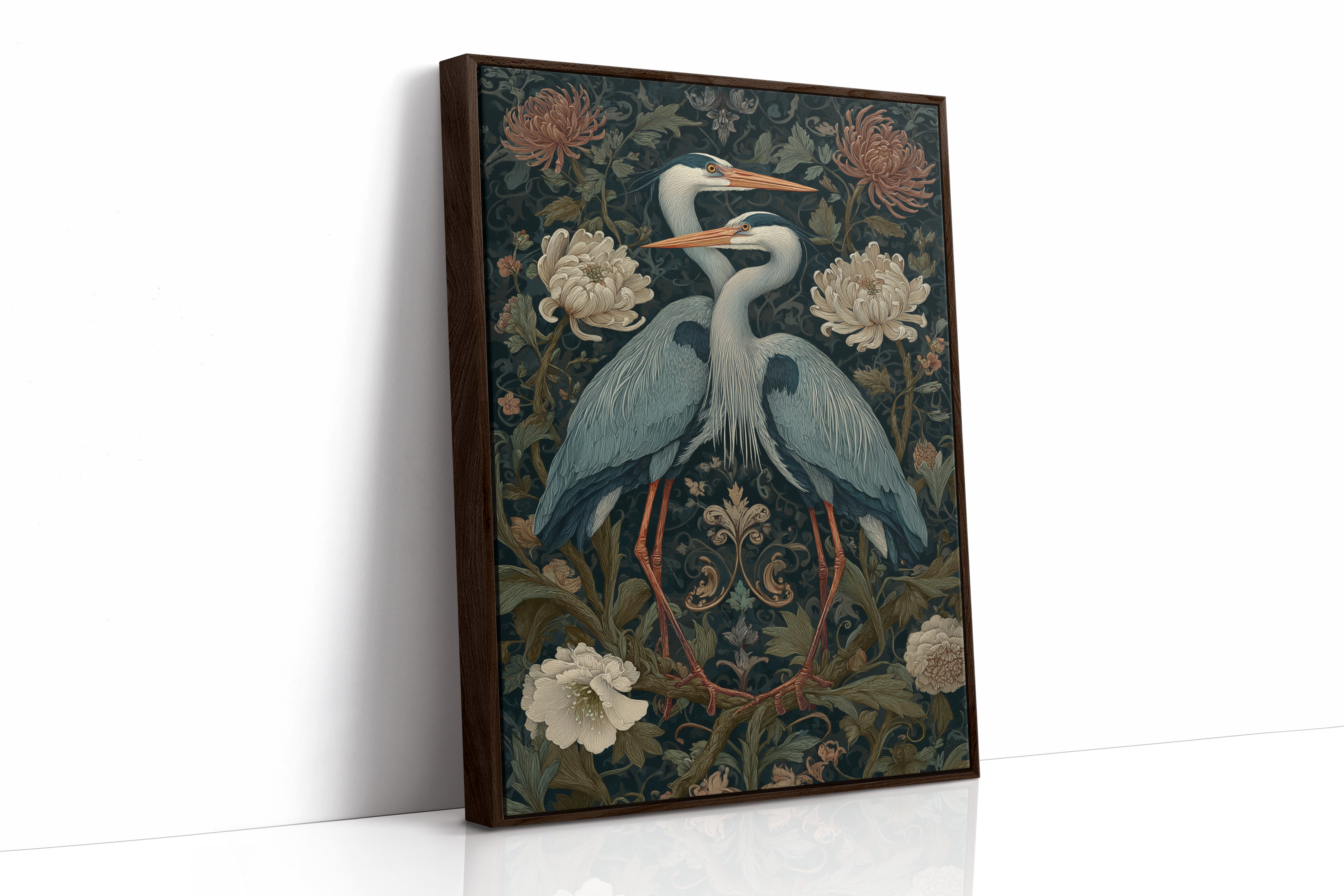 Amidst a tapestry of blooms, two herons stand poised, their elegance a testament to the beauty of companionship. This piece embodies the artisanal spirit, merging nature with intricate design. The rich colors of the herons contrast beautifully with the soft florals, each feather and petal meticulously rendered to evoke a sense of tranquility and connection. Perfect for a serene corner of your living room or a tranquil study, this artwork invites reflection and appreciation for the natural world.