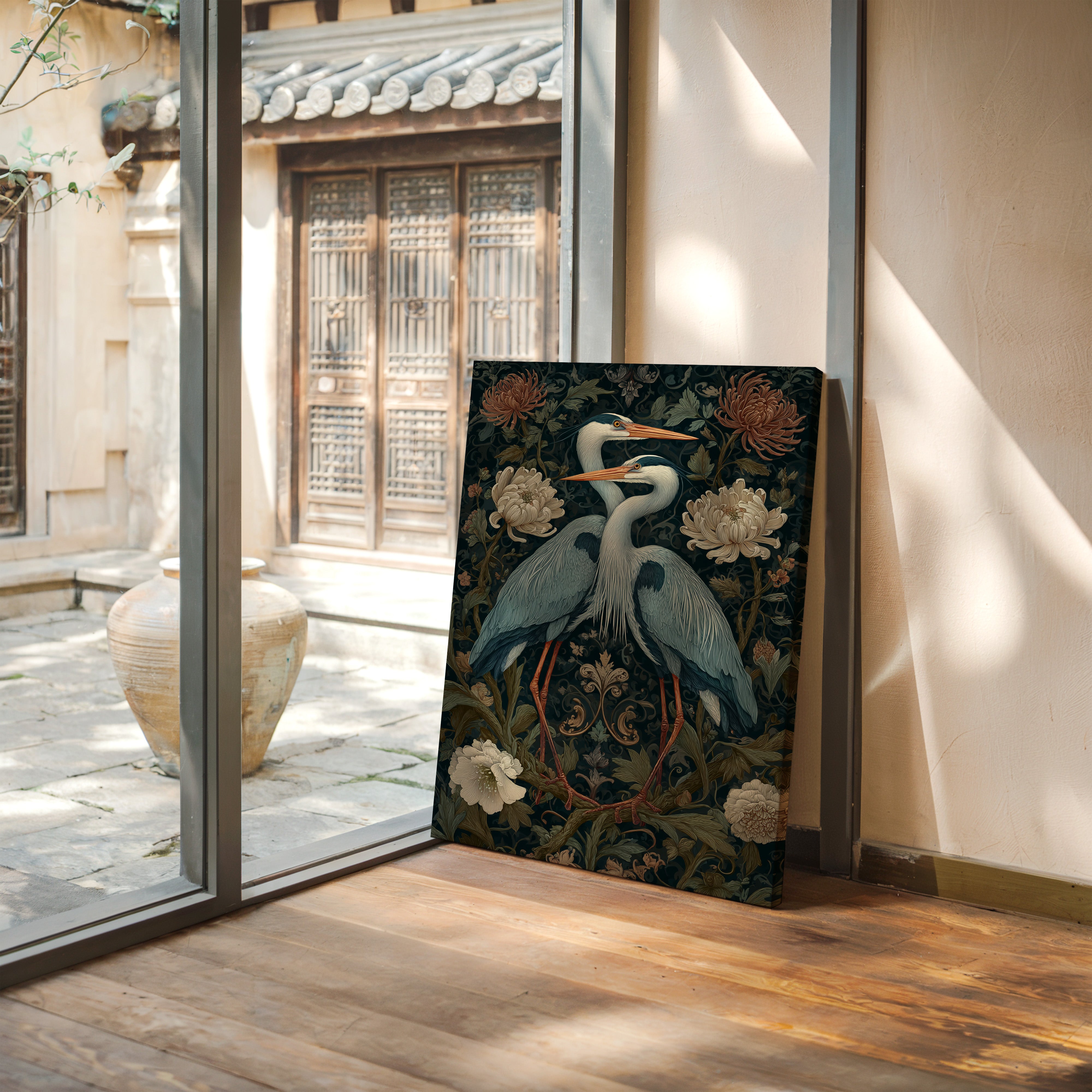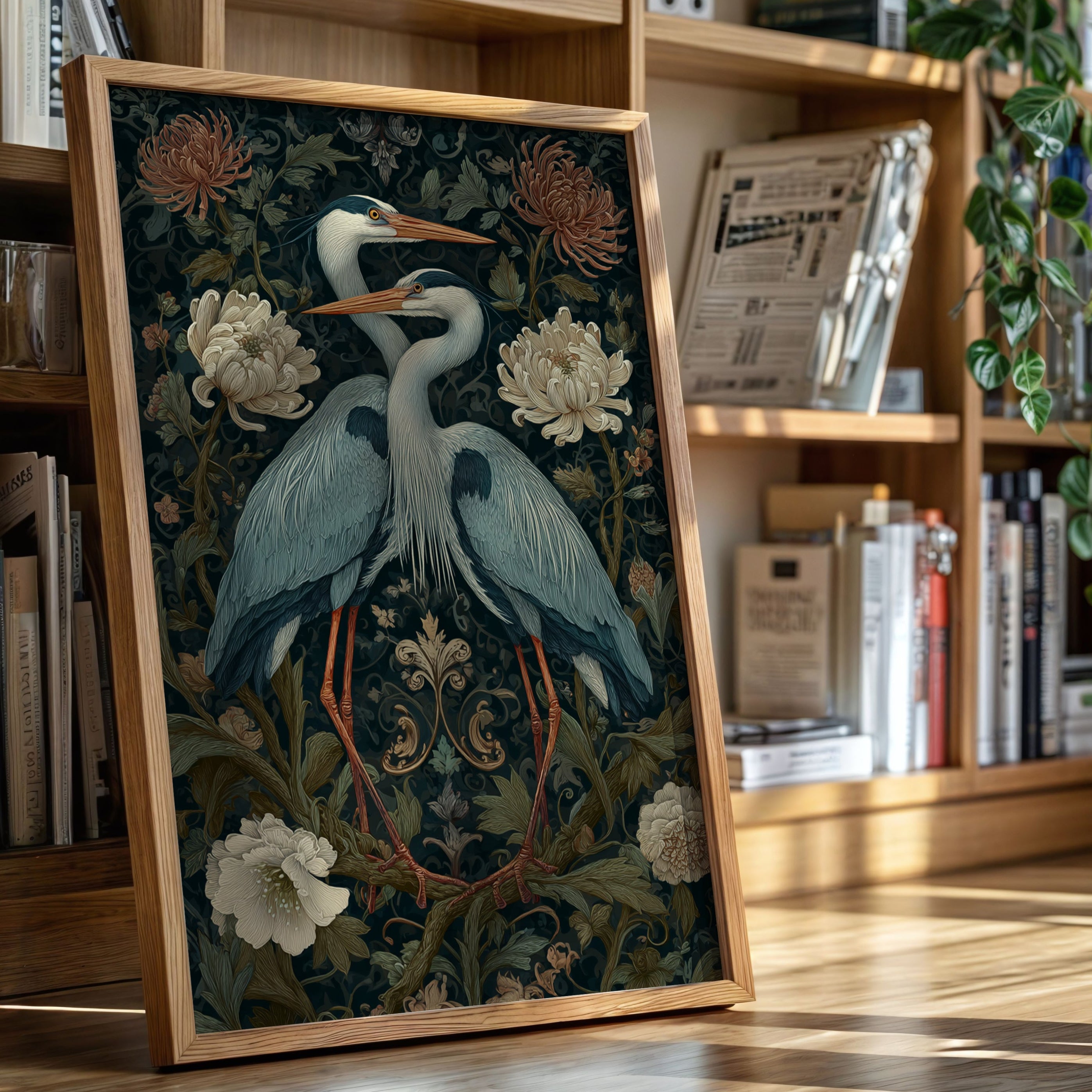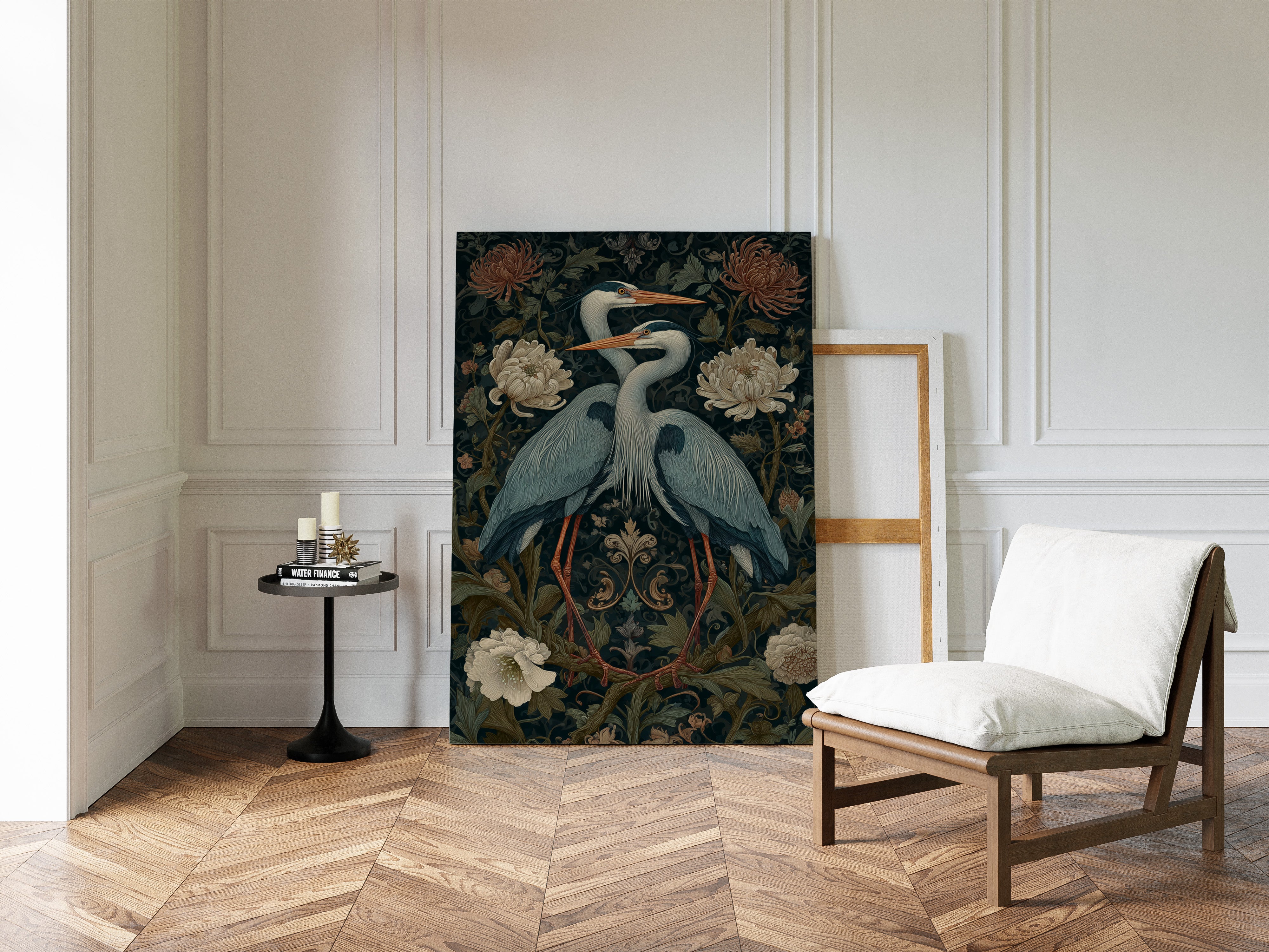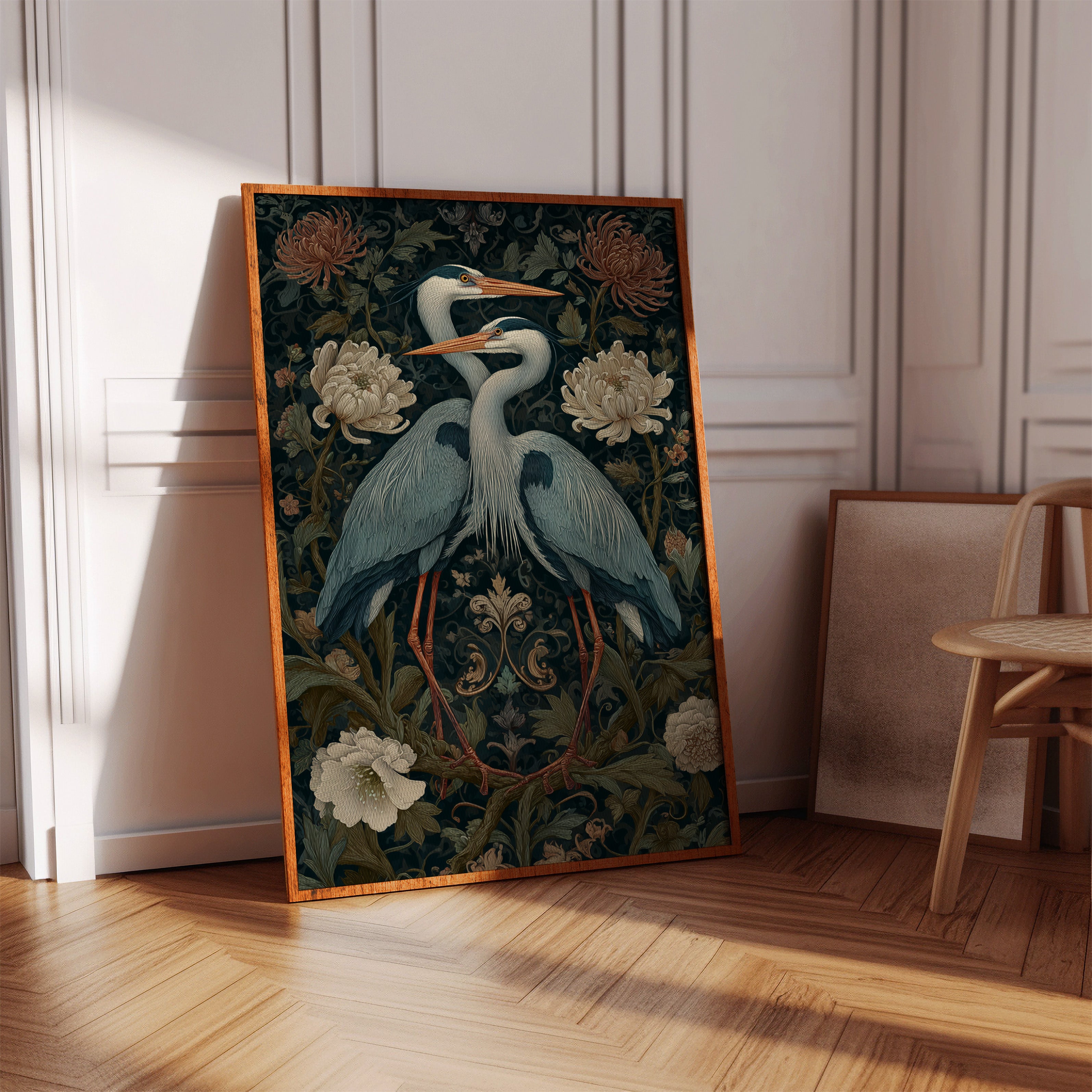 Amidst a tapestry of blooms, two herons stand poised, their elegance a testament to the beauty of companionship. This piece embodies the artisanal spirit, merging nature with intricate design. The rich colors of the herons contrast beautifully with the soft florals, each feather and petal meticulously rendered to evoke a sense of tranquility and connection. Perfect for a serene corner of your living room or a tranquil study, this artwork invites reflection and appreciation for the natural world.