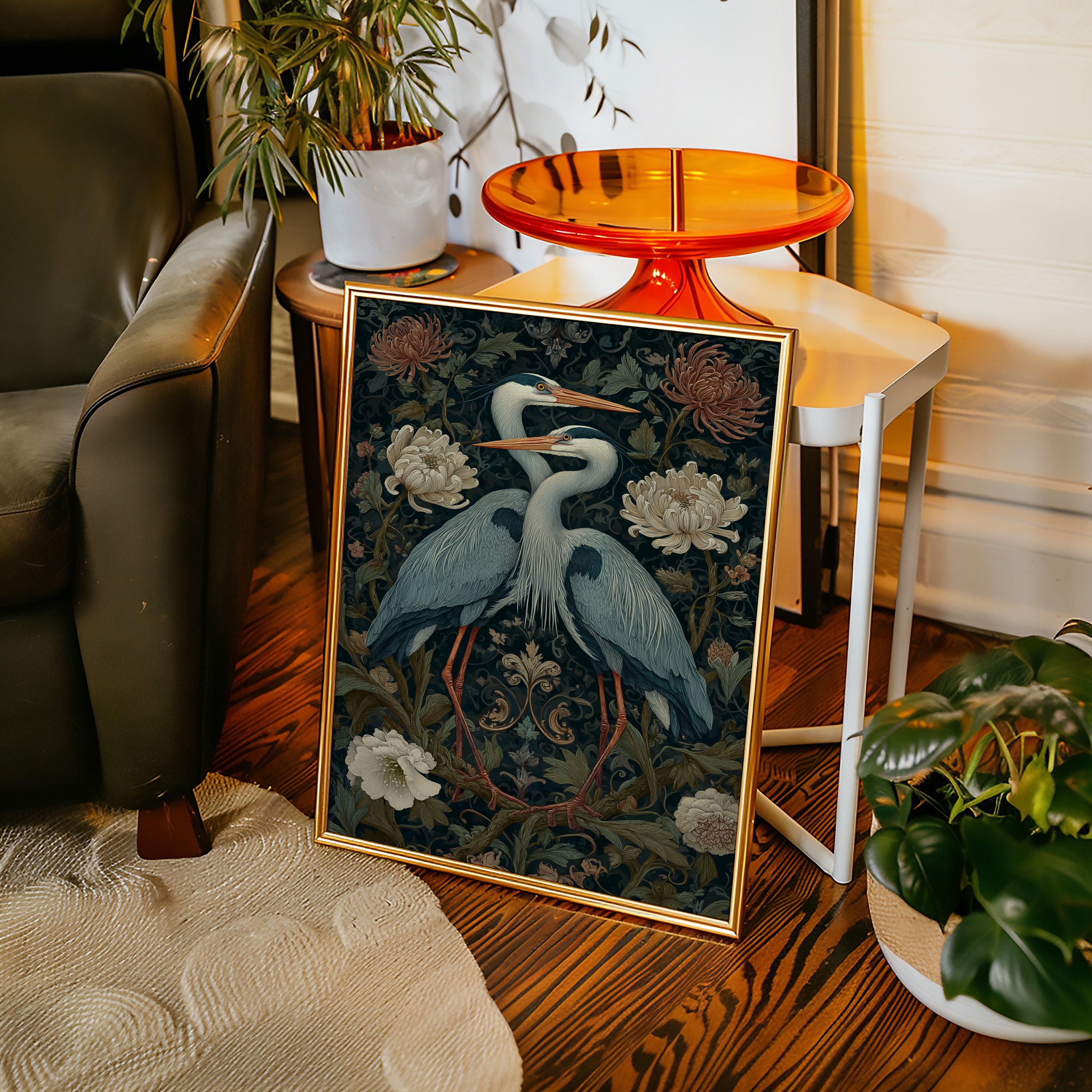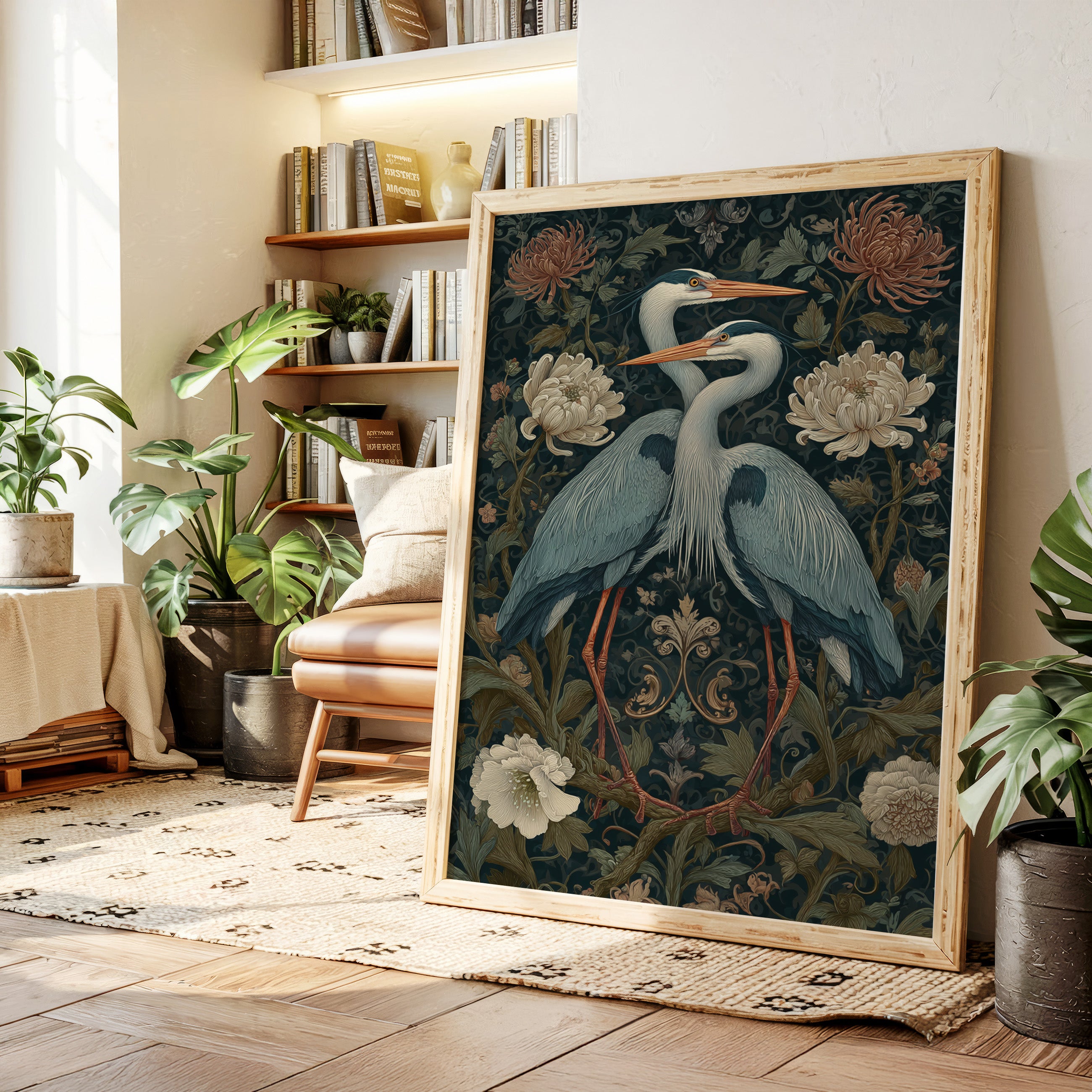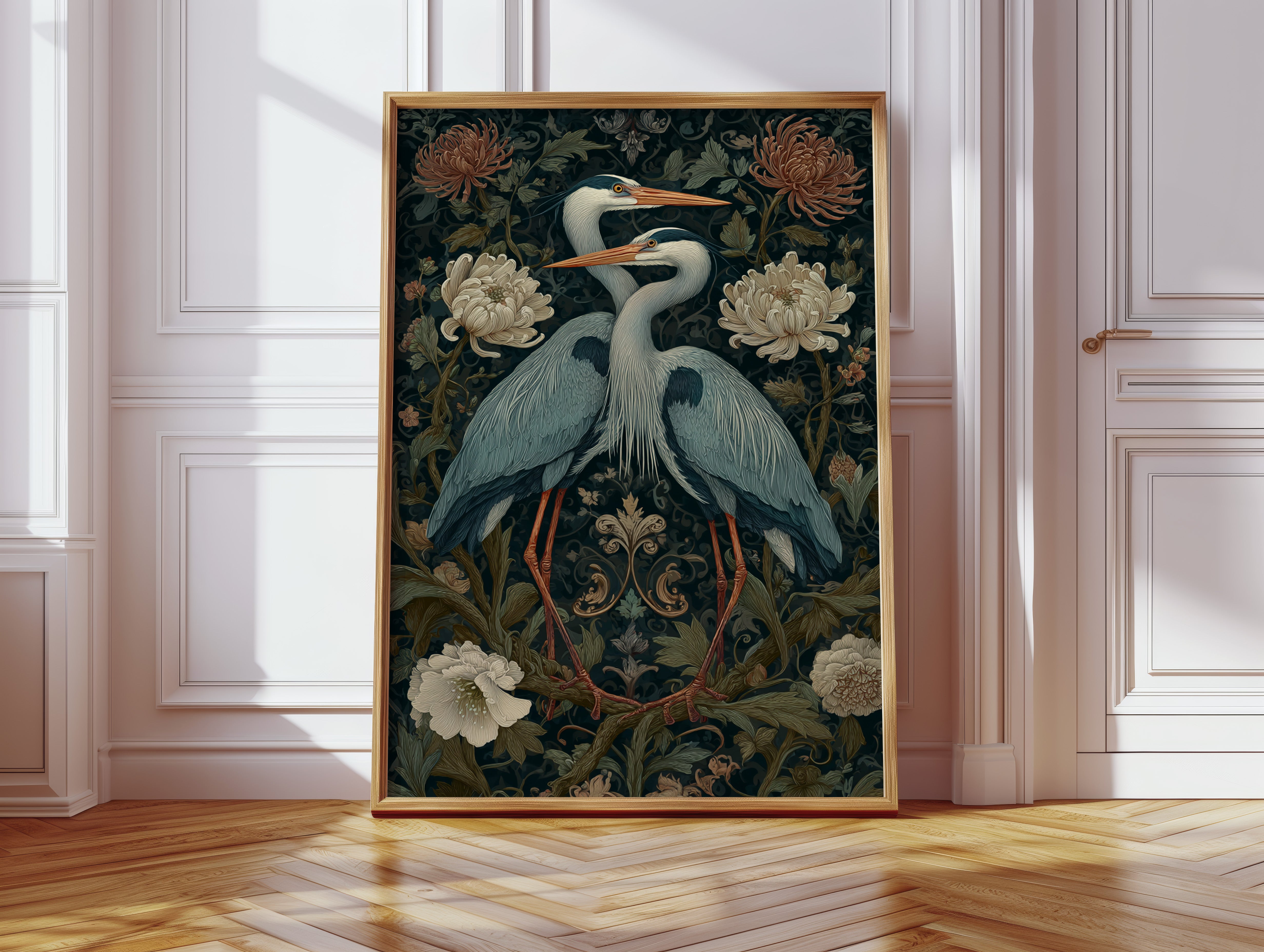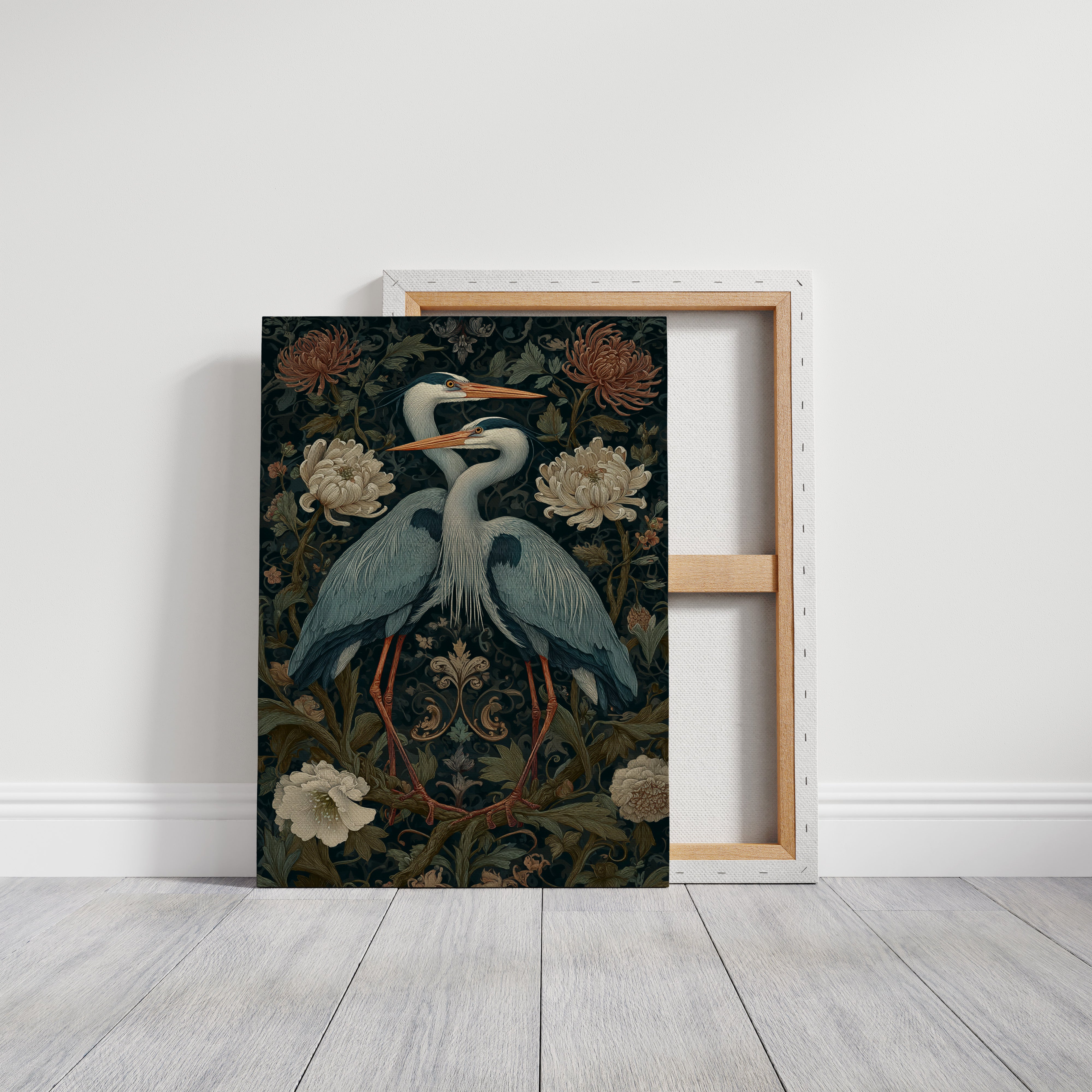 Amidst a tapestry of blooms, two herons stand poised, their elegance a testament to the beauty of companionship. This piece embodies the artisanal spirit, merging nature with intricate design. The rich colors of the herons contrast beautifully with the soft florals, each feather and petal meticulously rendered to evoke a sense of tranquility and connection. Perfect for a serene corner of your living room or a tranquil study, this artwork invites reflection and appreciation for the natural world.