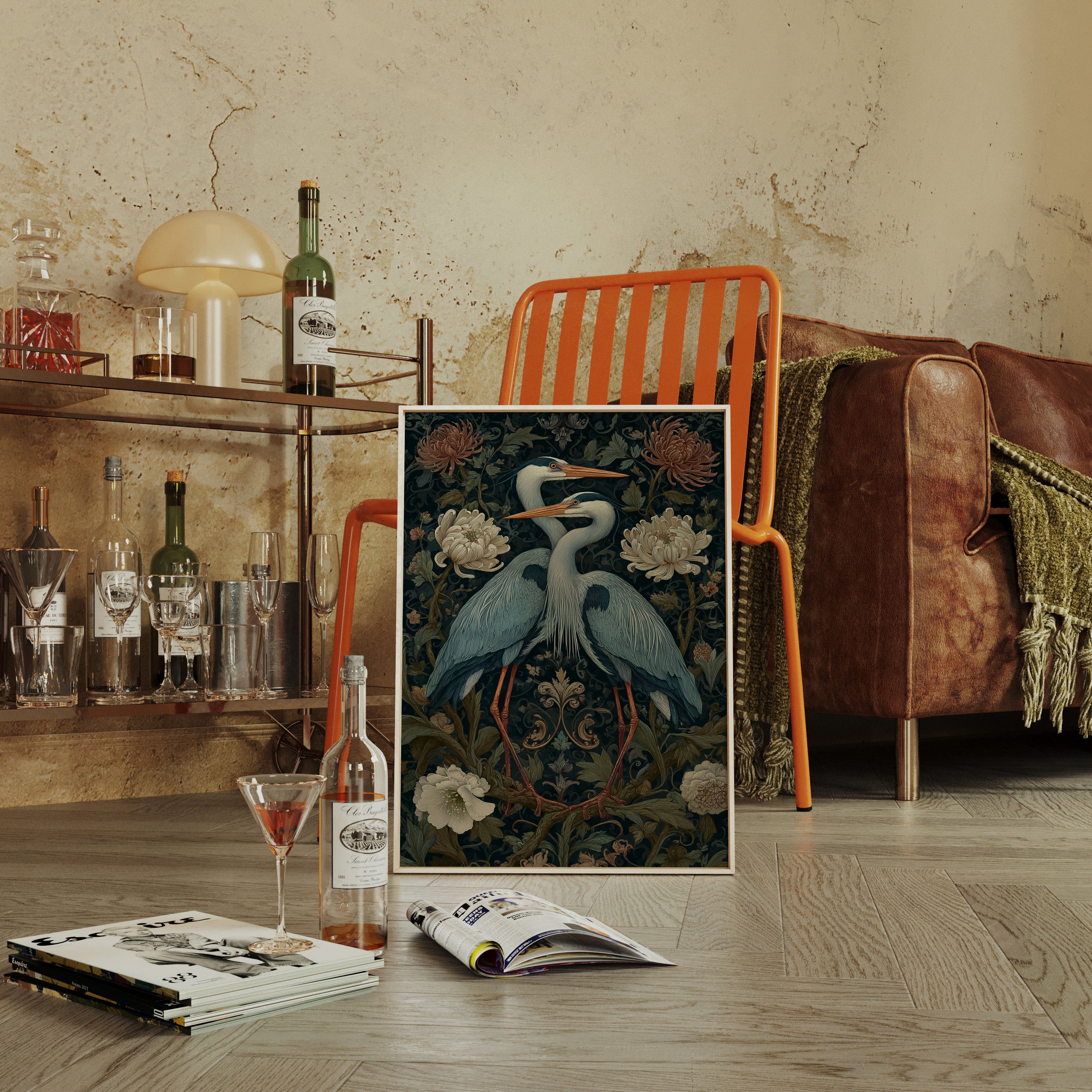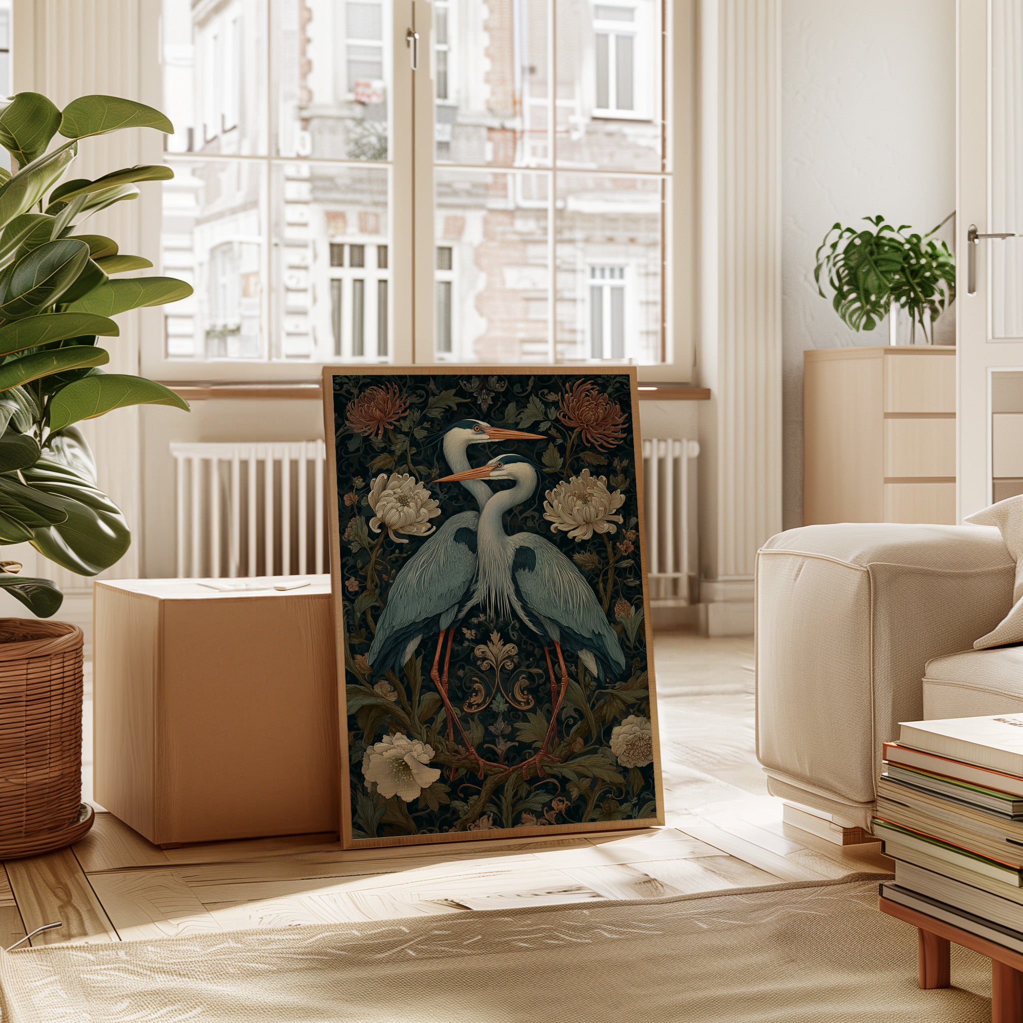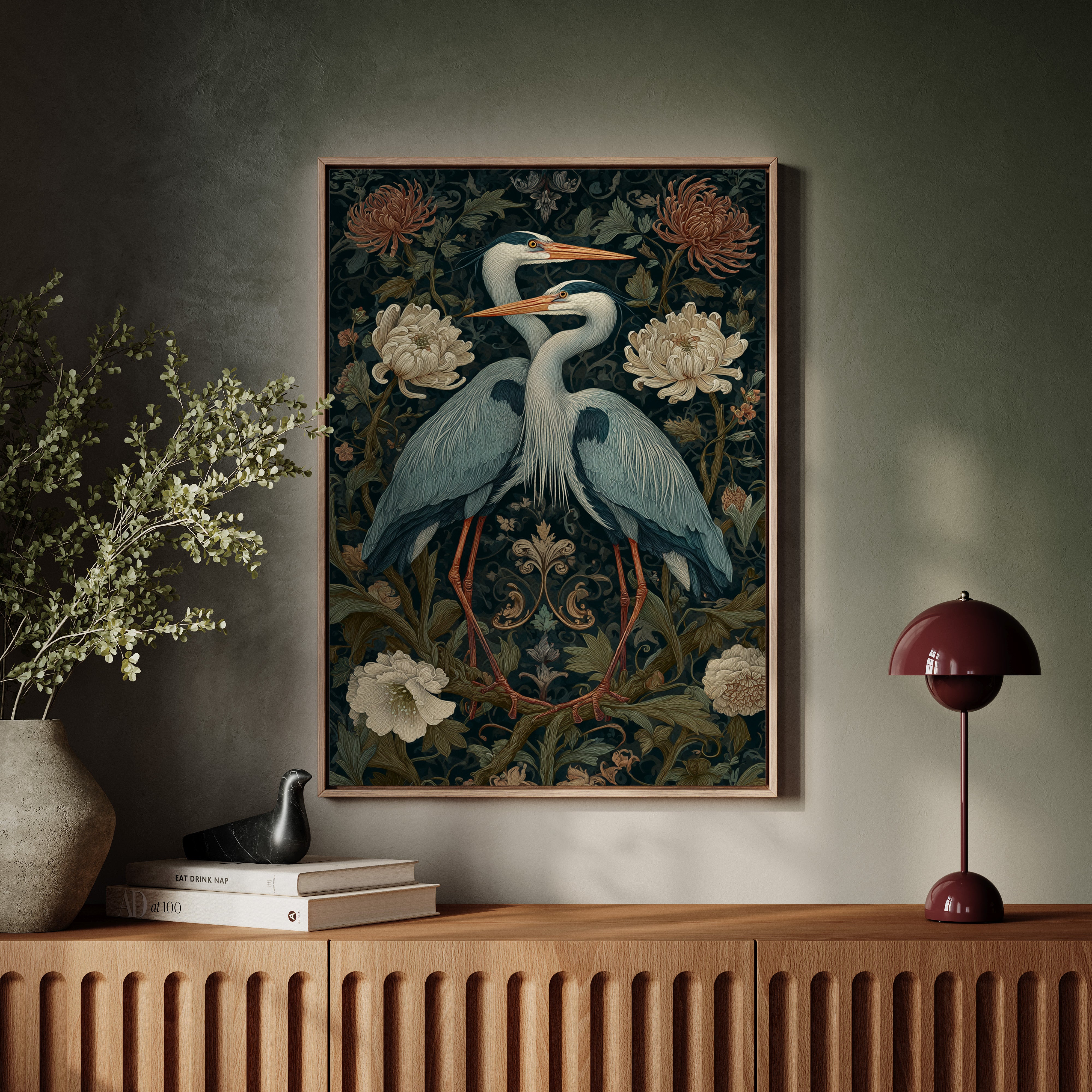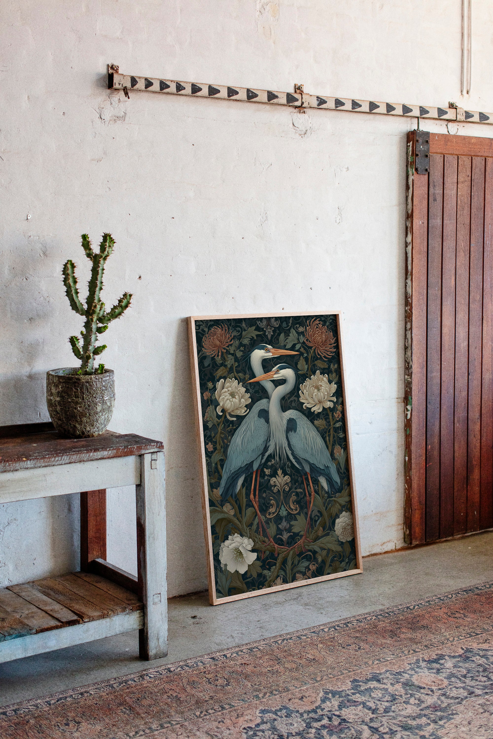 Amidst a tapestry of blooms, two herons stand poised, their elegance a testament to the beauty of companionship. This piece embodies the artisanal spirit, merging nature with intricate design. The rich colors of the herons contrast beautifully with the soft florals, each feather and petal meticulously rendered to evoke a sense of tranquility and connection. Perfect for a serene corner of your living room or a tranquil study, this artwork invites reflection and appreciation for the natural world.