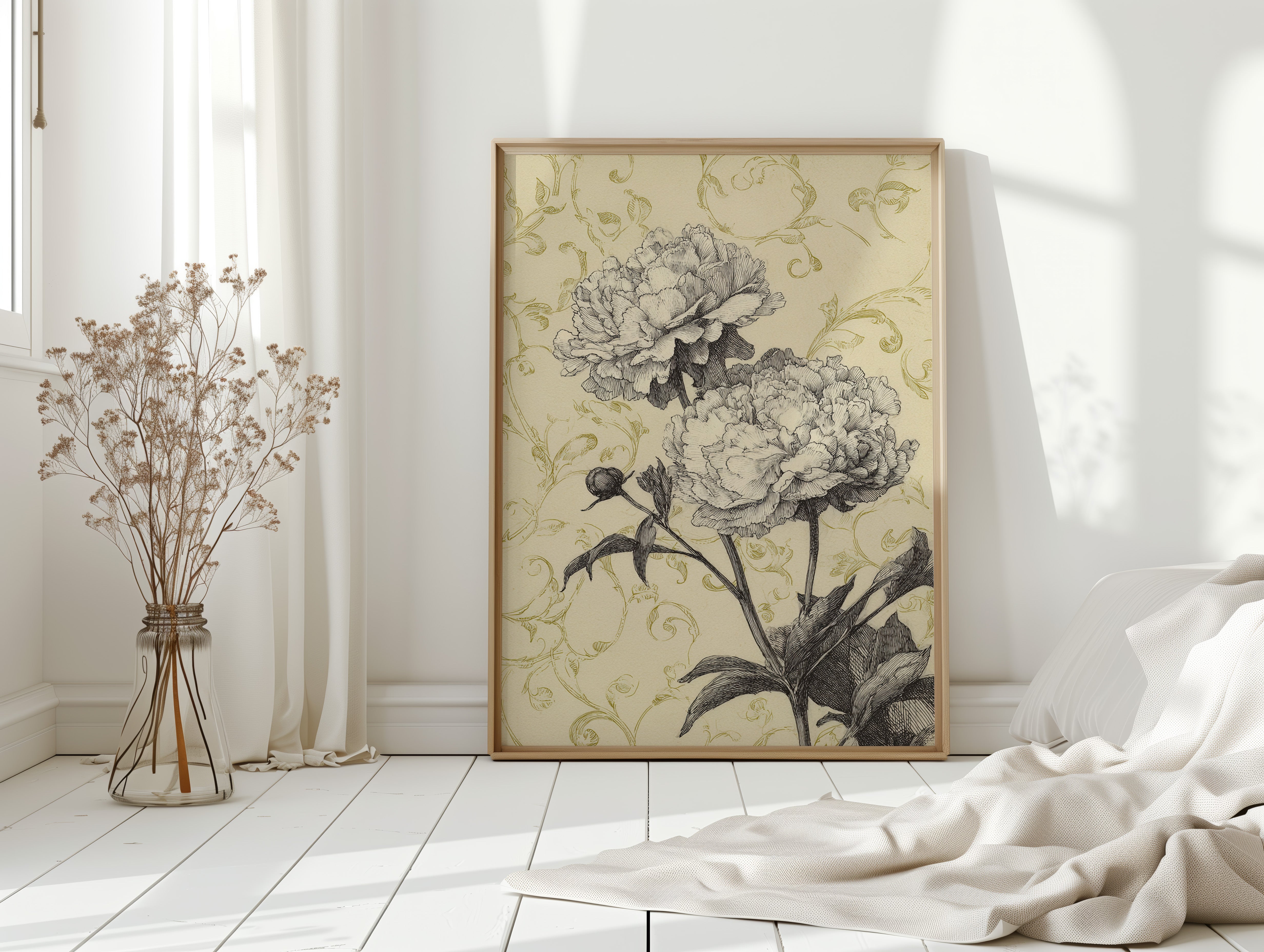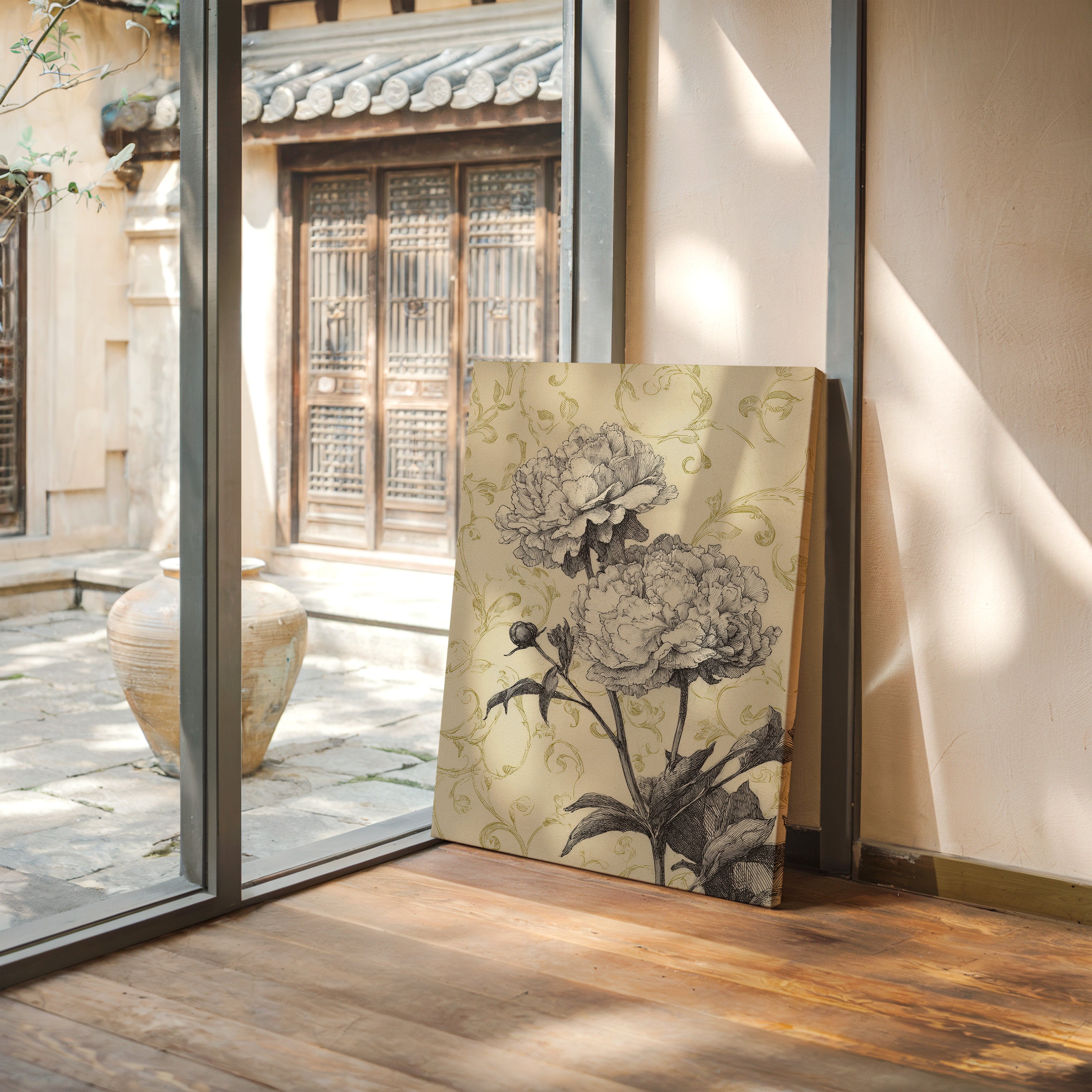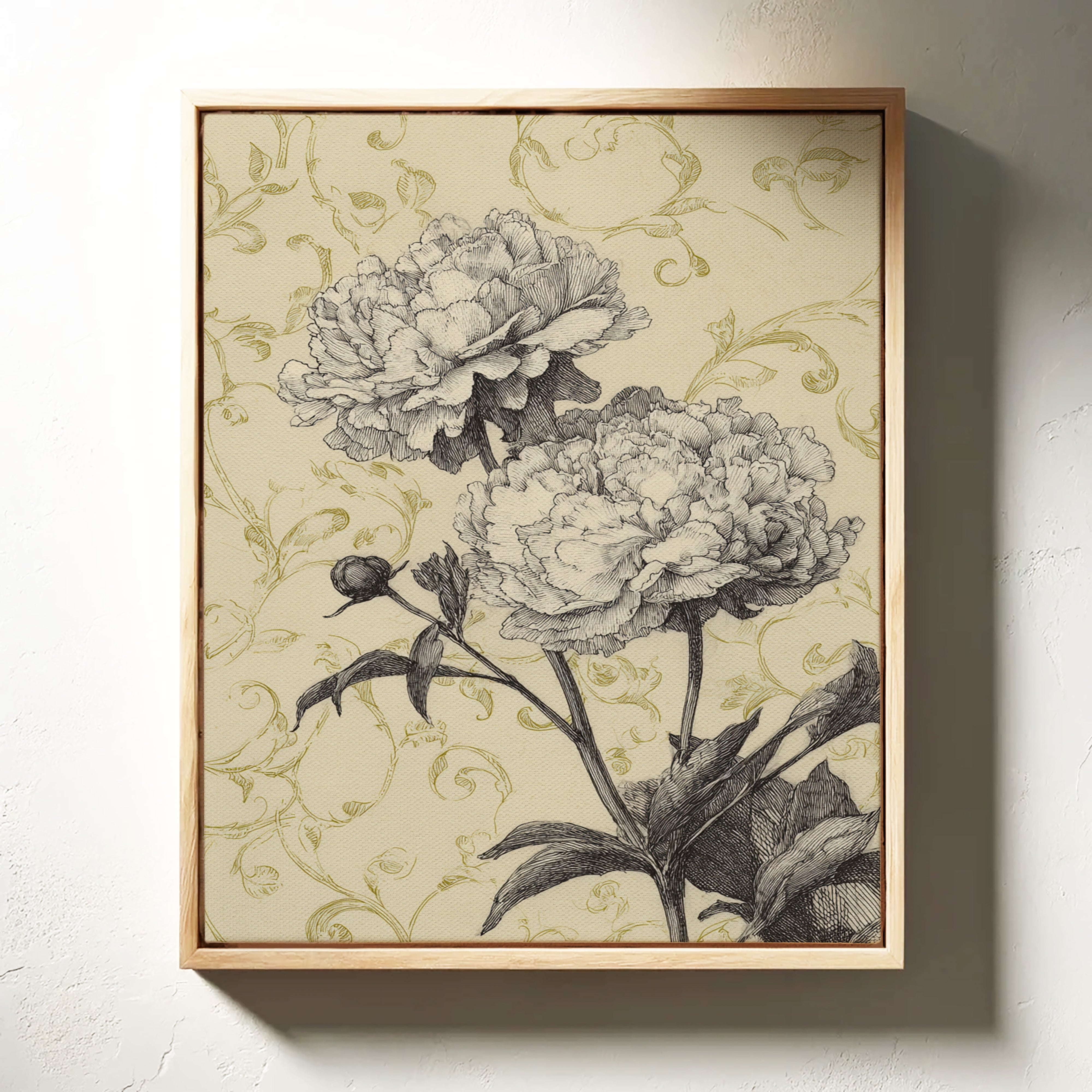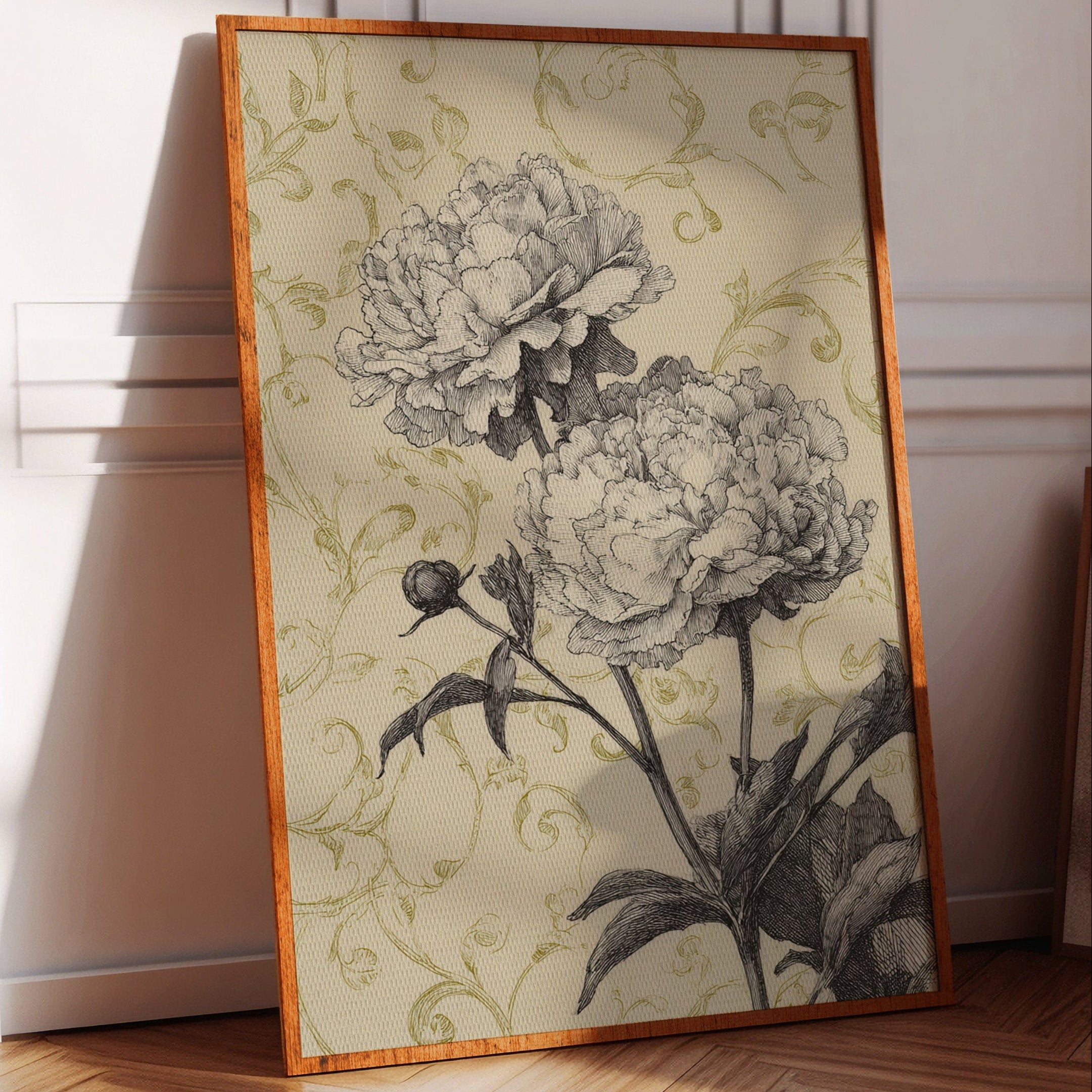 Amidst the soft hues of a bygone era, two peonies stand elegantly, their petals unfurling like whispered secrets. This piece captures the essence of artisanal beauty, merging botanical intricacy with timeless charm. The delicate lines and muted background evoke a sense of nostalgia, inviting viewers to reflect on fleeting moments of grace and tranquility. Perfect for a serene reading nook or a cozy corner, this art piece enhances any space with its gentle allure.