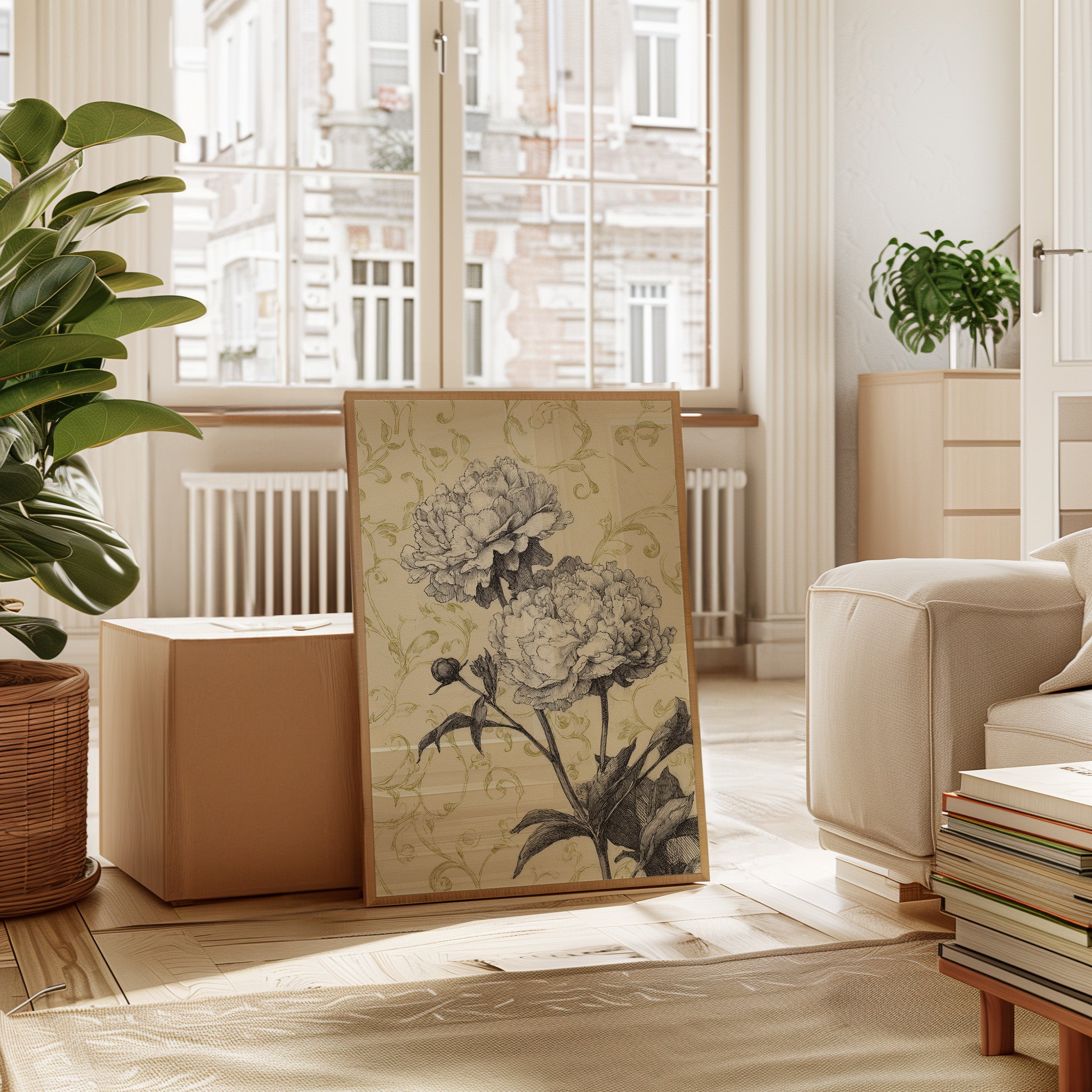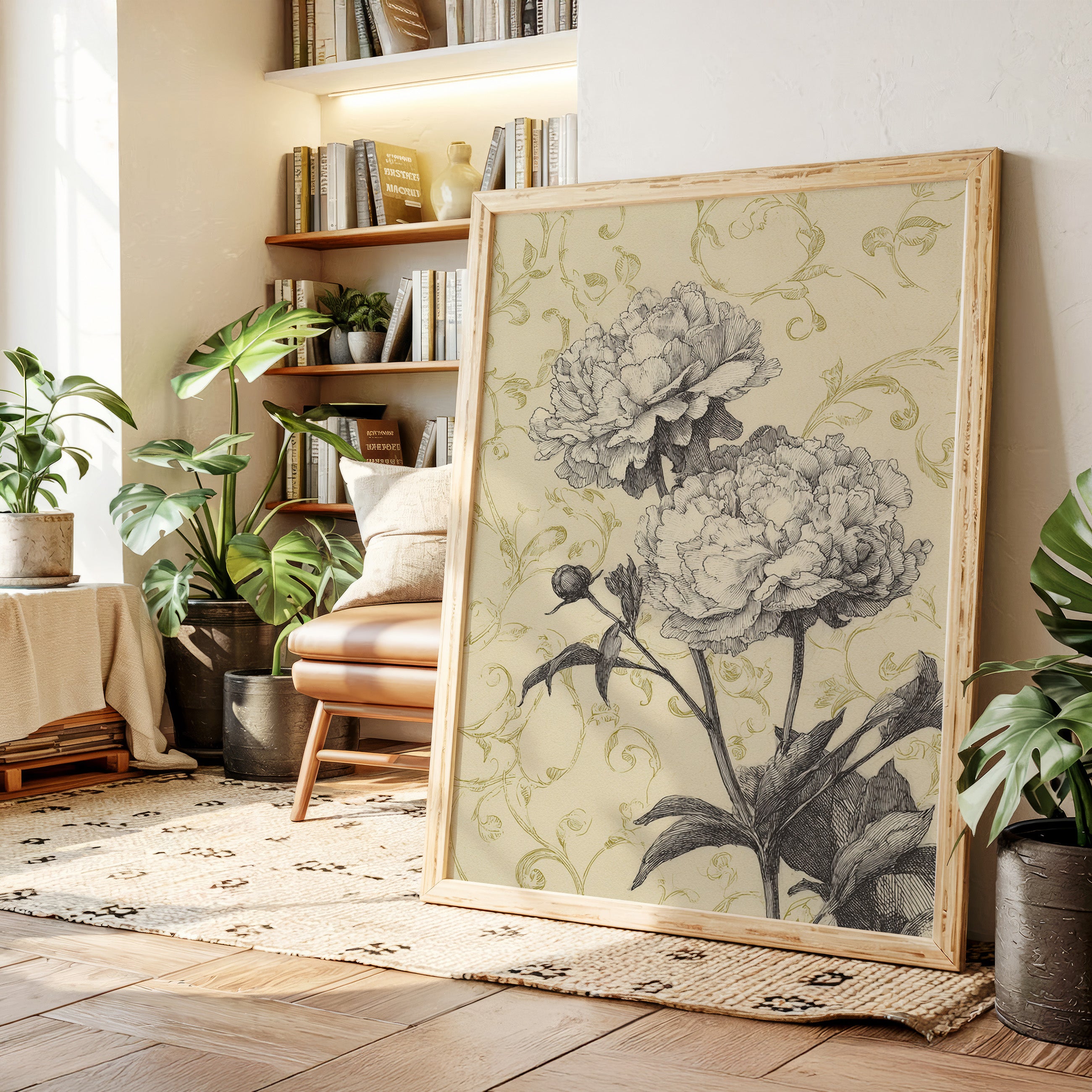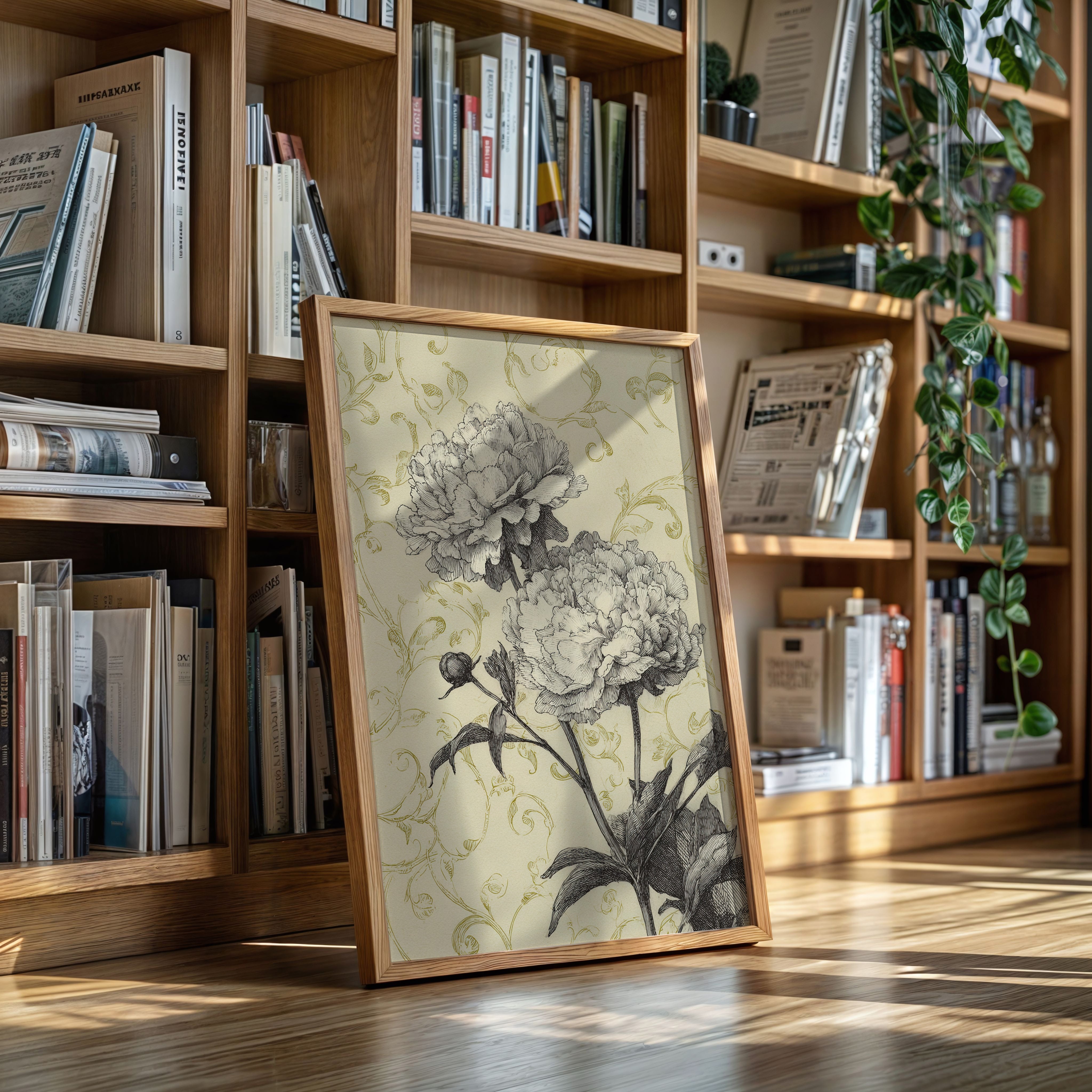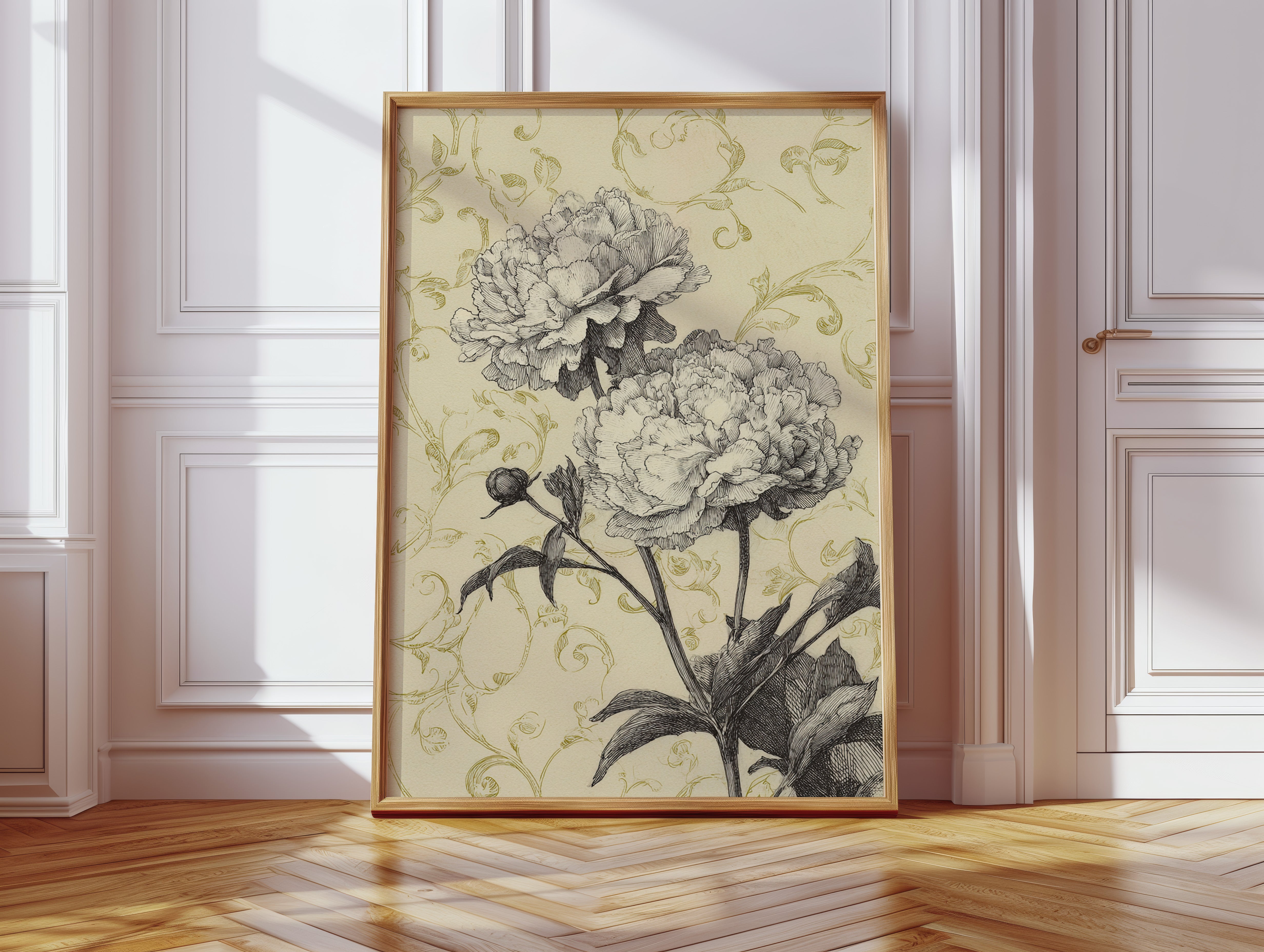 Amidst the soft hues of a bygone era, two peonies stand elegantly, their petals unfurling like whispered secrets. This piece captures the essence of artisanal beauty, merging botanical intricacy with timeless charm. The delicate lines and muted background evoke a sense of nostalgia, inviting viewers to reflect on fleeting moments of grace and tranquility. Perfect for a serene reading nook or a cozy corner, this art piece enhances any space with its gentle allure.