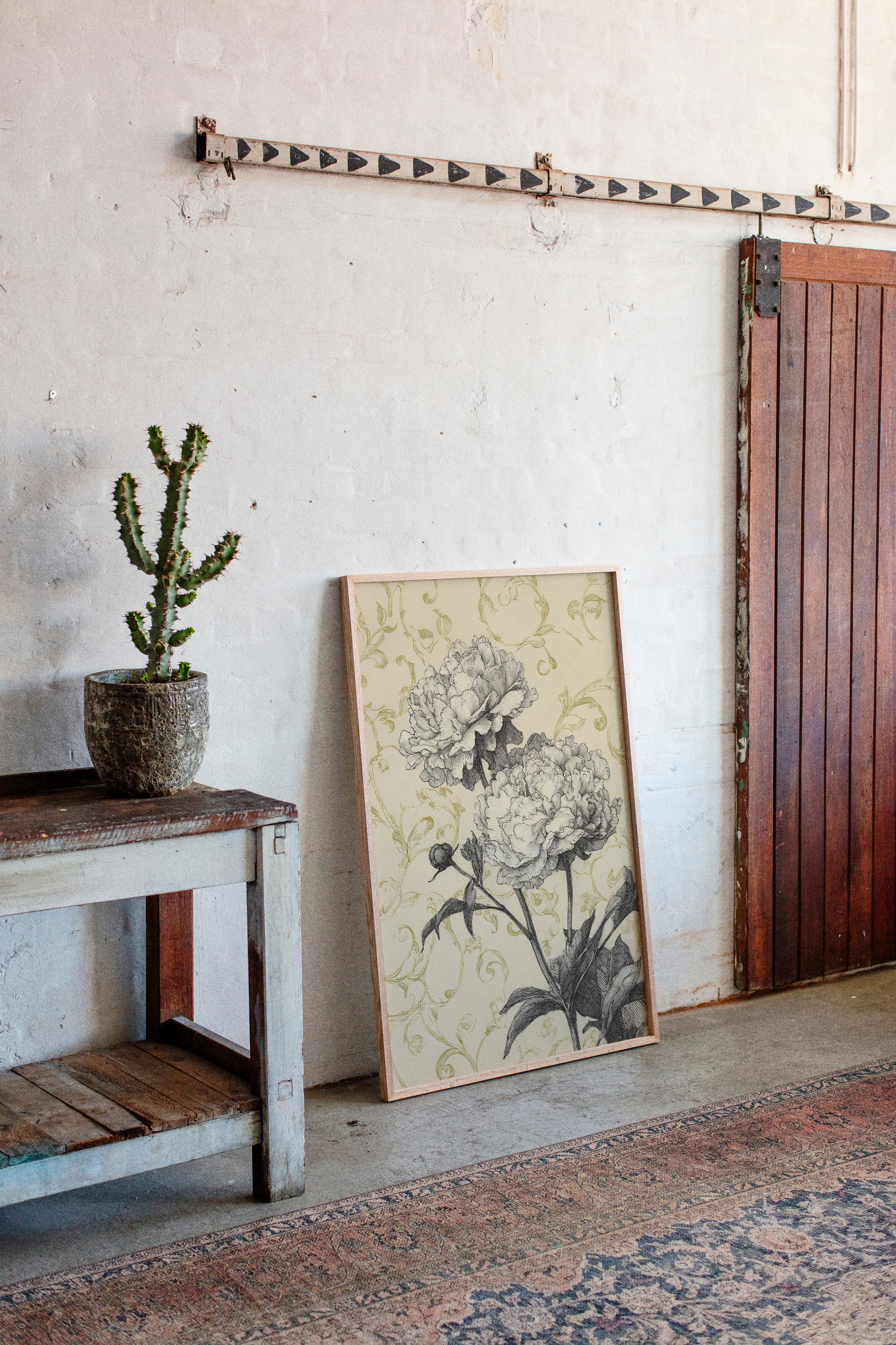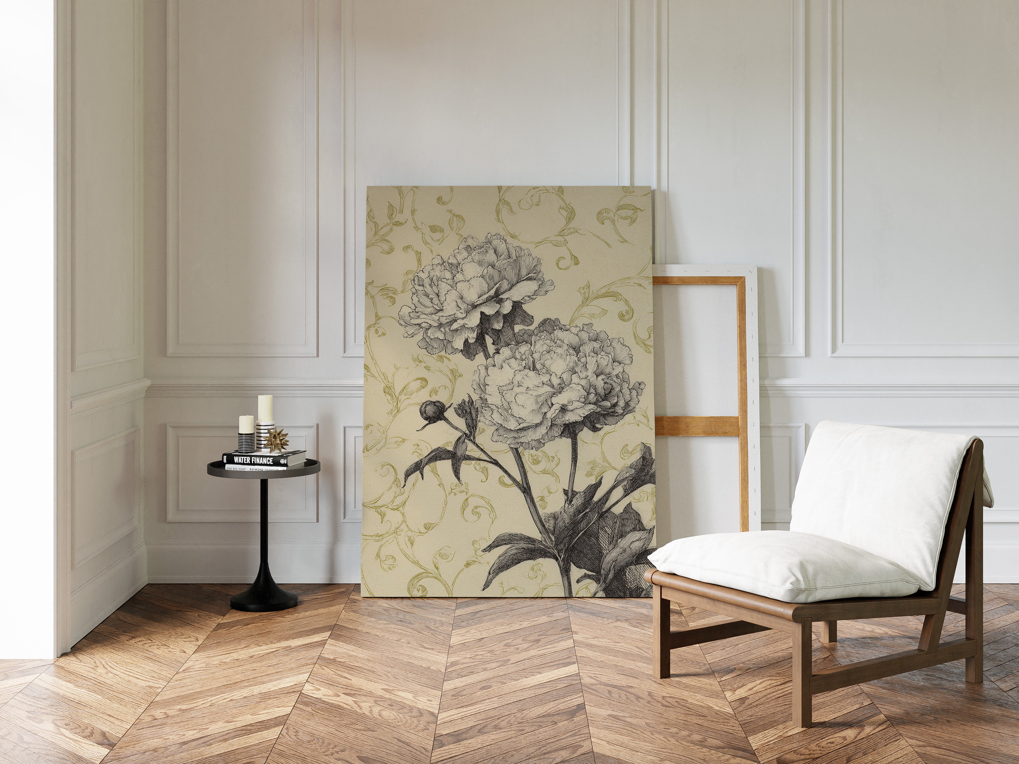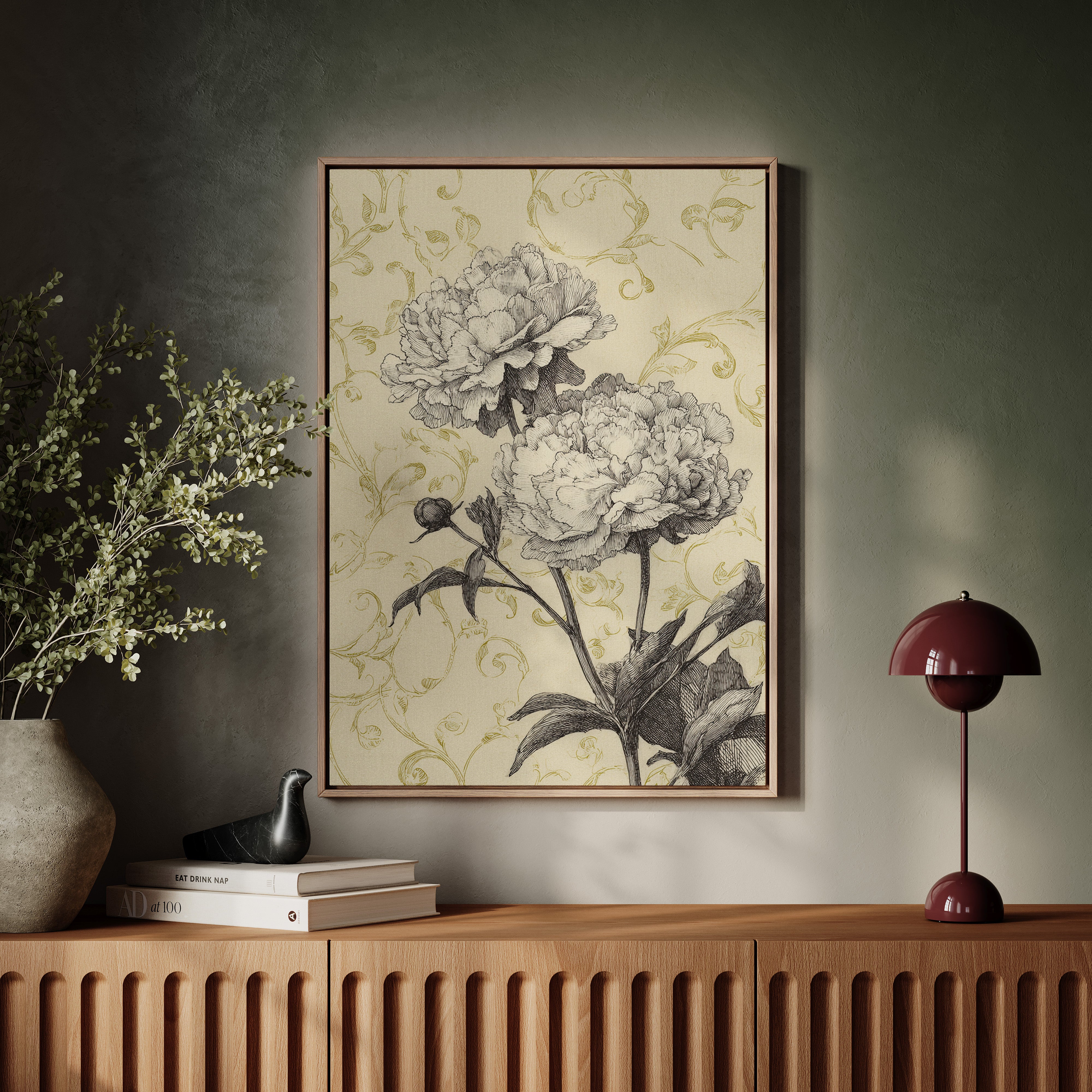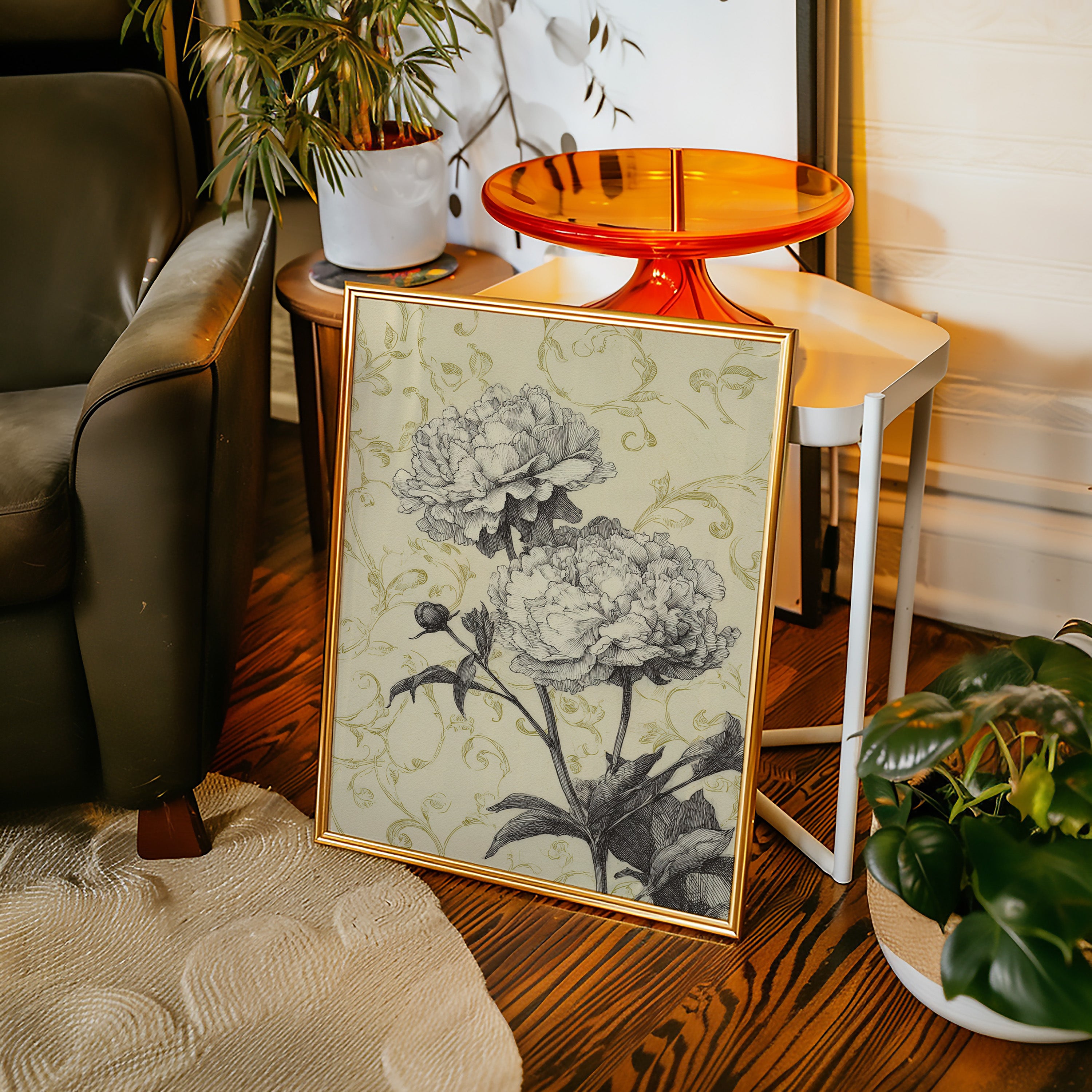 Amidst the soft hues of a bygone era, two peonies stand elegantly, their petals unfurling like whispered secrets. This piece captures the essence of artisanal beauty, merging botanical intricacy with timeless charm. The delicate lines and muted background evoke a sense of nostalgia, inviting viewers to reflect on fleeting moments of grace and tranquility. Perfect for a serene reading nook or a cozy corner, this art piece enhances any space with its gentle allure.