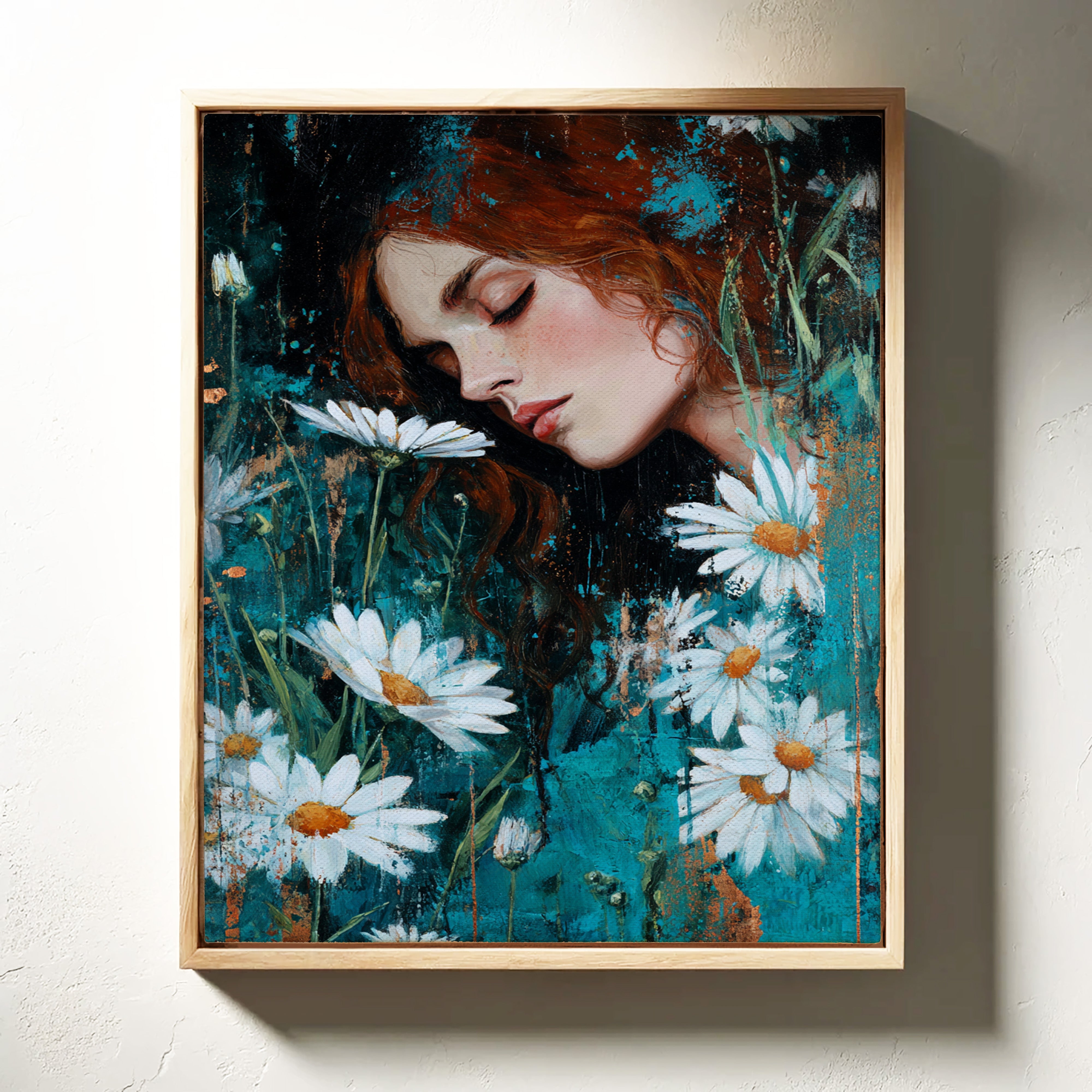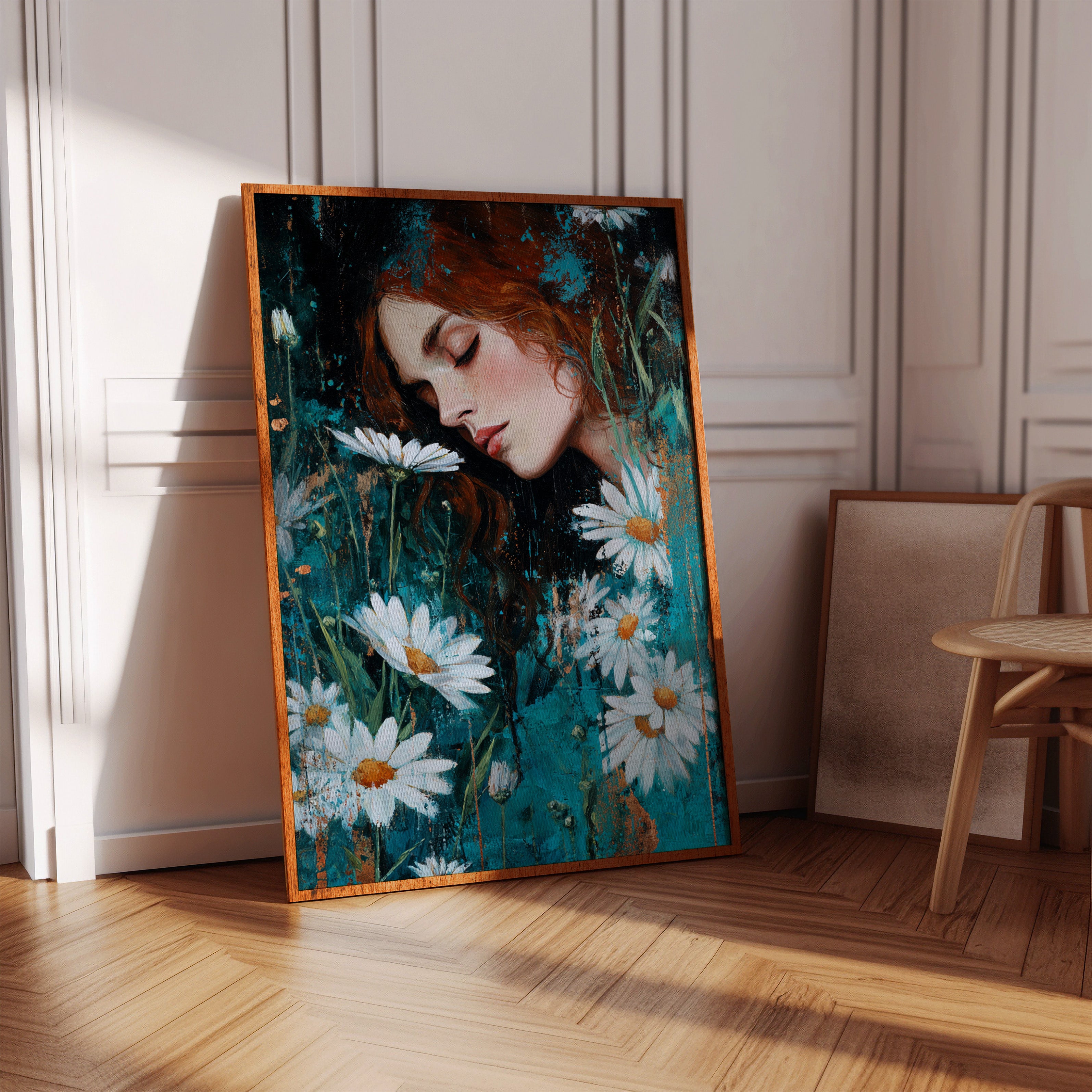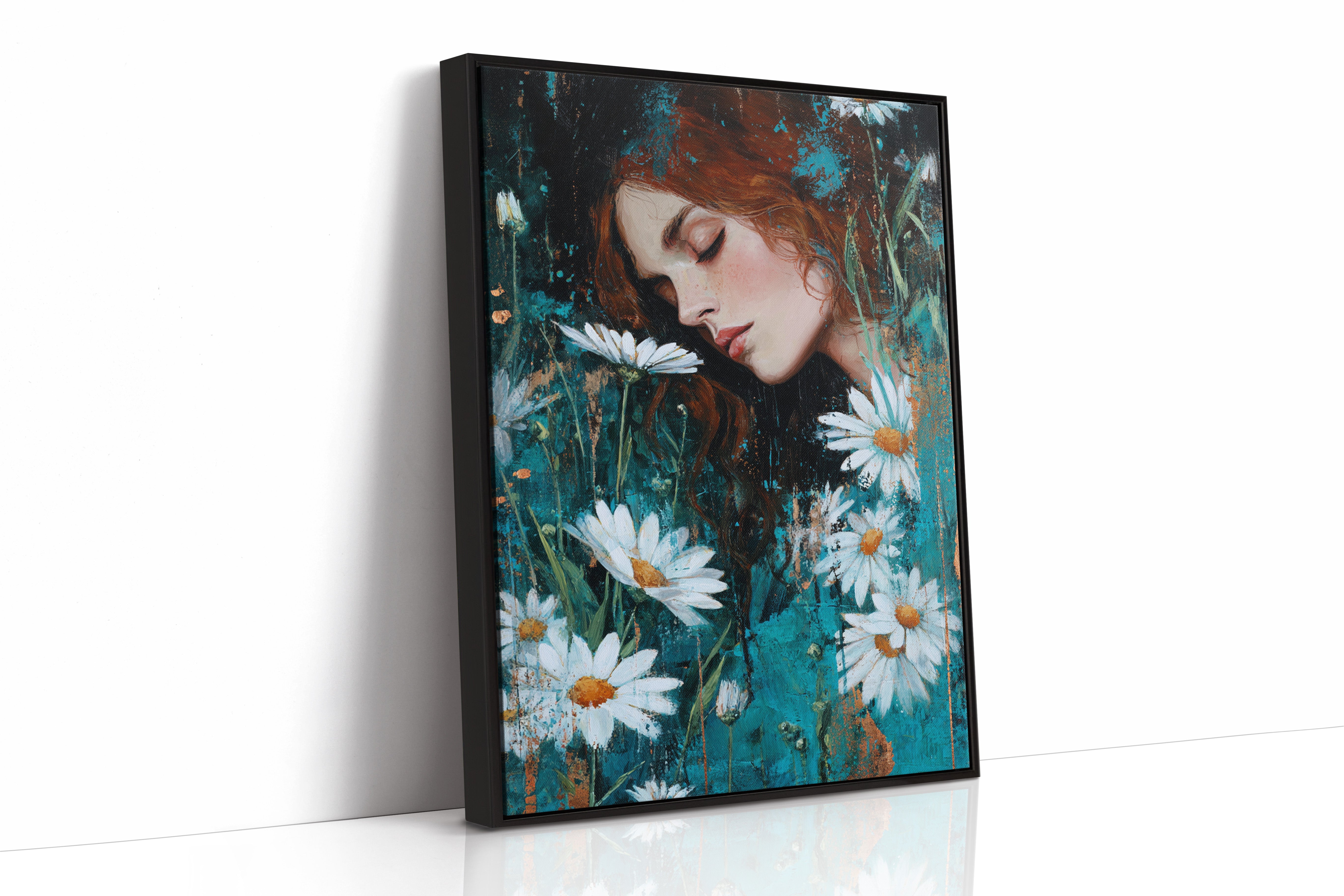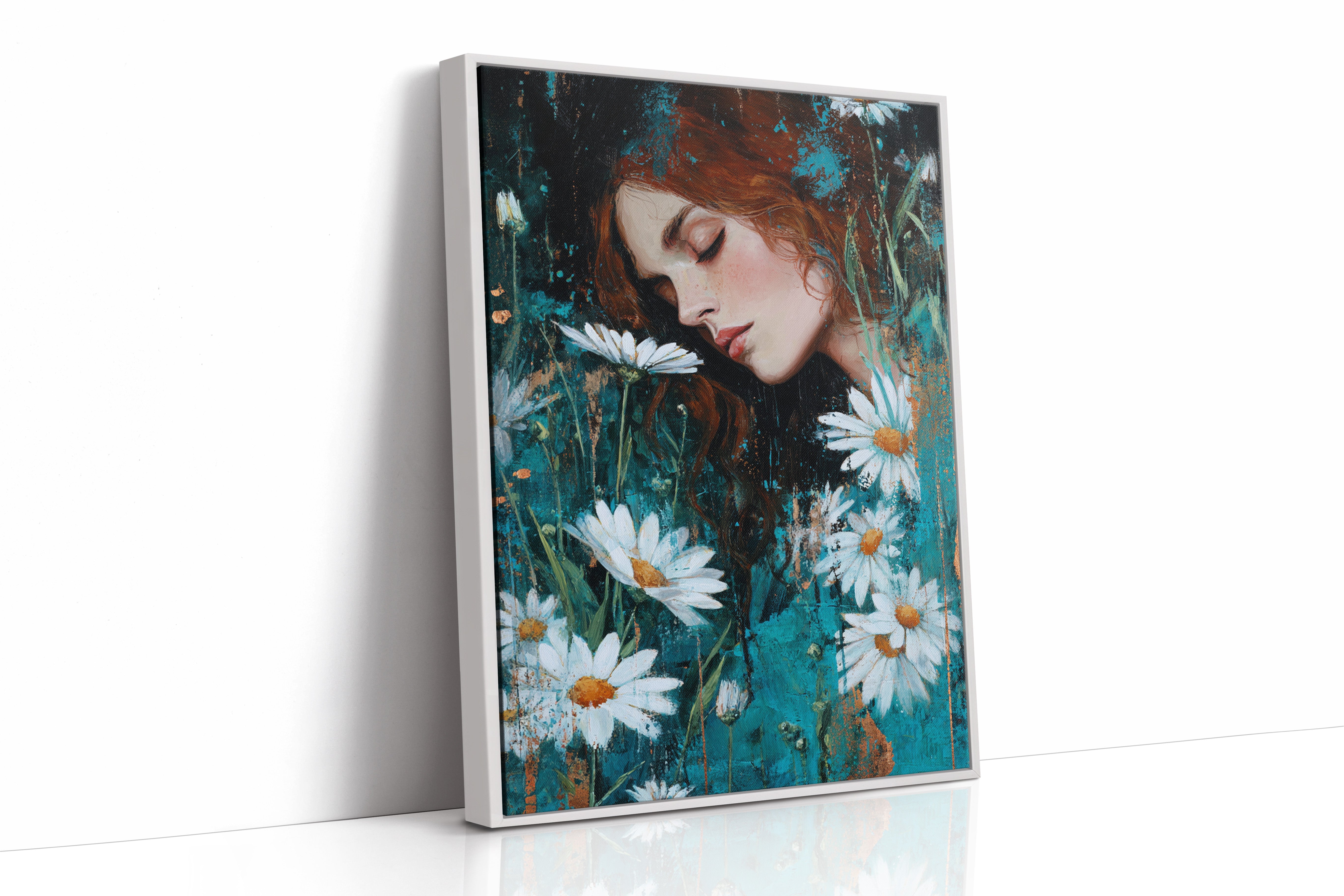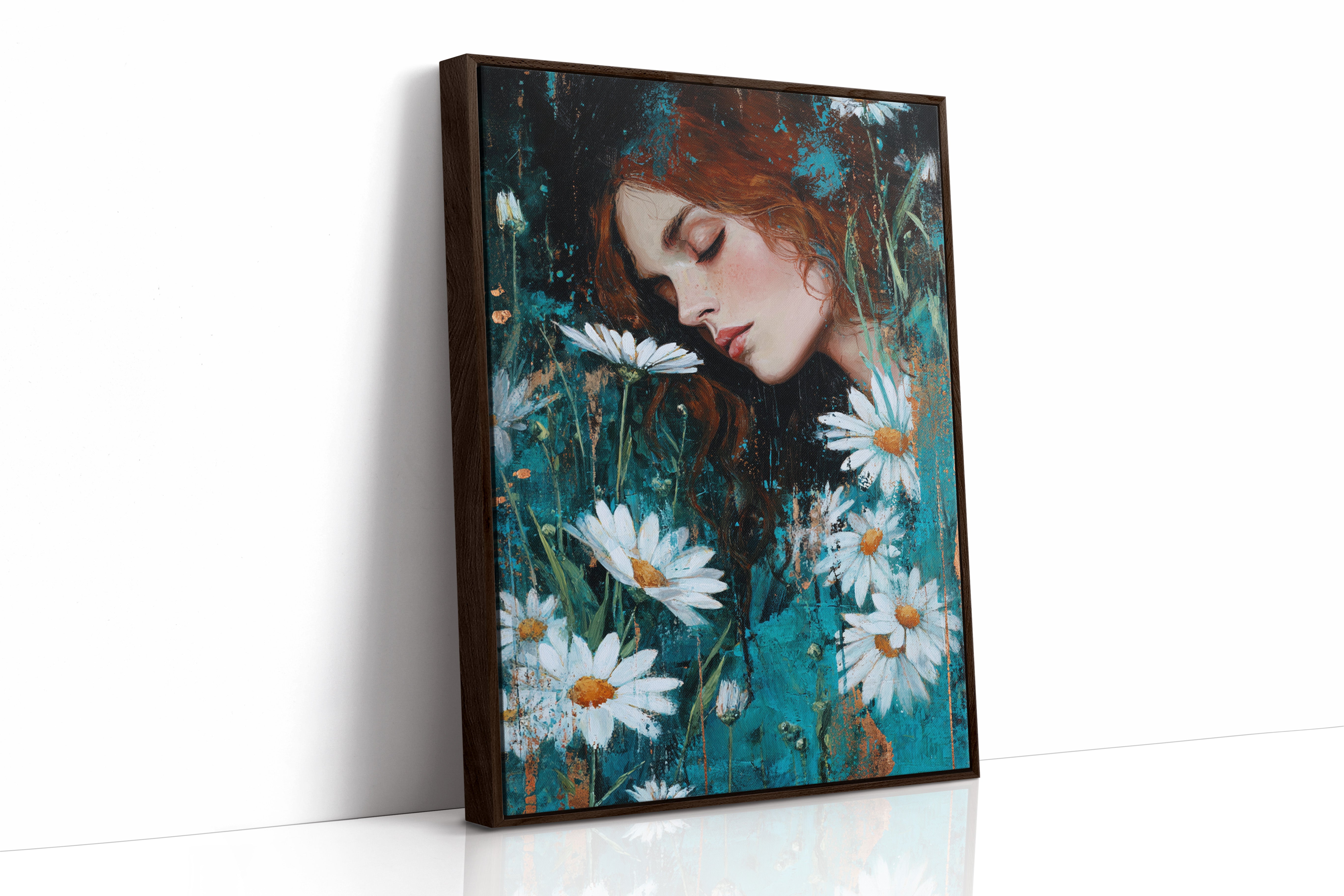A gentle moment unfolds as a young woman leans into a bouquet of daisies, her serene expression harmonizing with the vibrant hues surrounding her. This piece captures the essence of the Artisanal collection, blending natural beauty with artistic finesse. The rich teal background contrasts with the delicate whites and yellows of the flowers, creating a sense of intimacy and tranquility. Ideal for a cozy reading nook or a peaceful bedroom retreat, this artwork invites contemplation and calm.