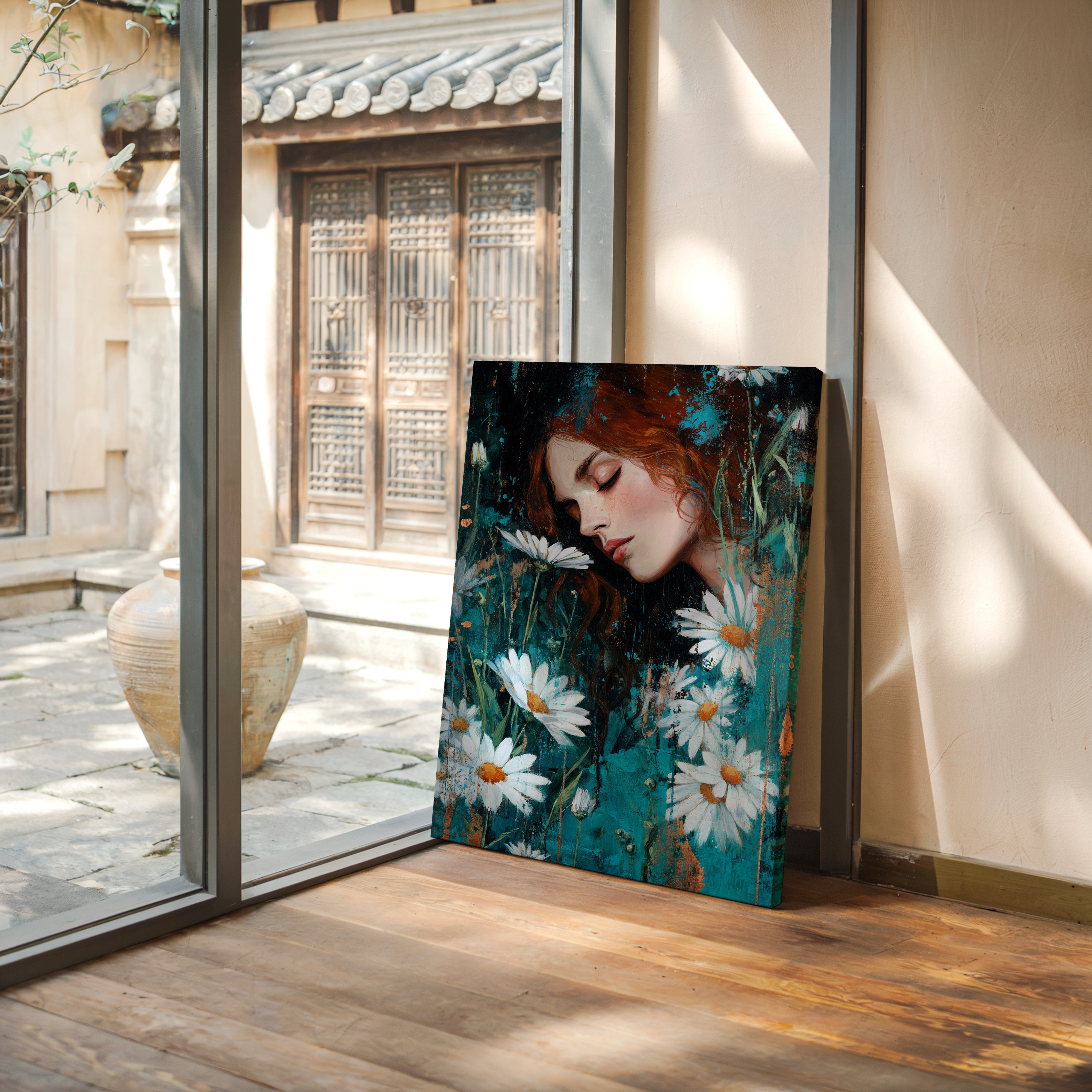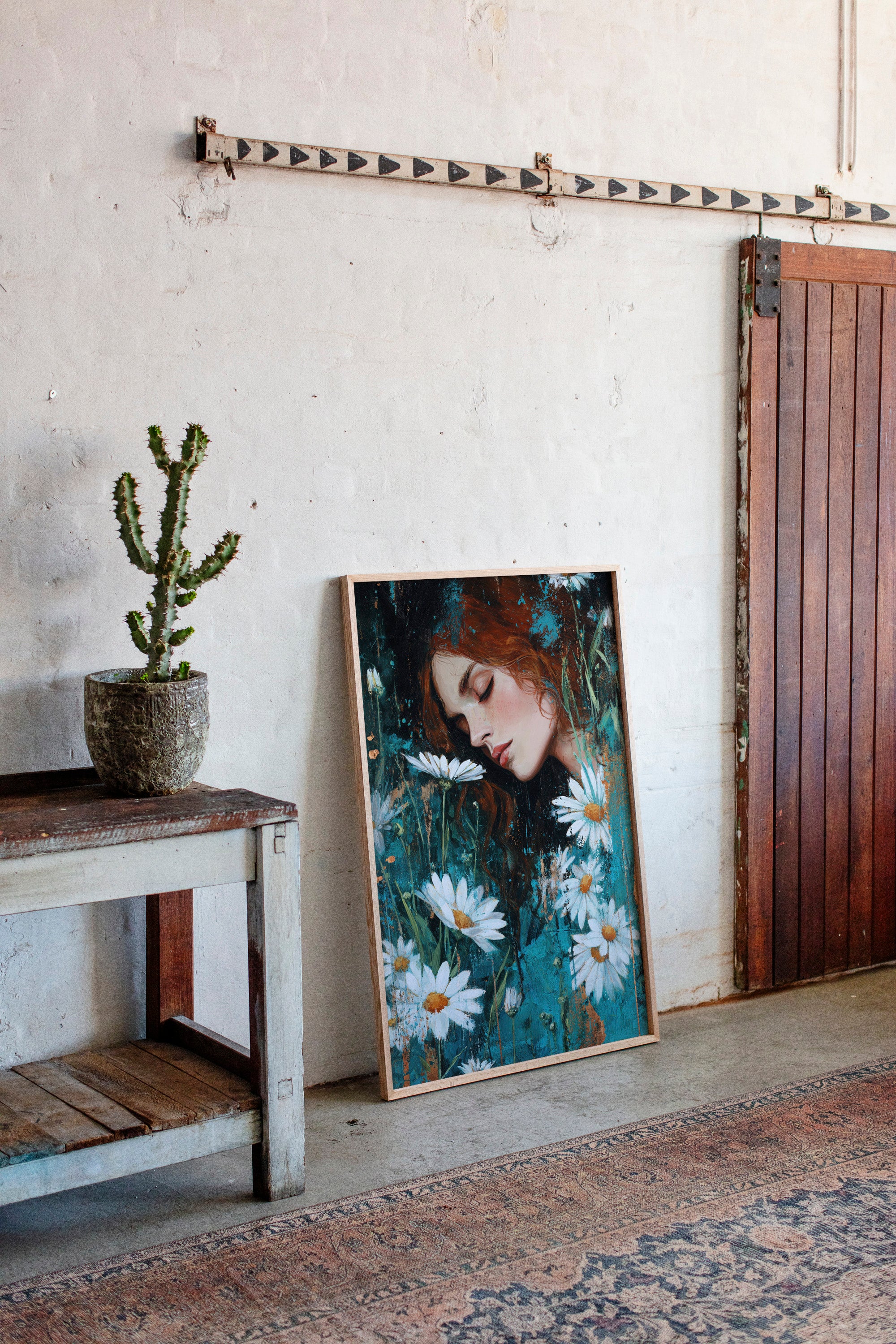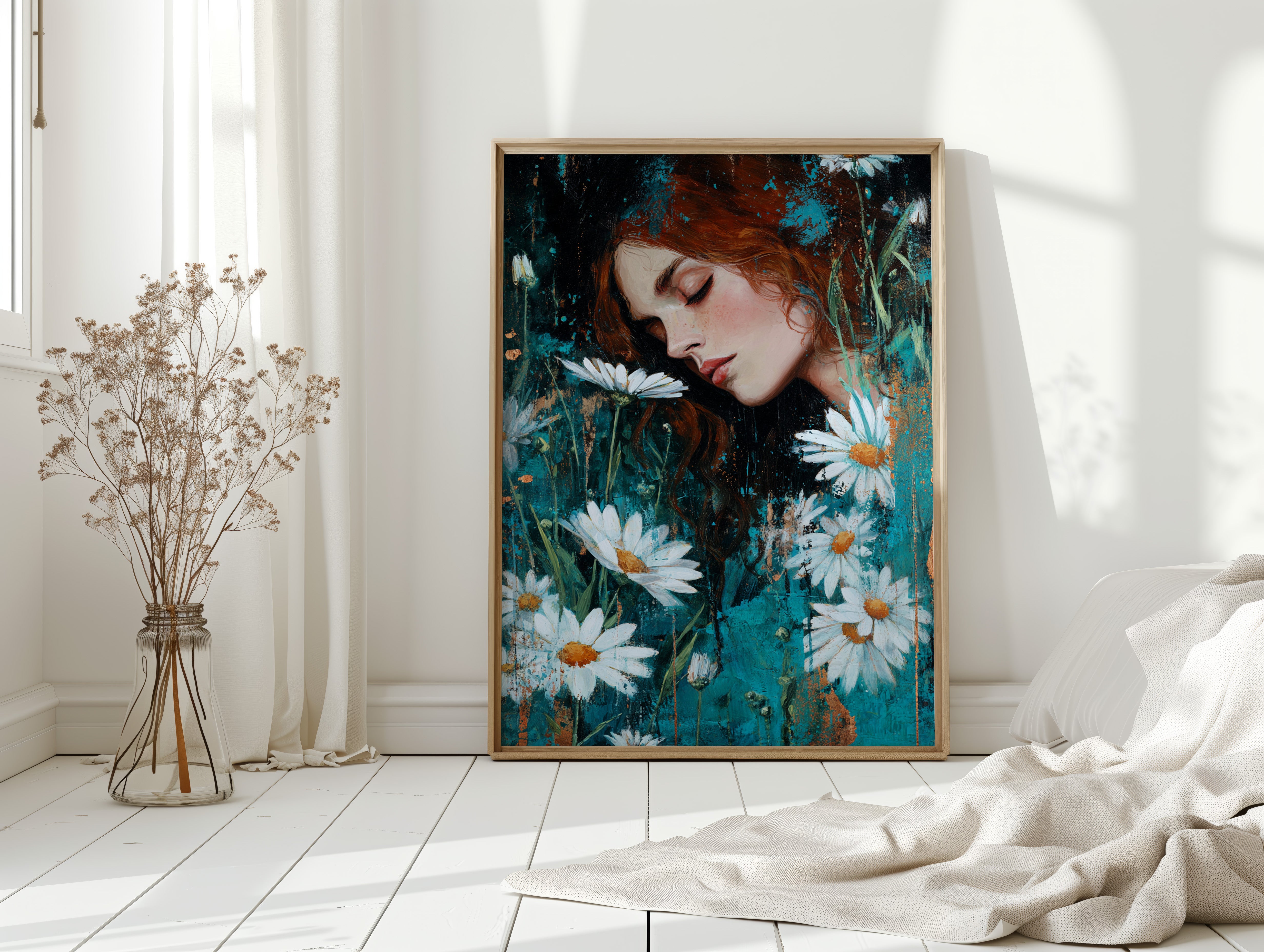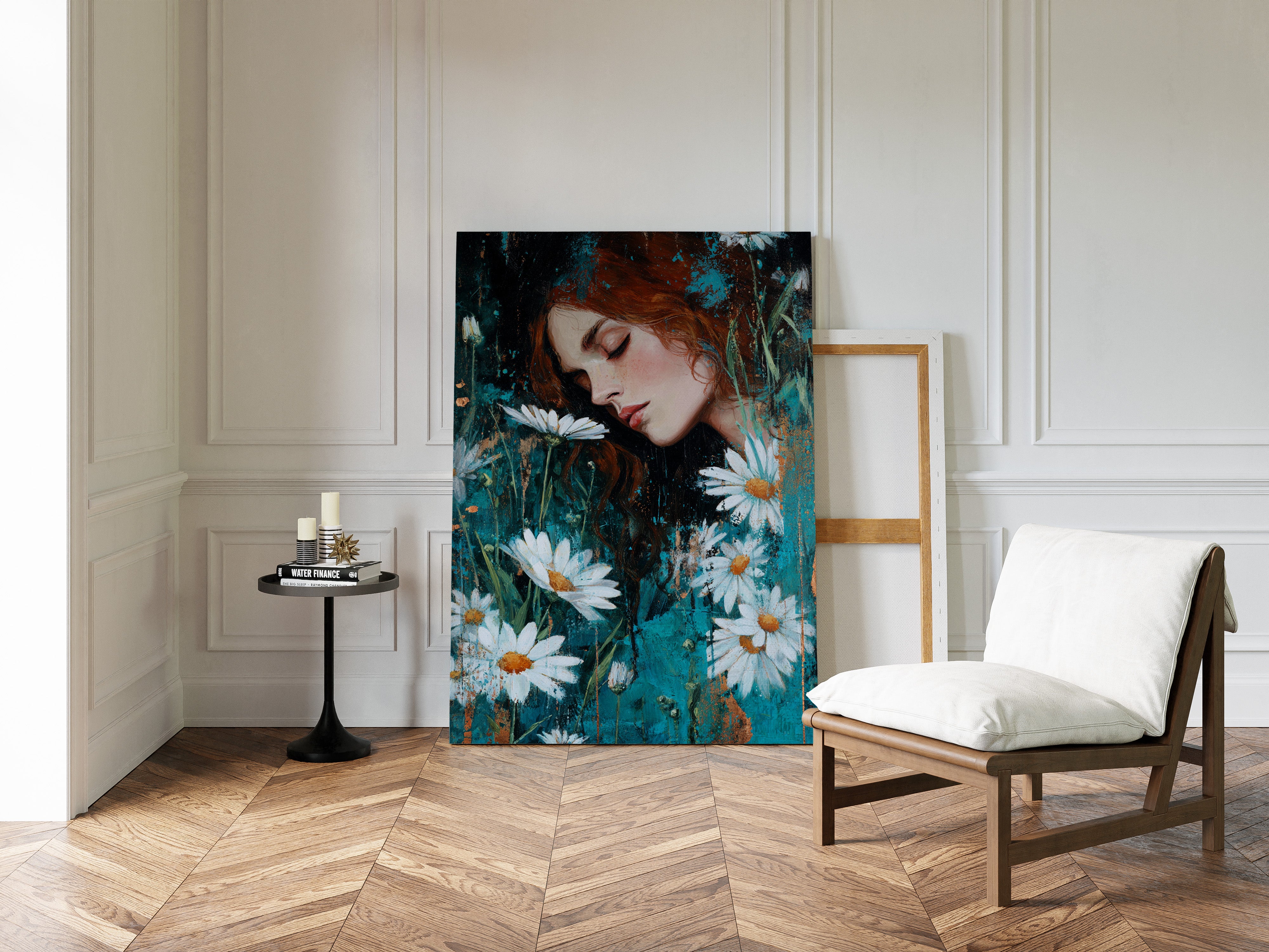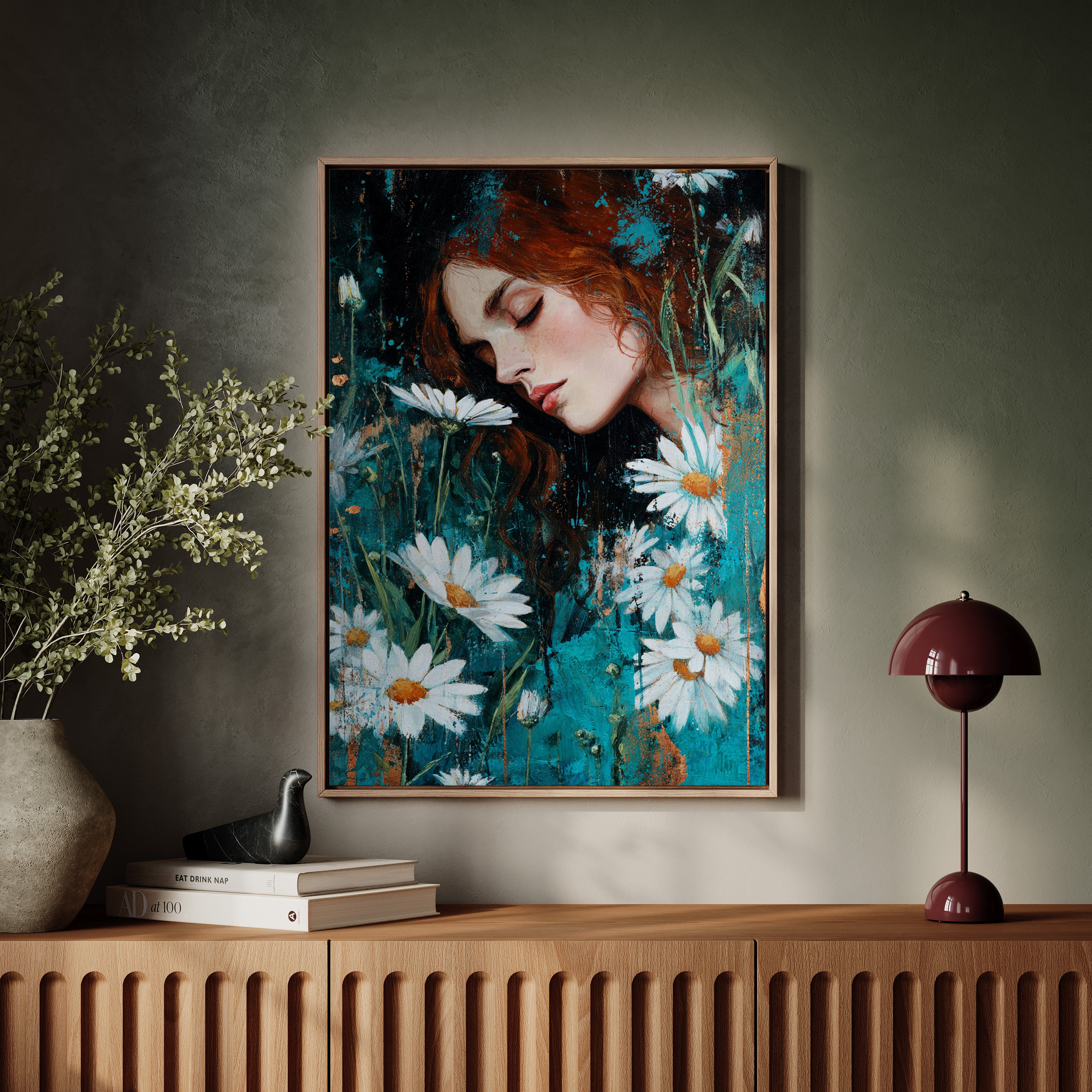 A gentle moment unfolds as a young woman leans into a bouquet of daisies, her serene expression harmonizing with the vibrant hues surrounding her. This piece captures the essence of the Artisanal collection, blending natural beauty with artistic finesse. The rich teal background contrasts with the delicate whites and yellows of the flowers, creating a sense of intimacy and tranquility. Ideal for a cozy reading nook or a peaceful bedroom retreat, this artwork invites contemplation and calm.