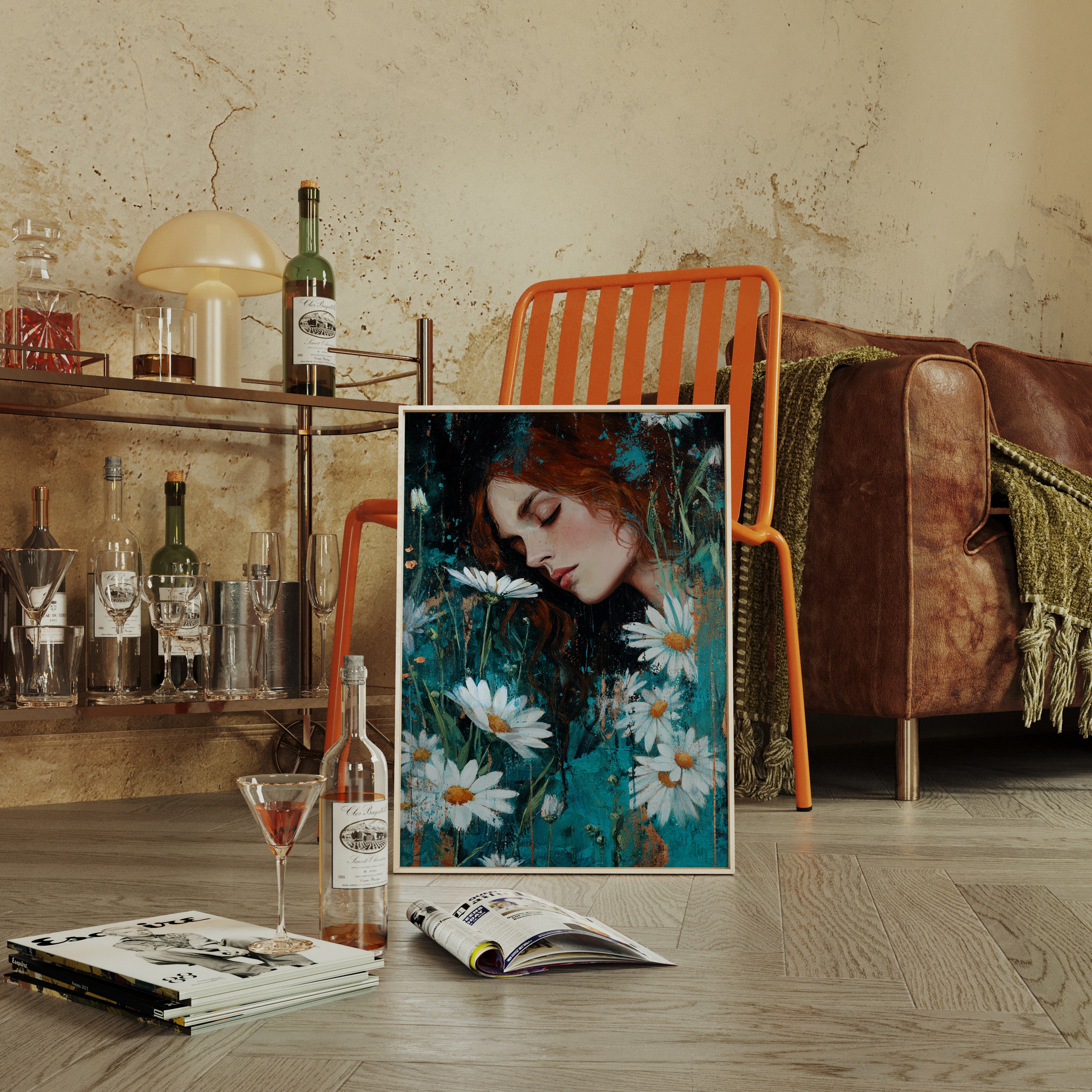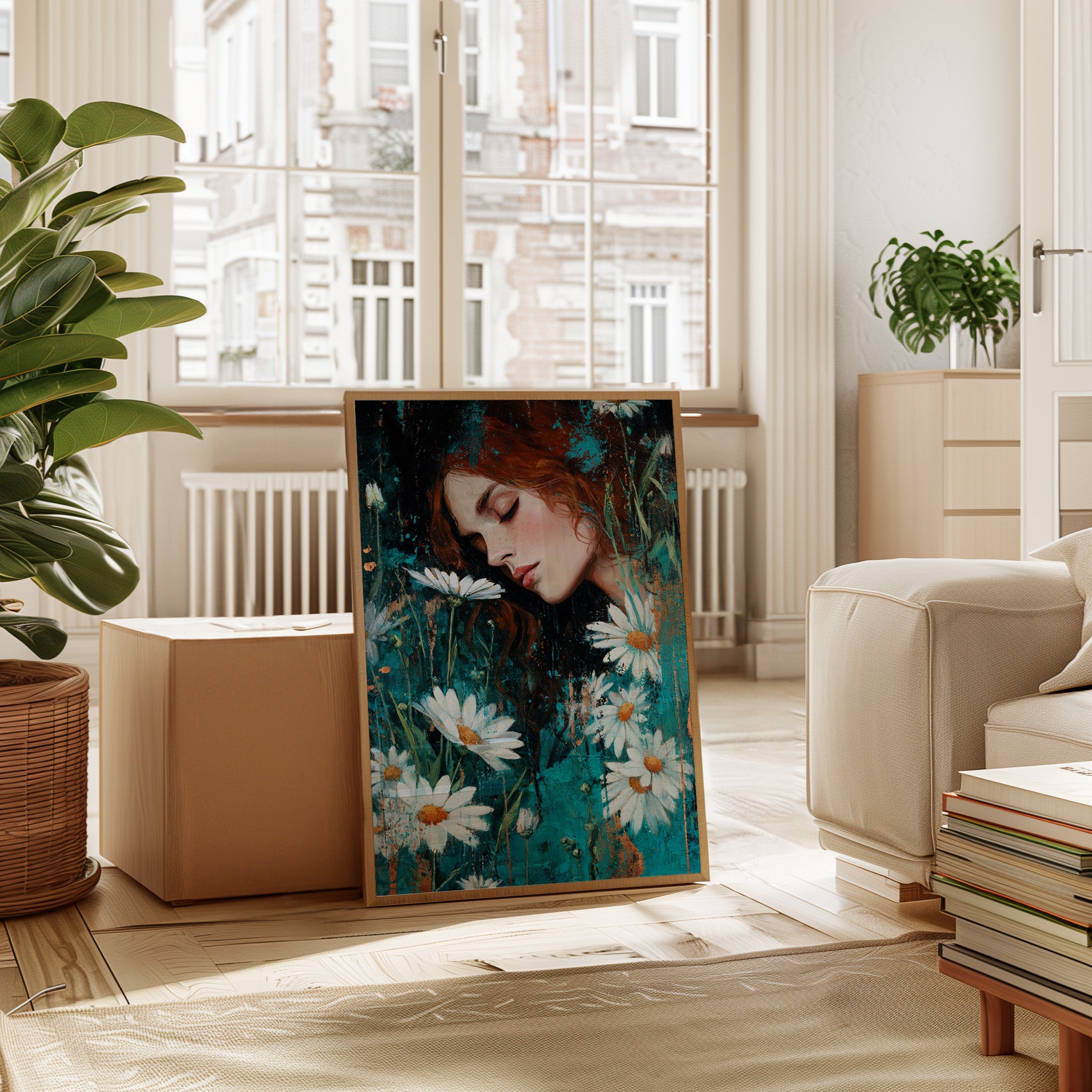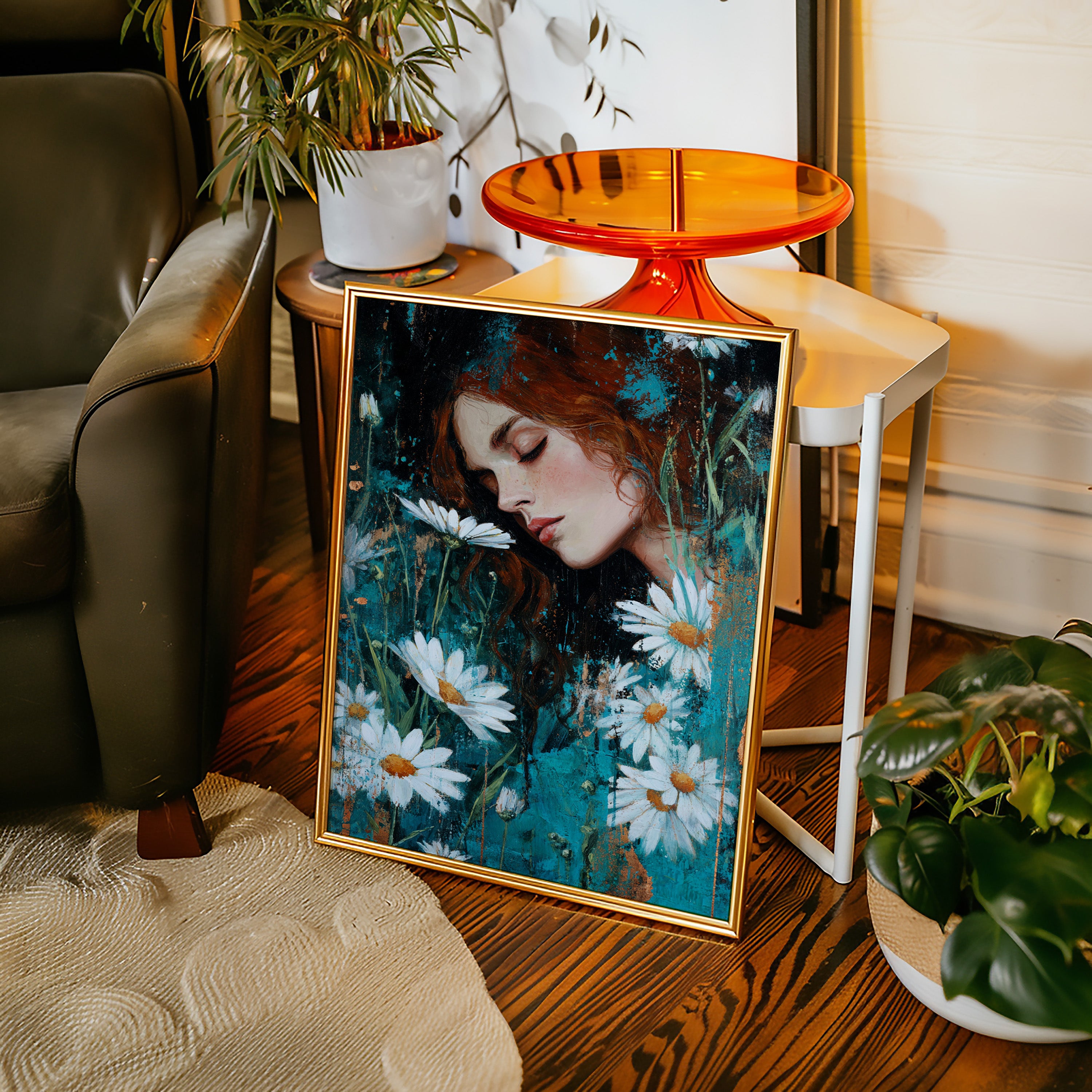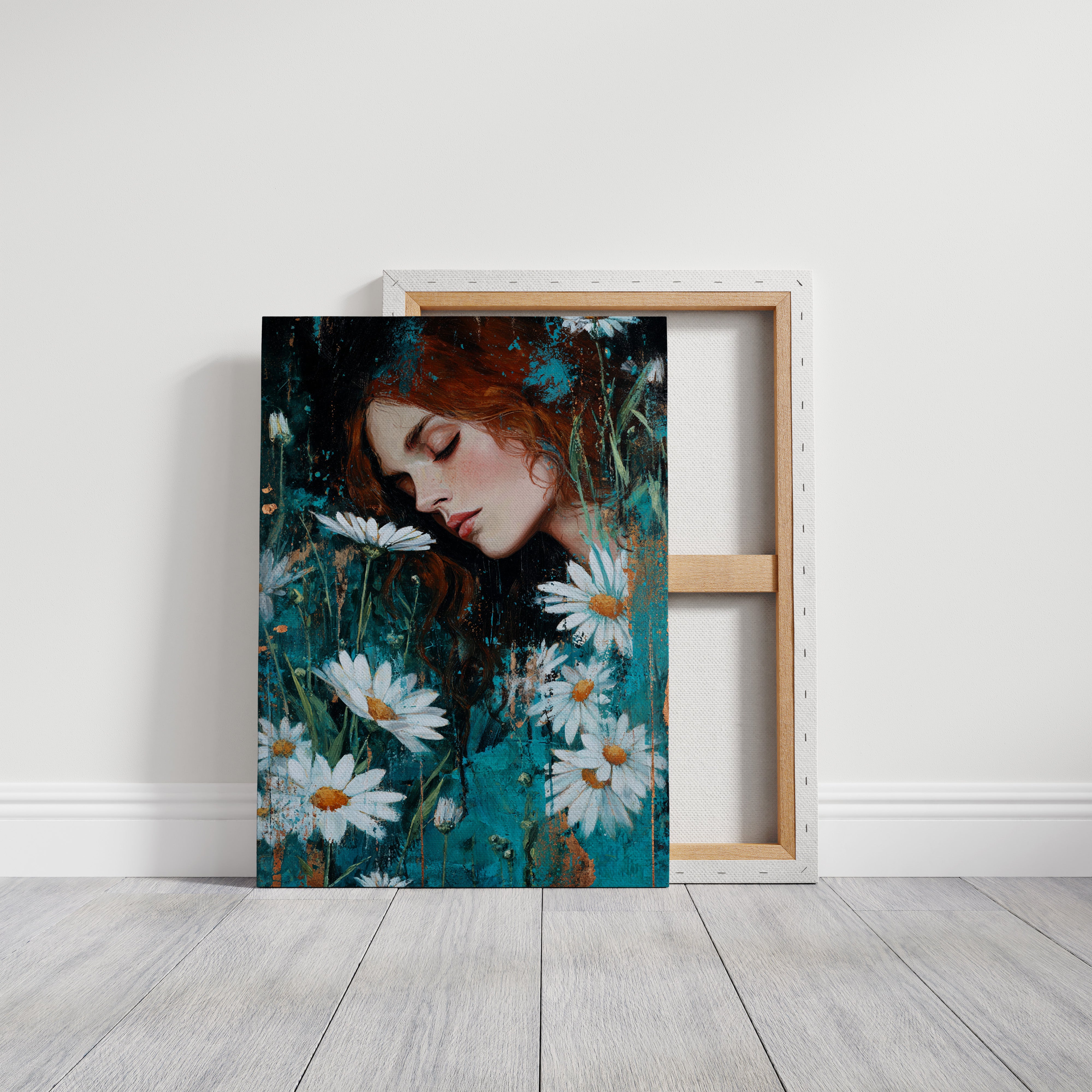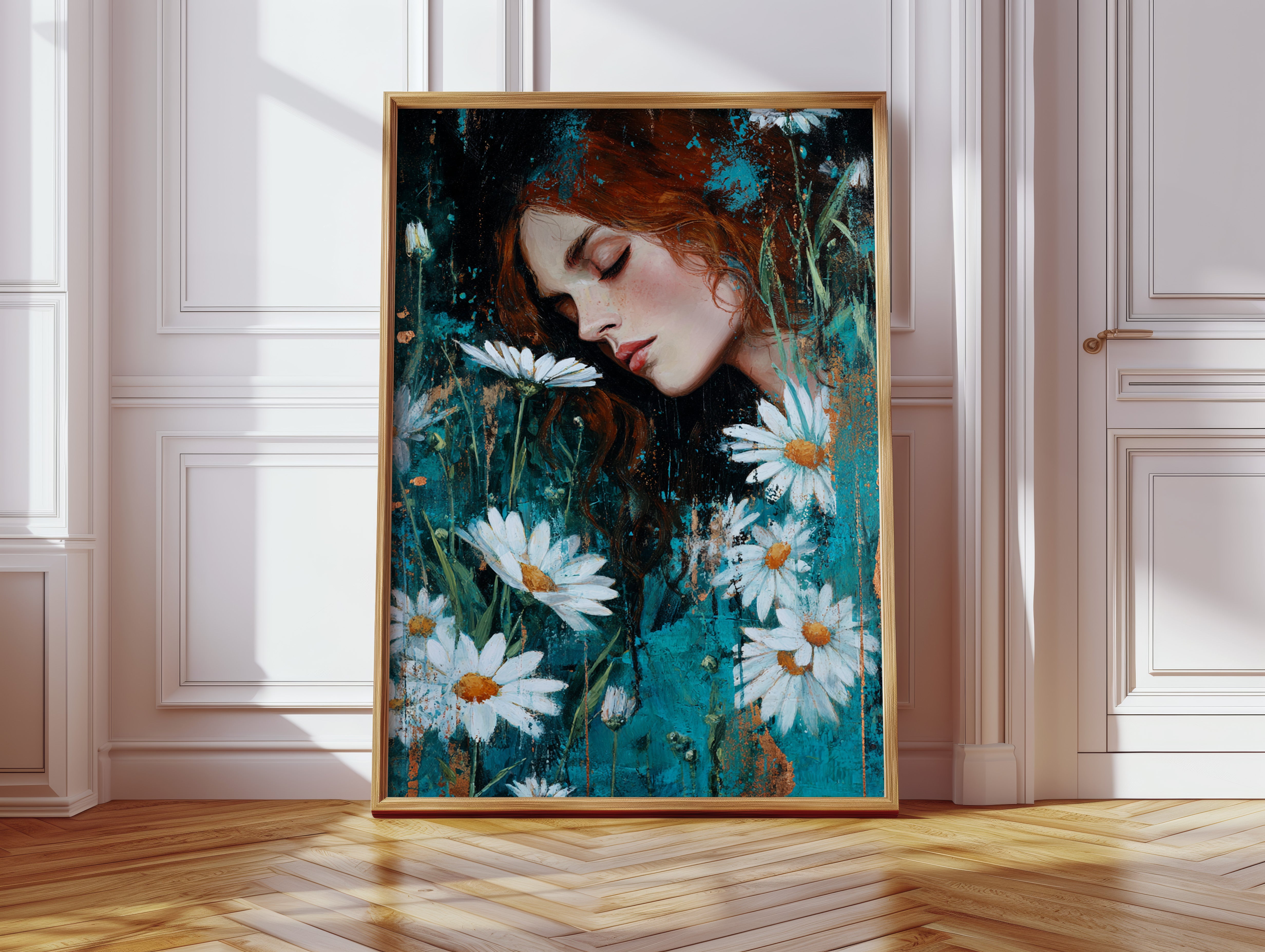 A gentle moment unfolds as a young woman leans into a bouquet of daisies, her serene expression harmonizing with the vibrant hues surrounding her. This piece captures the essence of the Artisanal collection, blending natural beauty with artistic finesse. The rich teal background contrasts with the delicate whites and yellows of the flowers, creating a sense of intimacy and tranquility. Ideal for a cozy reading nook or a peaceful bedroom retreat, this artwork invites contemplation and calm.