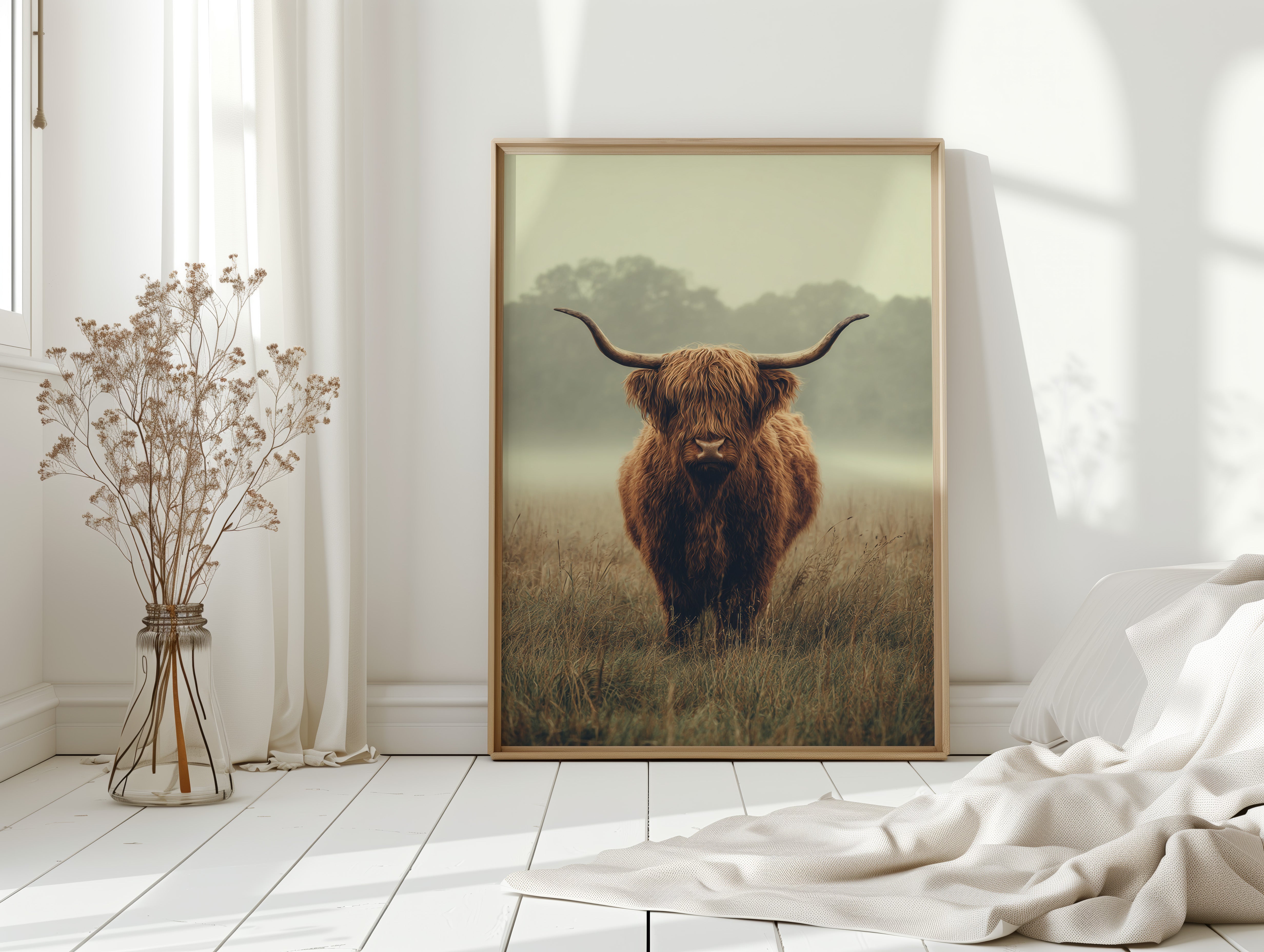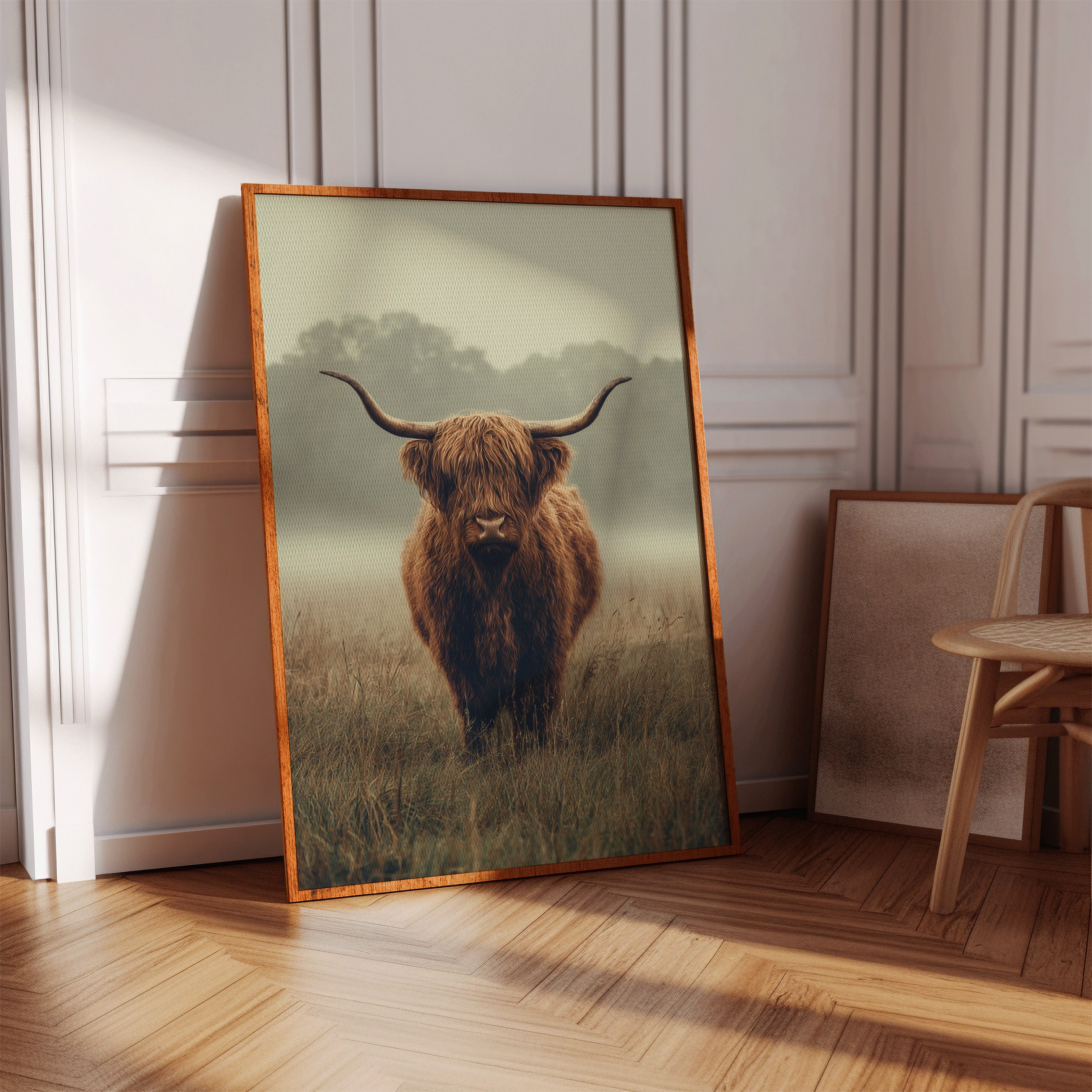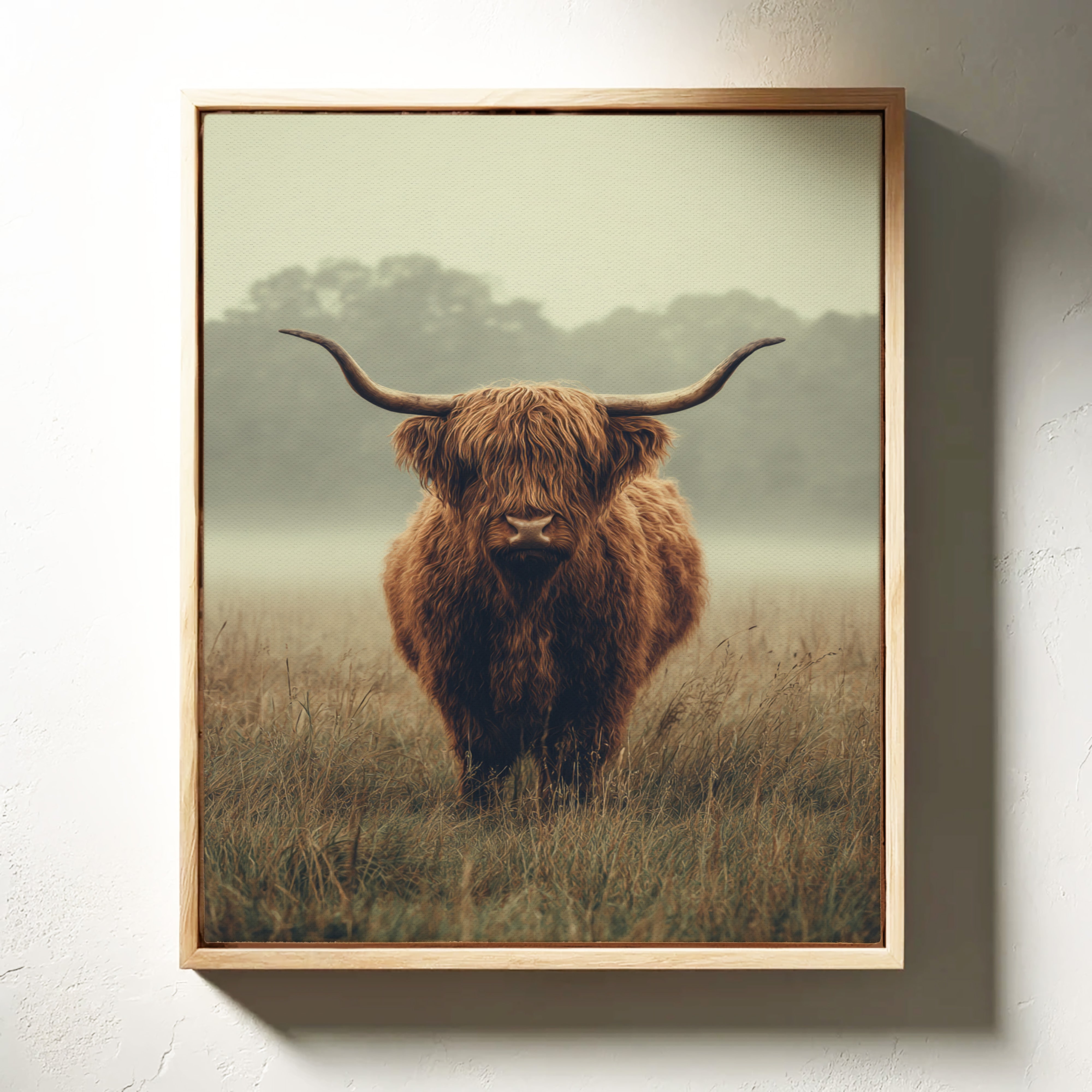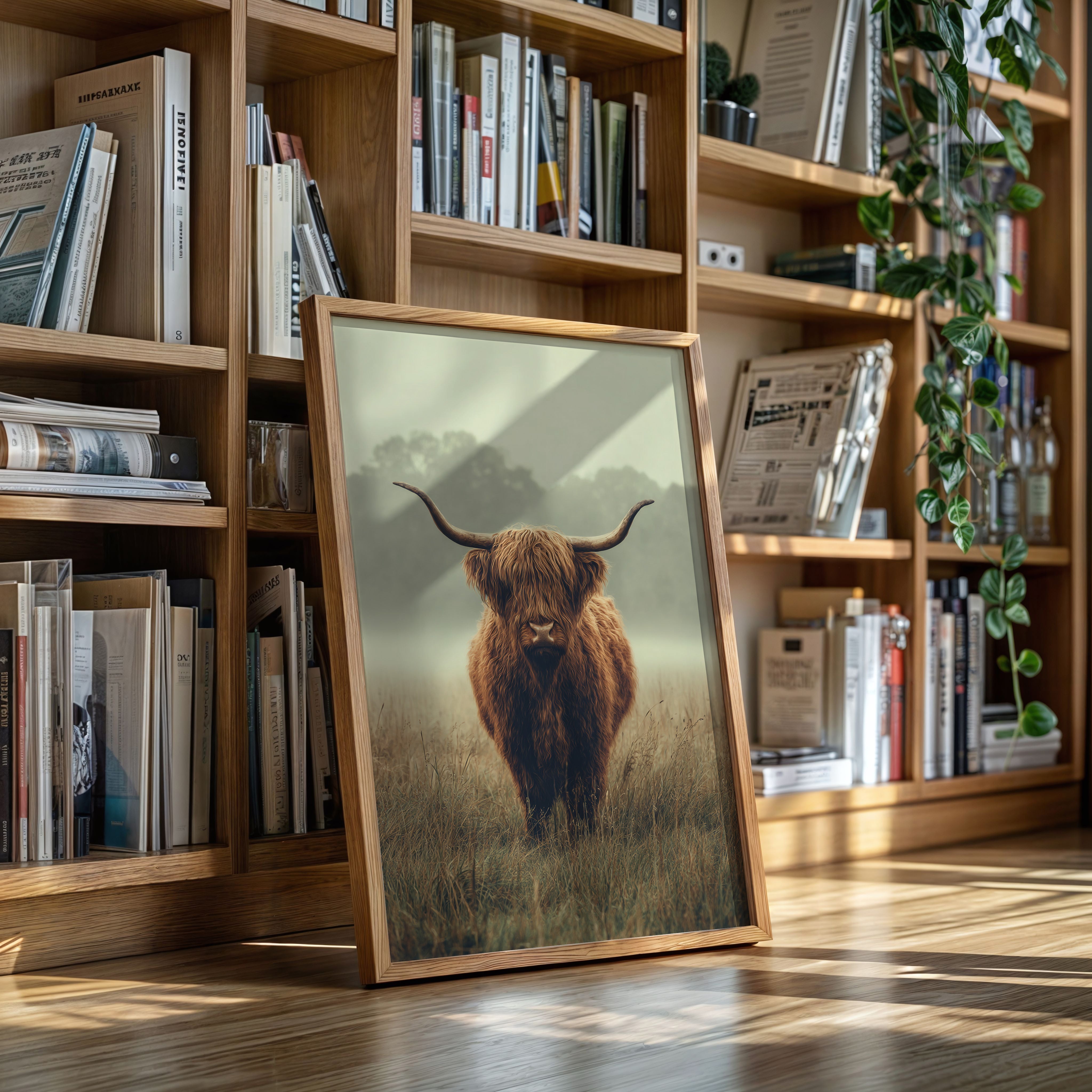 A solitary Highland cow stands resolute in a tranquil meadow, its warm, shaggy fur glowing softly in the muted morning light. This piece captures the essence of rustic charm, inviting viewers to pause and reflect. The gentle contours of the landscape meld with the rich hues of nature, creating a serene tableau that speaks to the heart of artisanal craftsmanship. Imagine this piece gracing a cozy farmhouse kitchen or a serene reading nook, evoking a sense of peace and connection to the earth.
