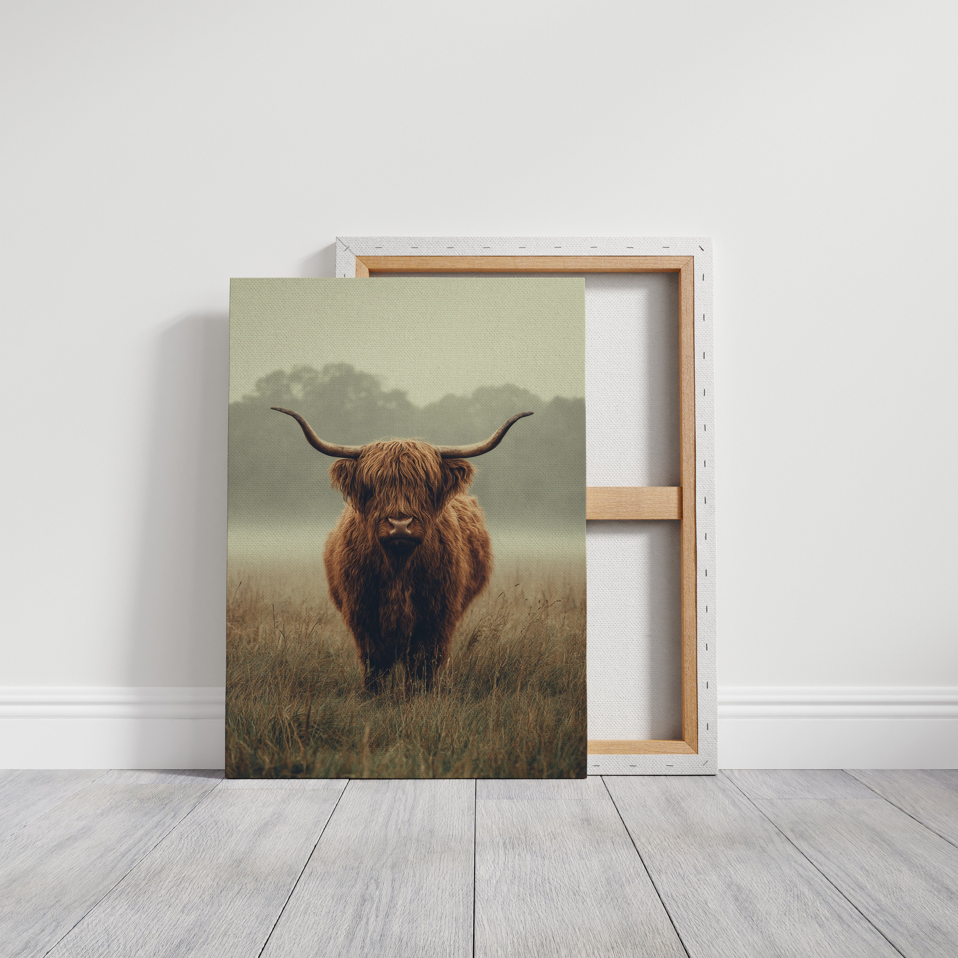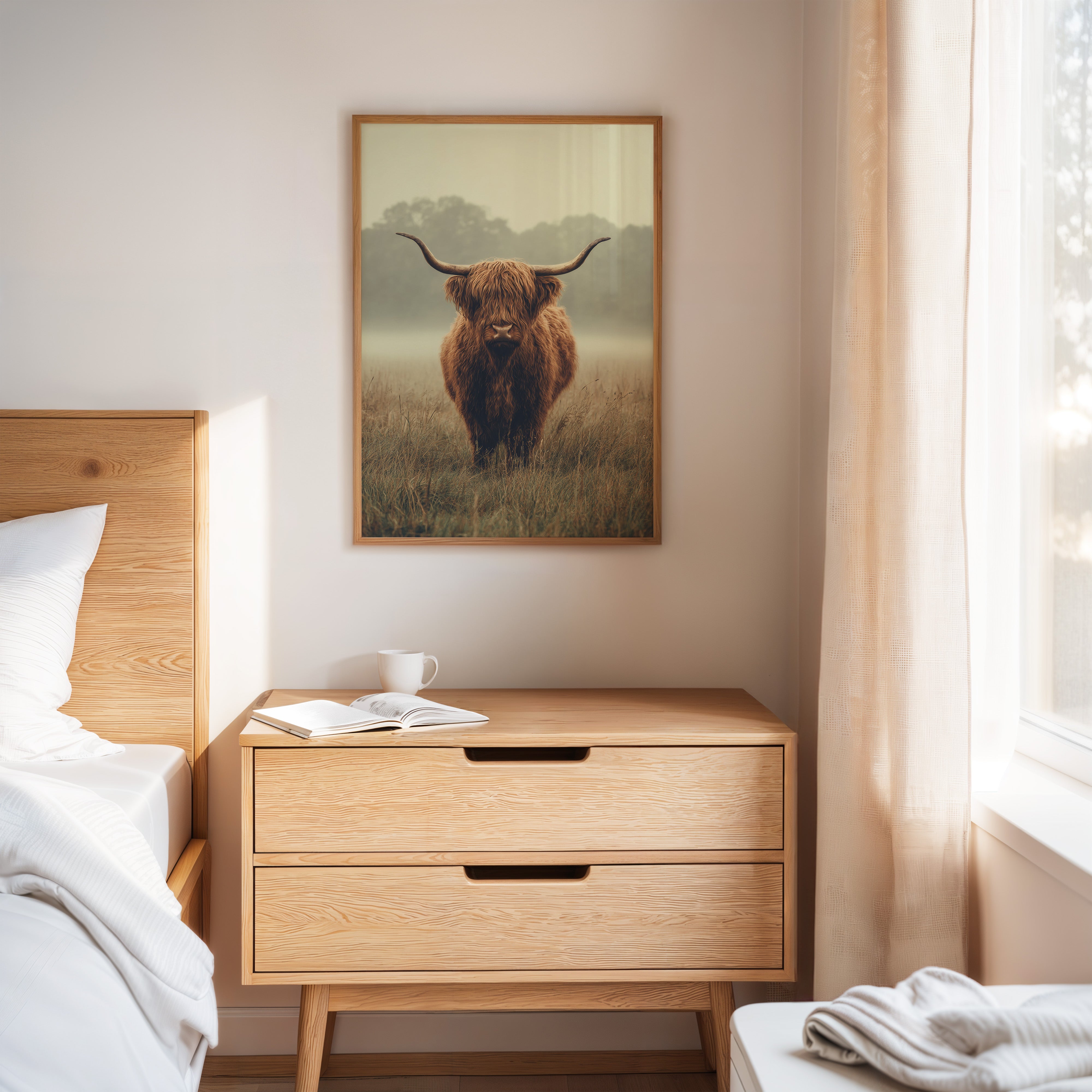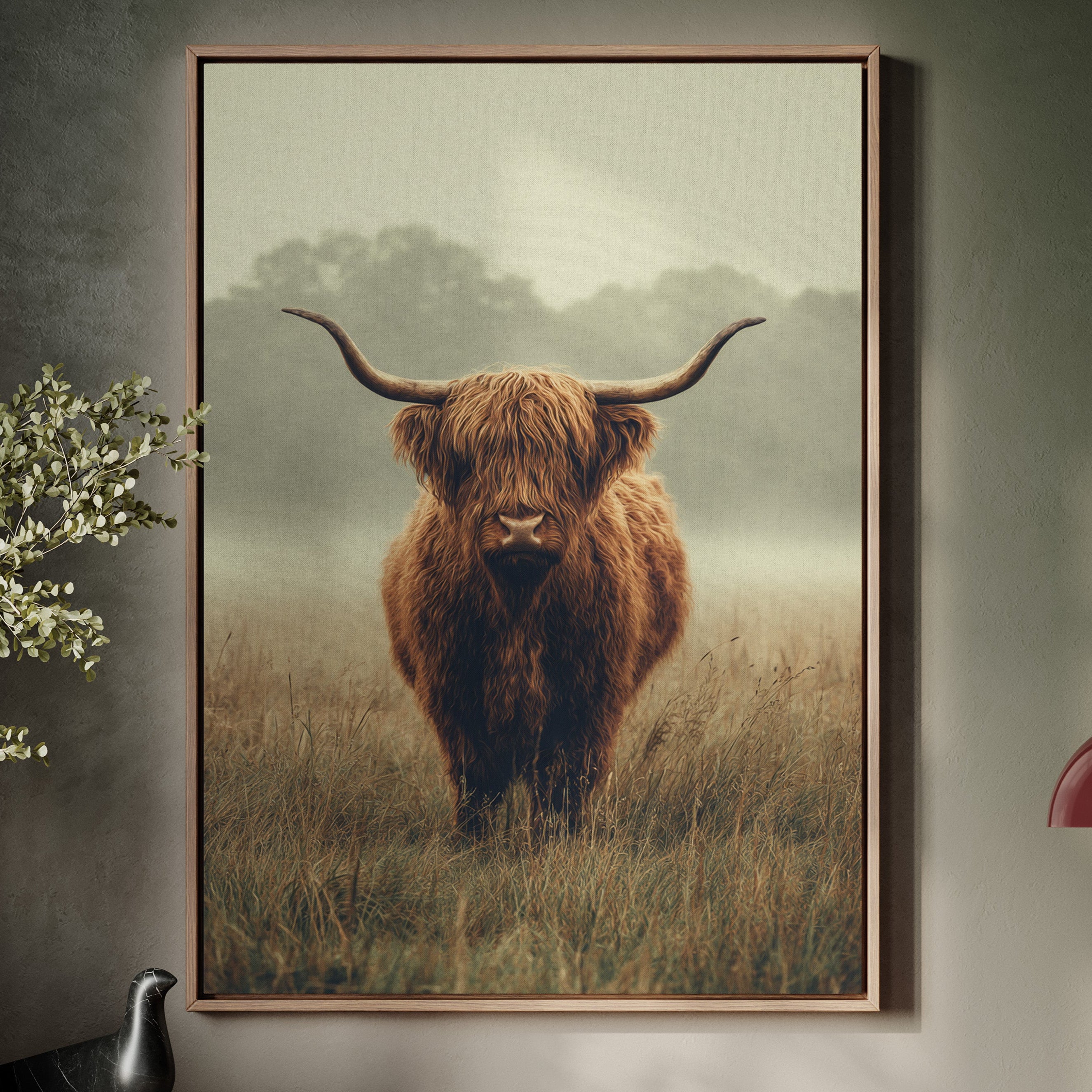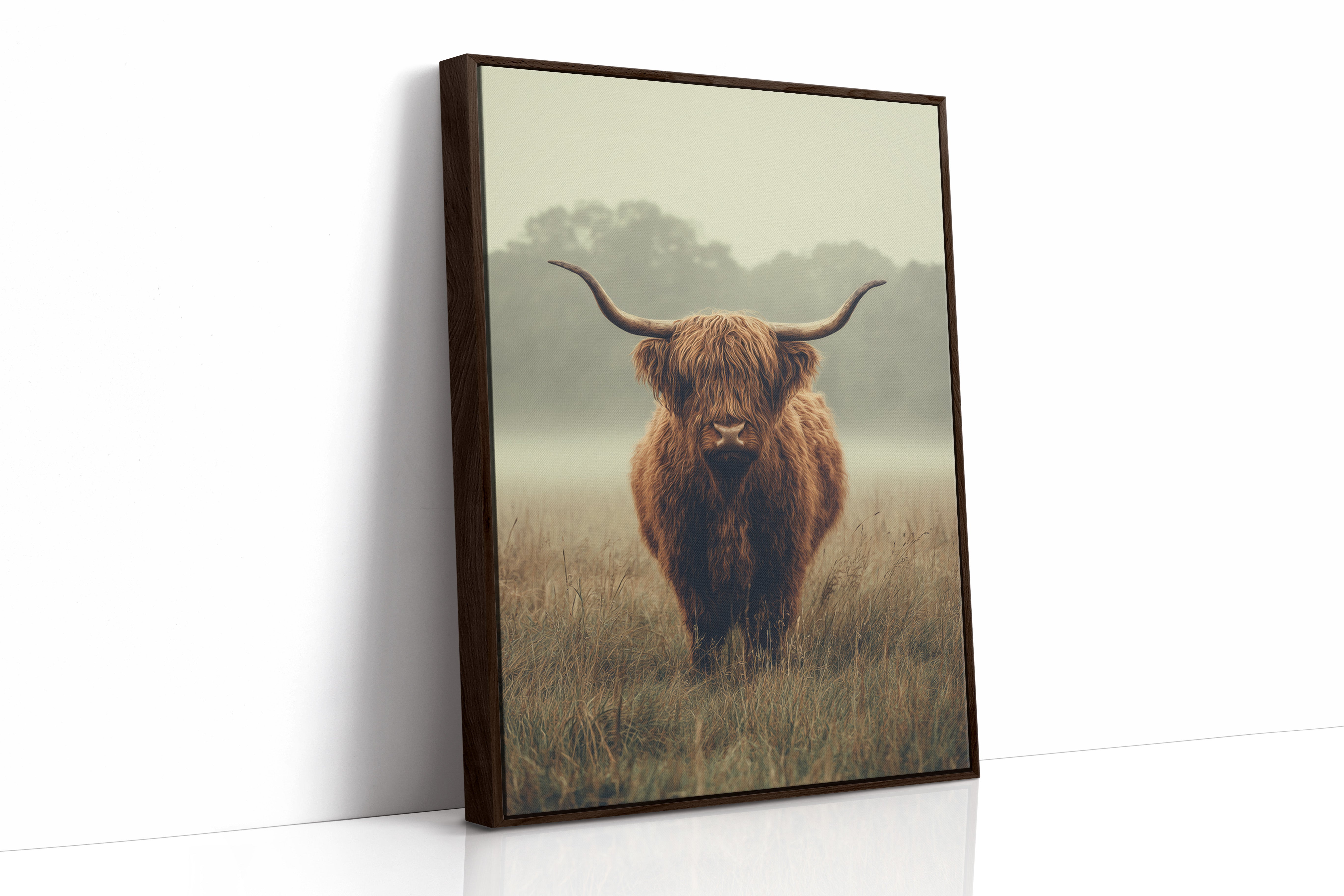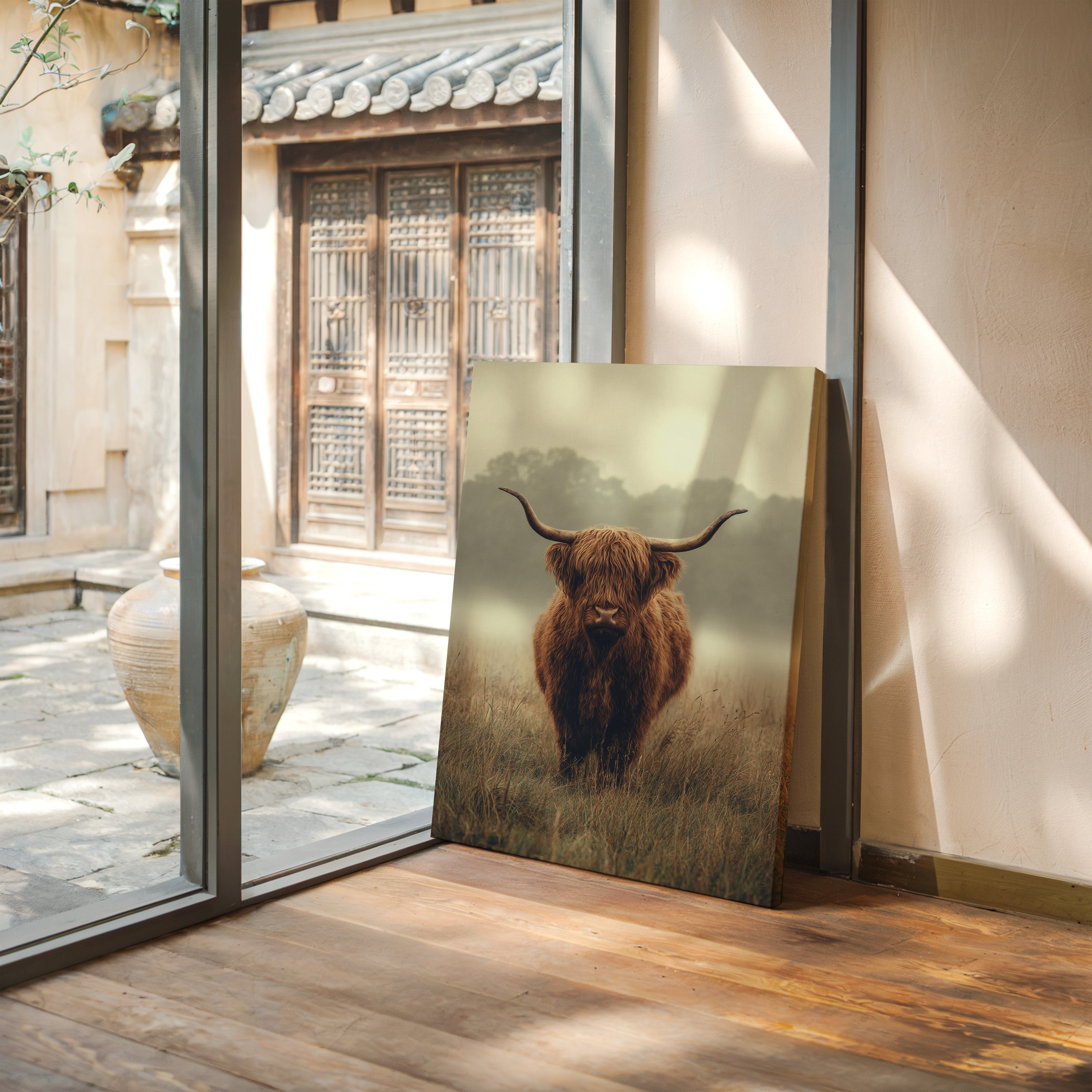 A solitary Highland cow stands resolute in a tranquil meadow, its warm, shaggy fur glowing softly in the muted morning light. This piece captures the essence of rustic charm, inviting viewers to pause and reflect. The gentle contours of the landscape meld with the rich hues of nature, creating a serene tableau that speaks to the heart of artisanal craftsmanship. Imagine this piece gracing a cozy farmhouse kitchen or a serene reading nook, evoking a sense of peace and connection to the earth.