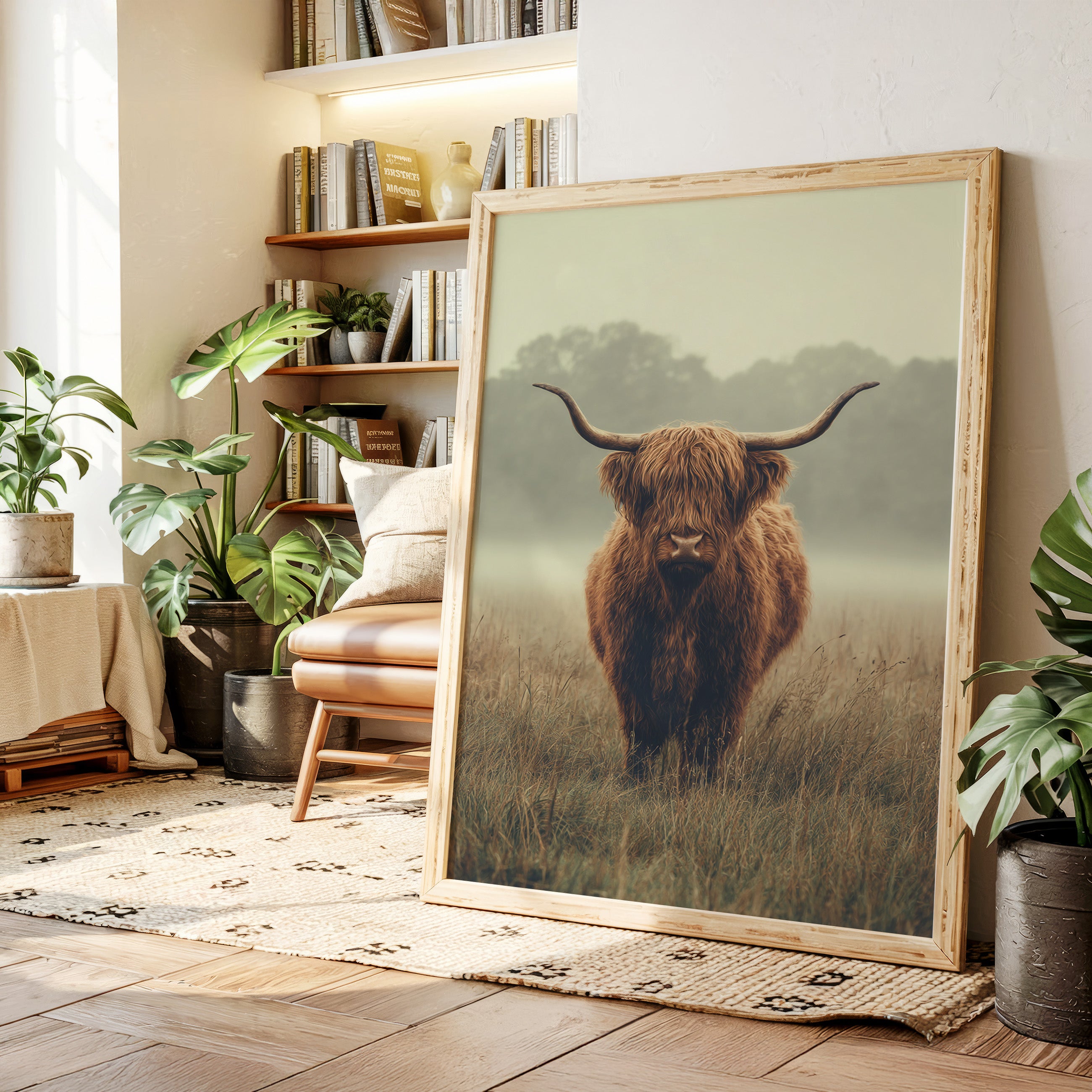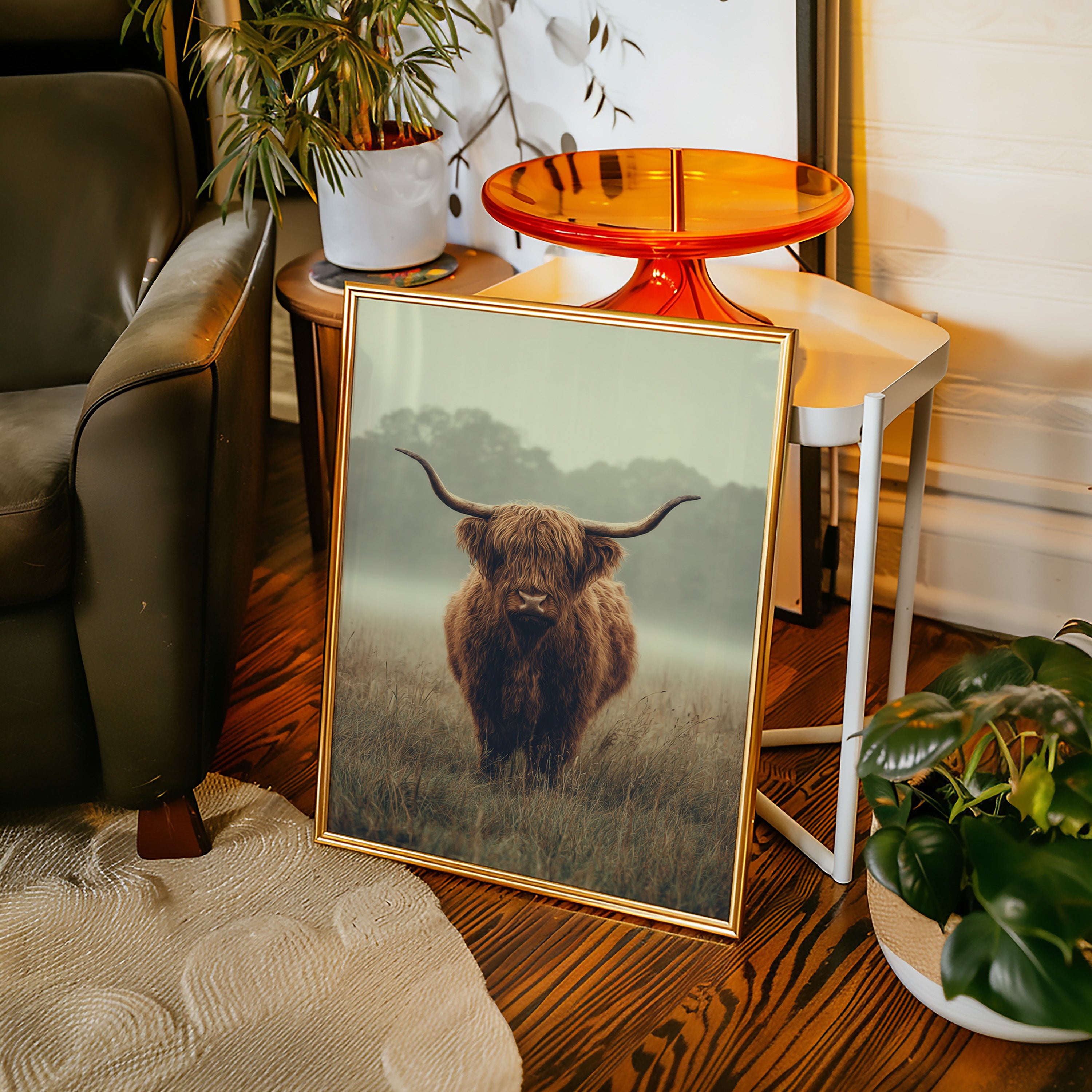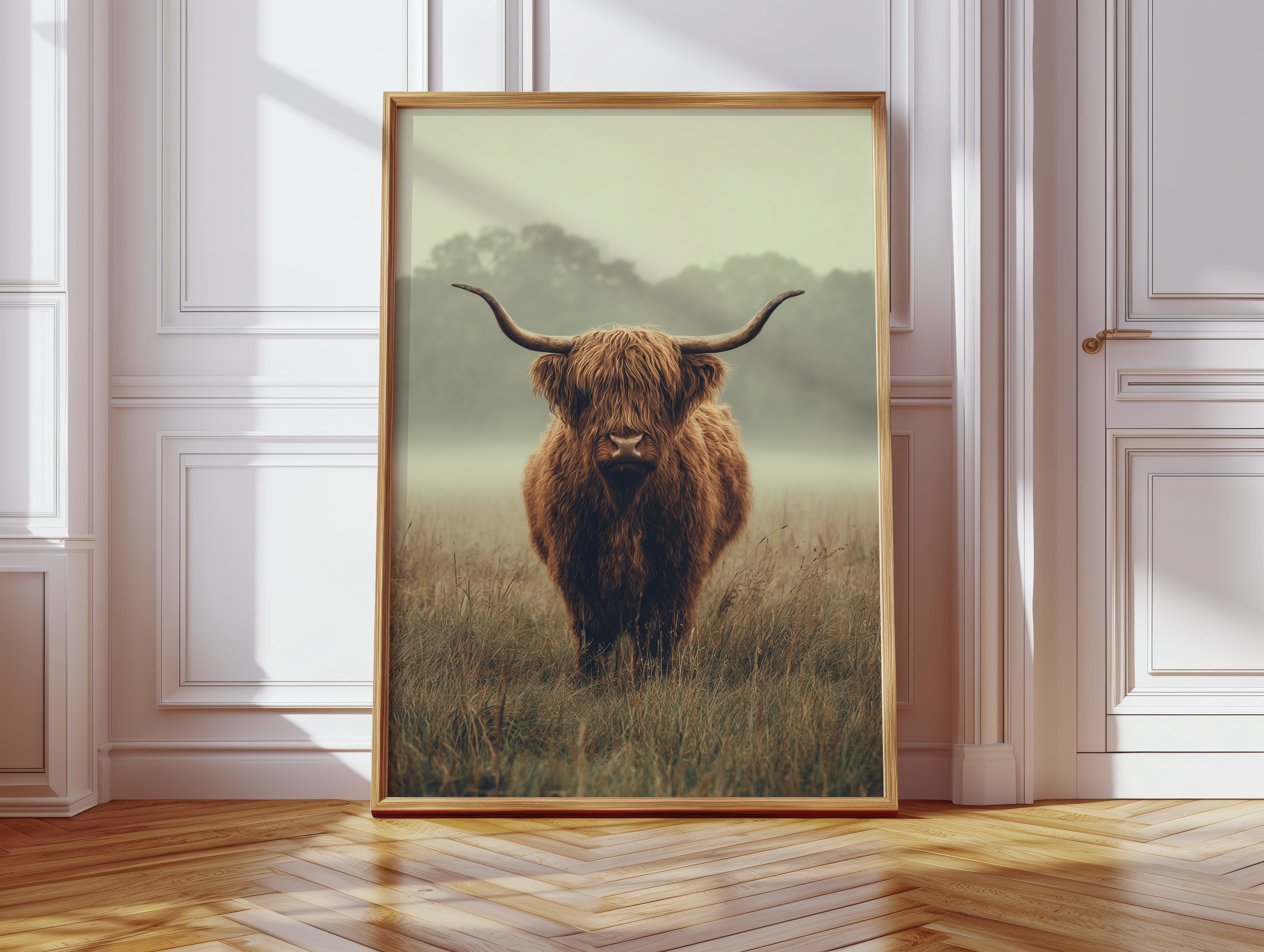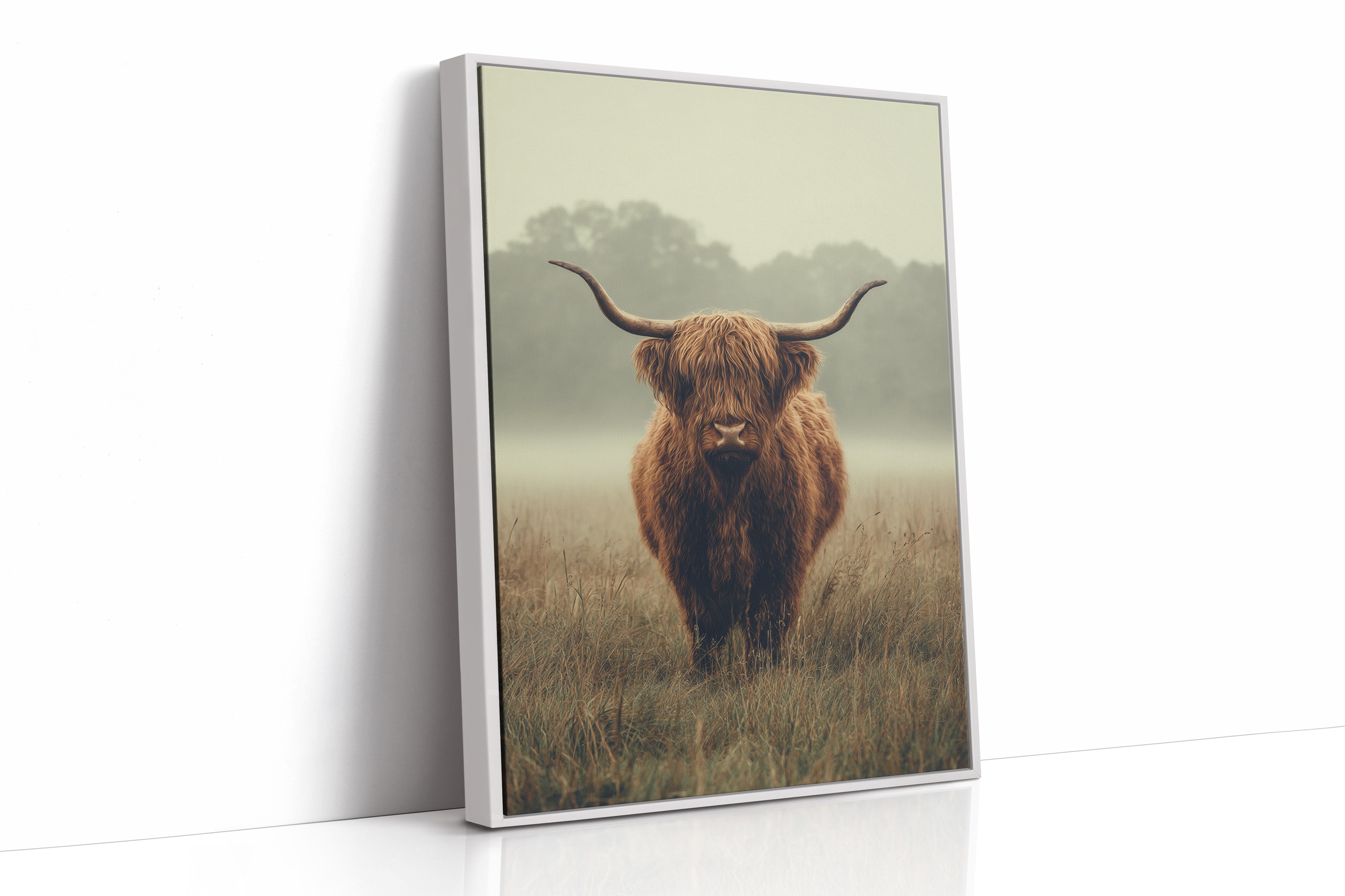 A solitary Highland cow stands resolute in a tranquil meadow, its warm, shaggy fur glowing softly in the muted morning light. This piece captures the essence of rustic charm, inviting viewers to pause and reflect. The gentle contours of the landscape meld with the rich hues of nature, creating a serene tableau that speaks to the heart of artisanal craftsmanship. Imagine this piece gracing a cozy farmhouse kitchen or a serene reading nook, evoking a sense of peace and connection to the earth.