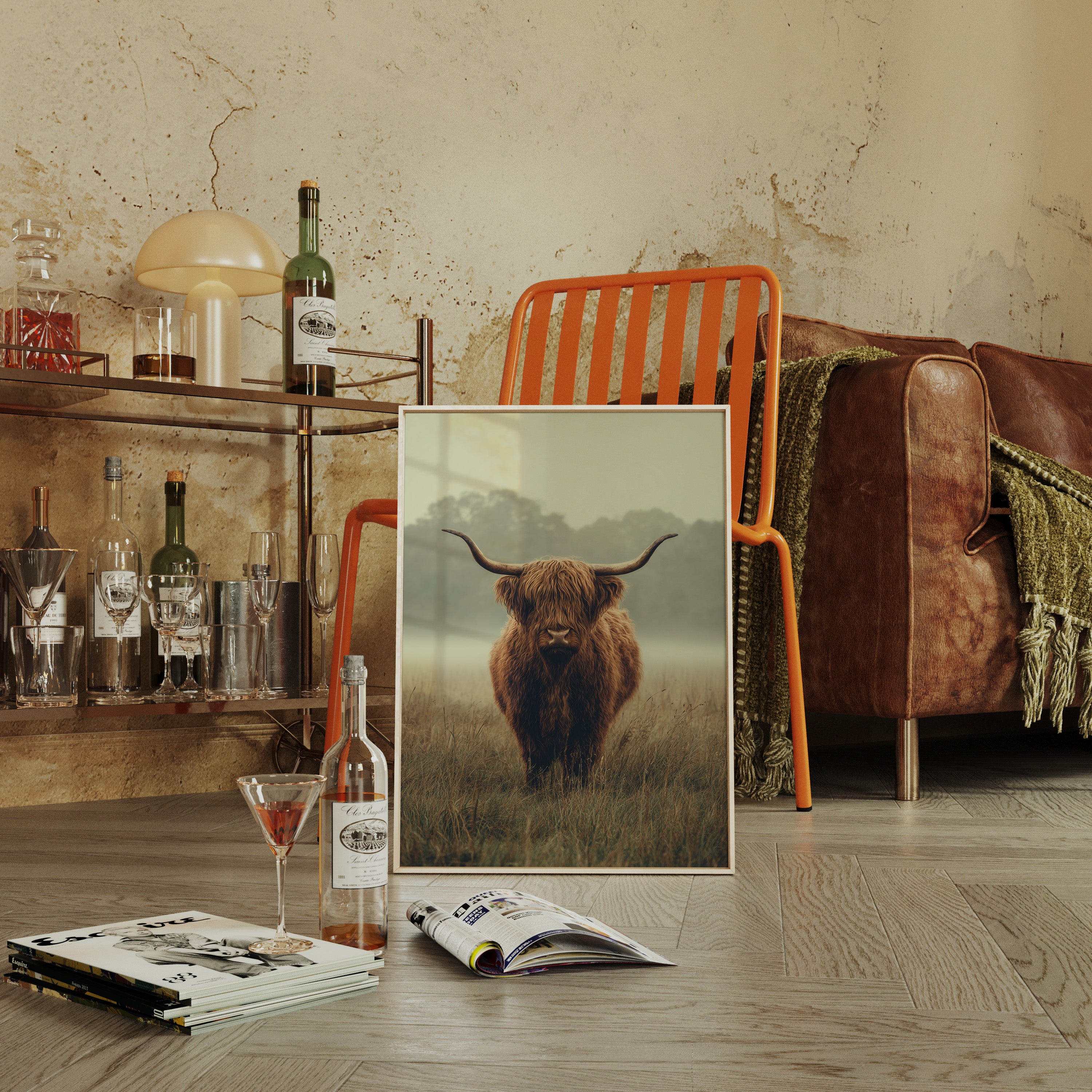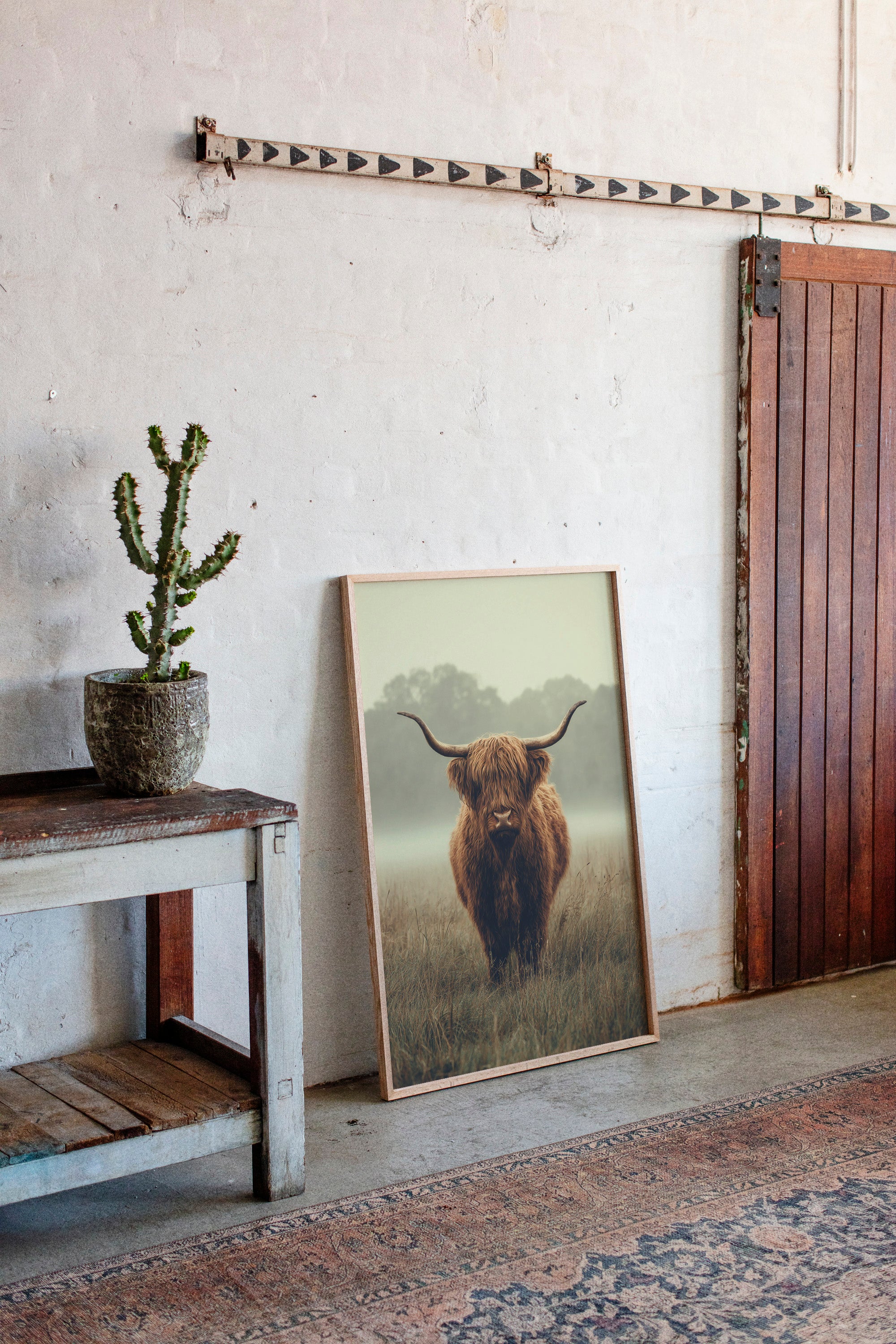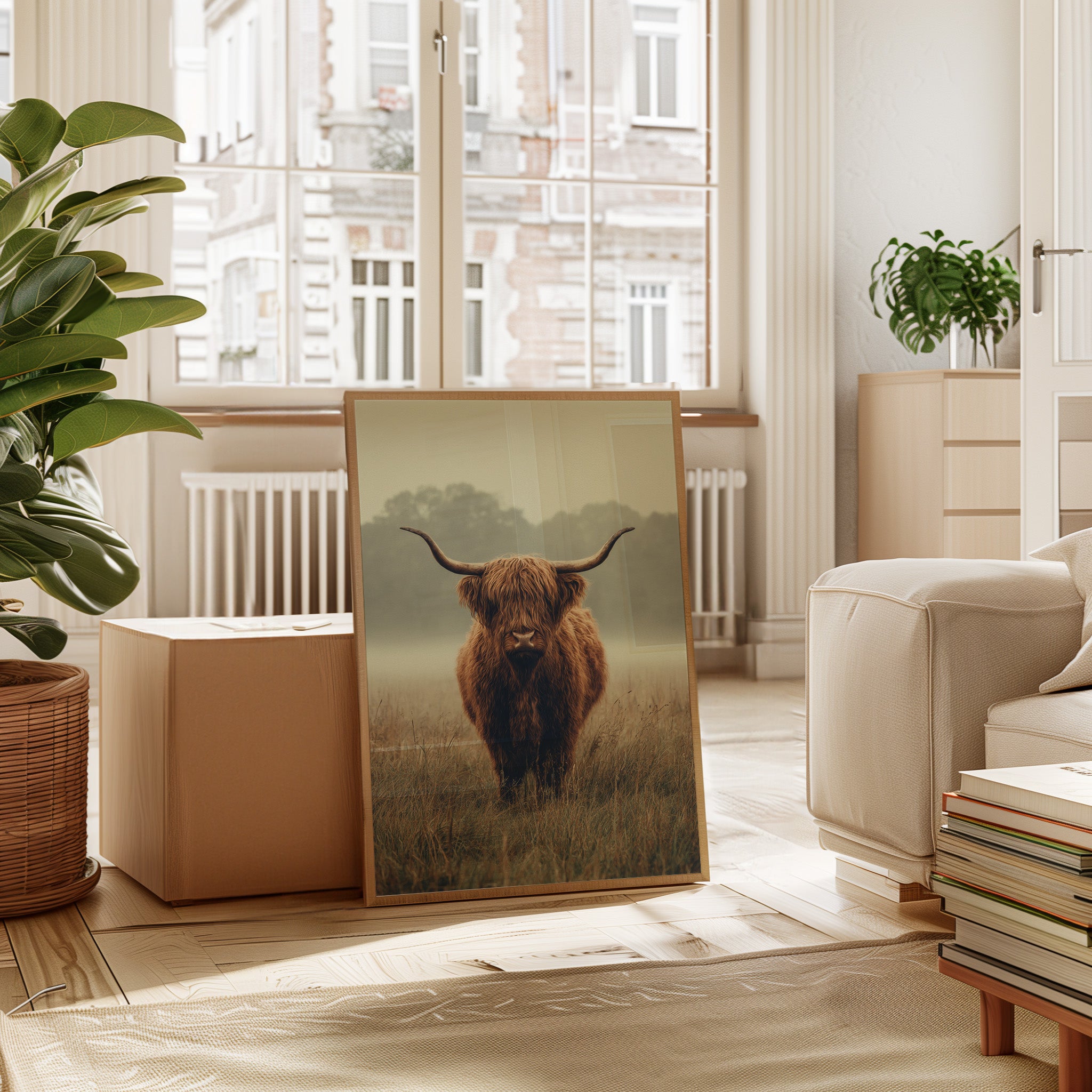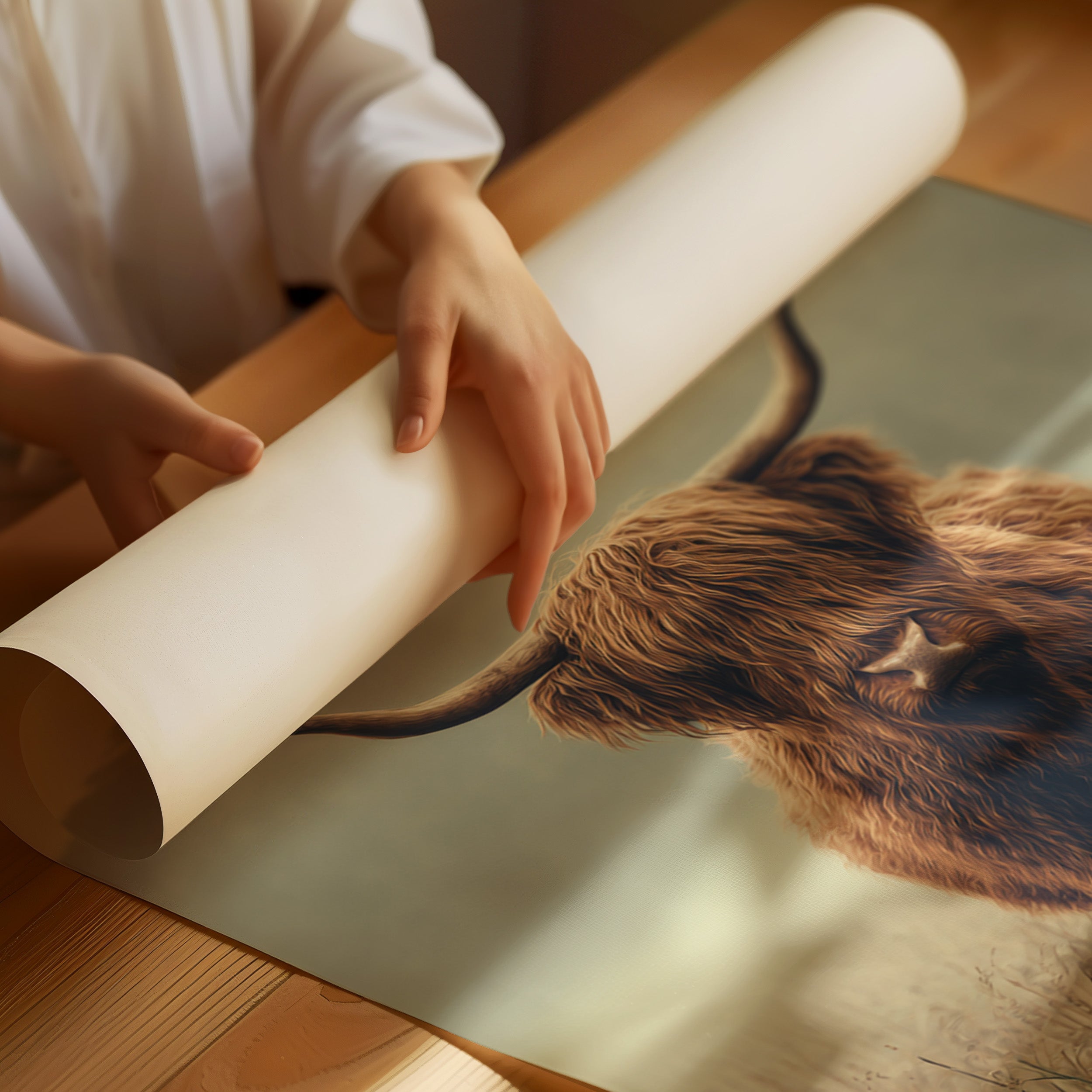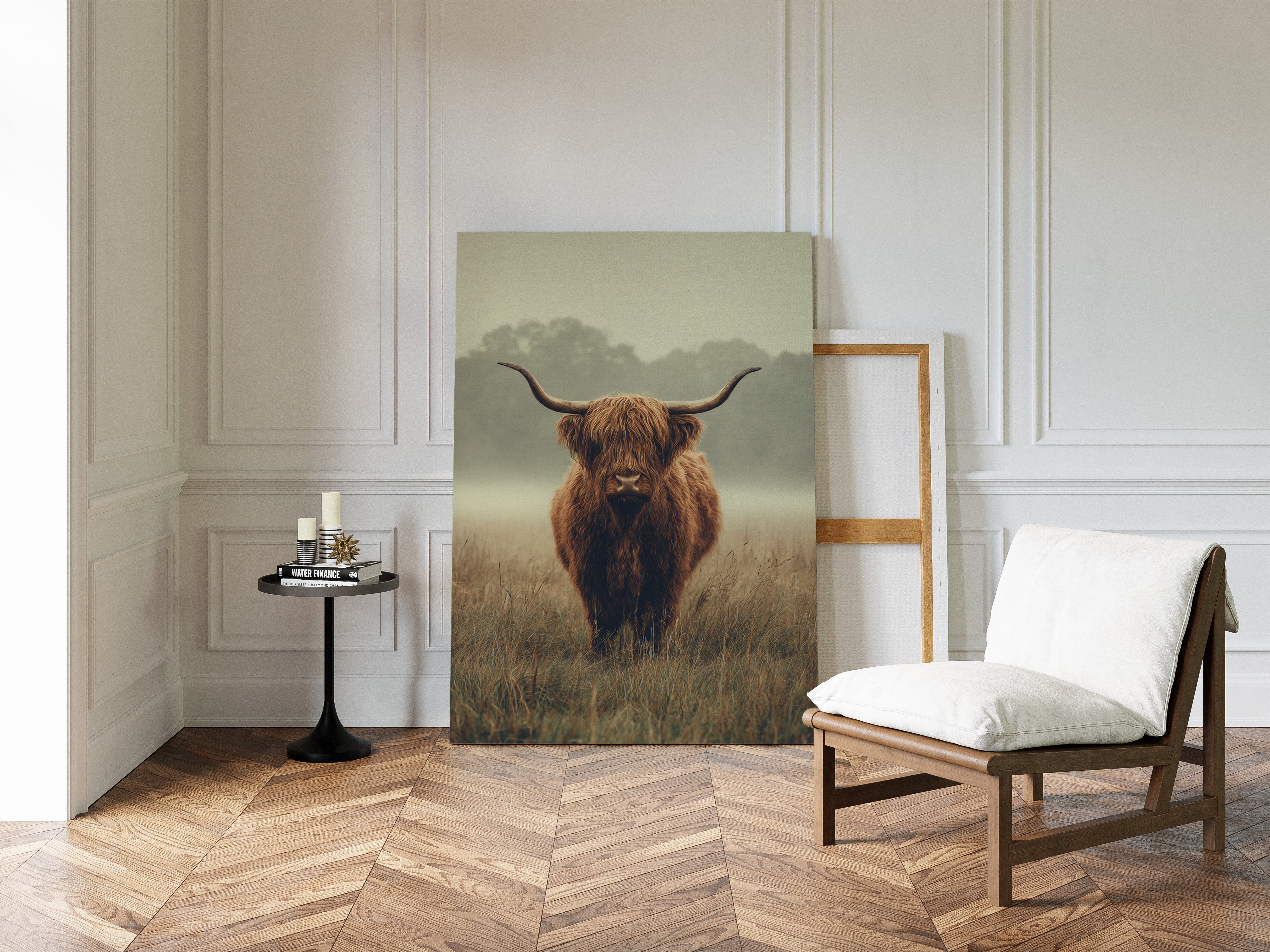 A solitary Highland cow stands resolute in a tranquil meadow, its warm, shaggy fur glowing softly in the muted morning light. This piece captures the essence of rustic charm, inviting viewers to pause and reflect. The gentle contours of the landscape meld with the rich hues of nature, creating a serene tableau that speaks to the heart of artisanal craftsmanship. Imagine this piece gracing a cozy farmhouse kitchen or a serene reading nook, evoking a sense of peace and connection to the earth.