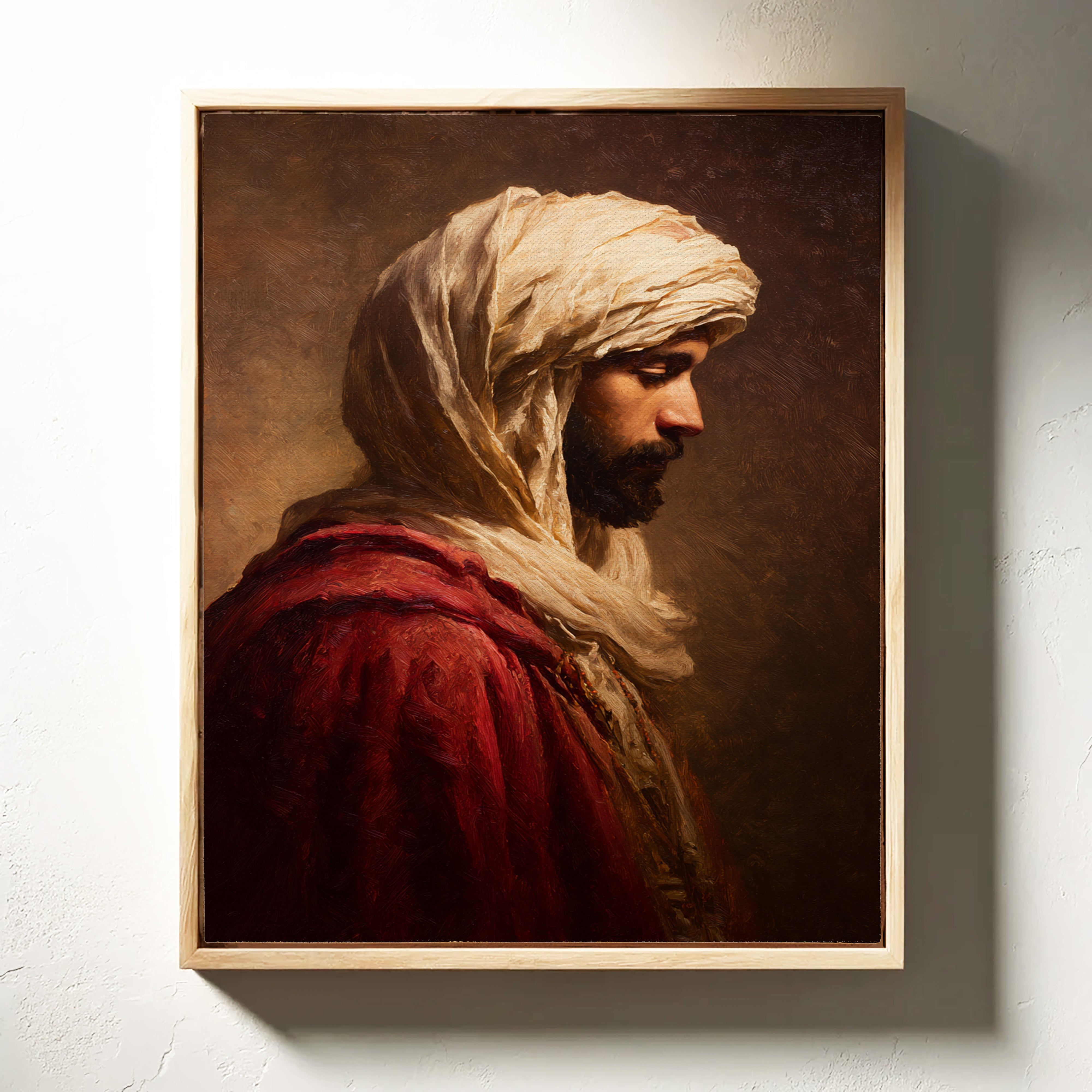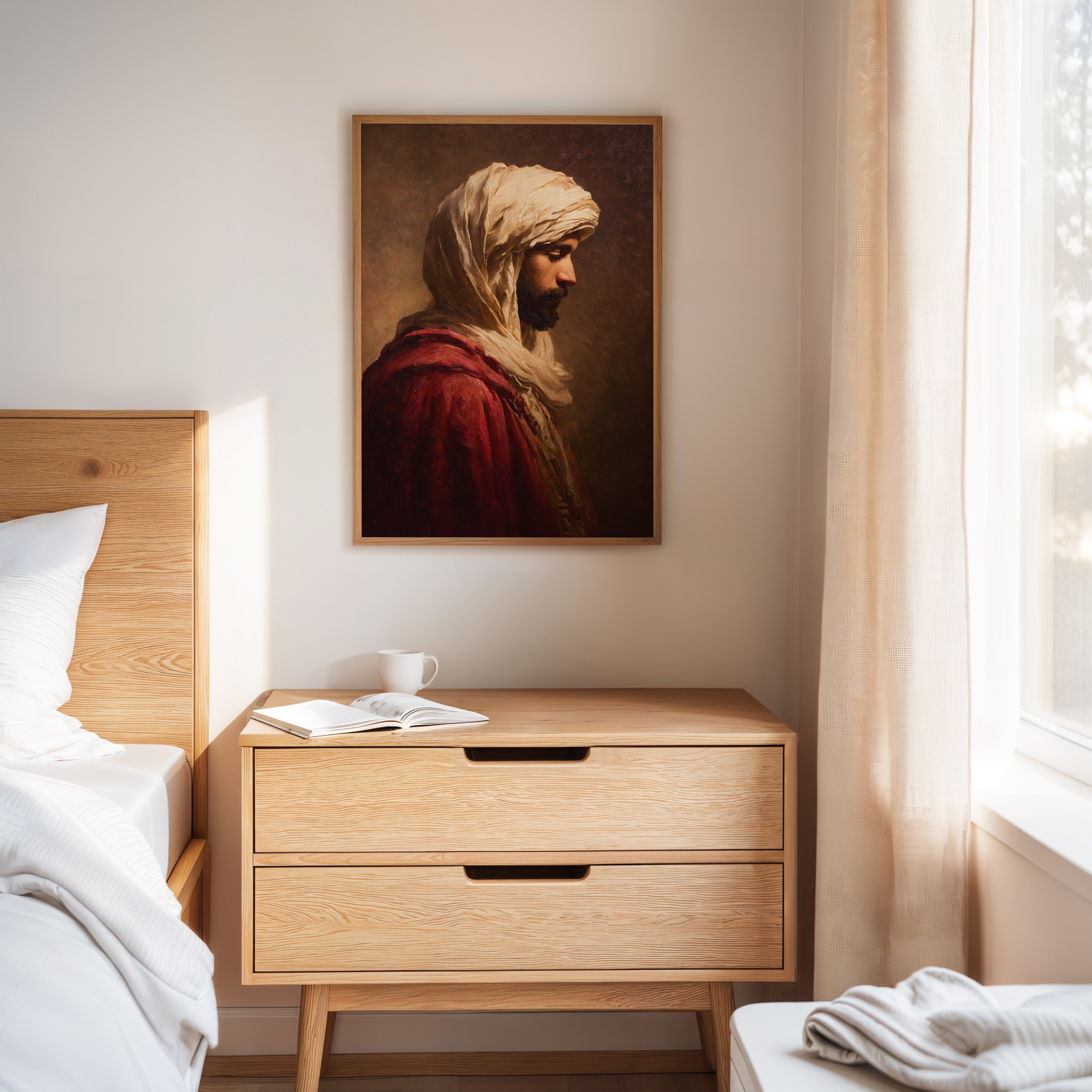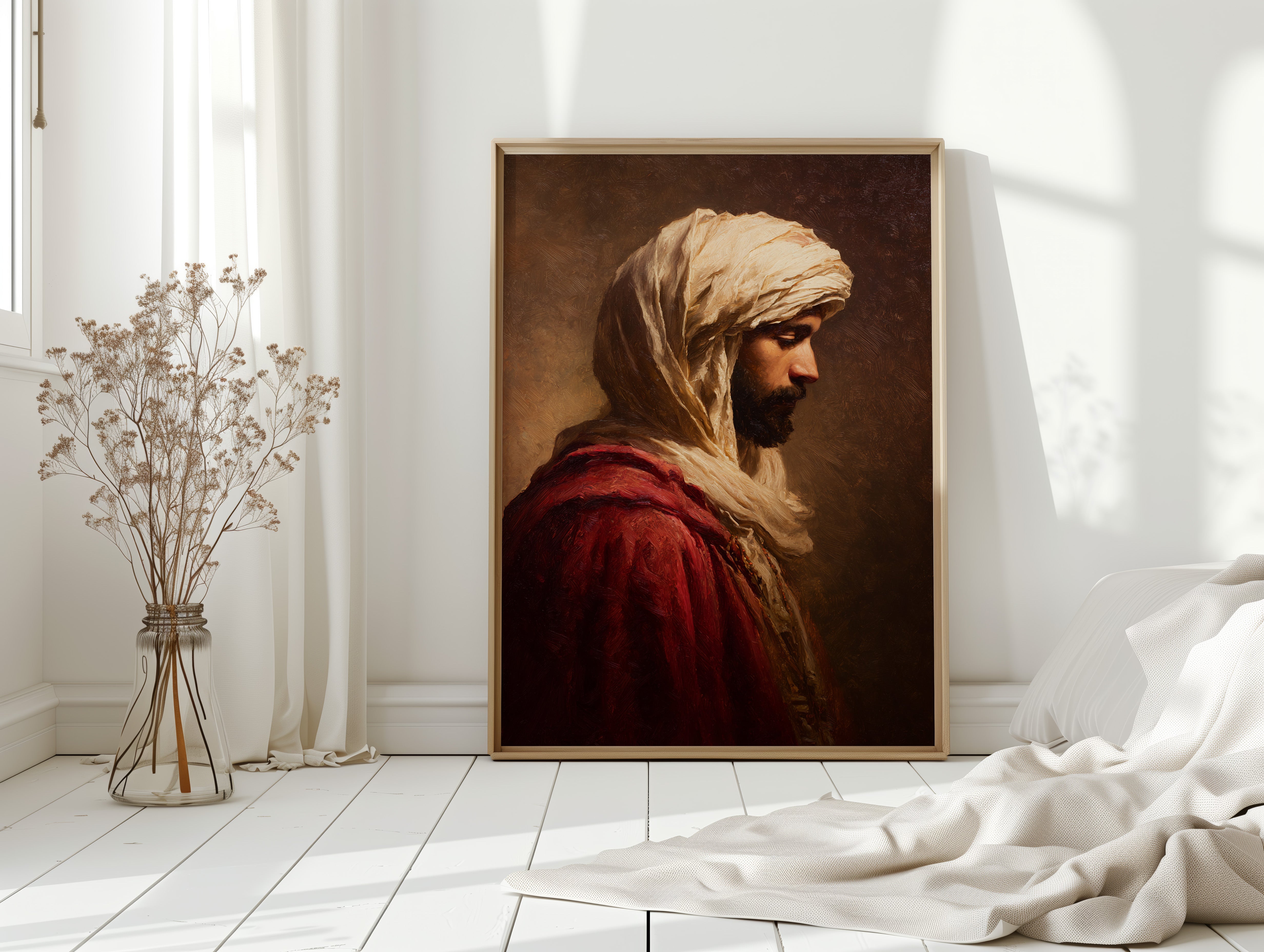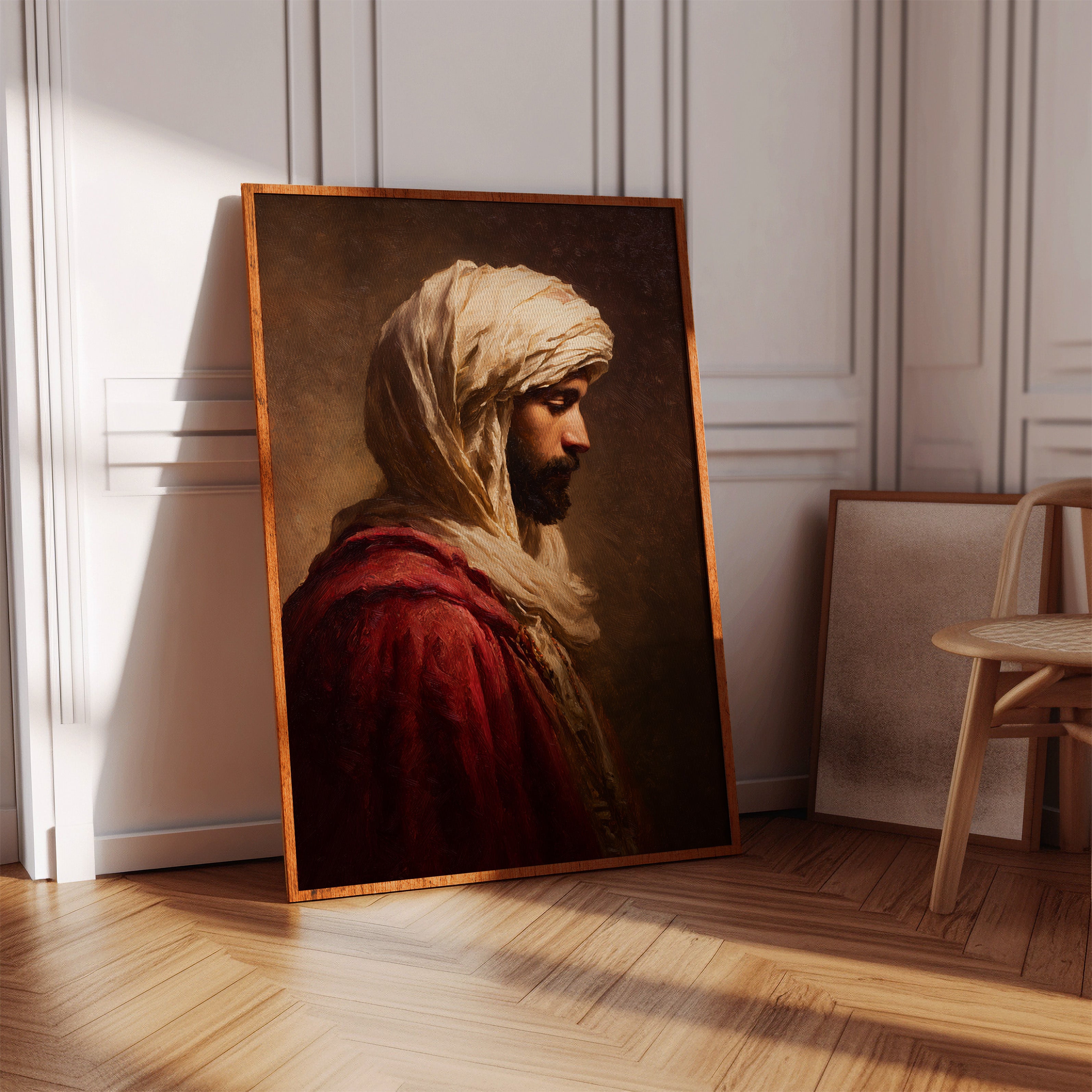 A moment suspended in time, where the fabric of tradition weaves through the air, inviting contemplation. This piece embodies the artisanal spirit, capturing the essence of heritage and craftsmanship. The rich textures of the robe contrast with the soft hues of the background, creating a dialogue between presence and absence, strength and vulnerability. Ideal for a serene reading nook or a contemplative corner, this artwork serves as a reminder of the stories held within each stitch and fold.
