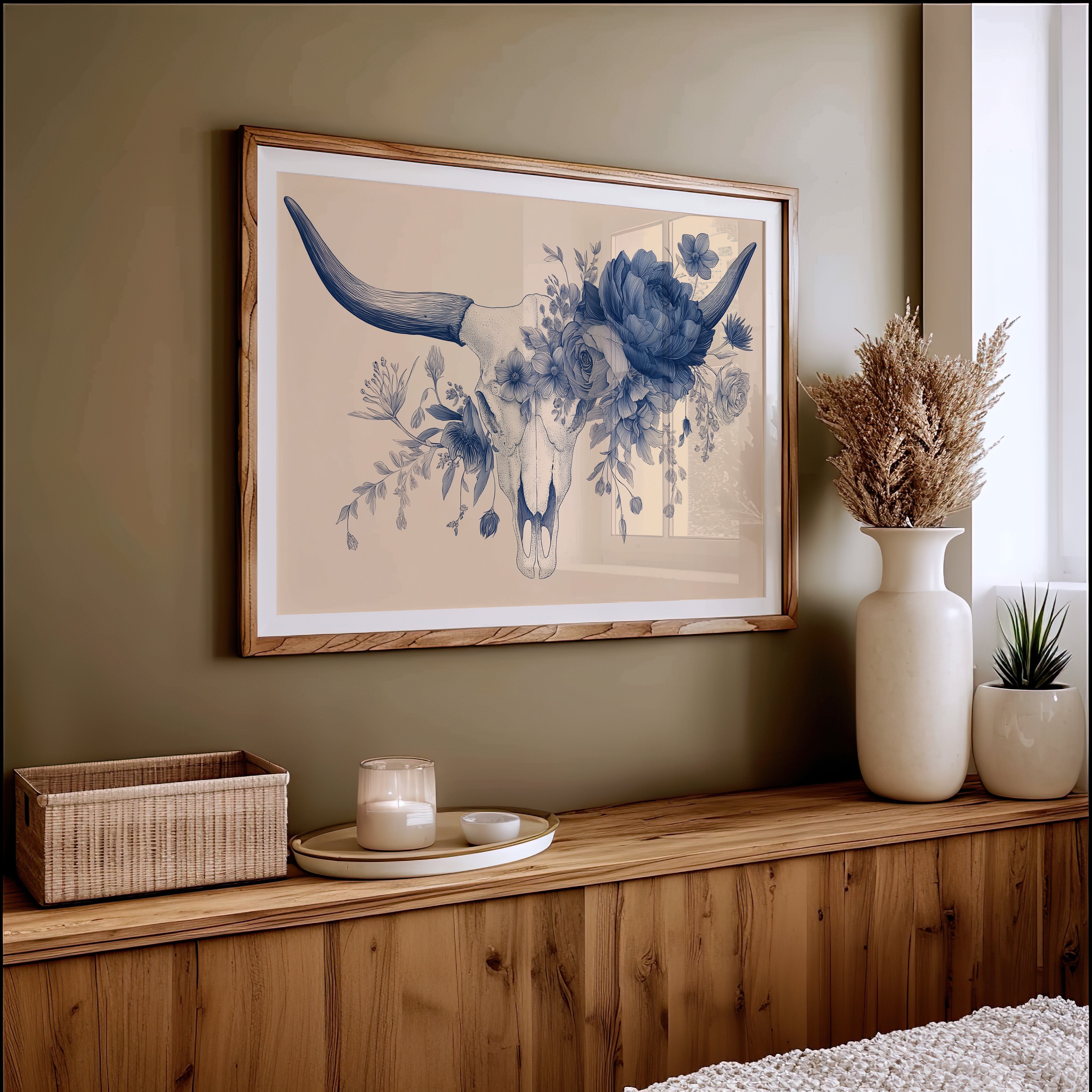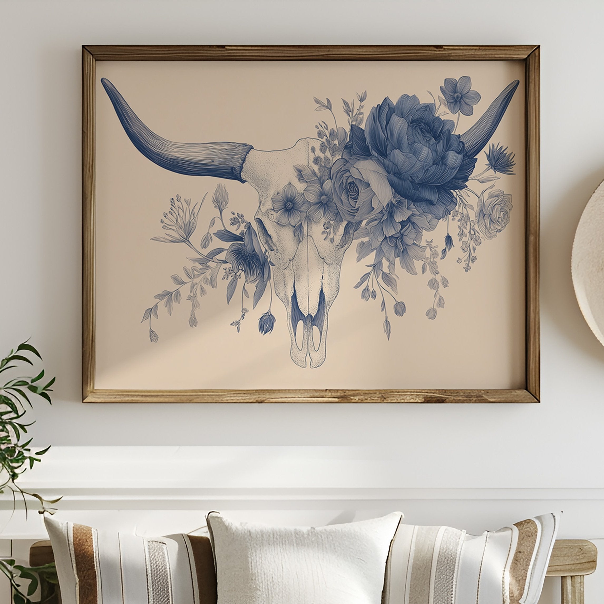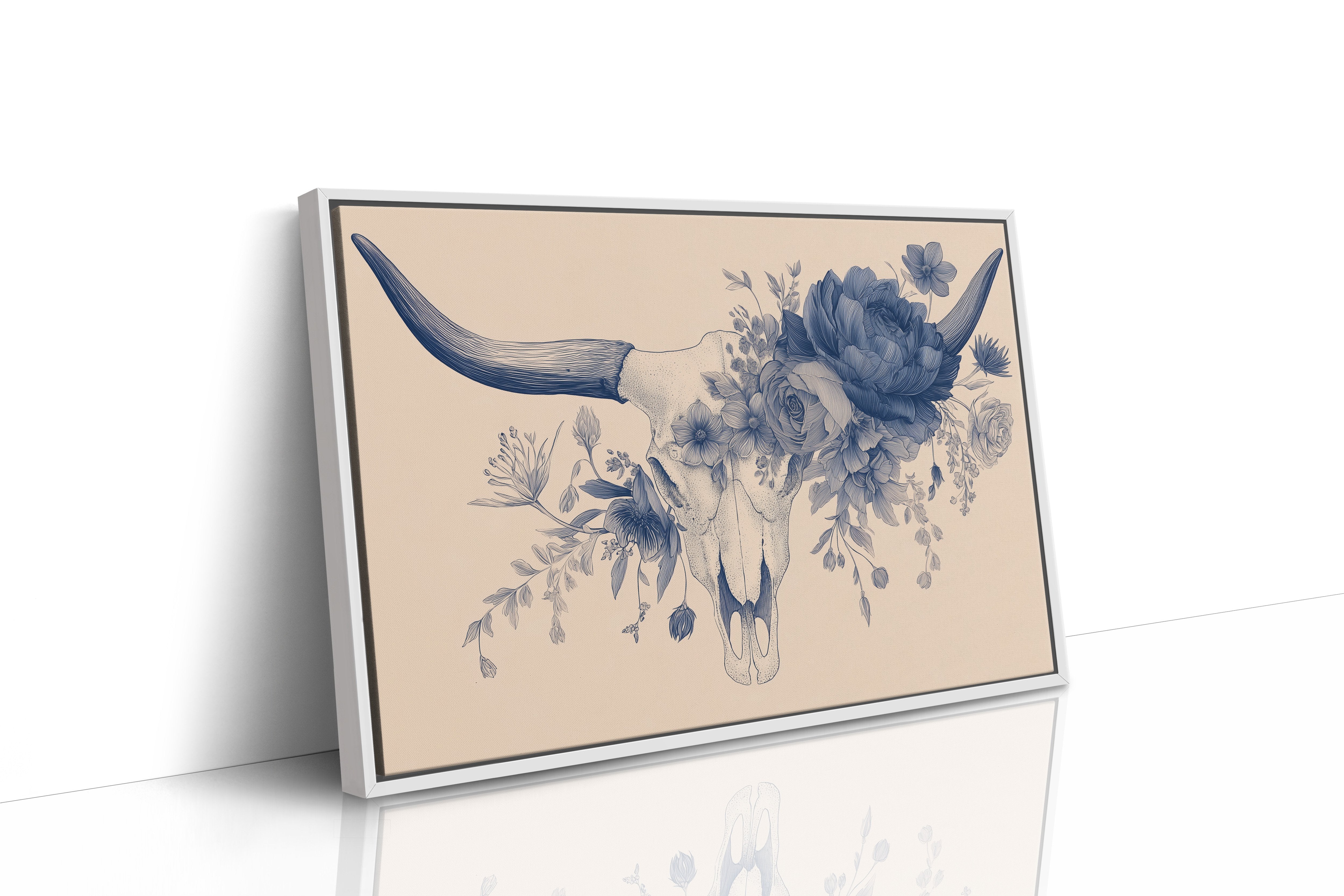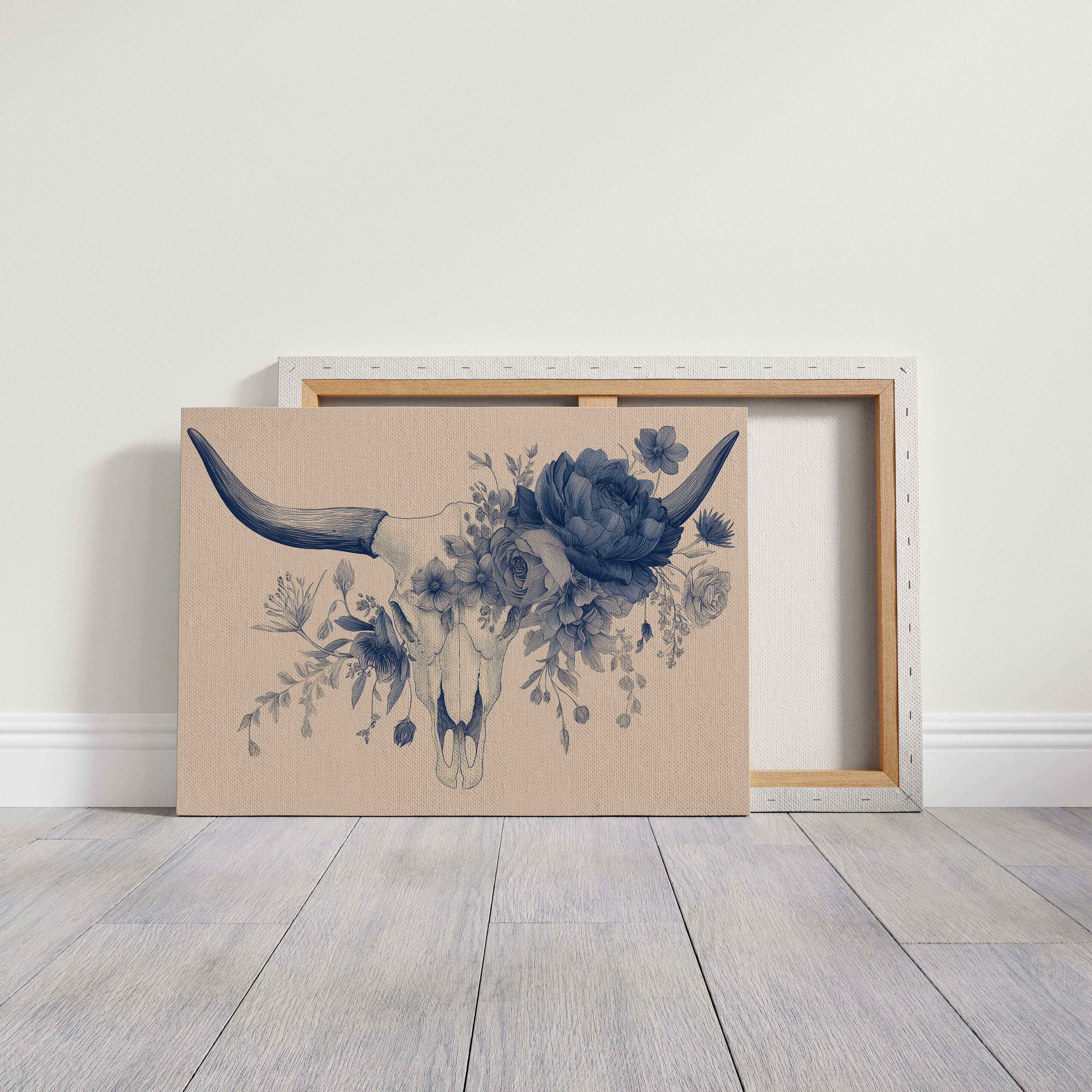Delicate blue petals intertwine with stark mortality, creating a haunting dance between life and death. The monochromatic illustration transforms a cattle skull into a vessel of rebirth, where lush florals emerge from hollow bone in intricate detail against warm beige. This contemporary memento mori speaks to the cyclical nature of existence, rendered with both scientific precision and poetic sensibility.