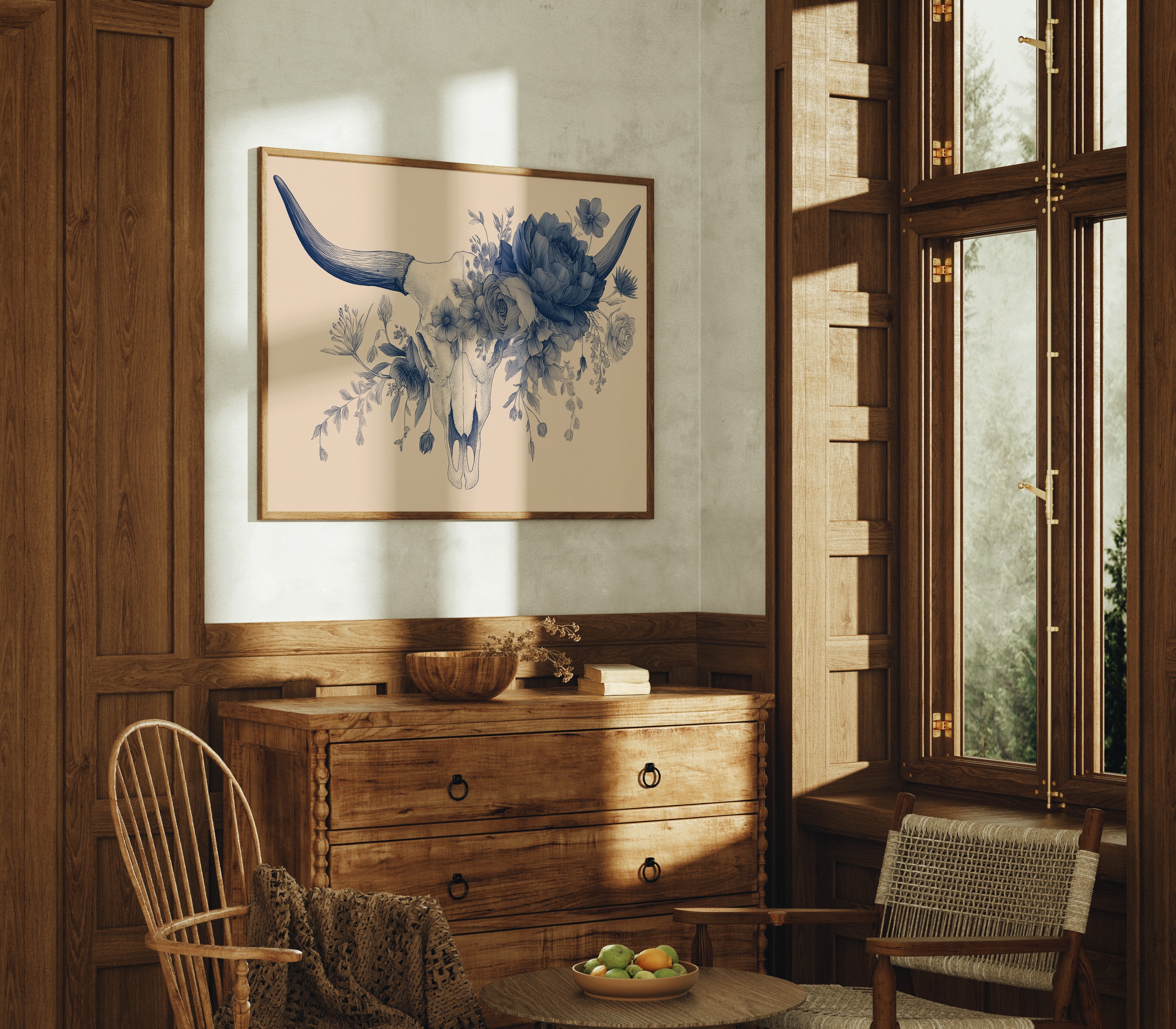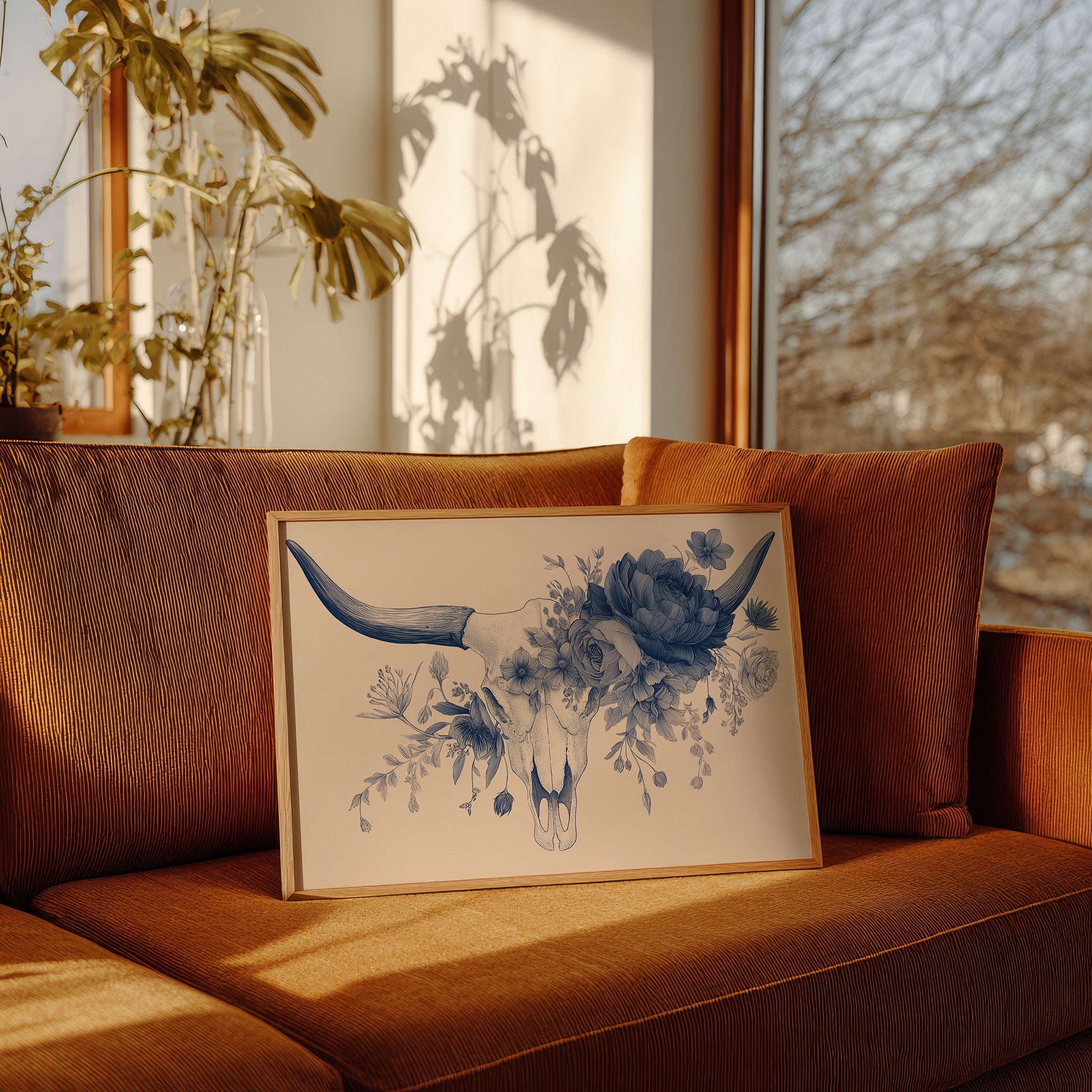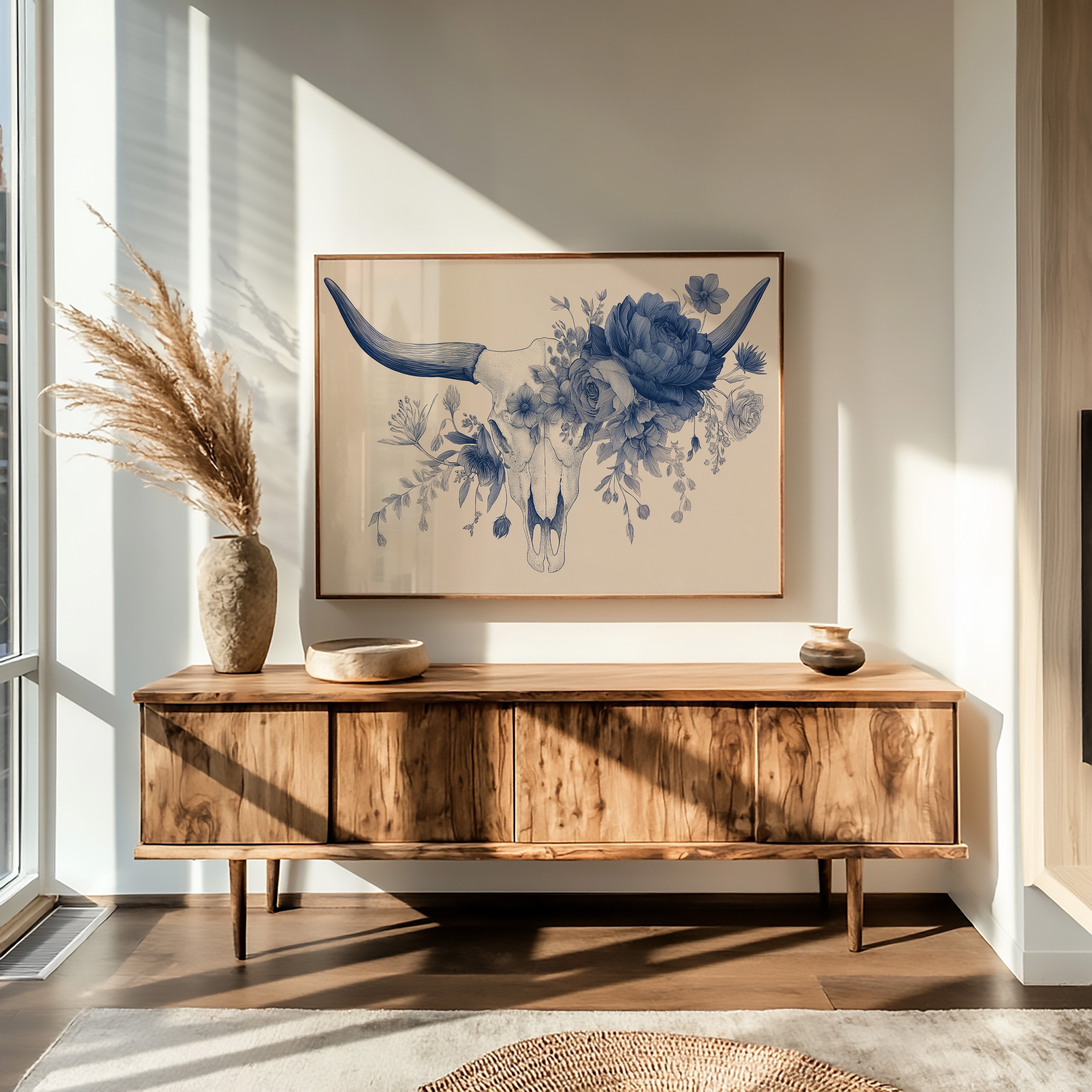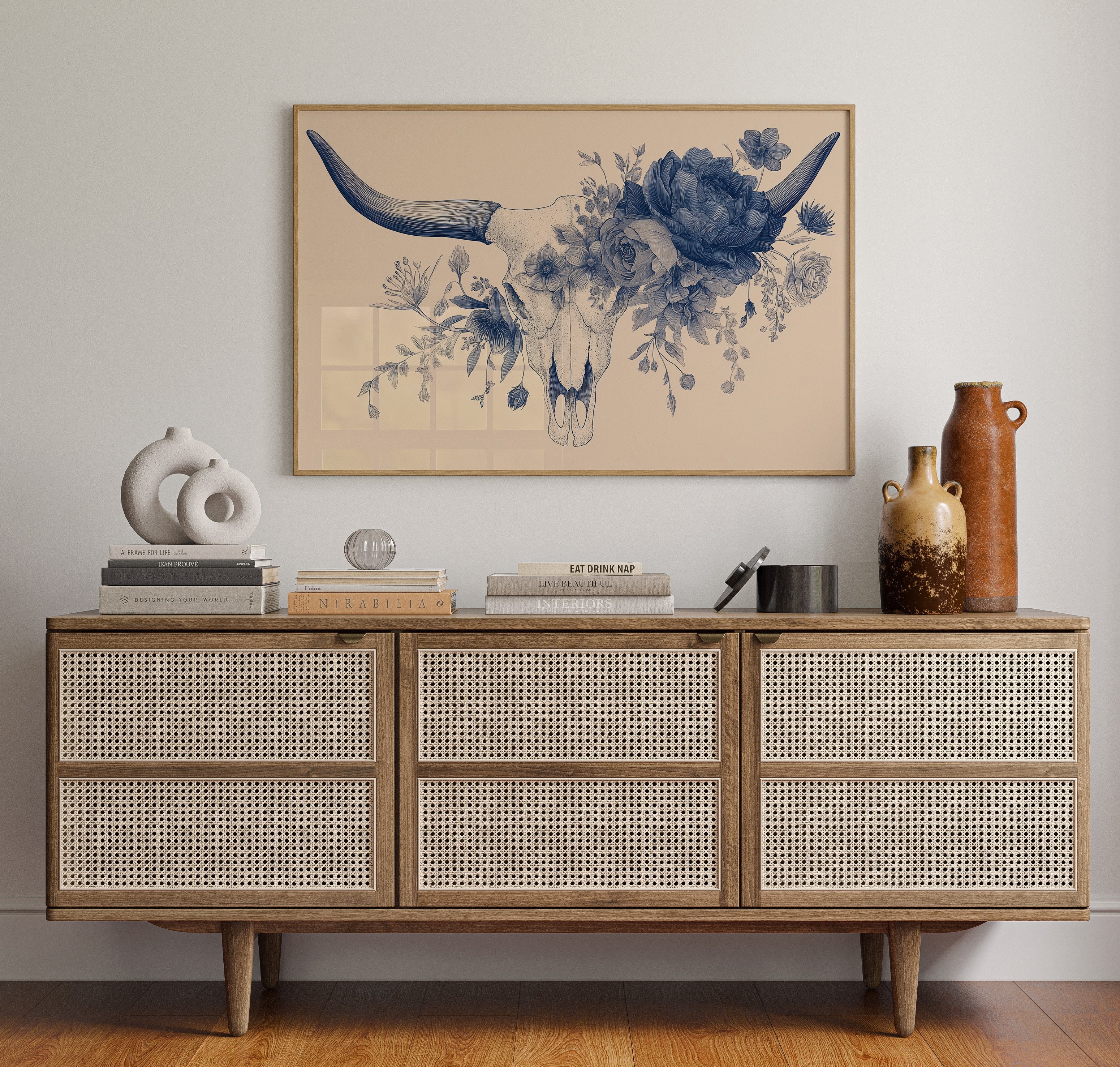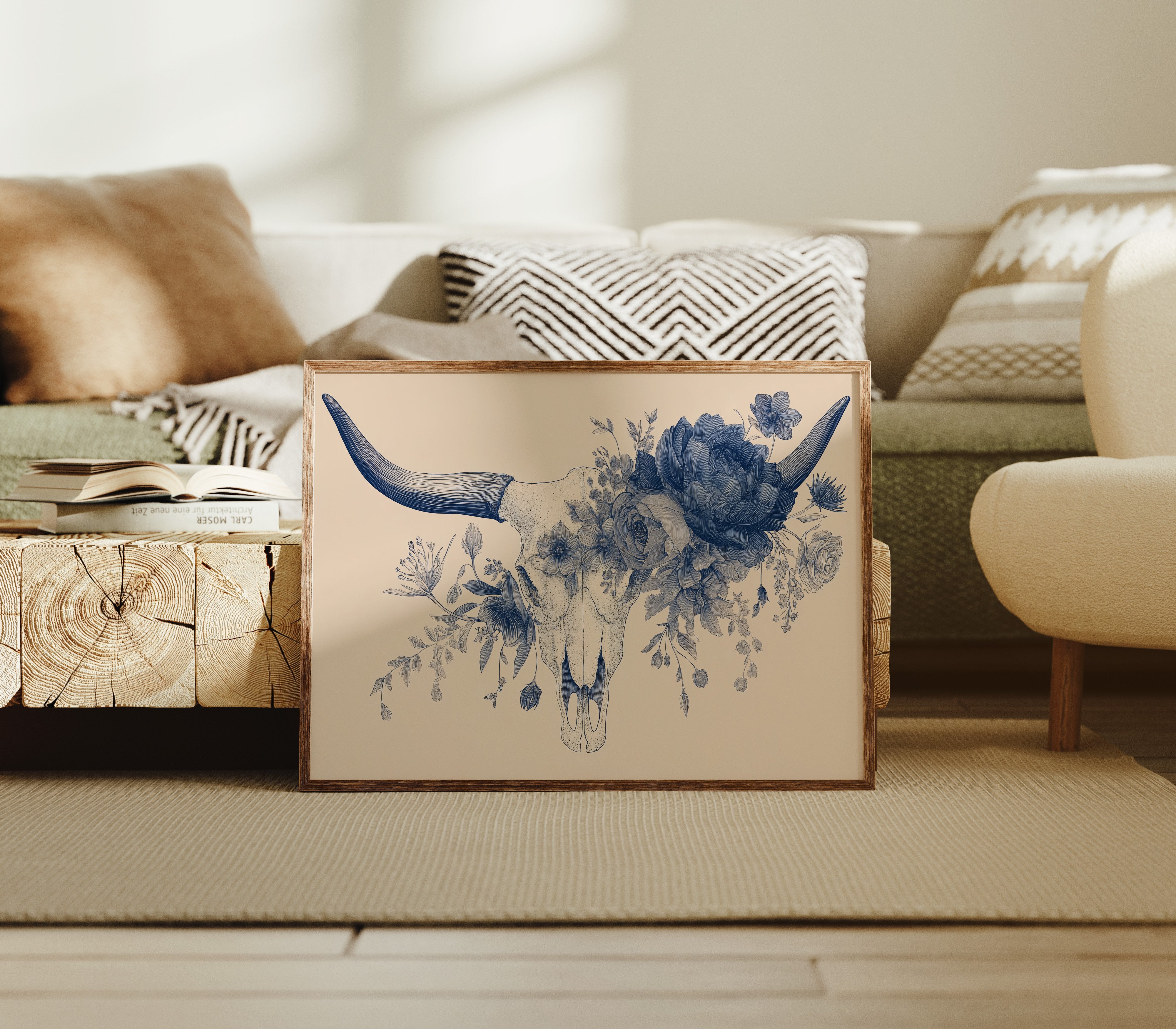 Delicate blue petals intertwine with stark mortality, creating a haunting dance between life and death. The monochromatic illustration transforms a cattle skull into a vessel of rebirth, where lush florals emerge from hollow bone in intricate detail against warm beige. This contemporary memento mori speaks to the cyclical nature of existence, rendered with both scientific precision and poetic sensibility.