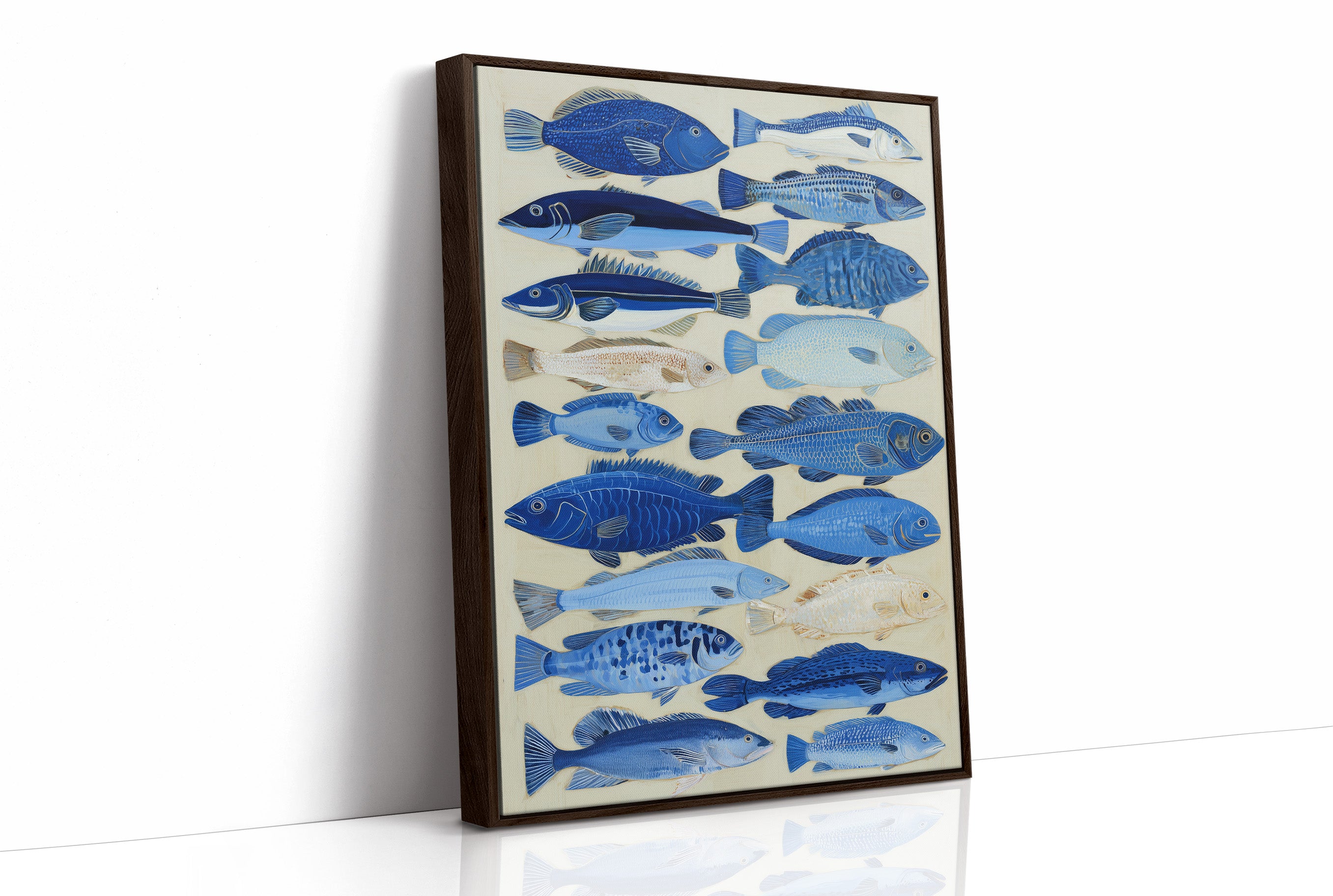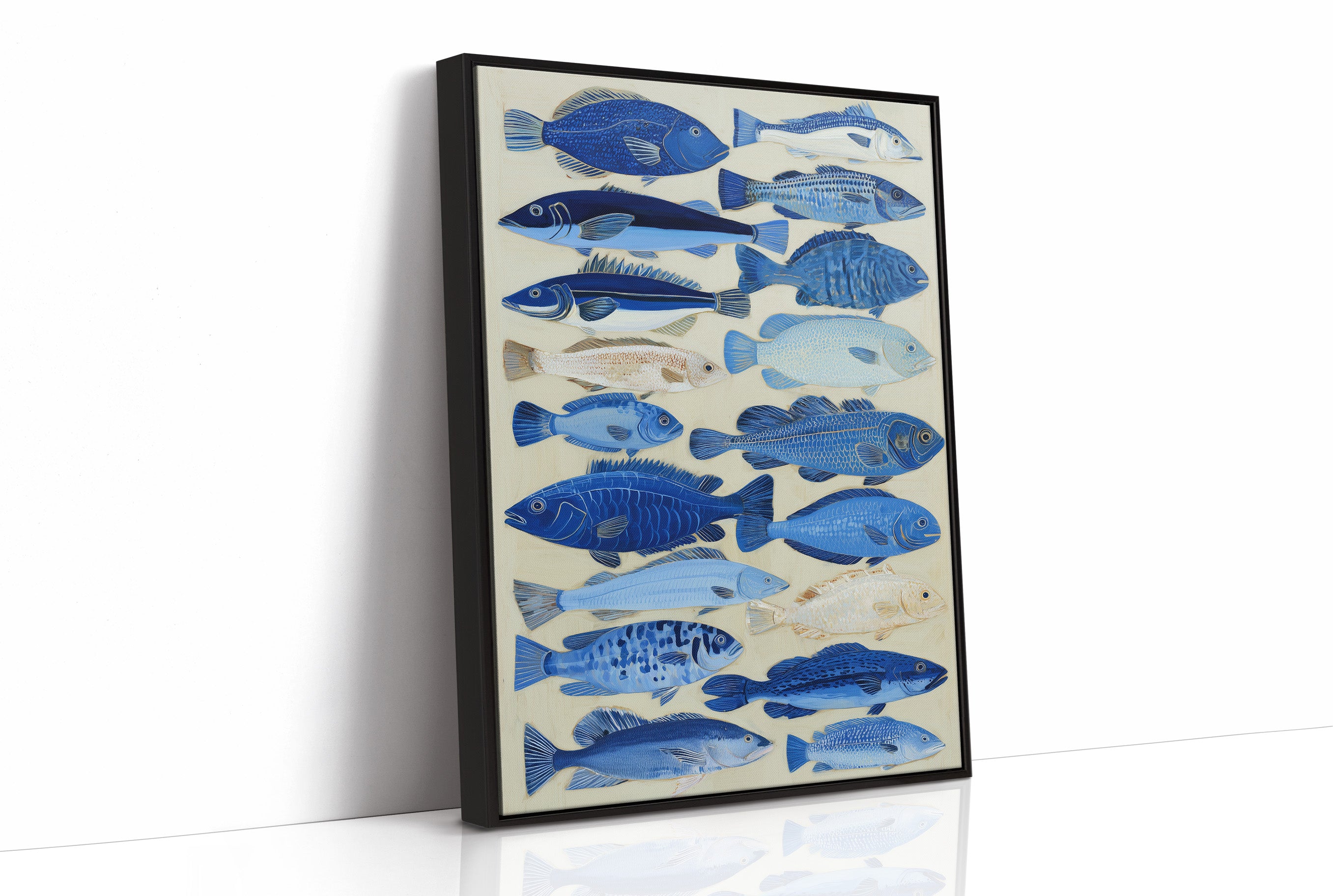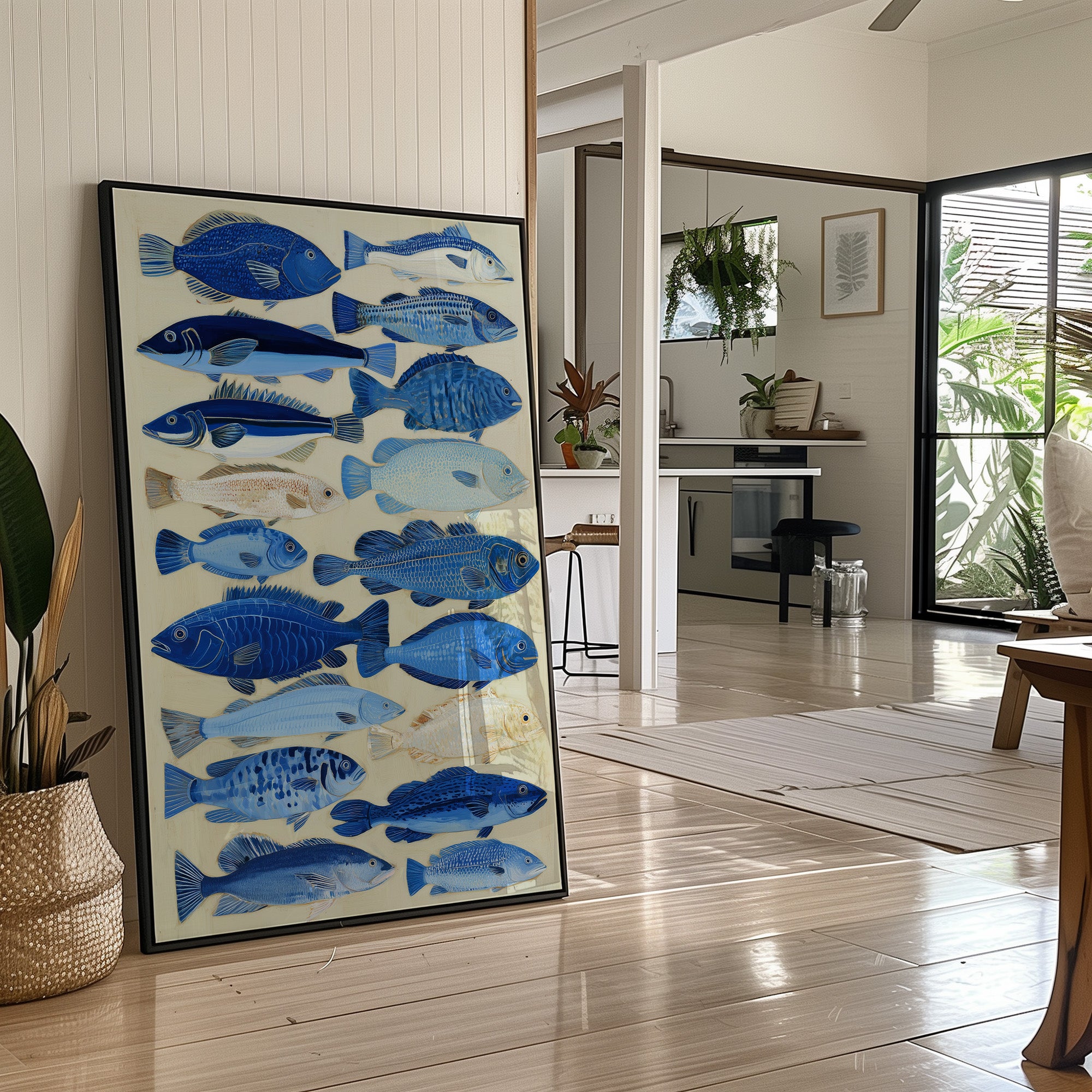 A striking modern artwork featuring an arrangement of various blue fish specimens against a soft cream background. The composition showcases approximately eighteen fish in different shades of blue from deep navy to pale aquamarine rendered in a detailed illustrative style reminiscent of scientific documentation. The systematic arrangement creates a rhythmic pattern that transforms these marine creatures into an elegant contemporary design statement, blending natural history with artistic expression.