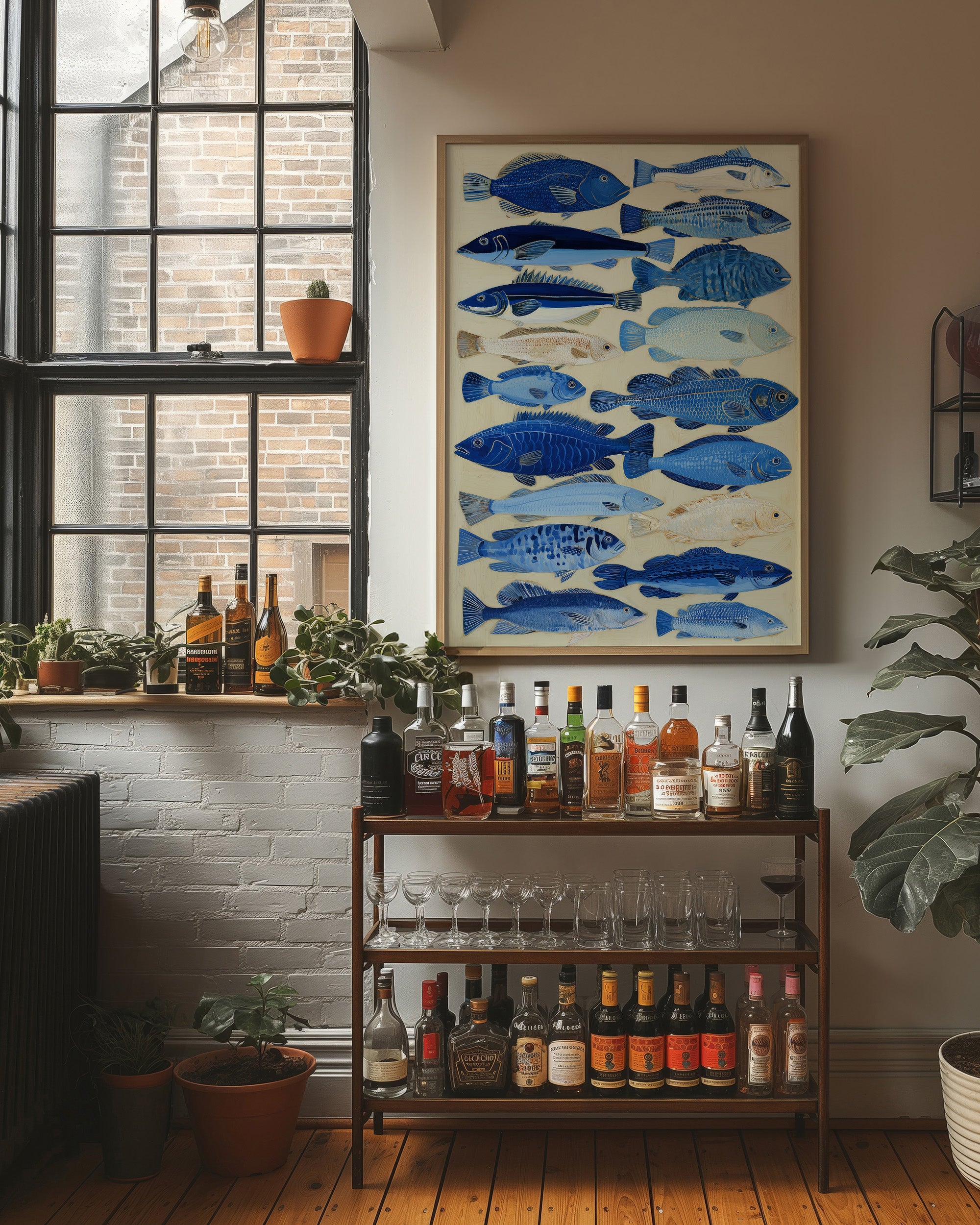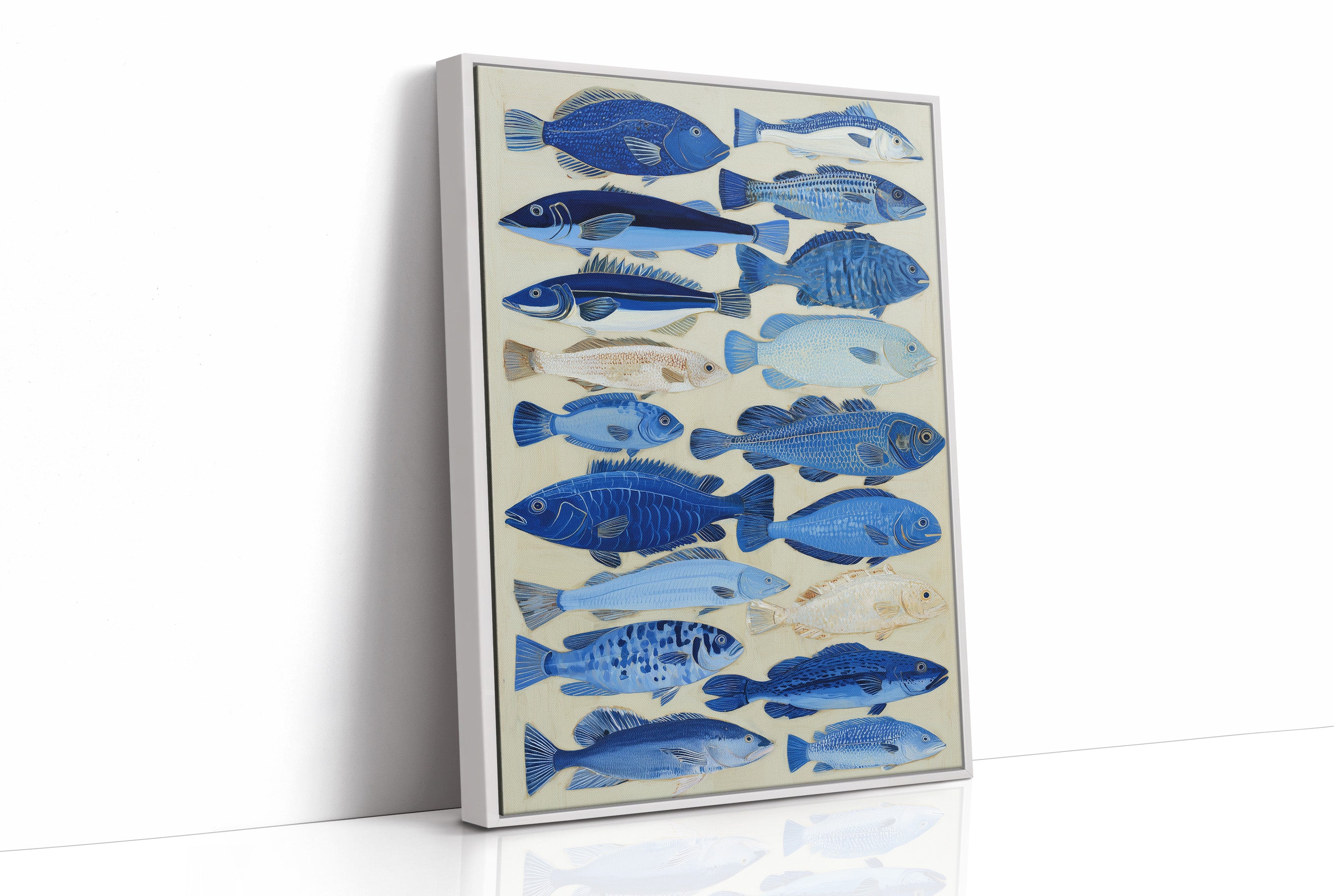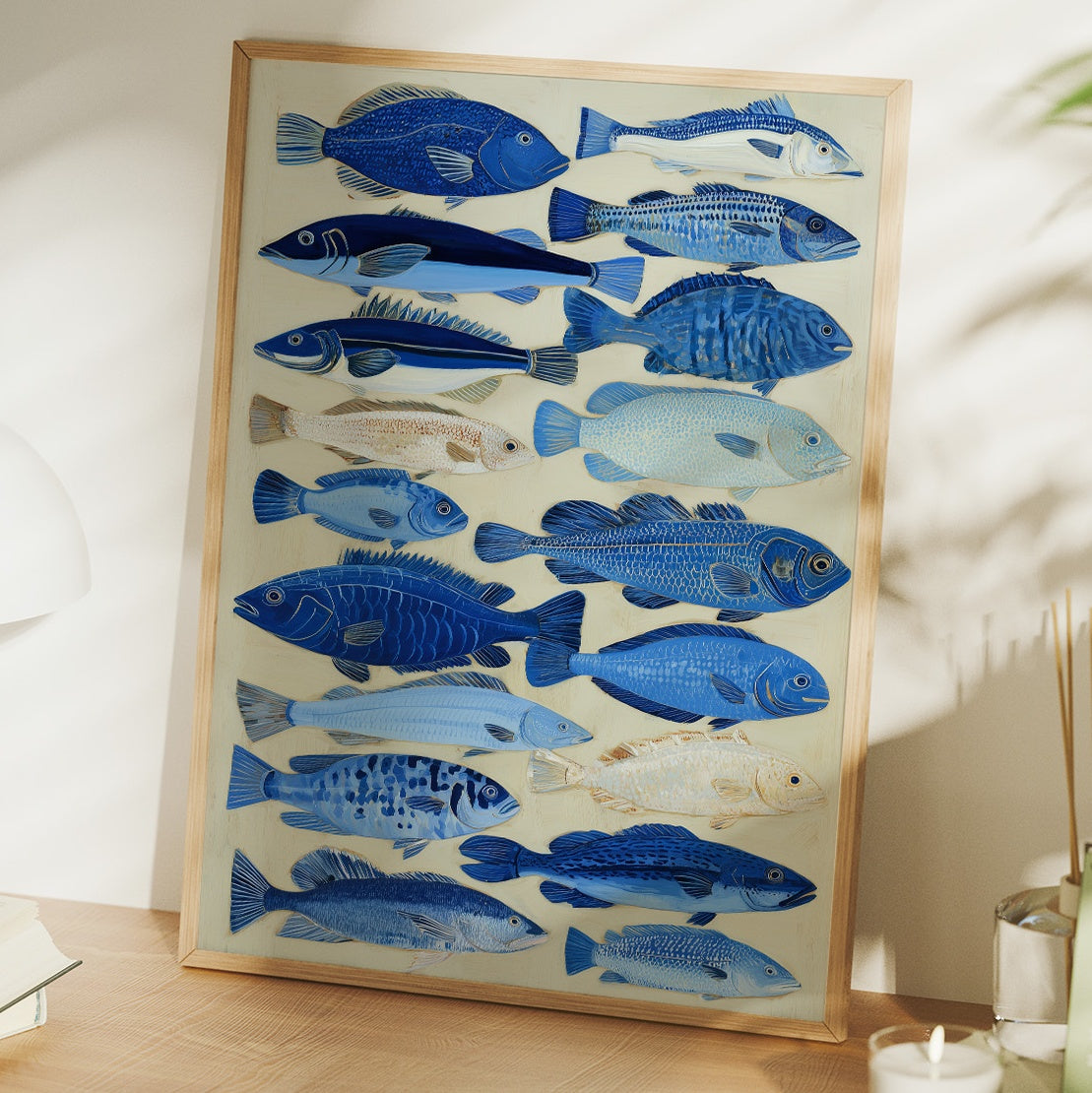 A striking modern artwork featuring an arrangement of various blue fish specimens against a soft cream background. The composition showcases approximately eighteen fish in different shades of blue from deep navy to pale aquamarine rendered in a detailed illustrative style reminiscent of scientific documentation. The systematic arrangement creates a rhythmic pattern that transforms these marine creatures into an elegant contemporary design statement, blending natural history with artistic expression.