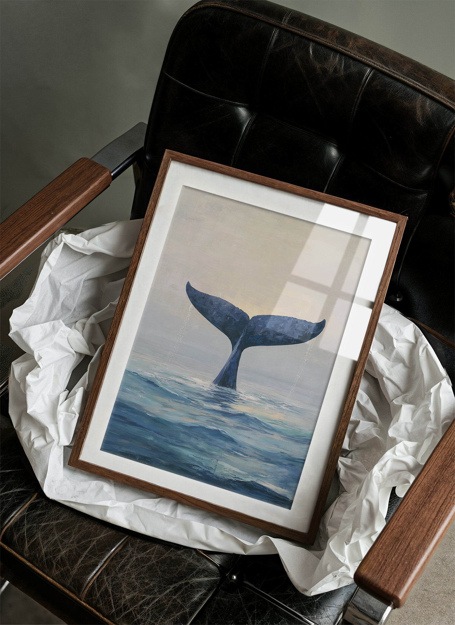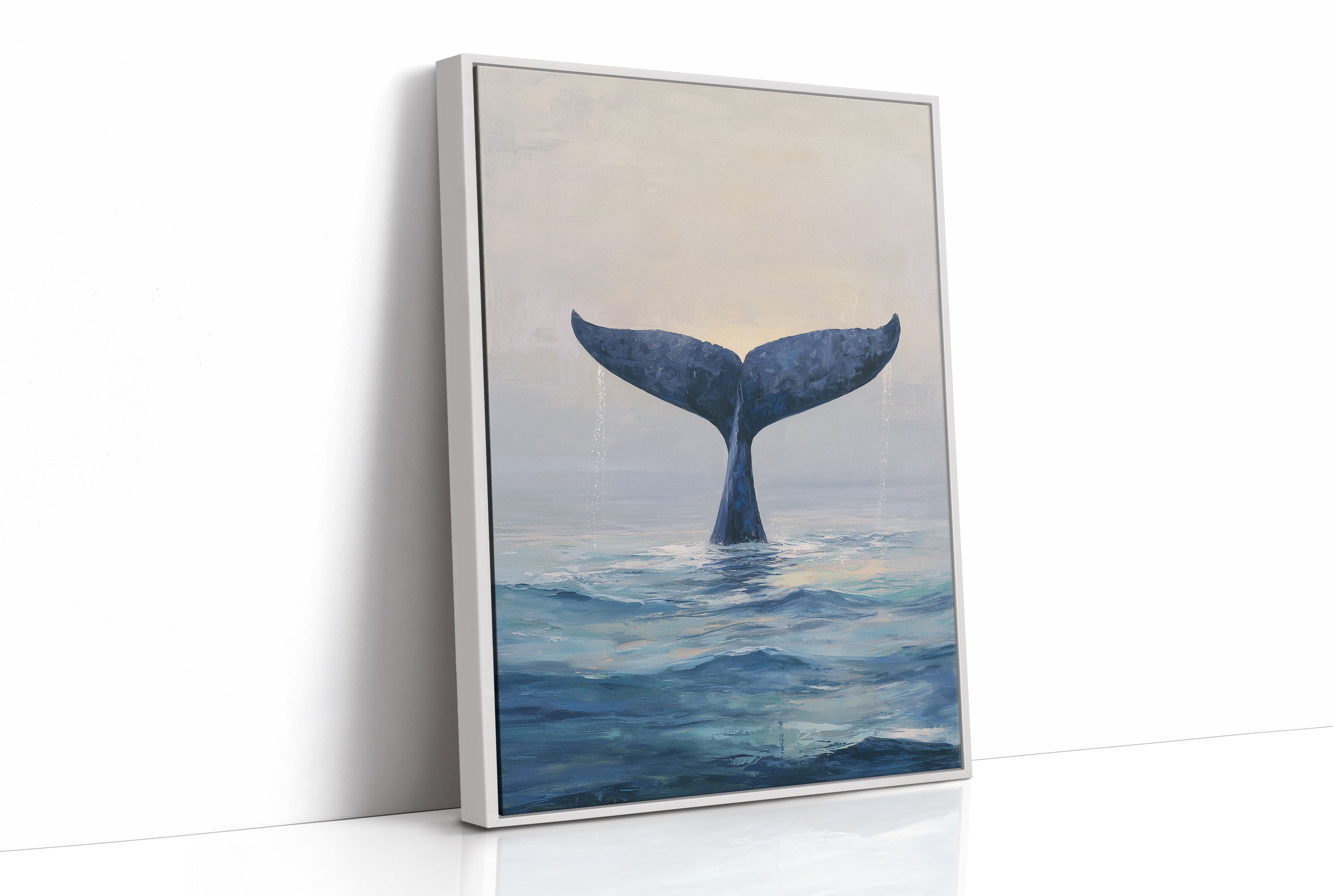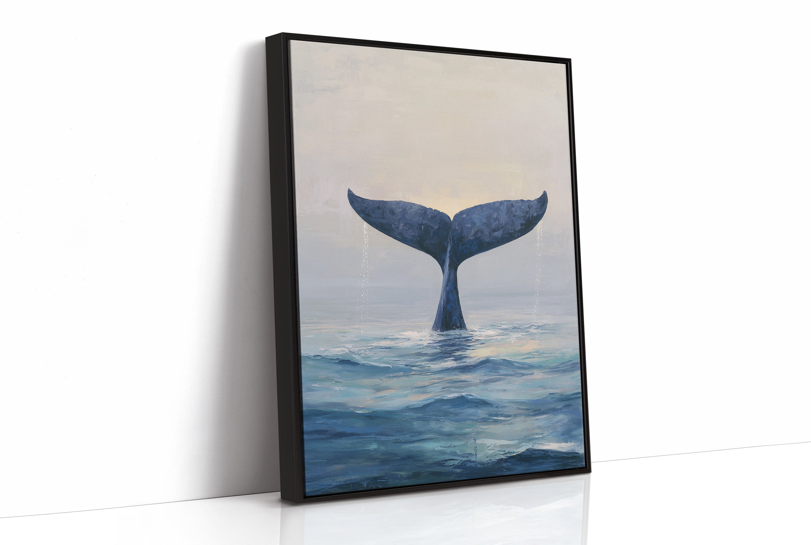 A minimalist painting of a whale's tail emerging from serene ocean waters, captured in a moment of descent. The deep indigo fluke contrasts against a misty gray sky, creating an atmospheric study of marine majesty.