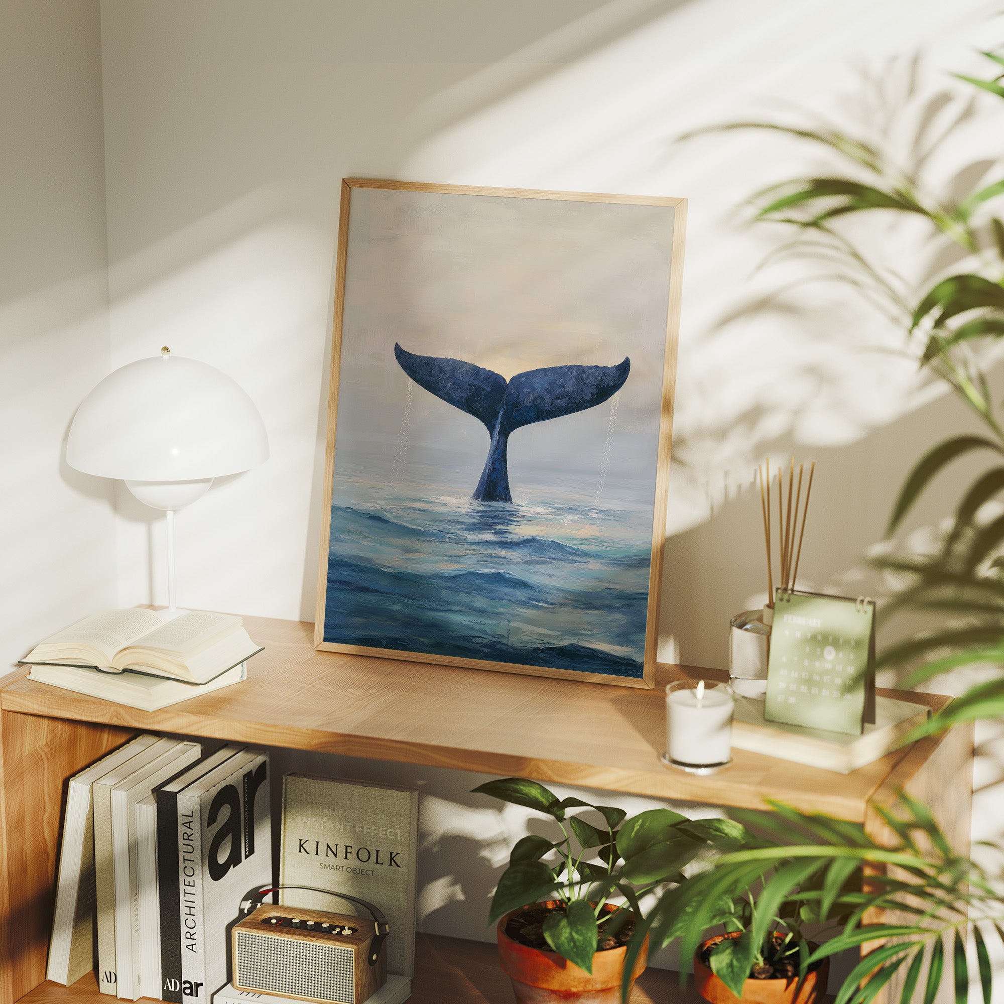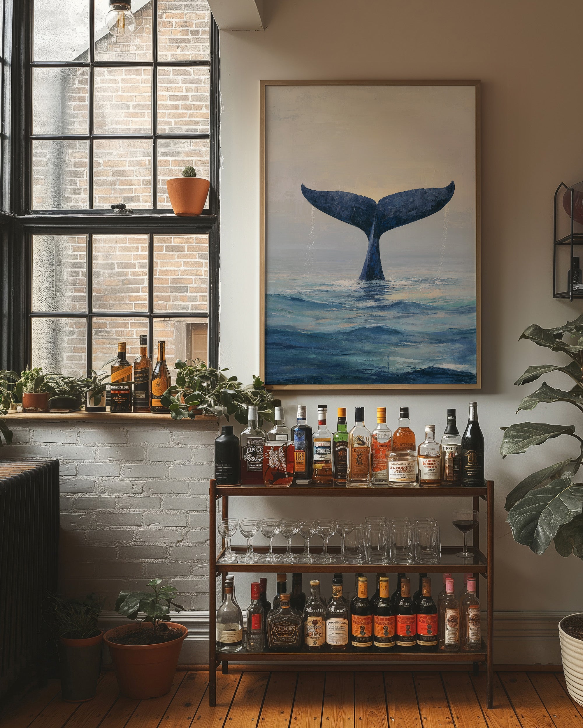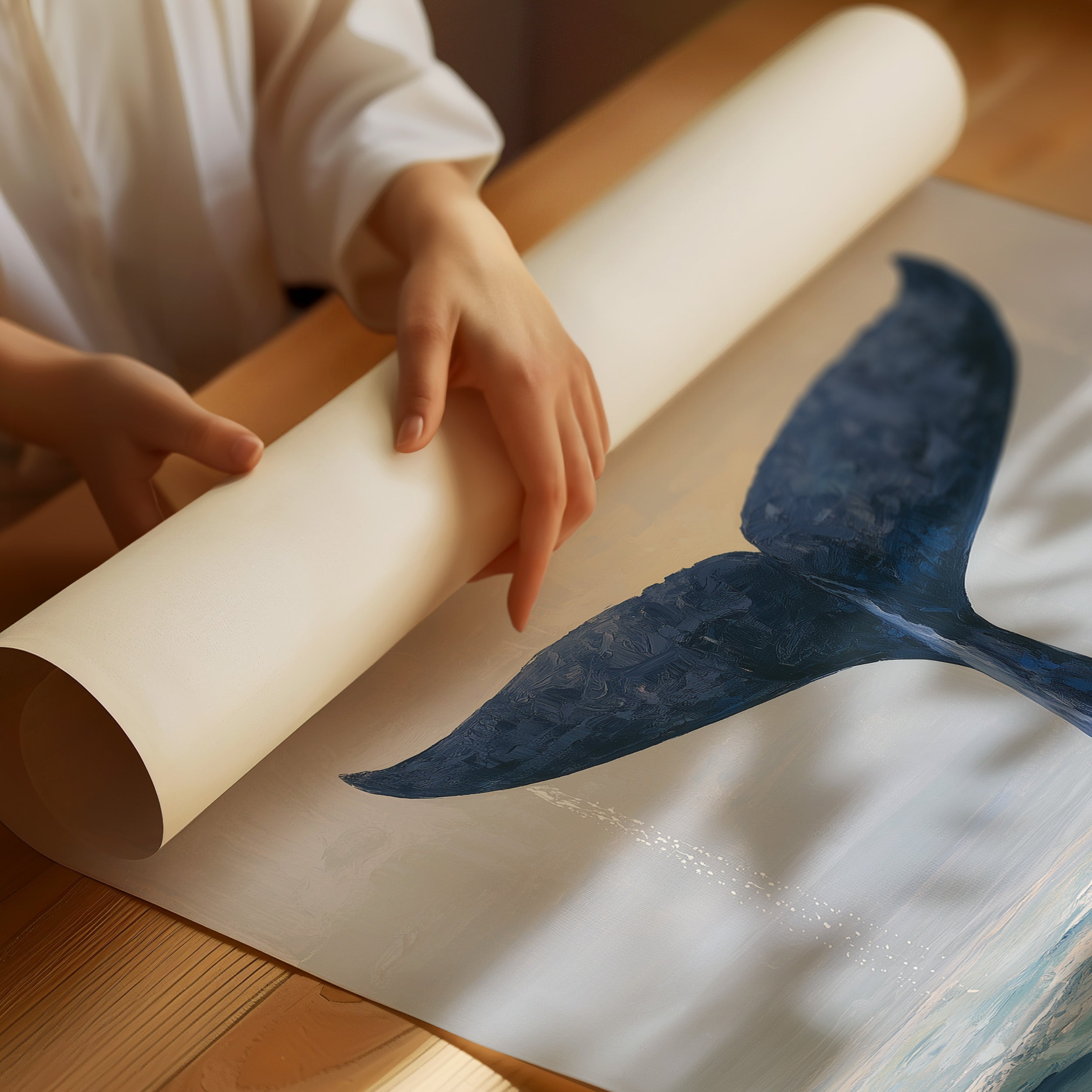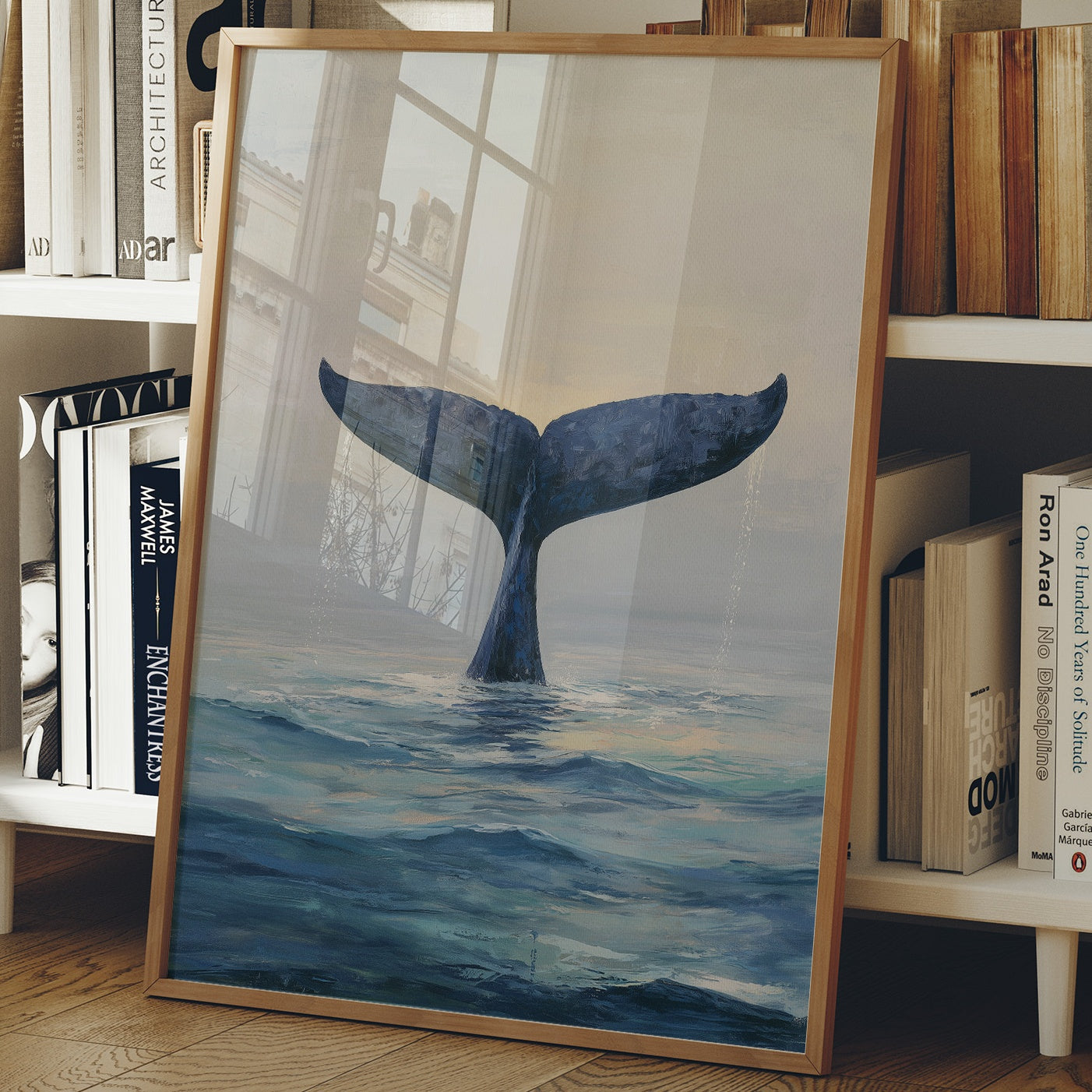 A minimalist painting of a whale's tail emerging from serene ocean waters, captured in a moment of descent. The deep indigo fluke contrasts against a misty gray sky, creating an atmospheric study of marine majesty.