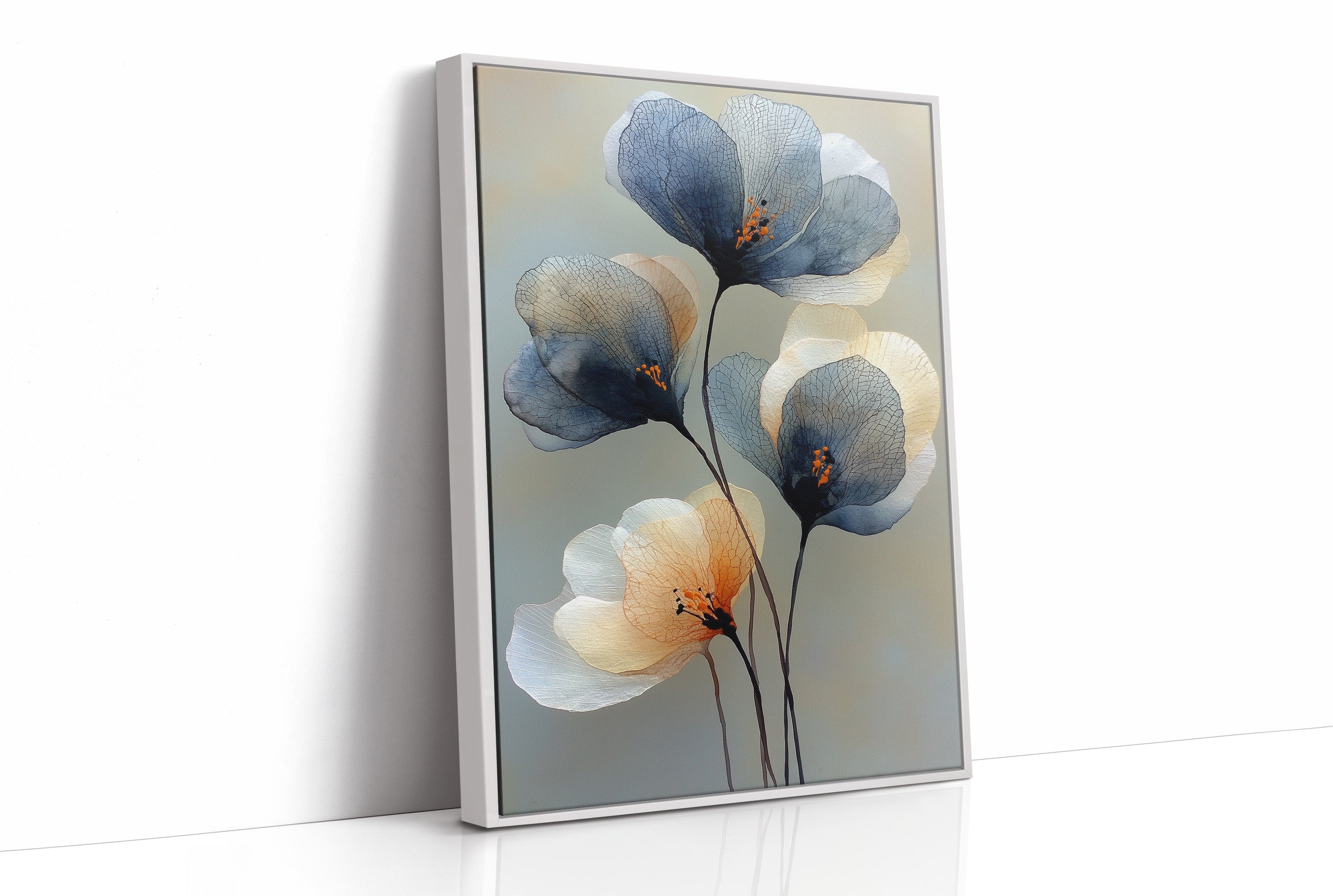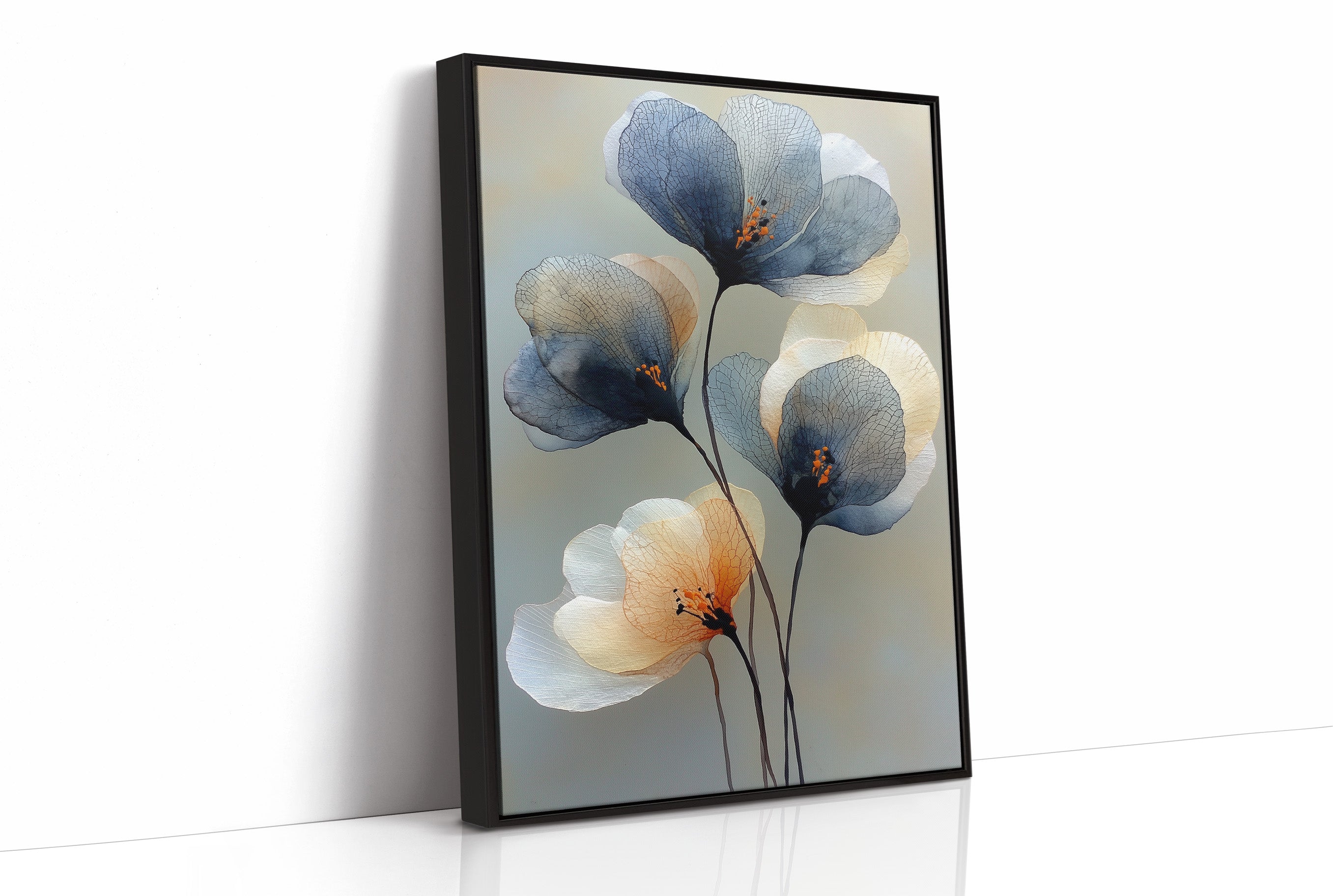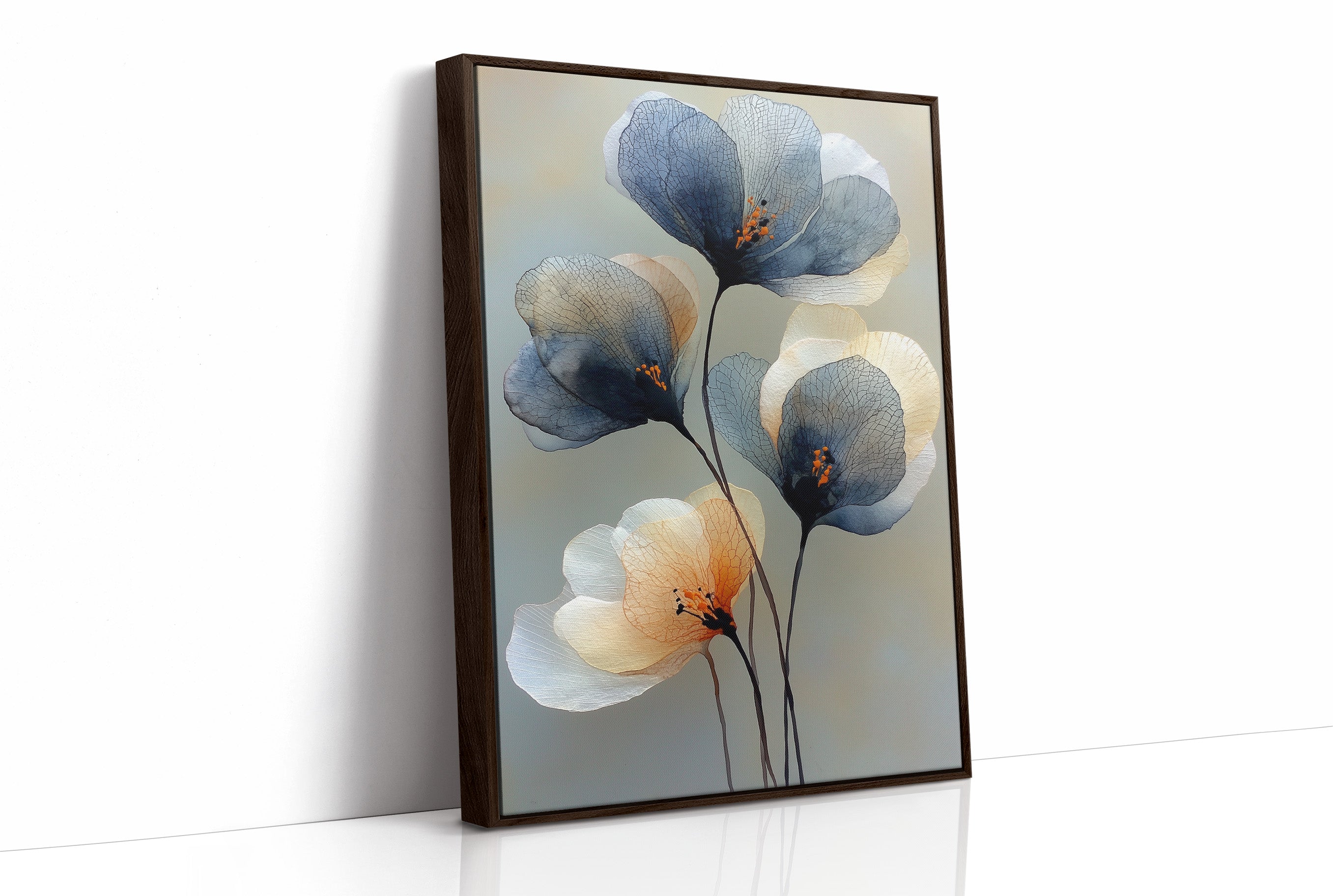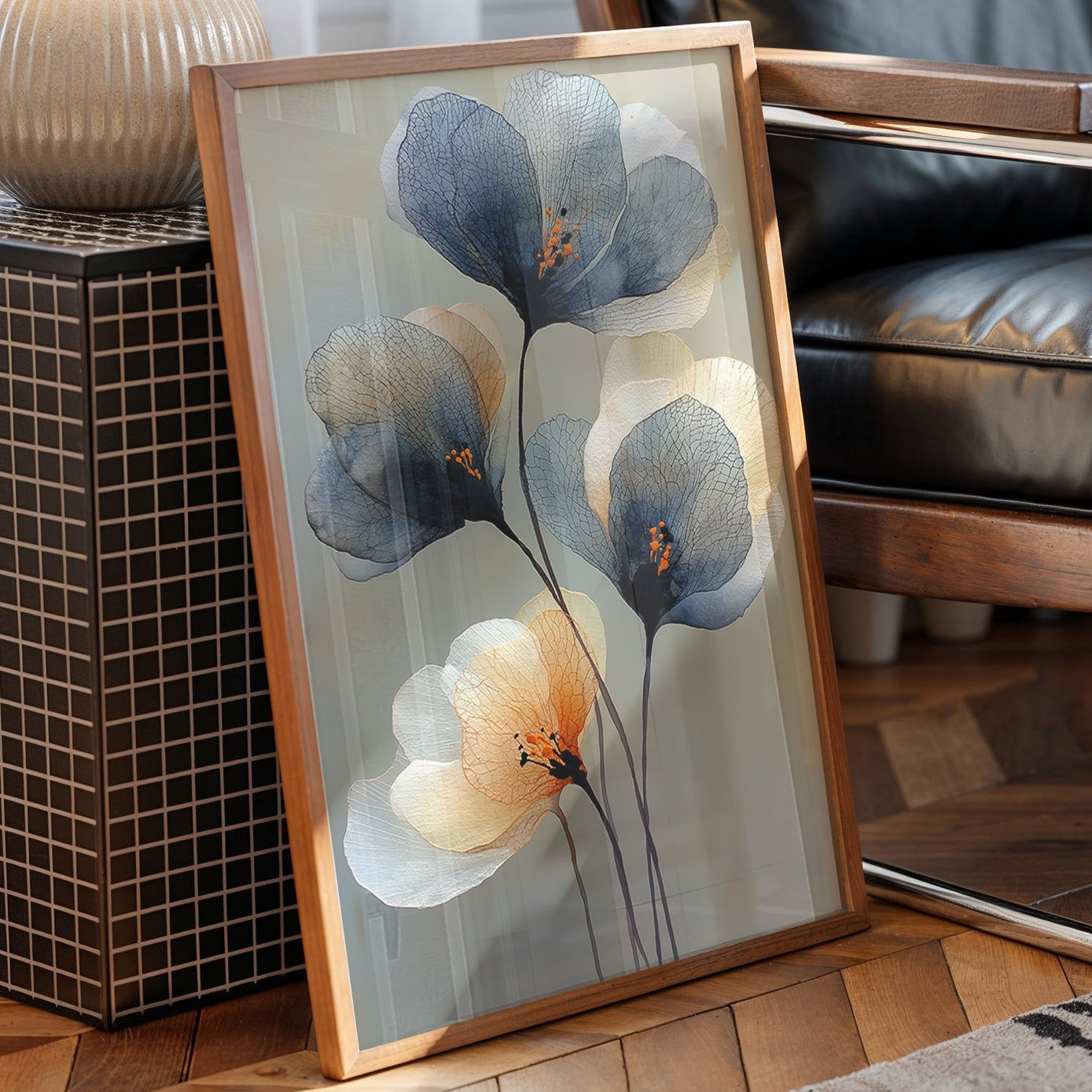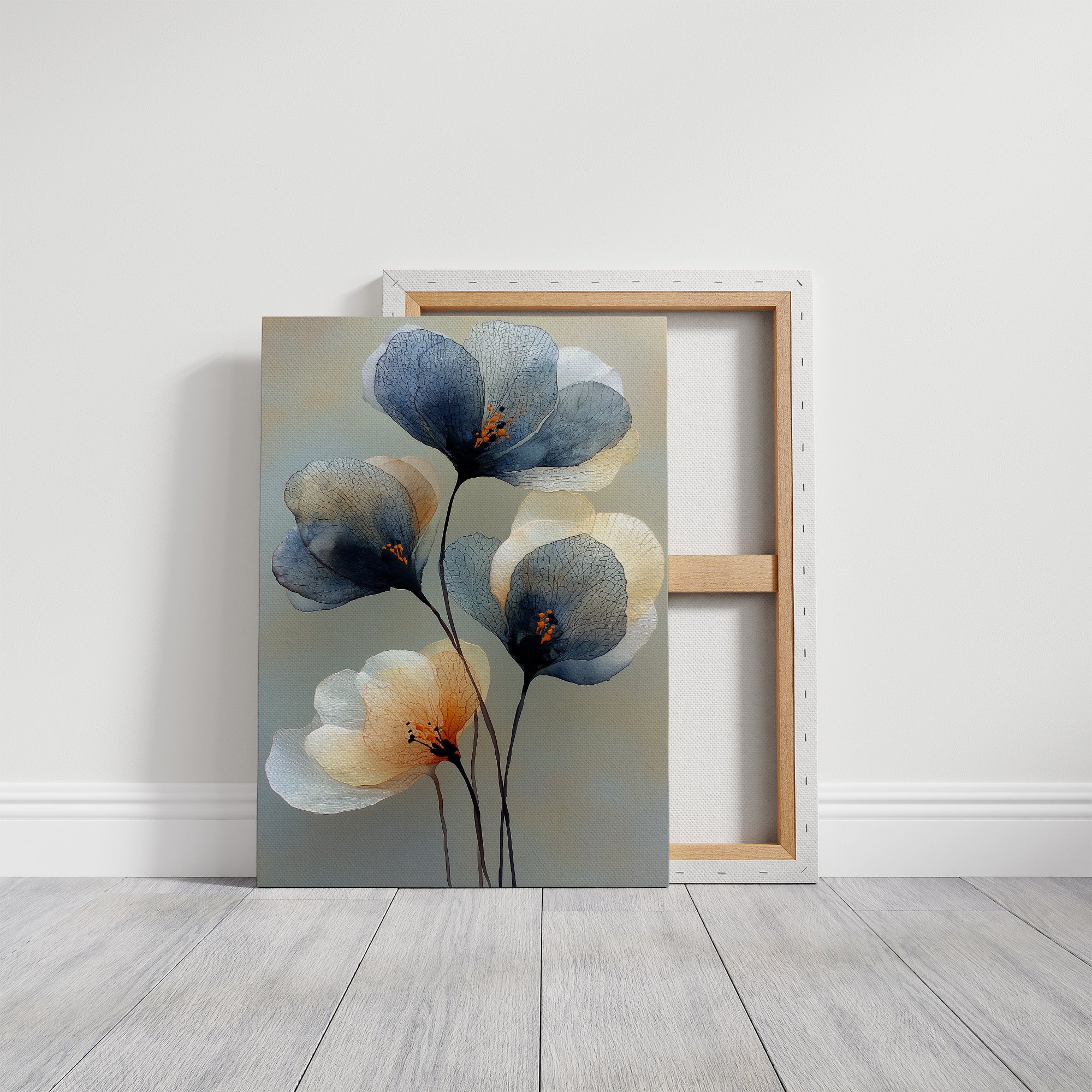 Delicate watercolor blooms float against a misty sage backdrop, their translucent petals capturing the ethereal quality of early morning light. Deep indigo and soft peach flowers intertwine in an elegant dance, their tissue-paper thin layers revealing nature's intricate veining patterns and subtle color transitions. This contemporary botanical piece brings sophisticated serenity to any space, making it an ideal focal point for a modern living room or master bedroom where quiet contemplation meets artistic expression.