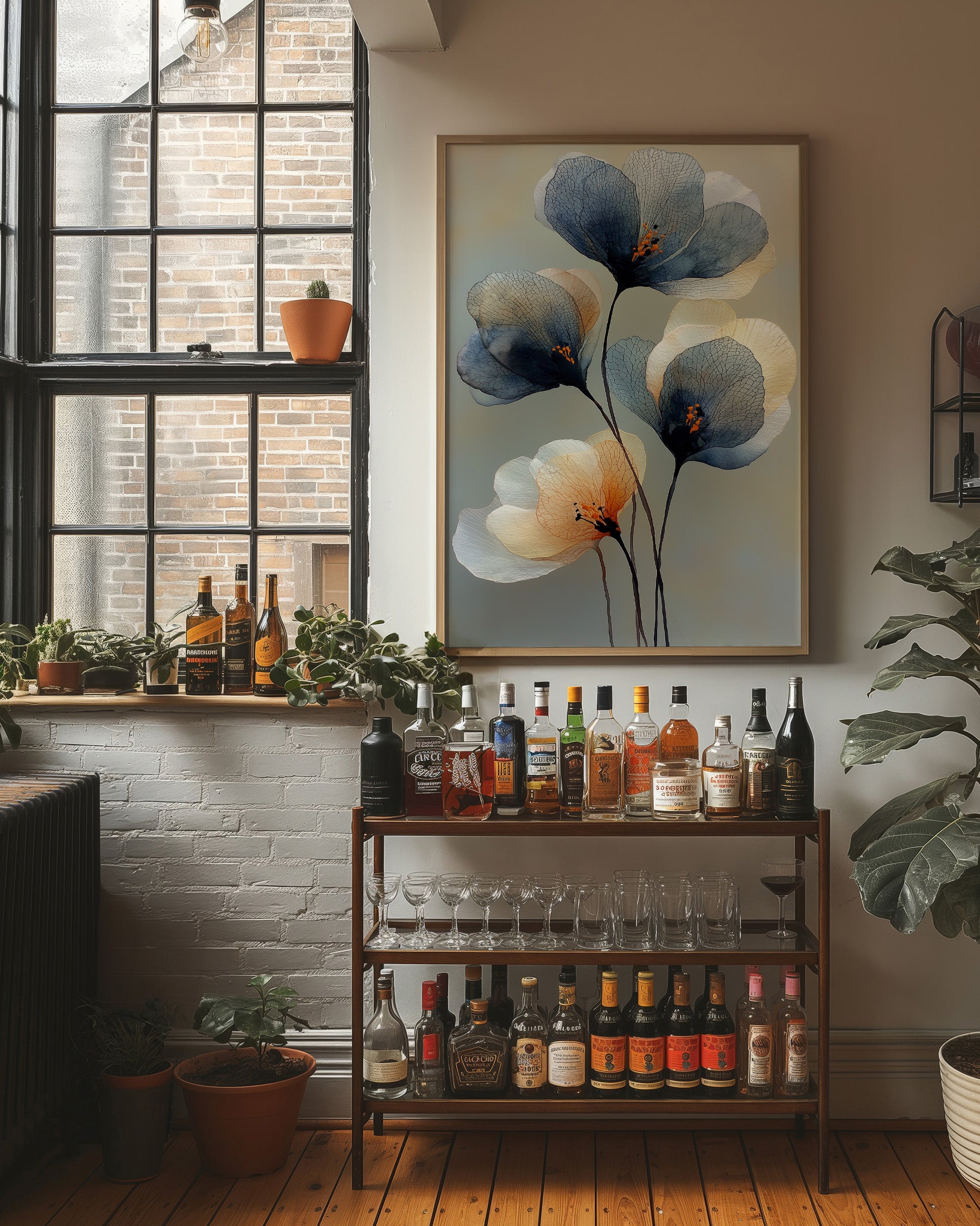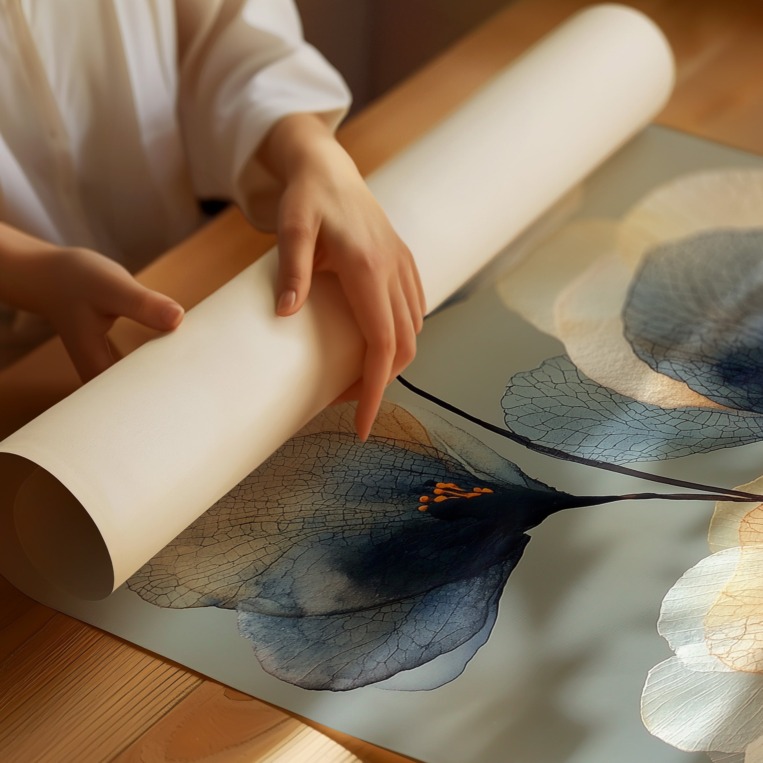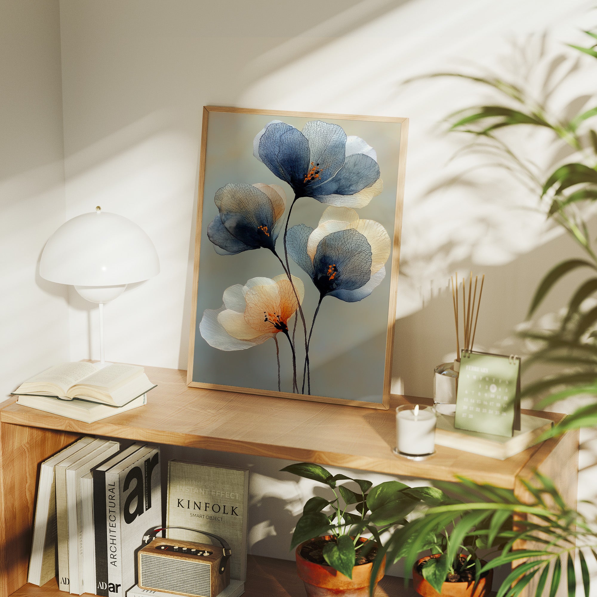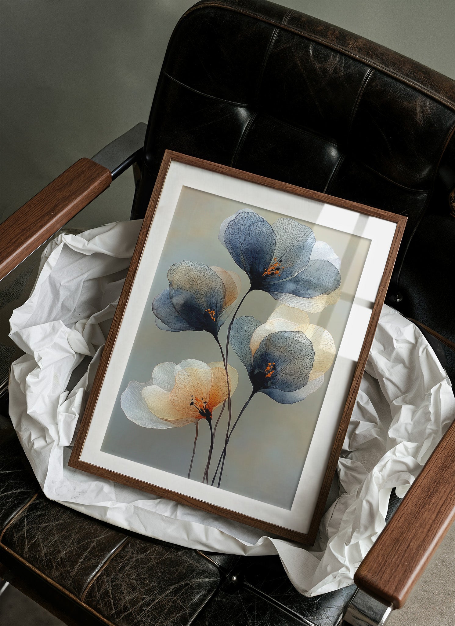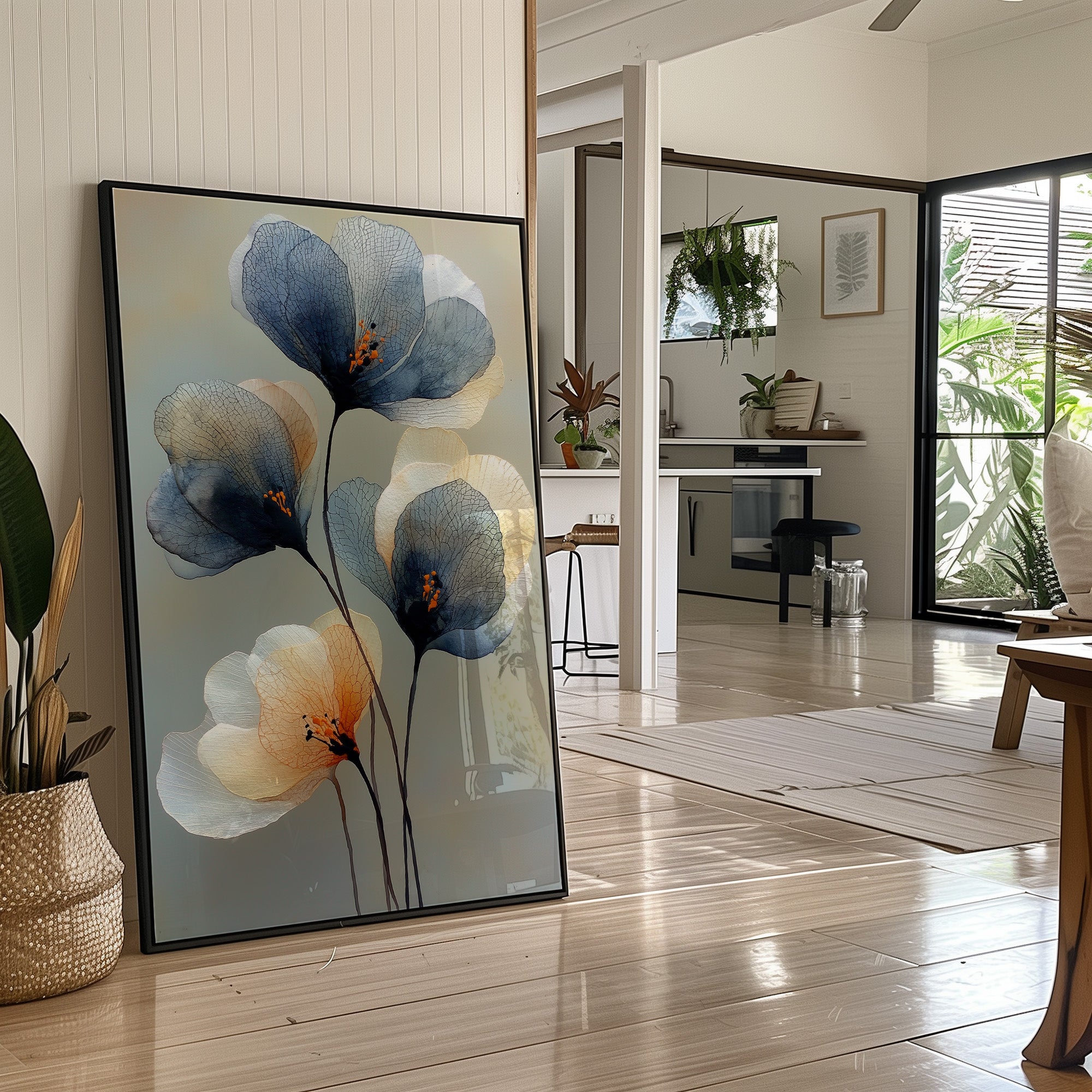 Delicate watercolor blooms float against a misty sage backdrop, their translucent petals capturing the ethereal quality of early morning light. Deep indigo and soft peach flowers intertwine in an elegant dance, their tissue-paper thin layers revealing nature's intricate veining patterns and subtle color transitions. This contemporary botanical piece brings sophisticated serenity to any space, making it an ideal focal point for a modern living room or master bedroom where quiet contemplation meets artistic expression.