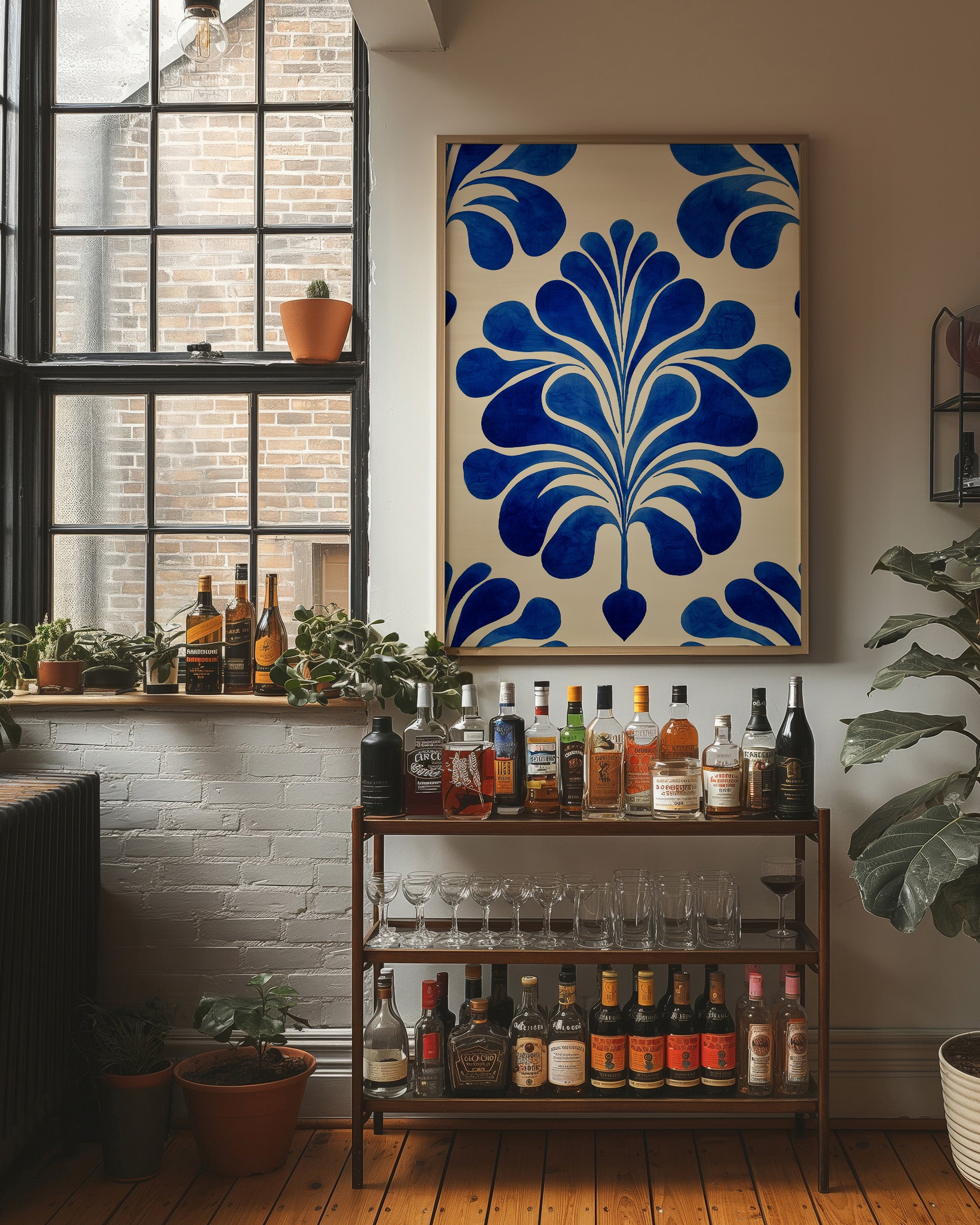 A bold botanical pattern emerges like a midnight bloom, its cobalt petals unfurling against a warm cream backdrop. The modern design captures the fluid movement of nature, with teardrop shapes flowing outward in a mesmerizing display of symmetry and grace. Framed in rich walnut wood and nestled among crisp white paper, this piece brings together organic forms with contemporary geometric precision. This striking composition would transform a modern dining room or add sophisticated charm to a minimalist home office space.