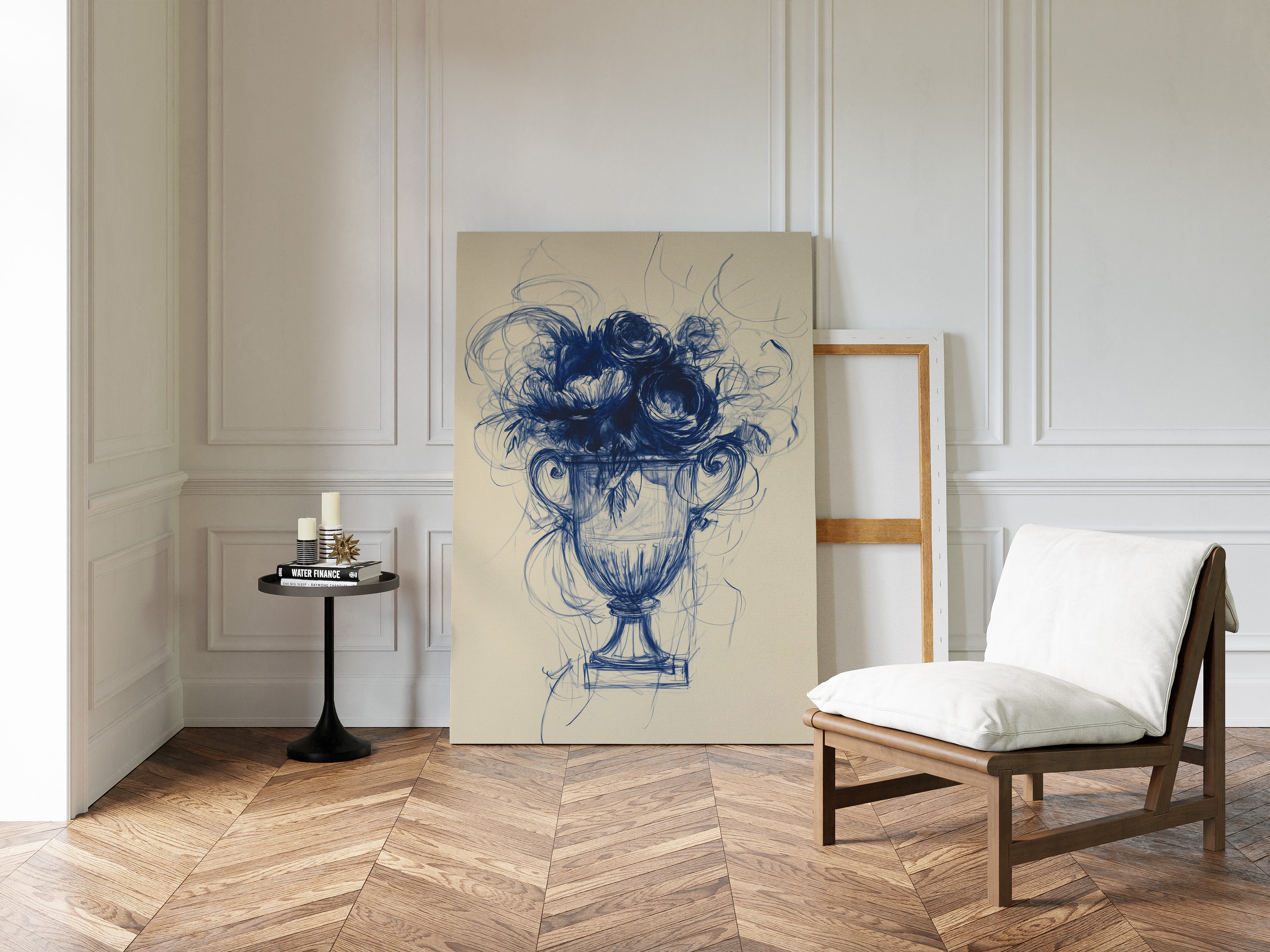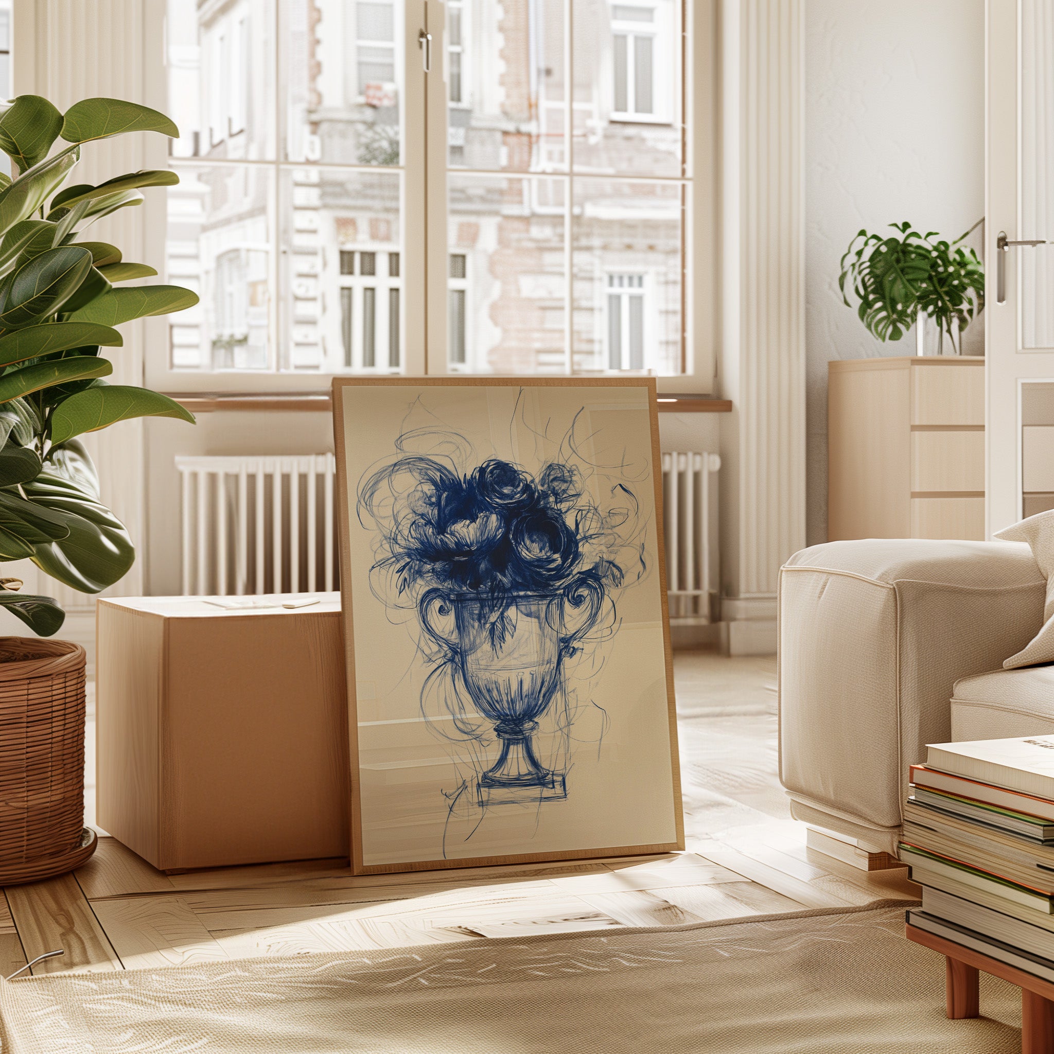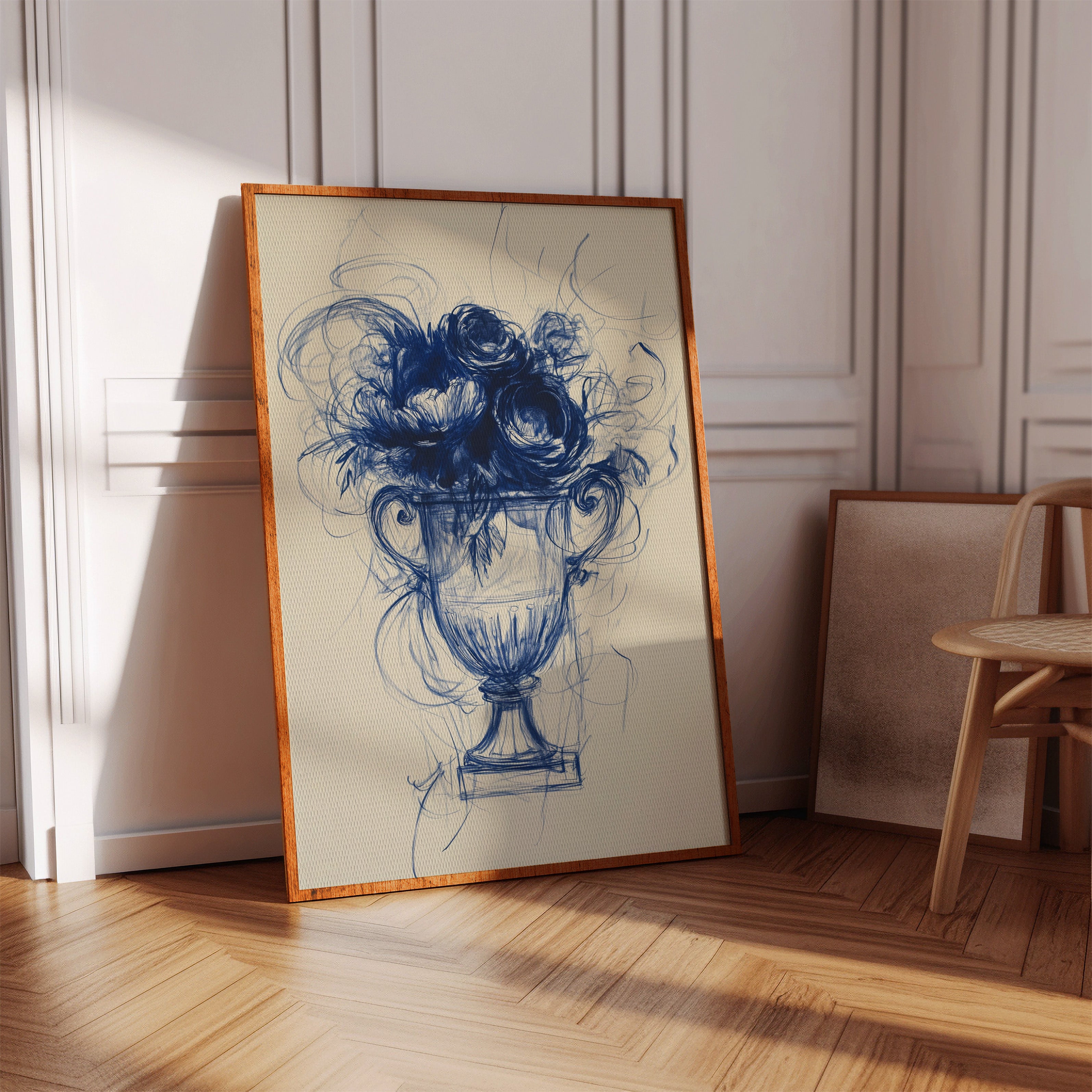 Like a memory captured in flowing blue ink, delicate brushstrokes swirl and dance across cream-colored paper. Deep indigo blooms burst from an elegant crystal urn, their petals unfurling in a graceful chaos of lines and movement. The classical vessel stands proud yet ethereal, its fluted details and curved handles rendered in varying shades of blue that fade and intensify like ripples in water. This piece marries the timeless beauty of traditional still life with contemporary gestural expression.