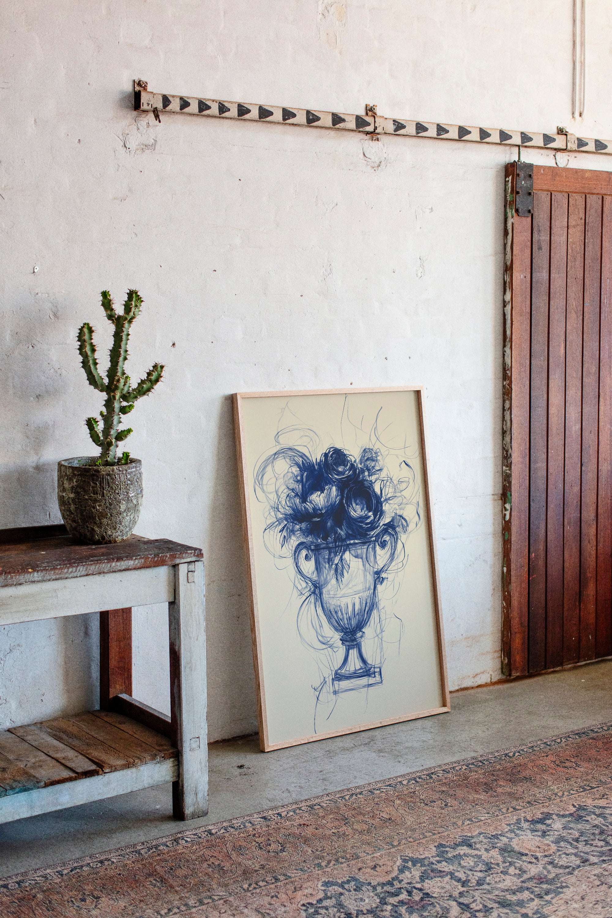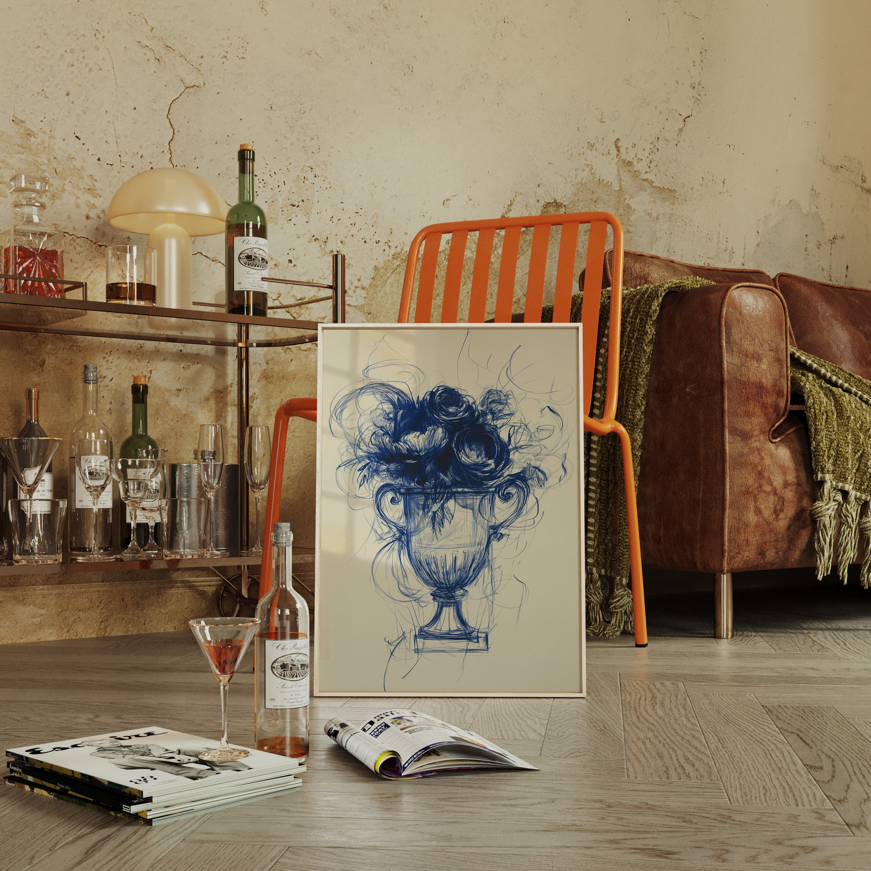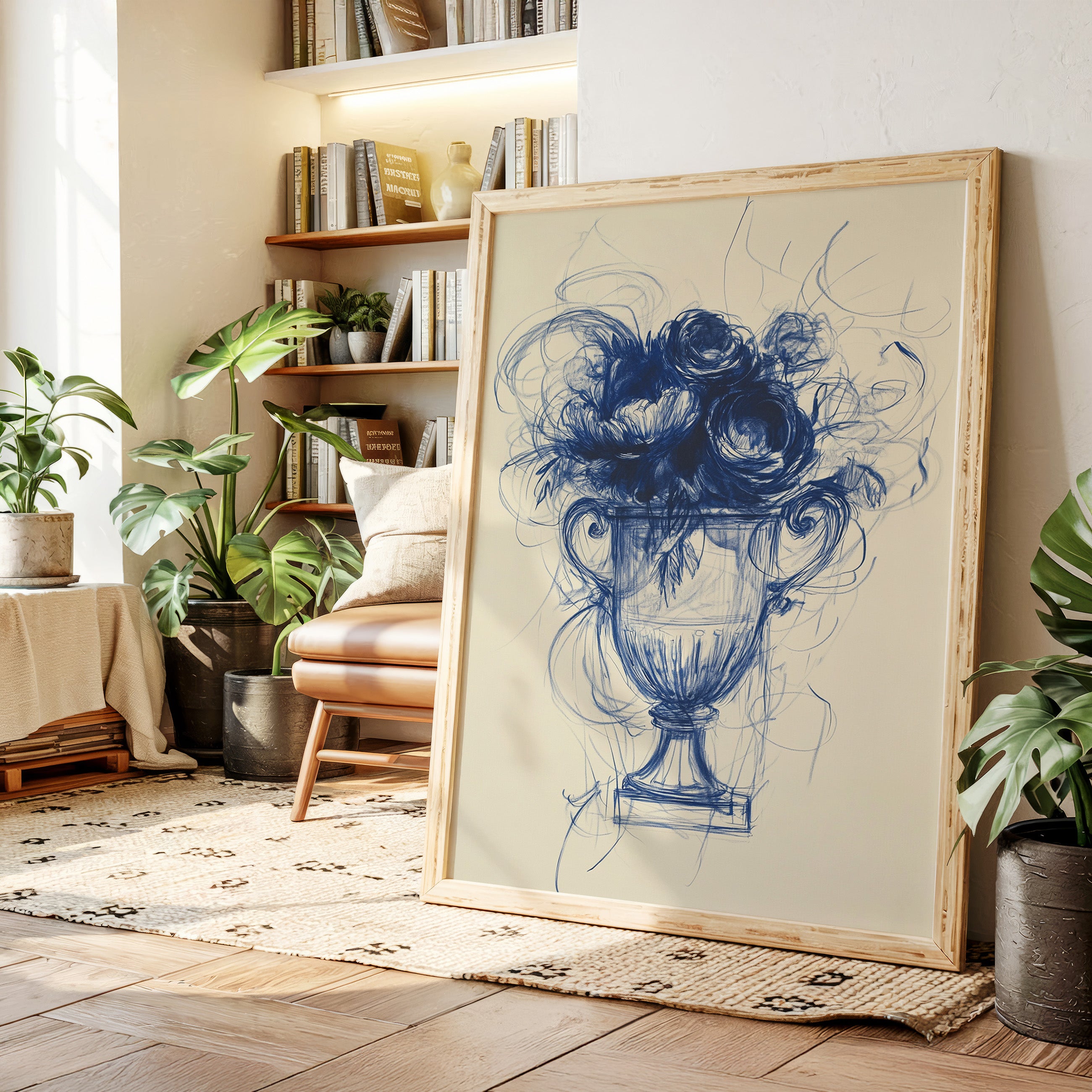 Like a memory captured in flowing blue ink, delicate brushstrokes swirl and dance across cream-colored paper. Deep indigo blooms burst from an elegant crystal urn, their petals unfurling in a graceful chaos of lines and movement. The classical vessel stands proud yet ethereal, its fluted details and curved handles rendered in varying shades of blue that fade and intensify like ripples in water. This piece marries the timeless beauty of traditional still life with contemporary gestural expression.