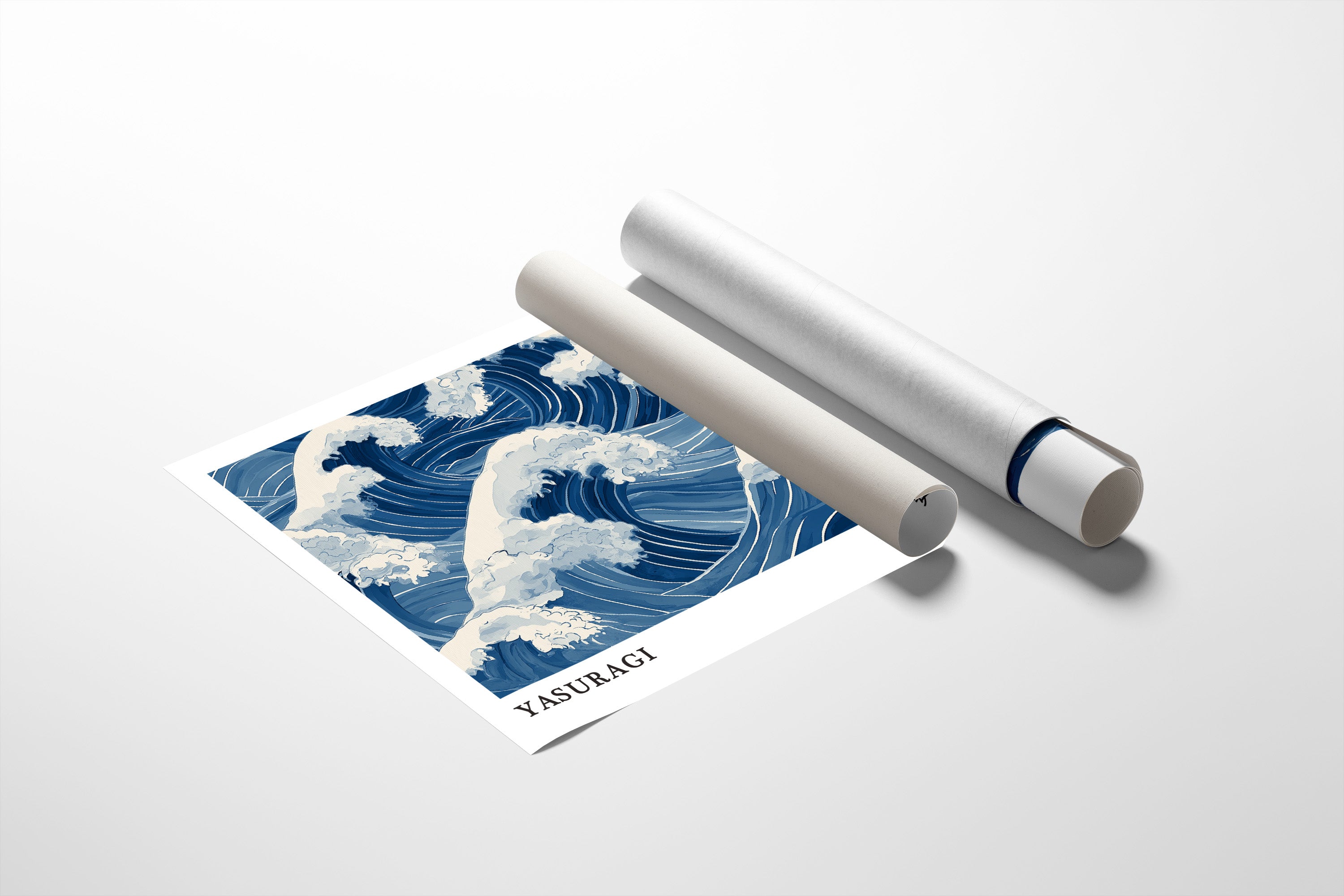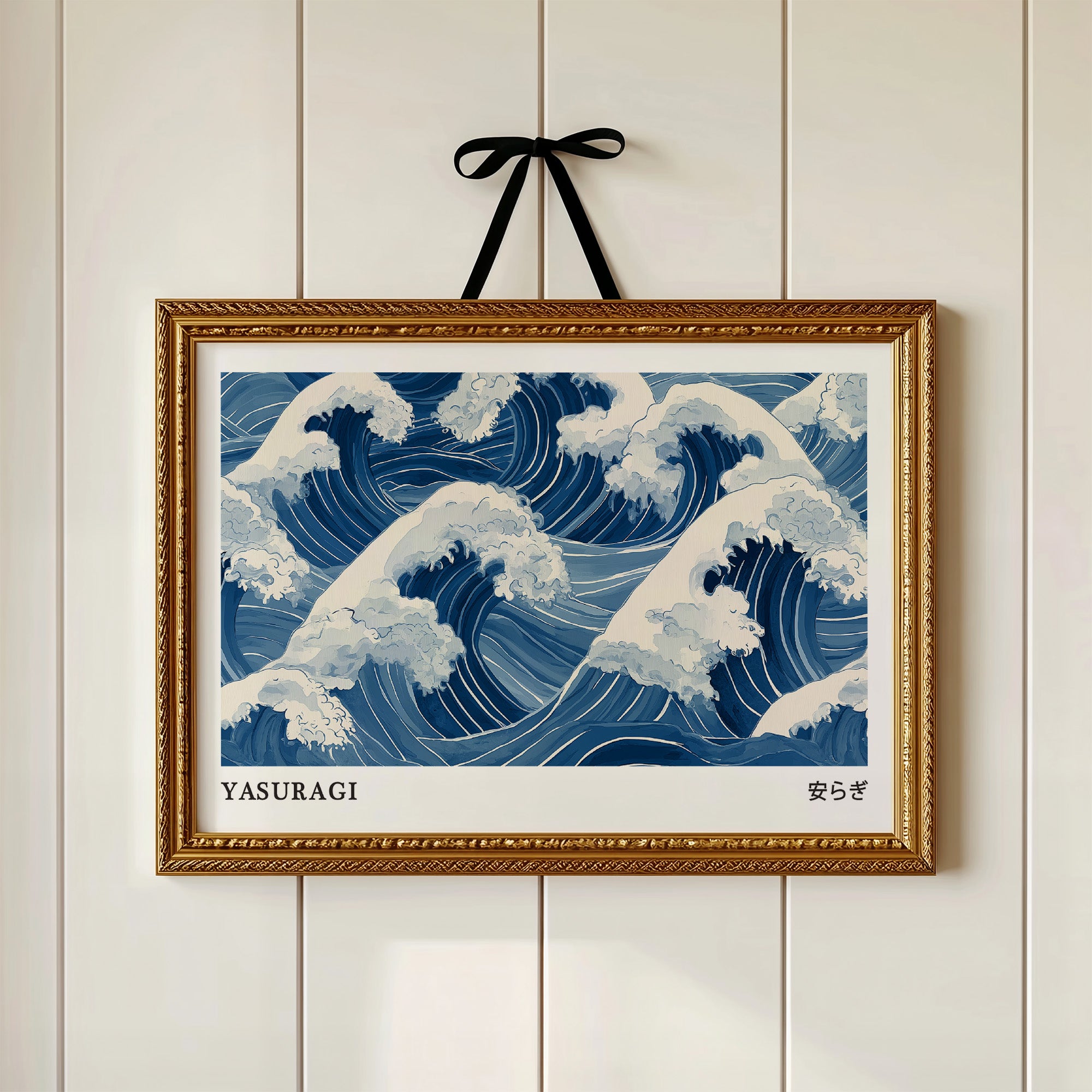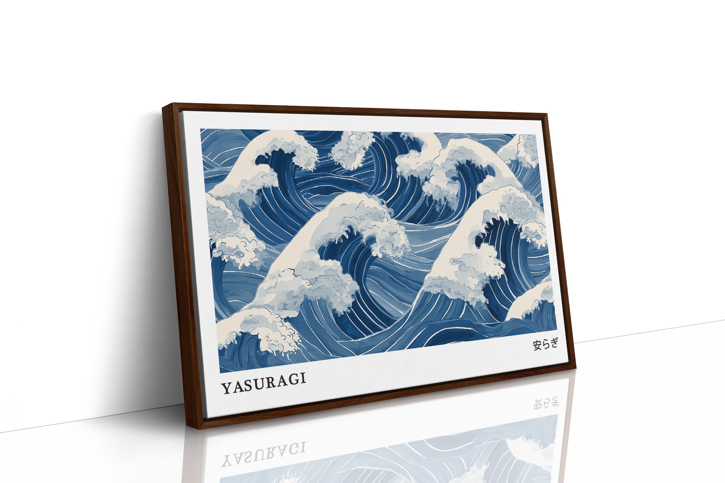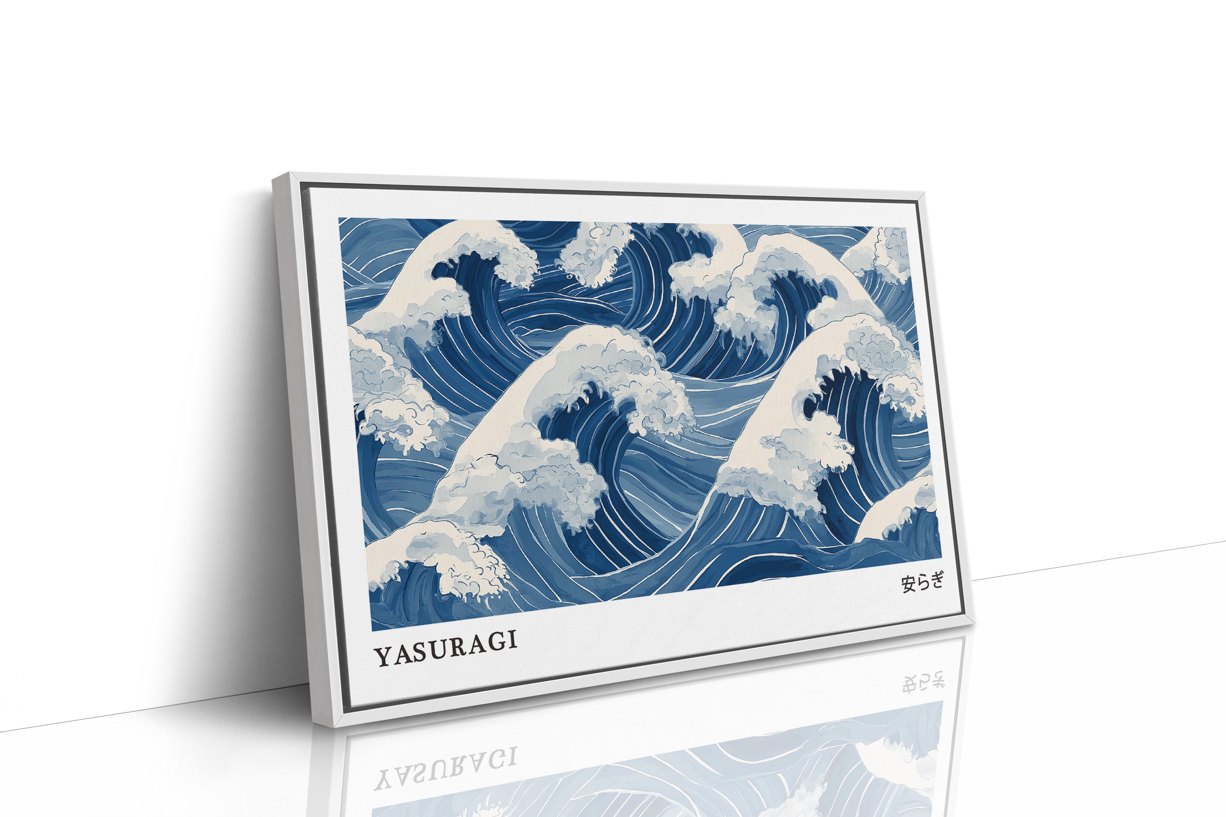 A mesmerizing interpretation of ocean waves rendered in various shades of blue and white, reminiscent of traditional Japanese woodblock prints. The rhythmic pattern captures the dynamic movement of cresting waves with their foam-topped peaks swirling in an eternal dance. The monochromatic blue palette creates a sense of serene power, while the stylized representation honors the artistic traditions of Eastern water depictions. The word "YASURAGI" (meaning tranquility or peace in Japanese) anchors the composition, suggesting the paradoxical calm one might find within nature's powerful forces.