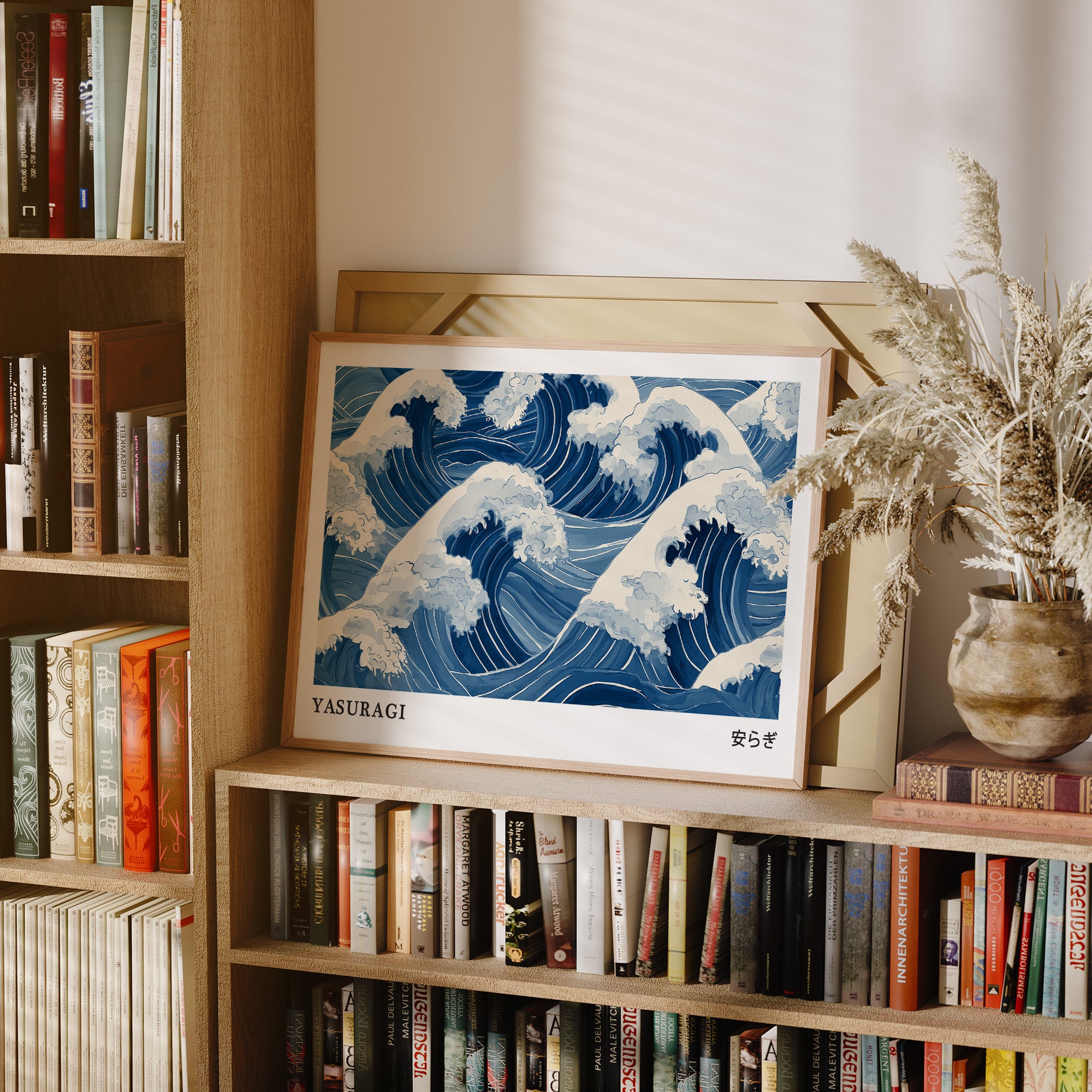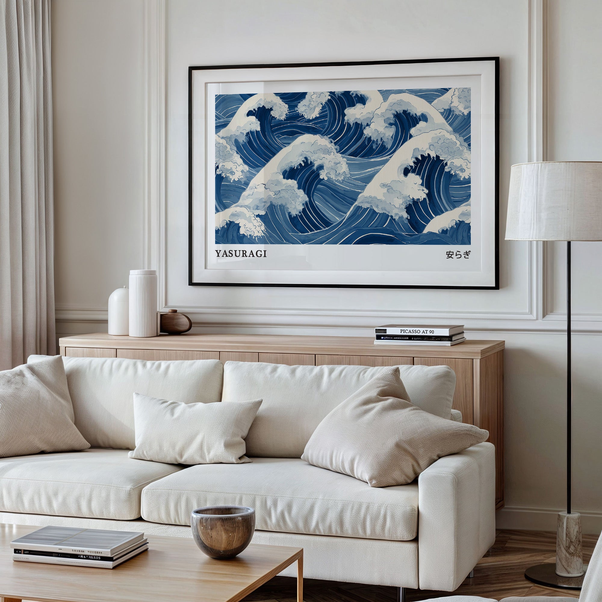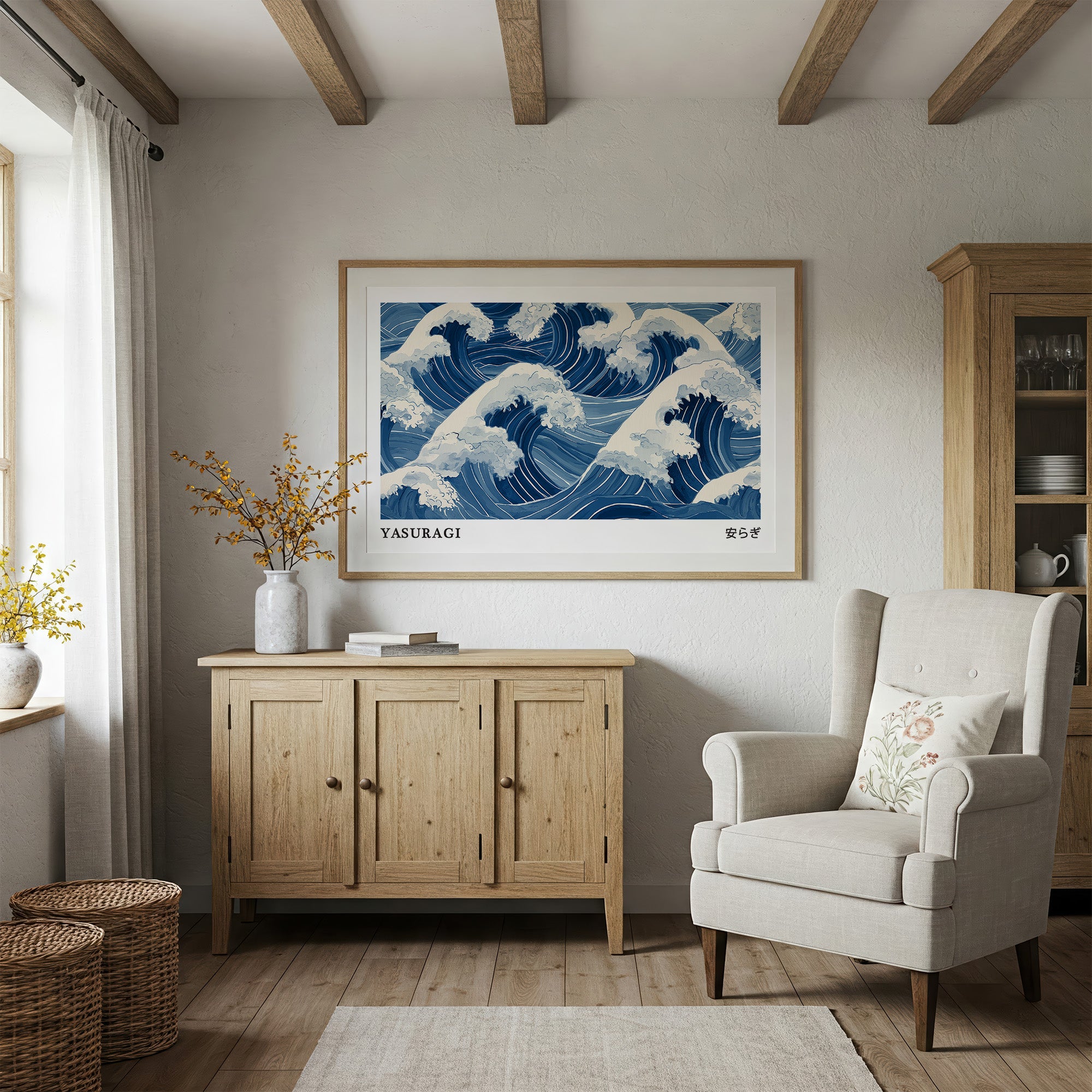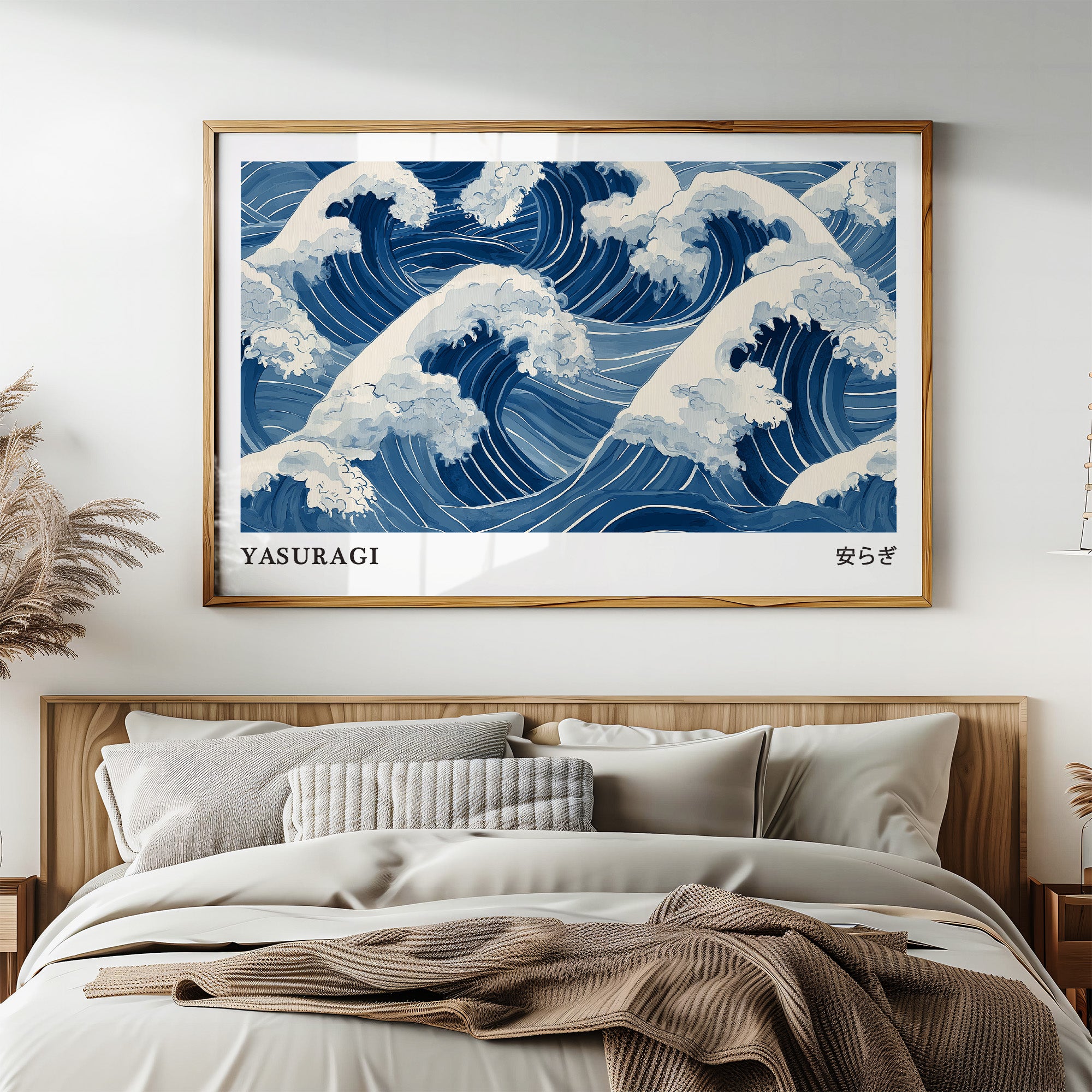 A mesmerizing interpretation of ocean waves rendered in various shades of blue and white, reminiscent of traditional Japanese woodblock prints. The rhythmic pattern captures the dynamic movement of cresting waves with their foam-topped peaks swirling in an eternal dance. The monochromatic blue palette creates a sense of serene power, while the stylized representation honors the artistic traditions of Eastern water depictions. The word "YASURAGI" (meaning tranquility or peace in Japanese) anchors the composition, suggesting the paradoxical calm one might find within nature's powerful forces.