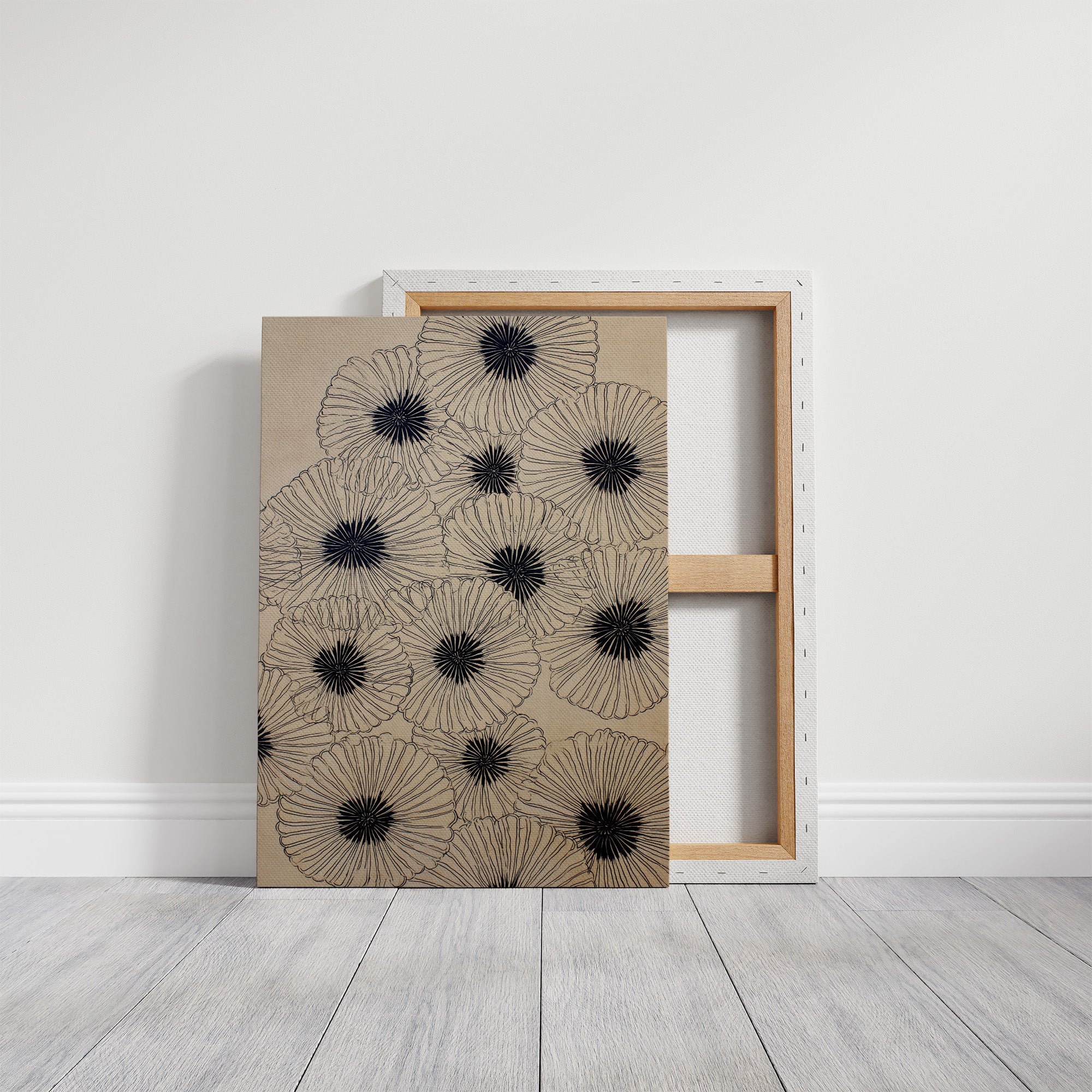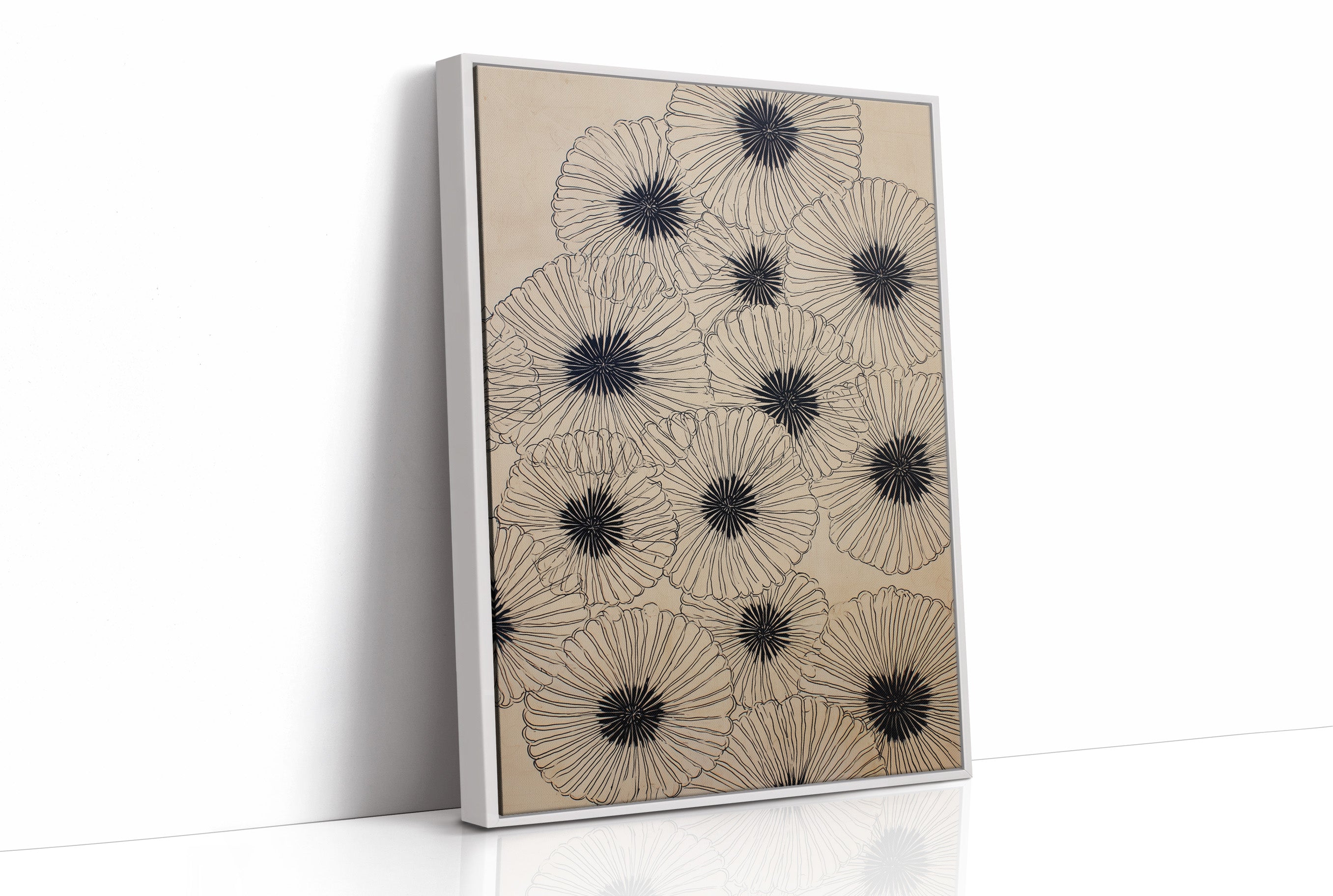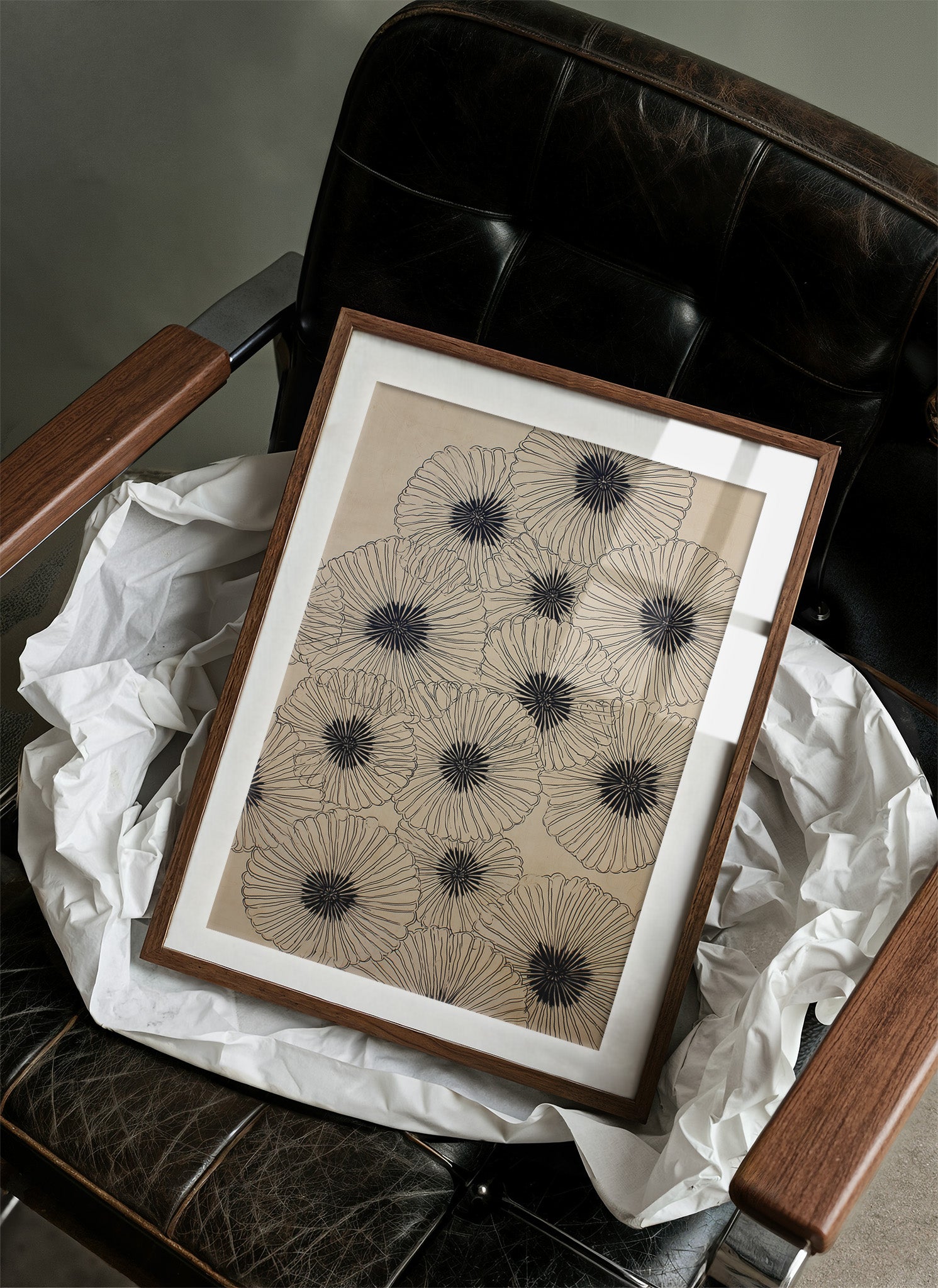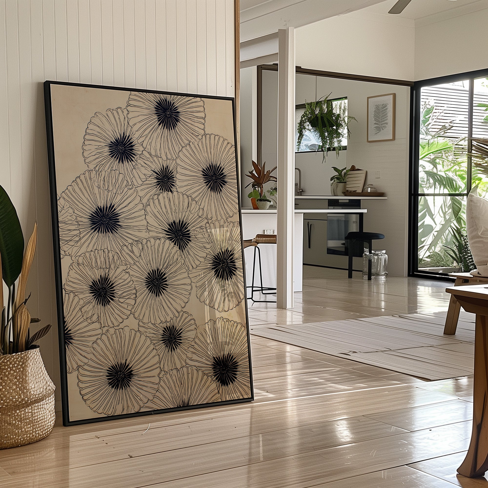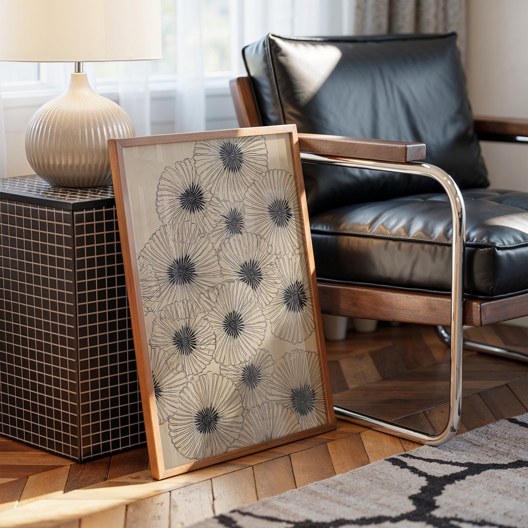 Delicate black lines trace an ethereal garden of abstract flowers, their petals unfurling like morning thoughts. Each bloom spirals outward with precise detail, creating a mesmerizing pattern of interconnected circles against a warm cream background. The natural oak frame complements the minimalist design, while casting subtle shadows that add depth to this contemporary botanical study. This piece would bring sophisticated serenity to a reading nook, home office, or anywhere you seek both inspiration and calm.