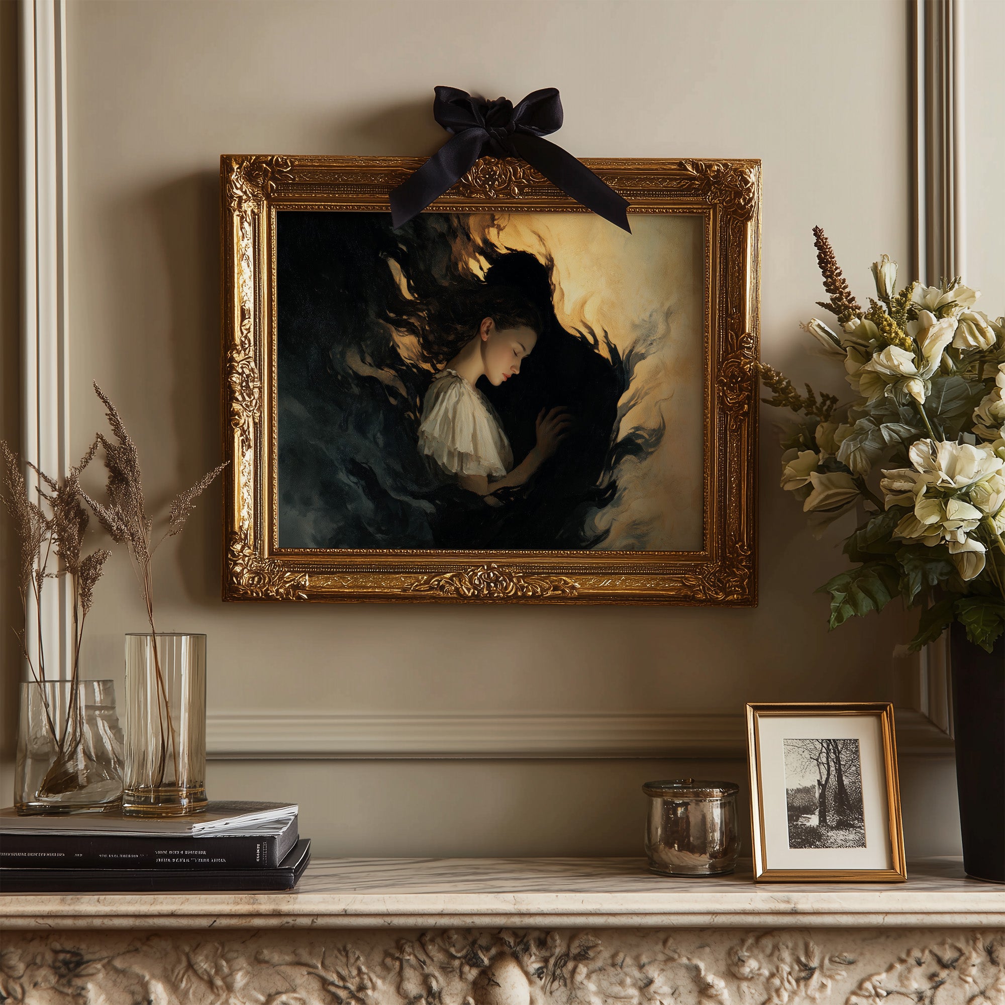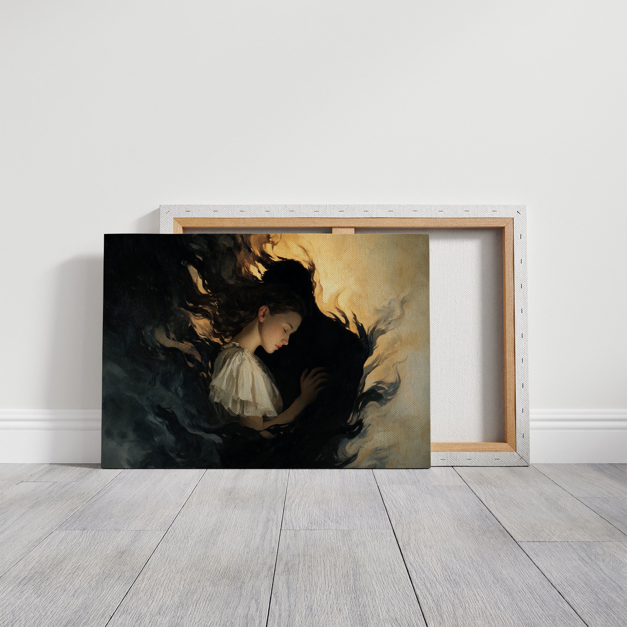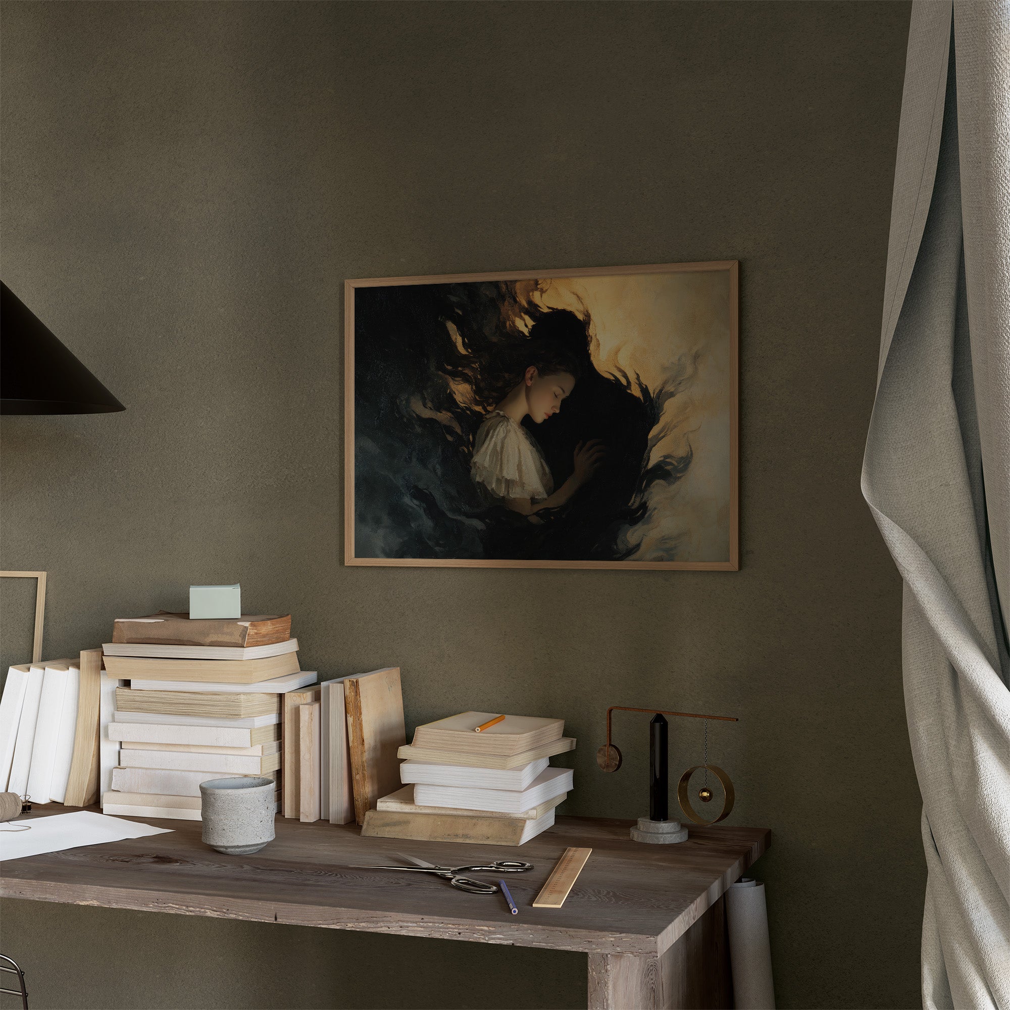 The painting rests against wooden shelves like a secret waiting to be discovered, its ethereal portrait of a sleeping woman surrounded by flowing darkness and golden light. Her peaceful face and billowing hair create a striking contrast against the backdrop of countless books standing sentinel behind her. This contemplative piece invites viewers to pause and consider the boundary between consciousness and dreams, reality and fantasy. A perfect centerpiece for a home library, reading nook, or any thoughtful space where stories and imagination flourish.