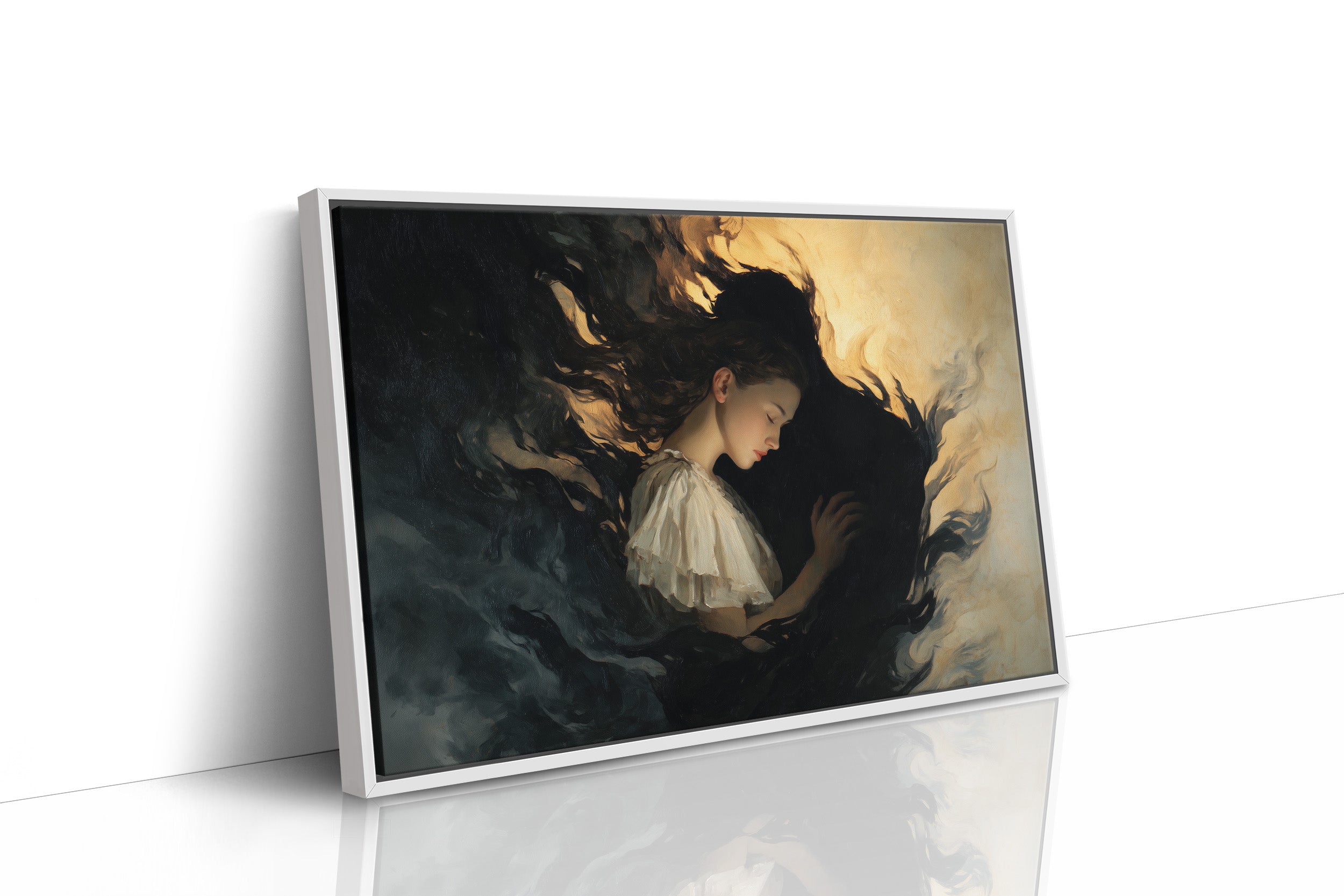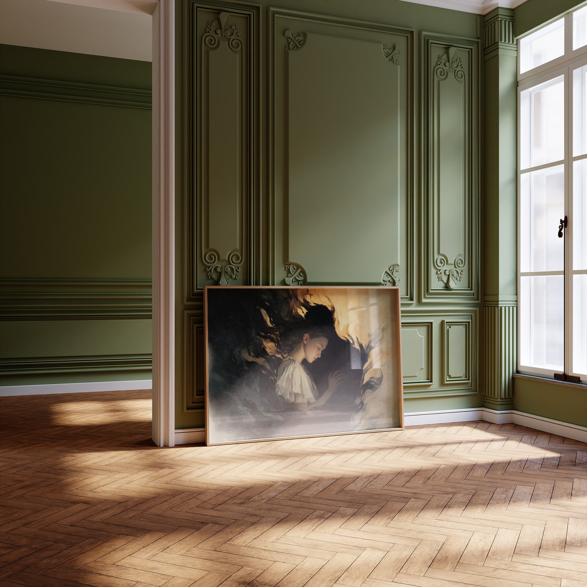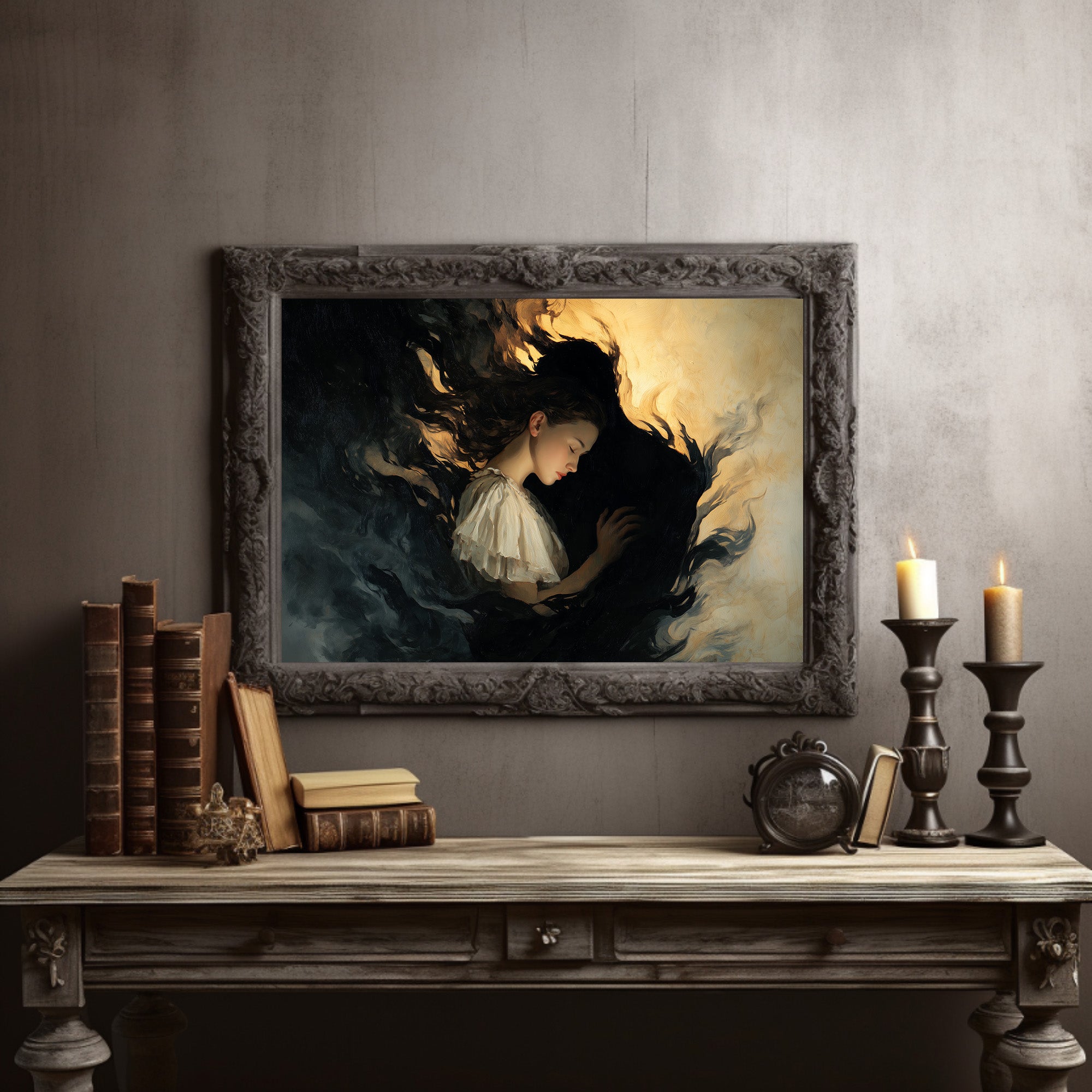 The painting rests against wooden shelves like a secret waiting to be discovered, its ethereal portrait of a sleeping woman surrounded by flowing darkness and golden light. Her peaceful face and billowing hair create a striking contrast against the backdrop of countless books standing sentinel behind her. This contemplative piece invites viewers to pause and consider the boundary between consciousness and dreams, reality and fantasy. A perfect centerpiece for a home library, reading nook, or any thoughtful space where stories and imagination flourish.