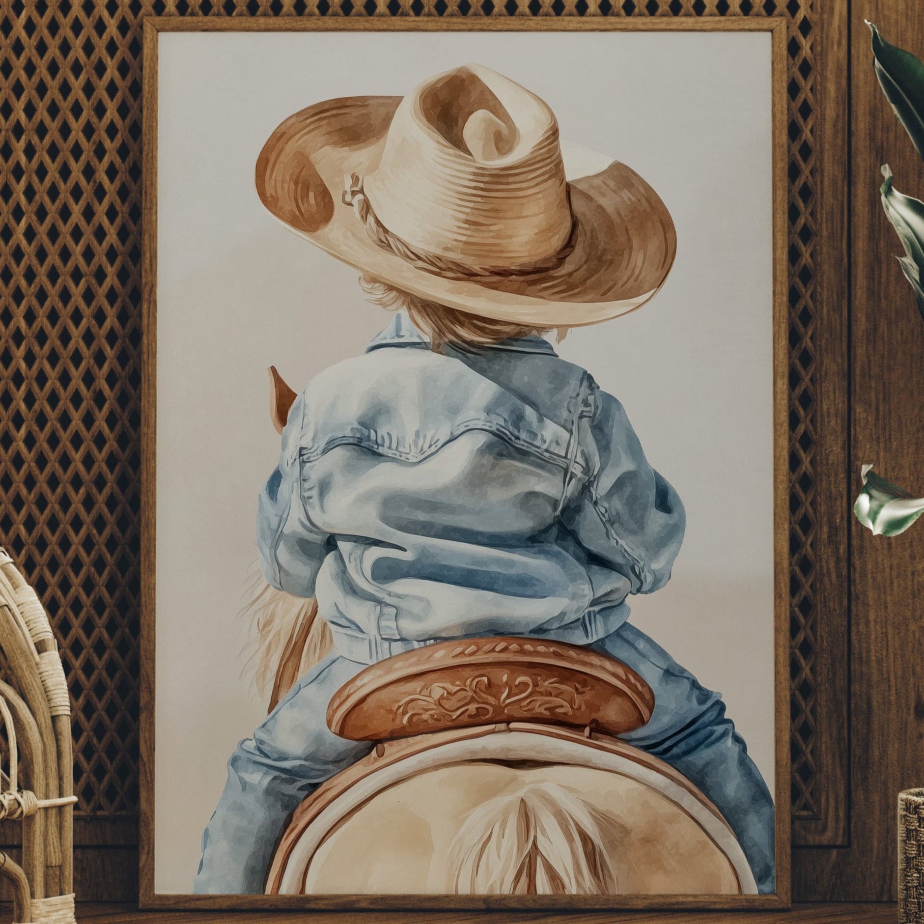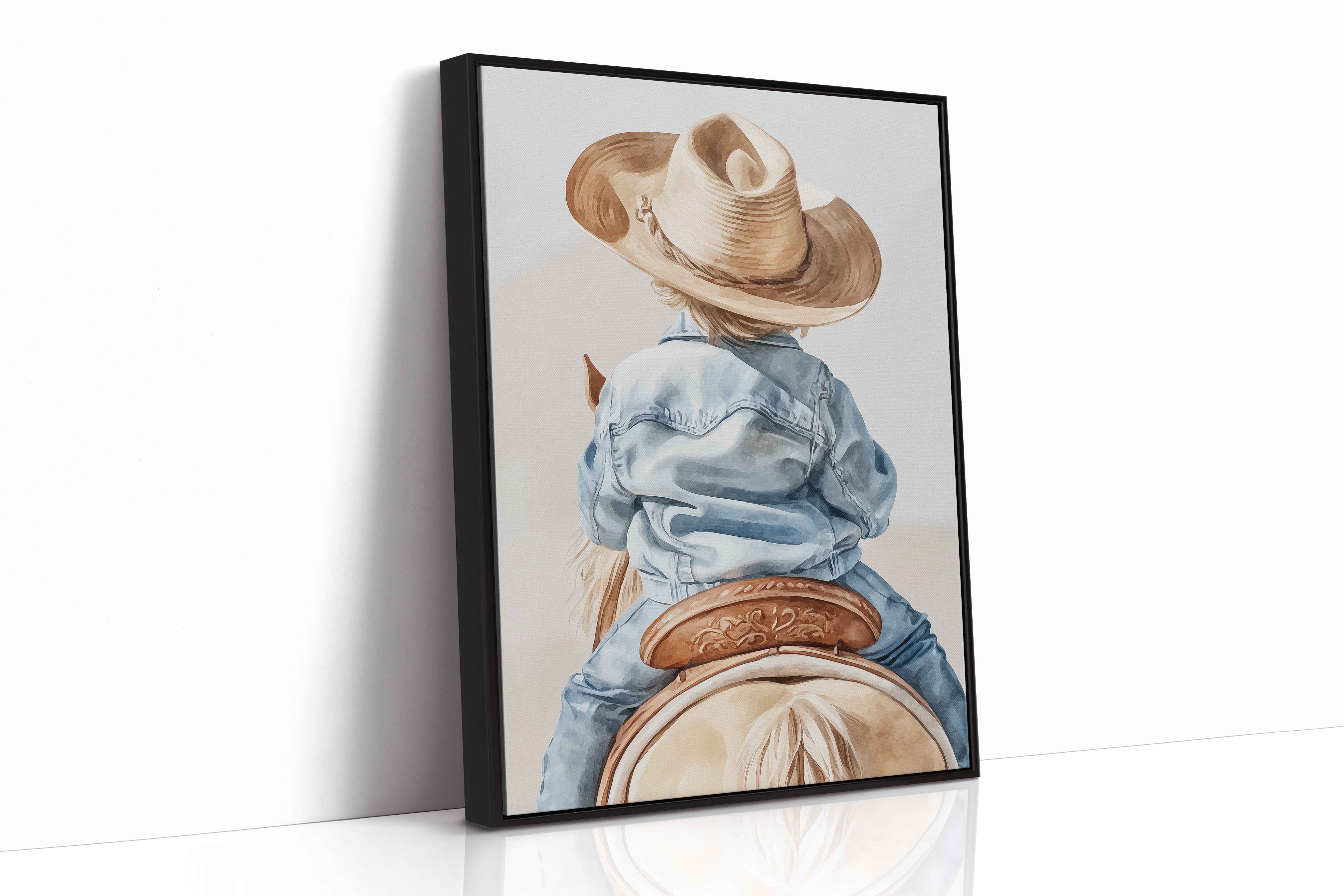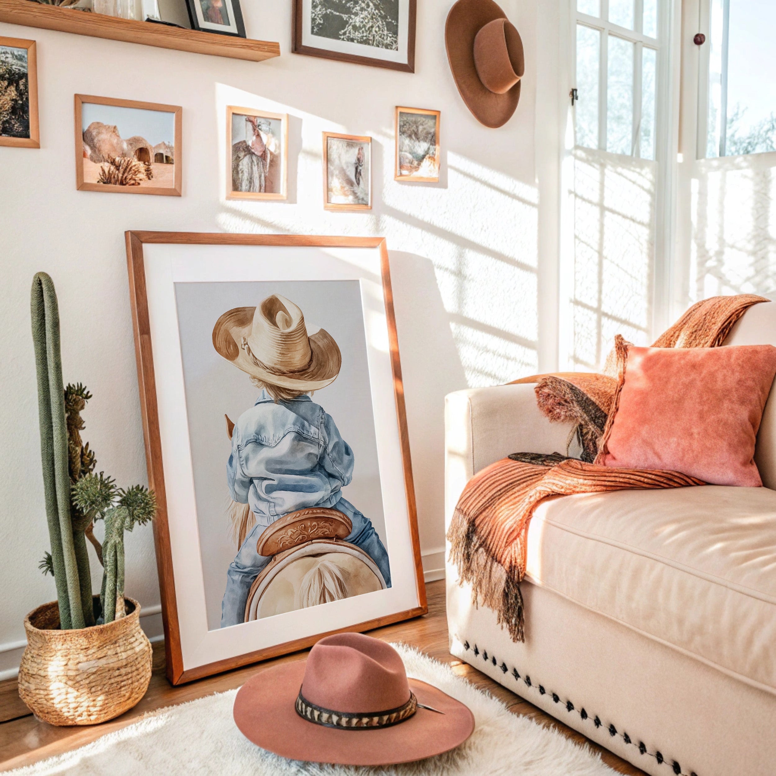 A young rider sits confidently, the world beyond the hat's brim unfolding with endless possibilities. This piece captures the spirit of childhood adventure within the contemporary collection. Soft denim hues blend seamlessly with the warmth of the saddle, evoking a sense of nostalgia and freedom. Perfect for a child's room or a cozy reading nook, this art brings a touch of whimsy and joy to any space. May it inspire the dreams of young hearts.
