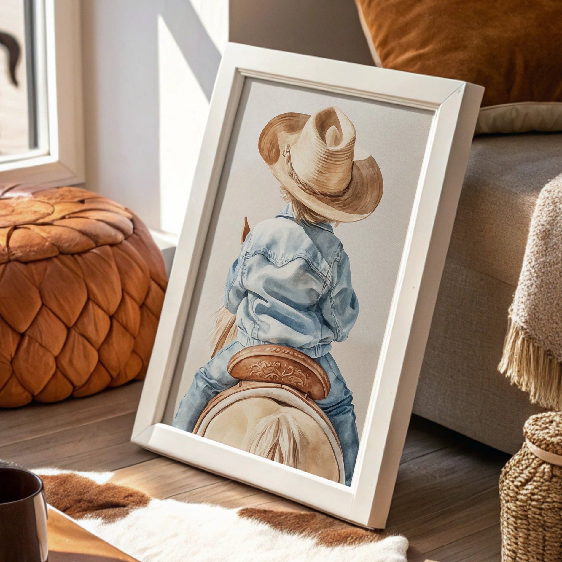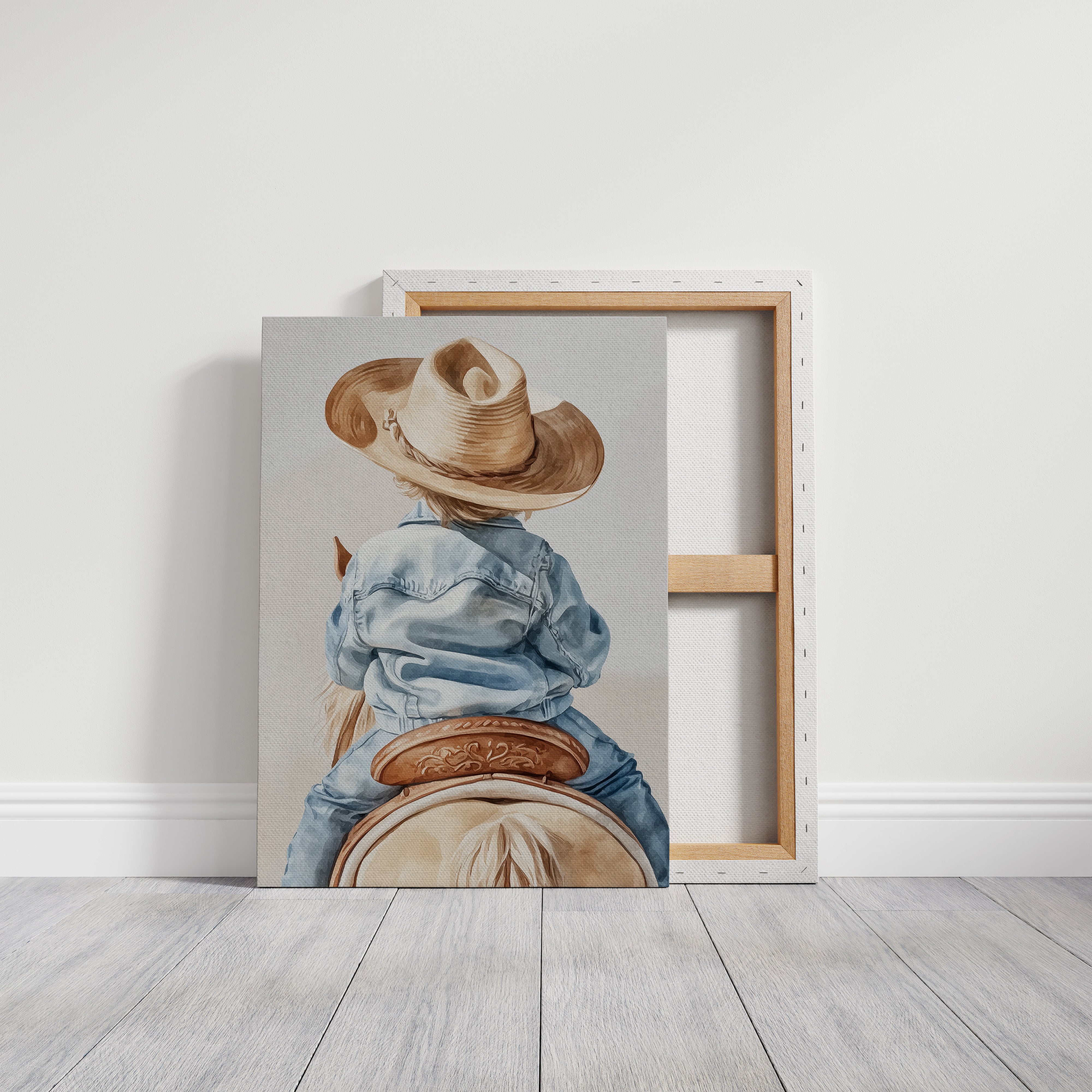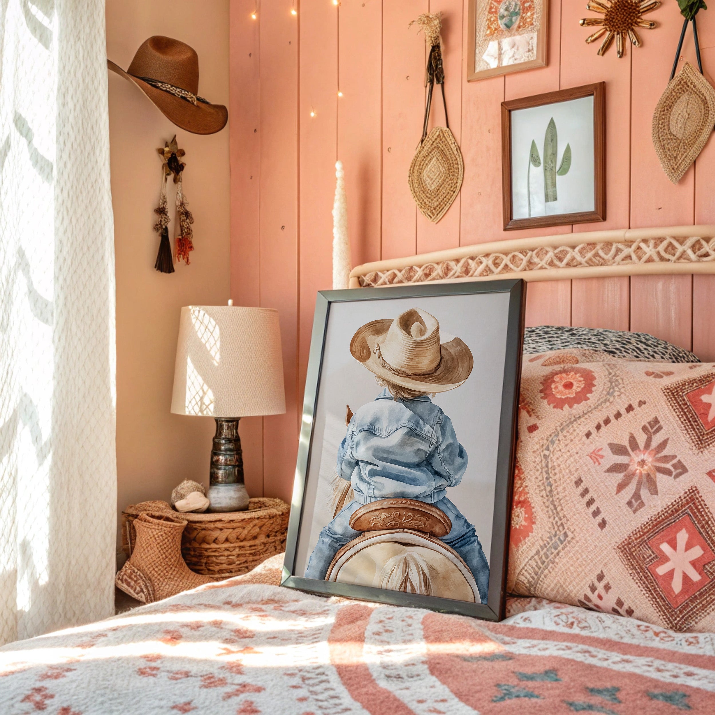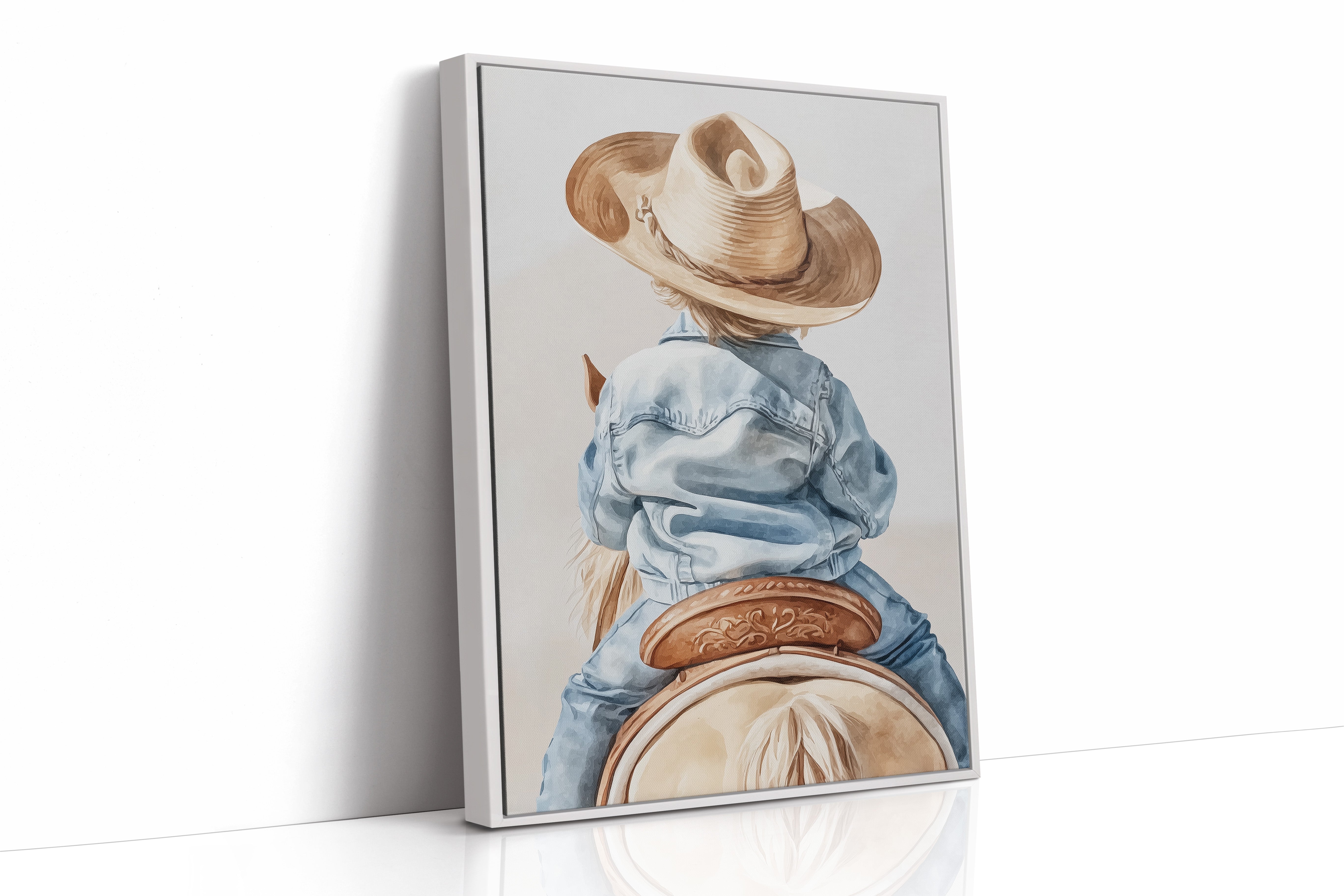 A young rider sits confidently, the world beyond the hat's brim unfolding with endless possibilities. This piece captures the spirit of childhood adventure within the contemporary collection. Soft denim hues blend seamlessly with the warmth of the saddle, evoking a sense of nostalgia and freedom. Perfect for a child's room or a cozy reading nook, this art brings a touch of whimsy and joy to any space. May it inspire the dreams of young hearts.