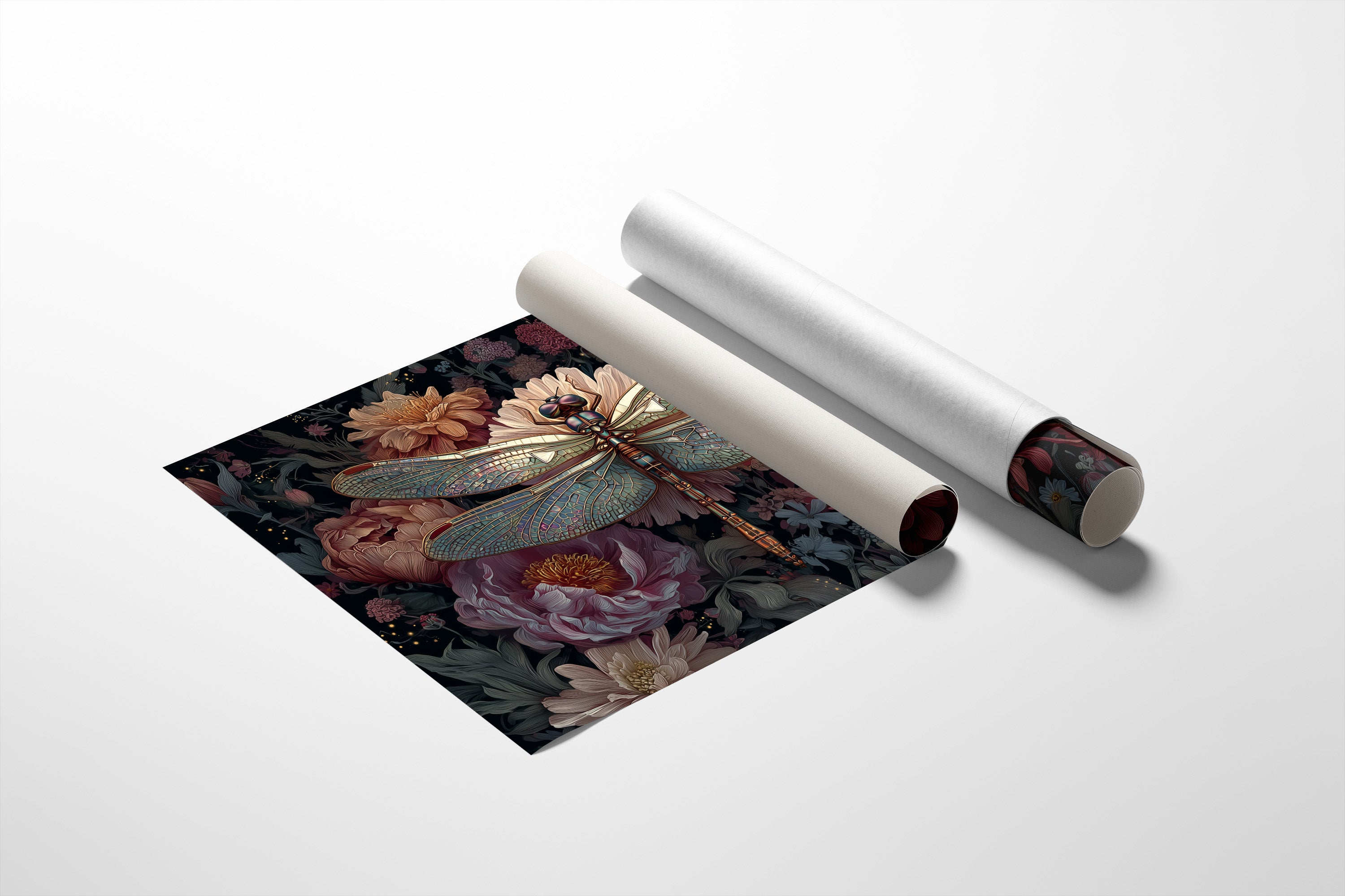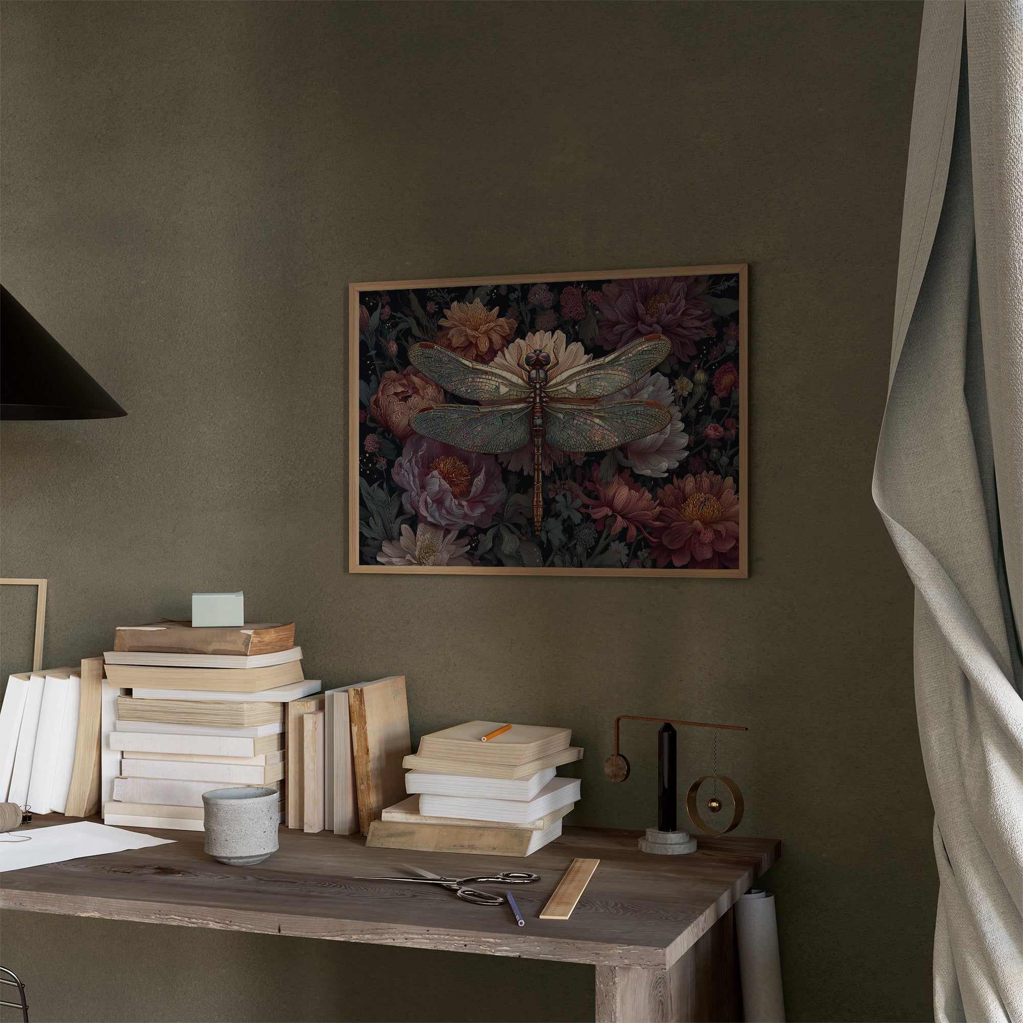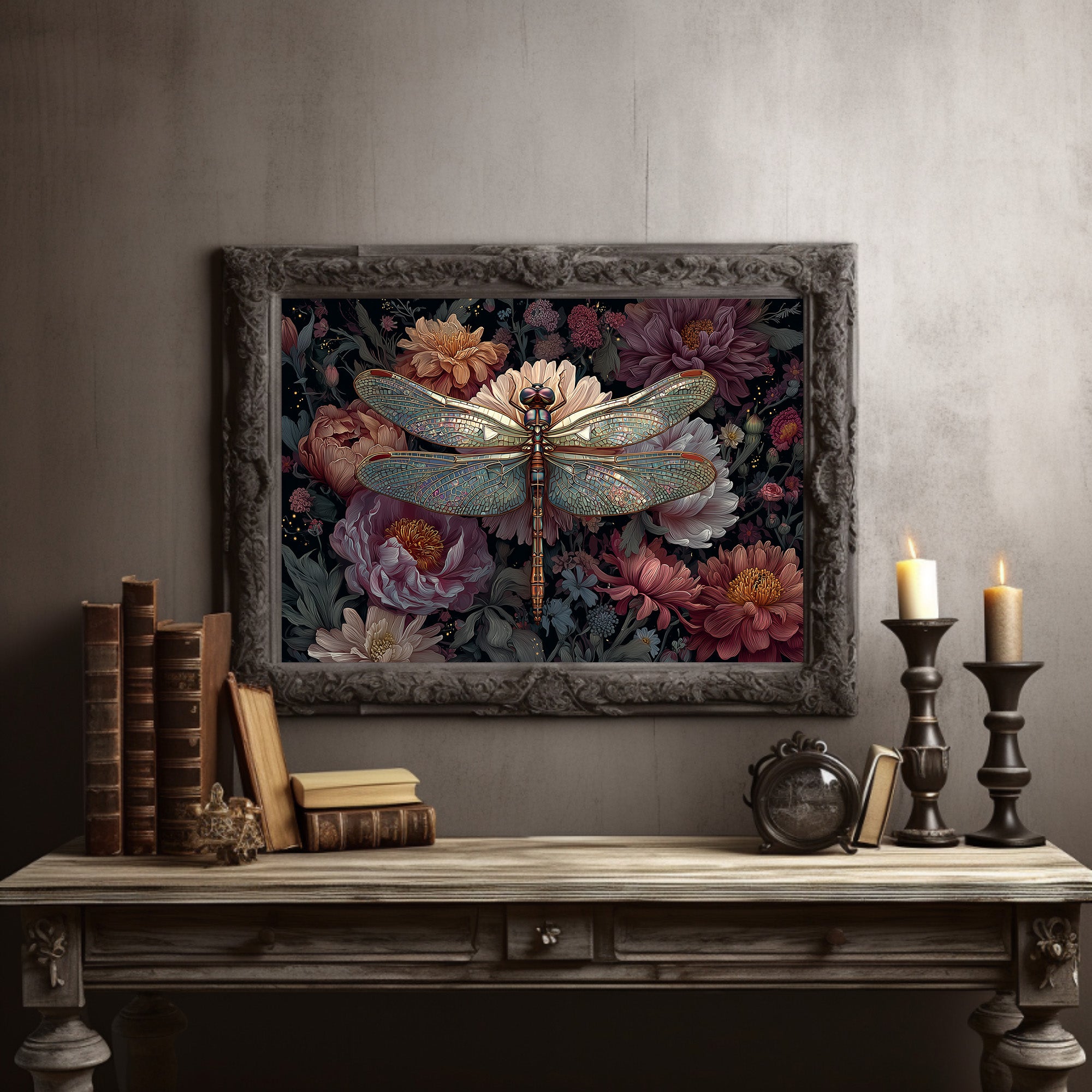 A delicate dragonfly hovers in eternal stillness, its translucent wings catching imaginary light against a lush backdrop of vintage-inspired florals. Deep mauve peonies and blush-toned blooms create a romantic garden sanctuary, while the metallic details of the dragonfly add an unexpected touch of magic to the moody botanical scene. This sophisticated piece brings literary charm to a home study, creating a perfect focal point against the warm wooden shelves of a personal library.