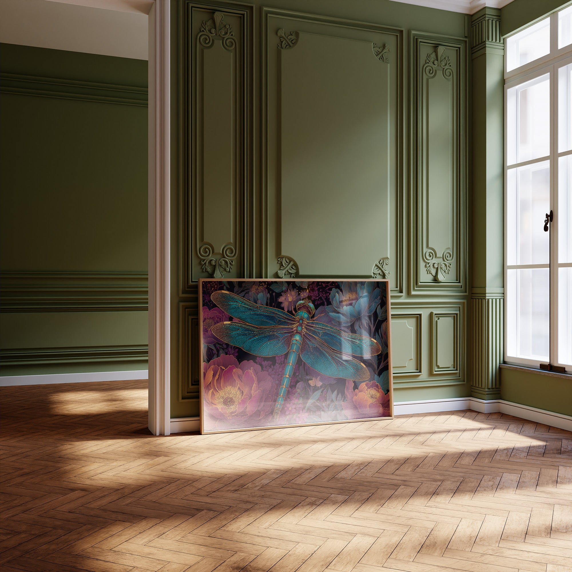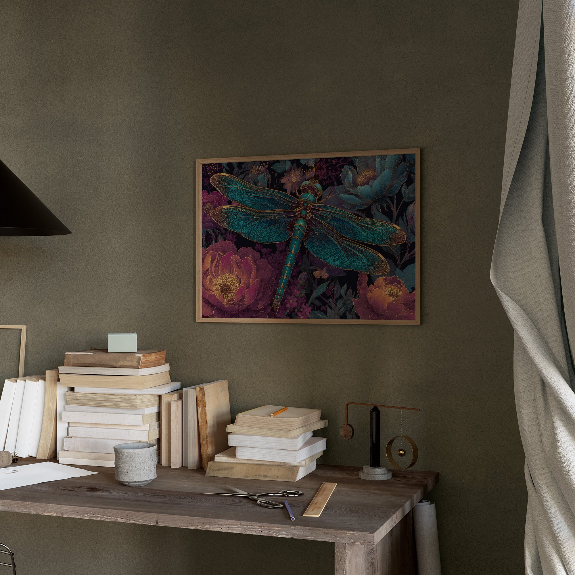 A luminous teal dragonfly hovers amid a garden of twilight, its metallic wings catching light against the deep purple backdrop. Rich magenta peonies and cerulean blossoms create a dreamlike floral sanctuary, their golden centers glowing like distant stars in a botanical universe. The ornate frame captures this moment of natural magic, transforming an ephemeral creature into an eternal symbol of transformation and beauty. This statement piece adds a touch of sophisticated whimsy to home libraries, reading nooks, or creative spaces where imagination takes flight.