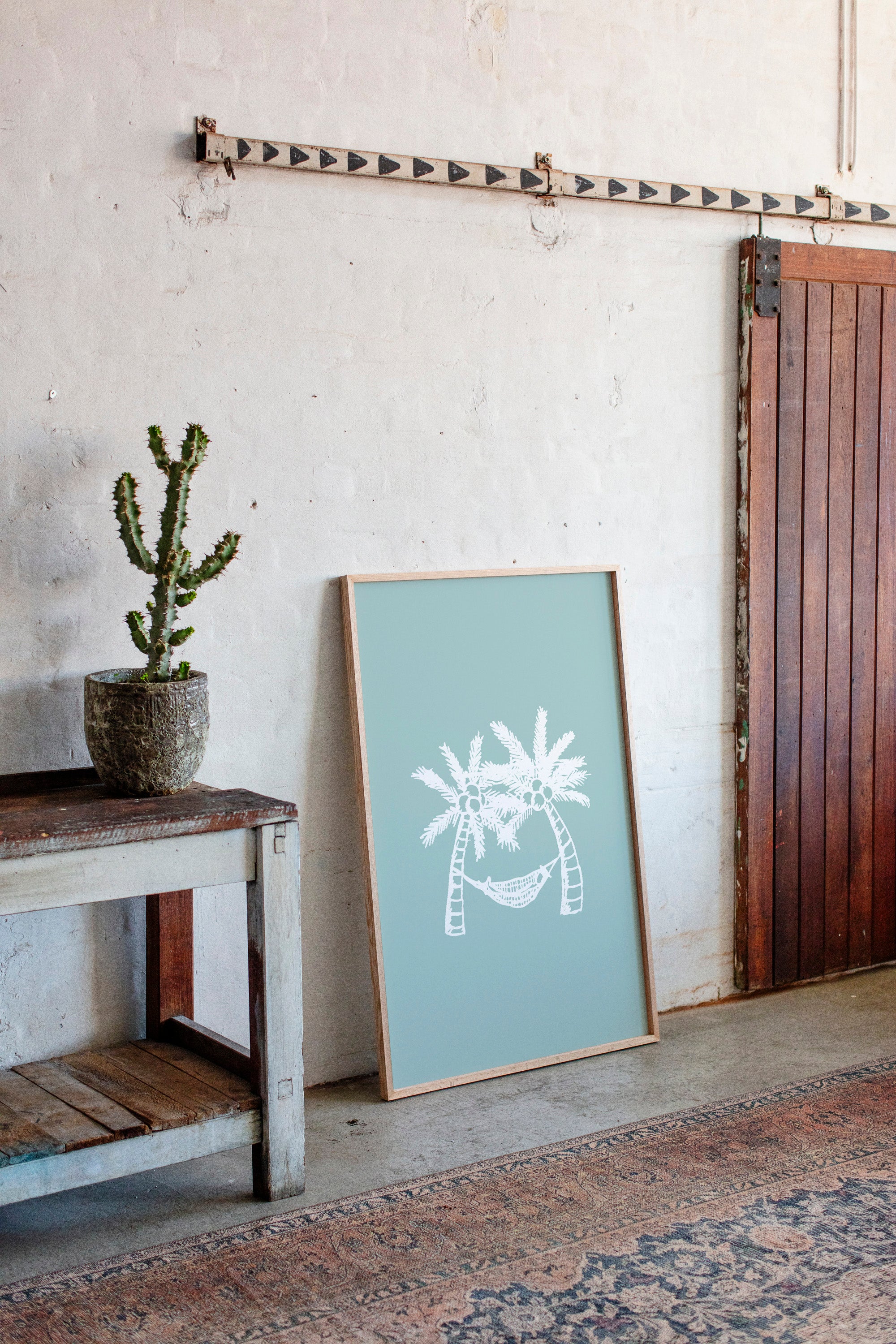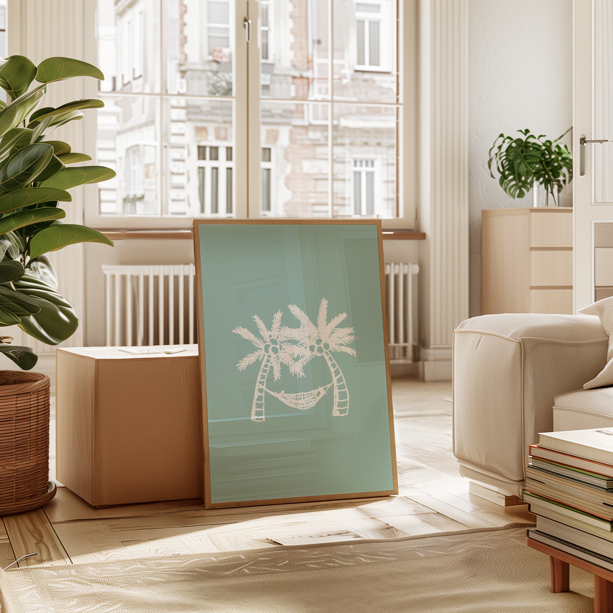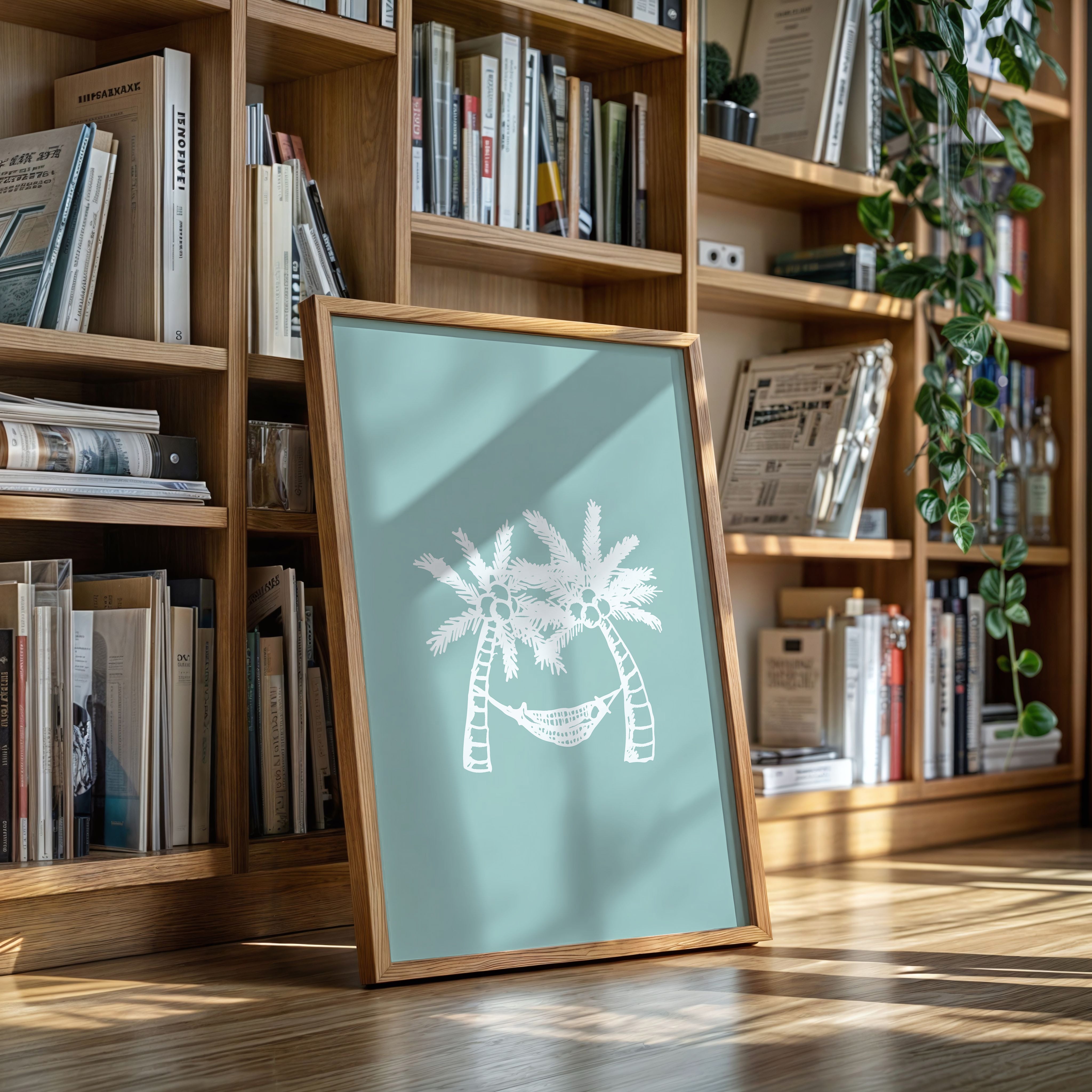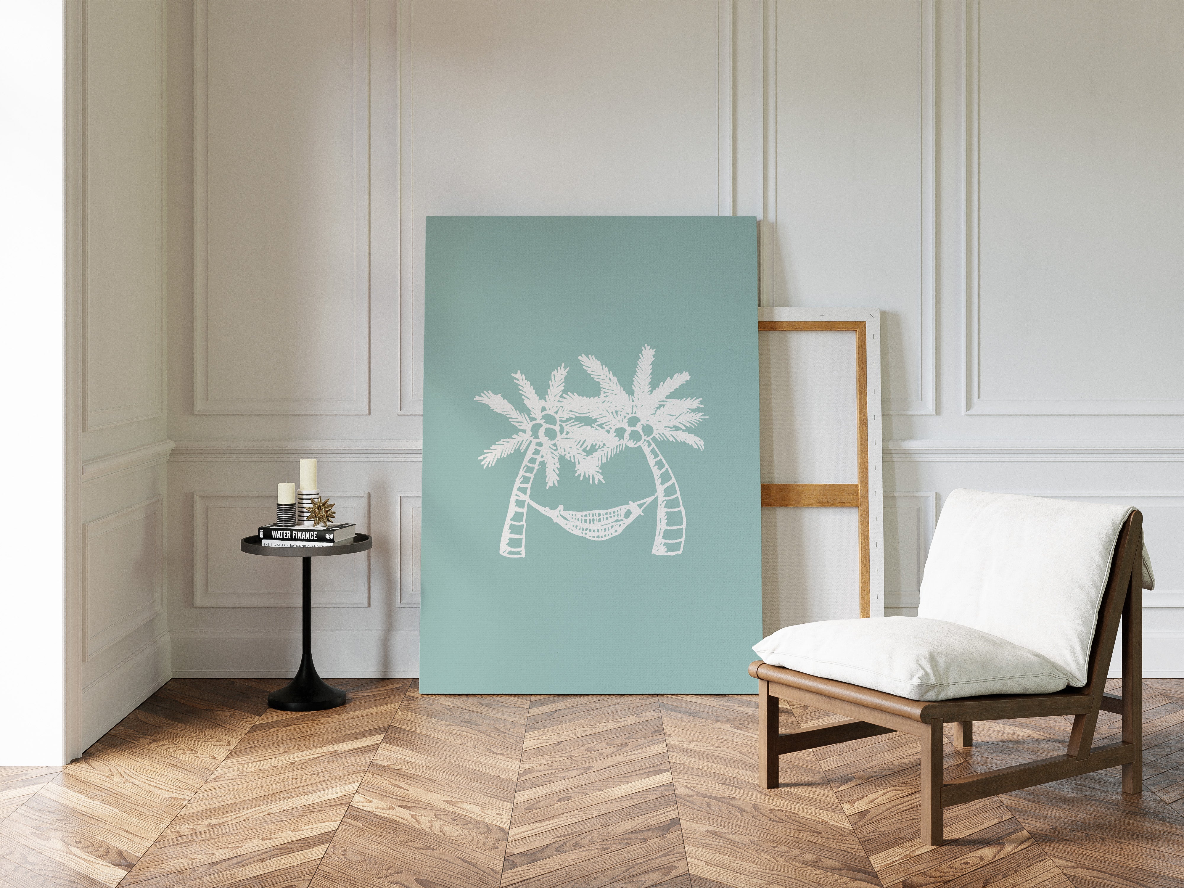A hammock sways gently between two palm trees, inviting thoughts of peaceful afternoon naps and ocean breezes. This minimalist coastal illustration from our Contemporary collection captures the essence of tropical serenity through clean, white lines against a soothing seafoam background. The simple yet evocative design tells a story of lazy days and paradise found, where time slows down and worries drift away with the tide. Each element - from the detailed palm fronds to the perfectly sketched hammock - creates a harmonious scene of relaxation. This piece brings a sense of calm to any space, perfect for bedrooms, home offices, or any room where you wish to create a peaceful coastal retreat.