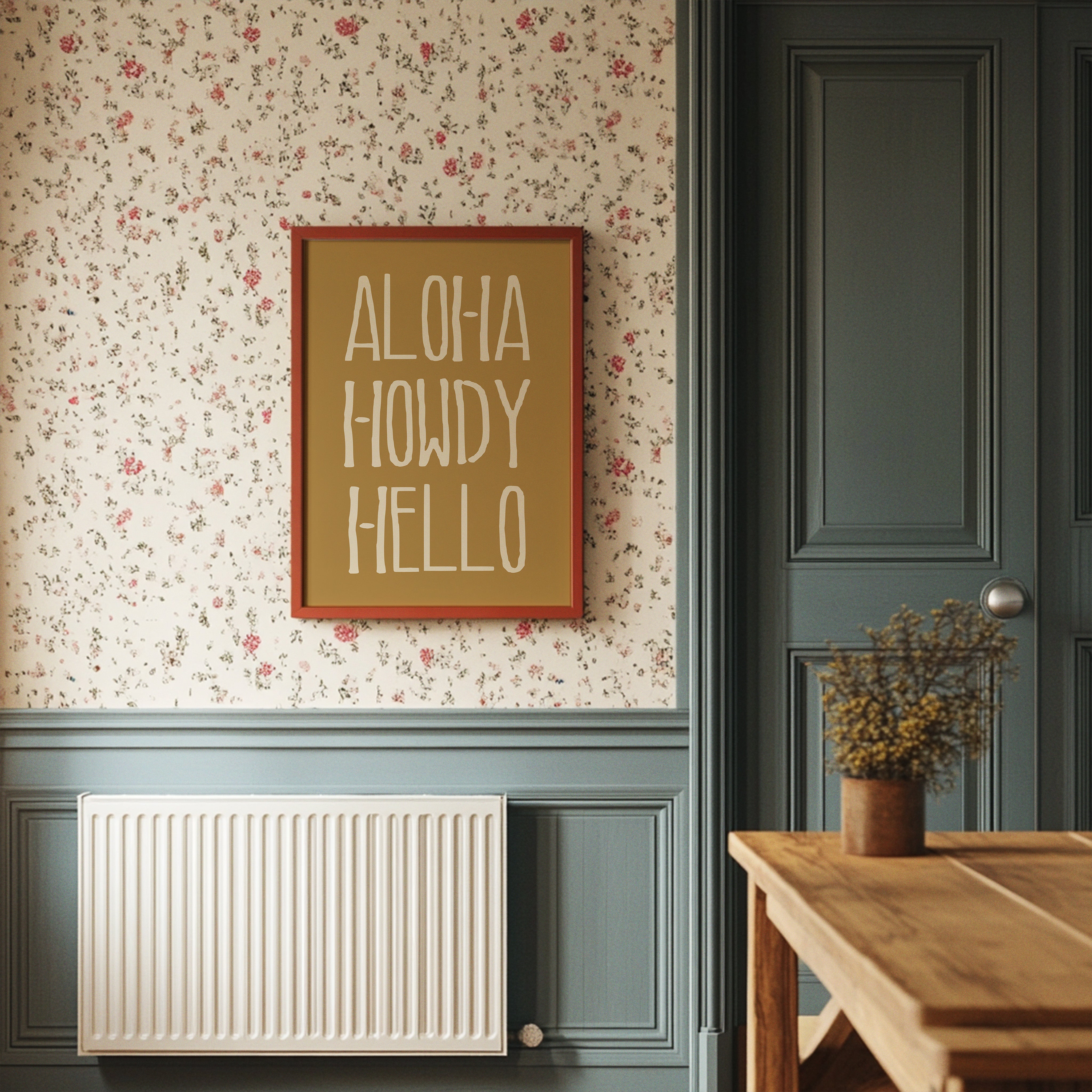 Handcrafted letters dance against a sun-kissed backdrop, radiating the laid-back spirit of island life. The organic, imperfect strokes in creamy white paint create a casual yet sophisticated composition against the warm golden brown background, capturing the essence of tropical hospitality. The playful typography transforms the familiar Hawaiian greeting into a modern artistic statement that feels both fresh and timeless. Perfect for bringing a touch of aloha spirit to contemporary spaces, from airy beach houses to urban apartments seeking that perfect balance of warmth and sophistication.
