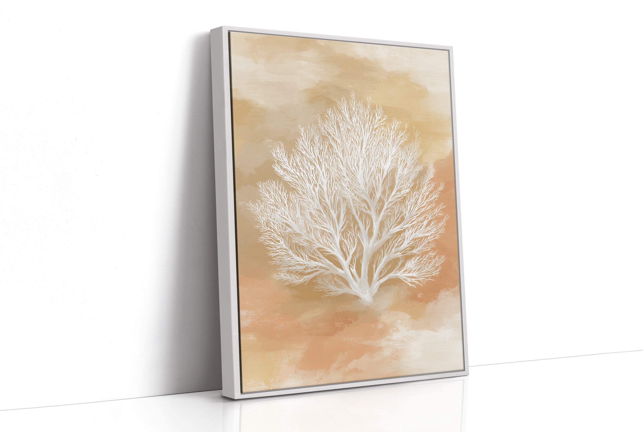 Sunlight spills across the floor, illuminating a delicate white tree silhouette against warm amber tones. The intricate branches reach outward like coral formations, their pale tendrils creating a striking contrast against the golden background. This elegant piece rests casually against a sophisticated living space where leather meets wood, chrome, and textured ceramics. Perfect for a reading nook or office where natural elements bring calm sophistication to modern interiors.