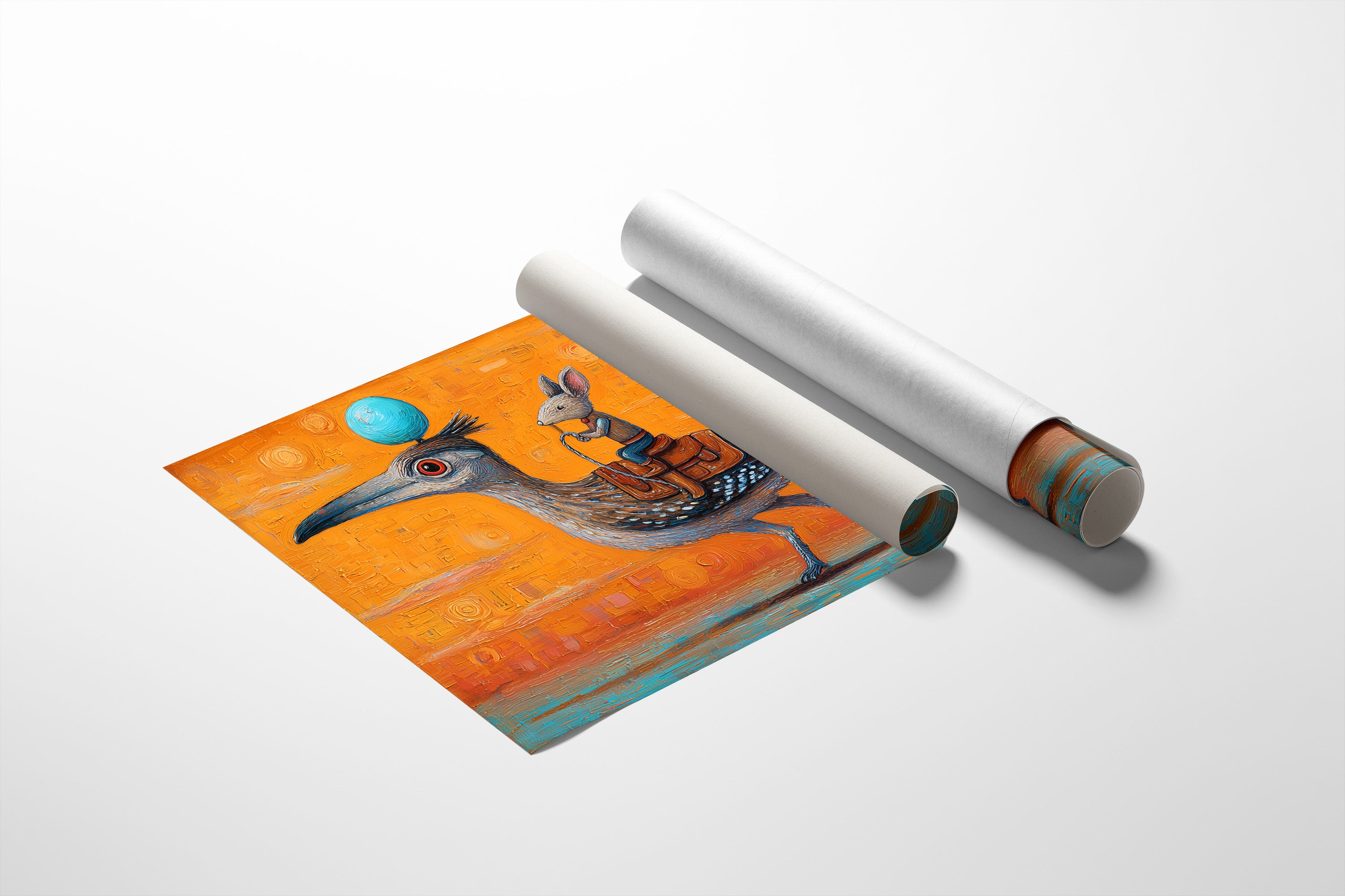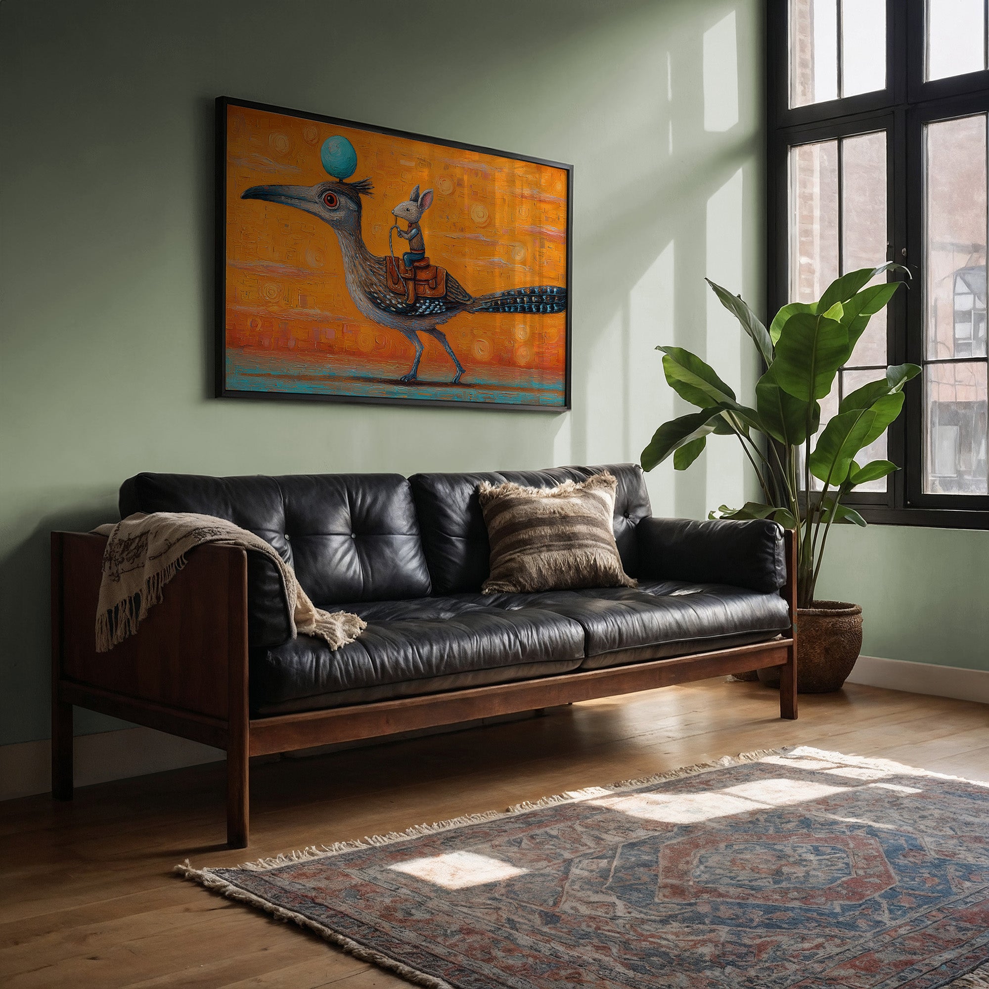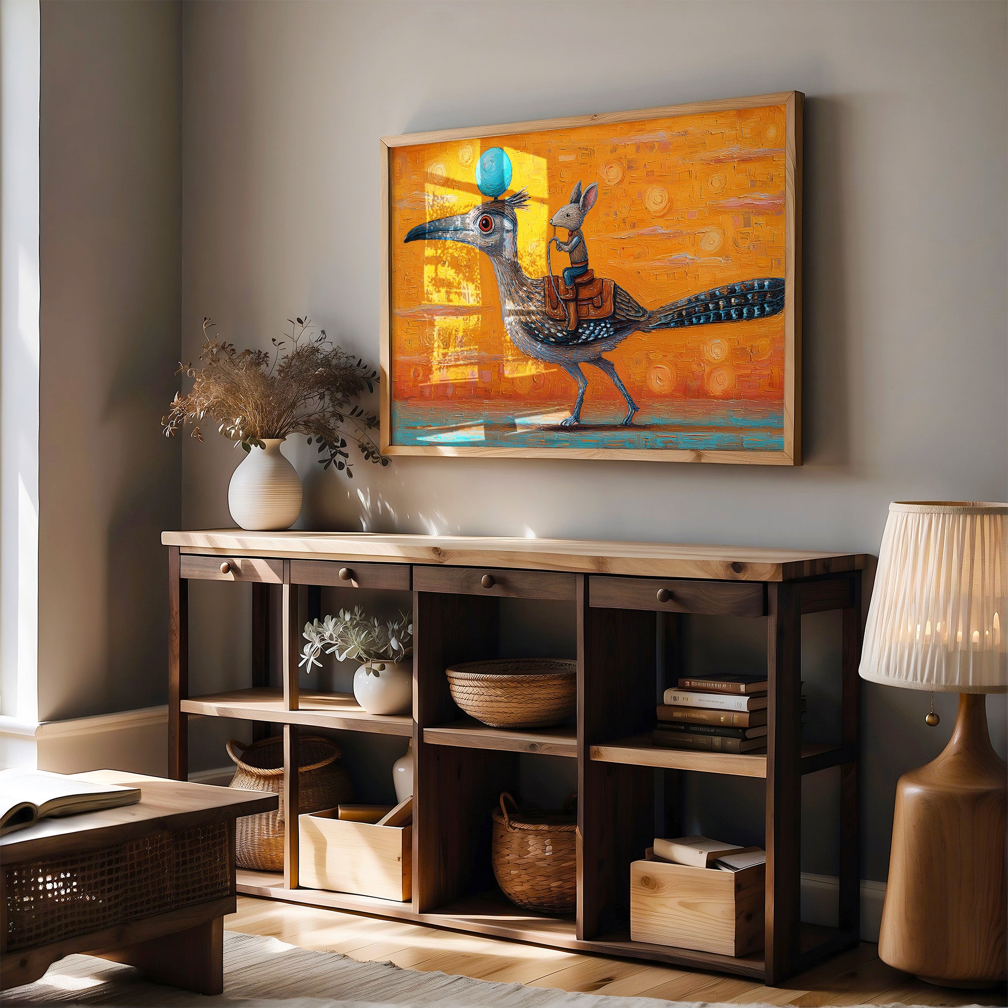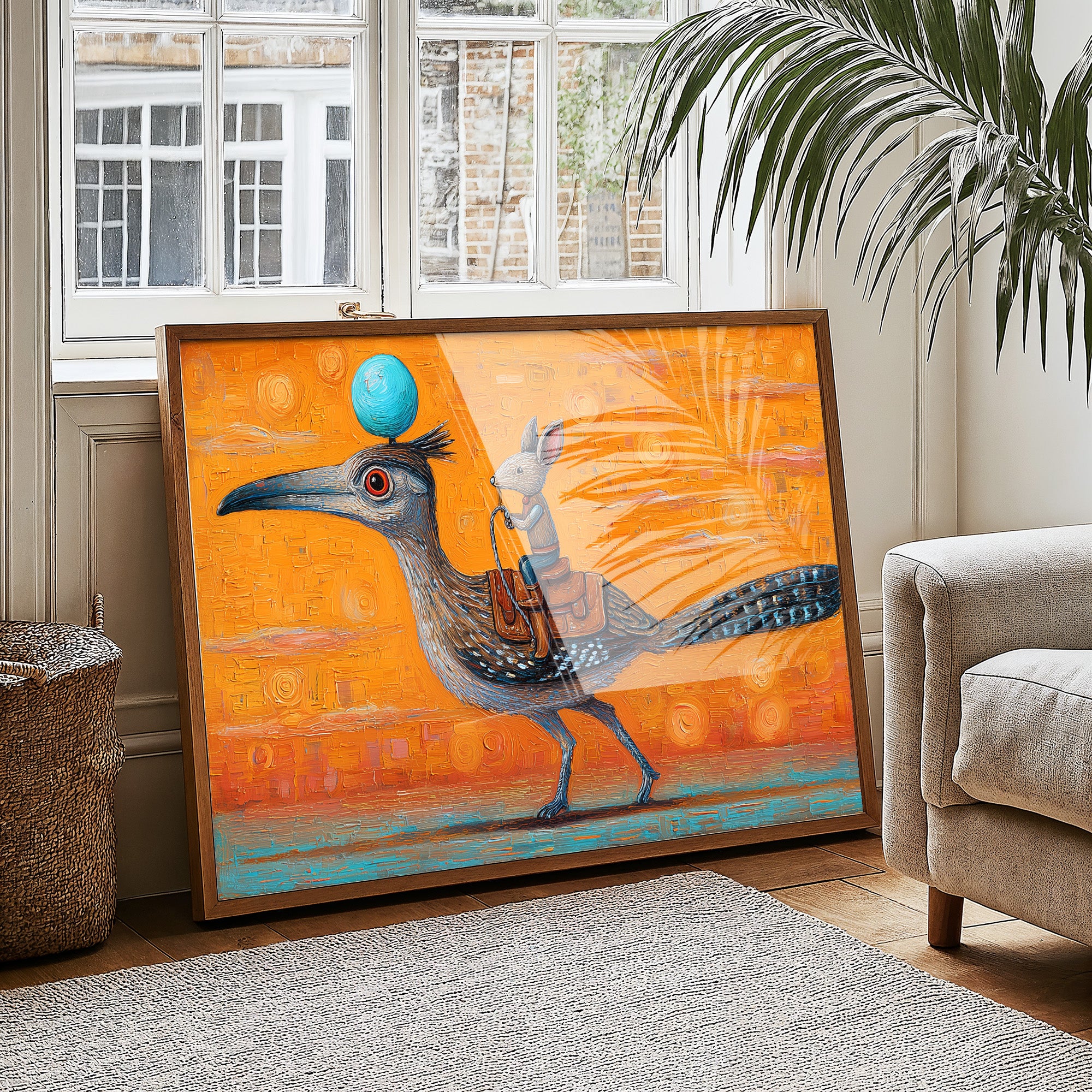 Beneath a blazing orange sky, a fearless jackrabbit cowboy grips the reins atop a swift roadrunner, racing across a dreamlike desert washed in bold texture and electric color. Whimsical and wildly imaginative, this surreal western scene blends folk art charm with modern graphic punch, creating a playful statement full of motion and character. Perfect for creative studios, kids’ rooms, game spaces, or any wall that thrives on color, humor, and storytelling.