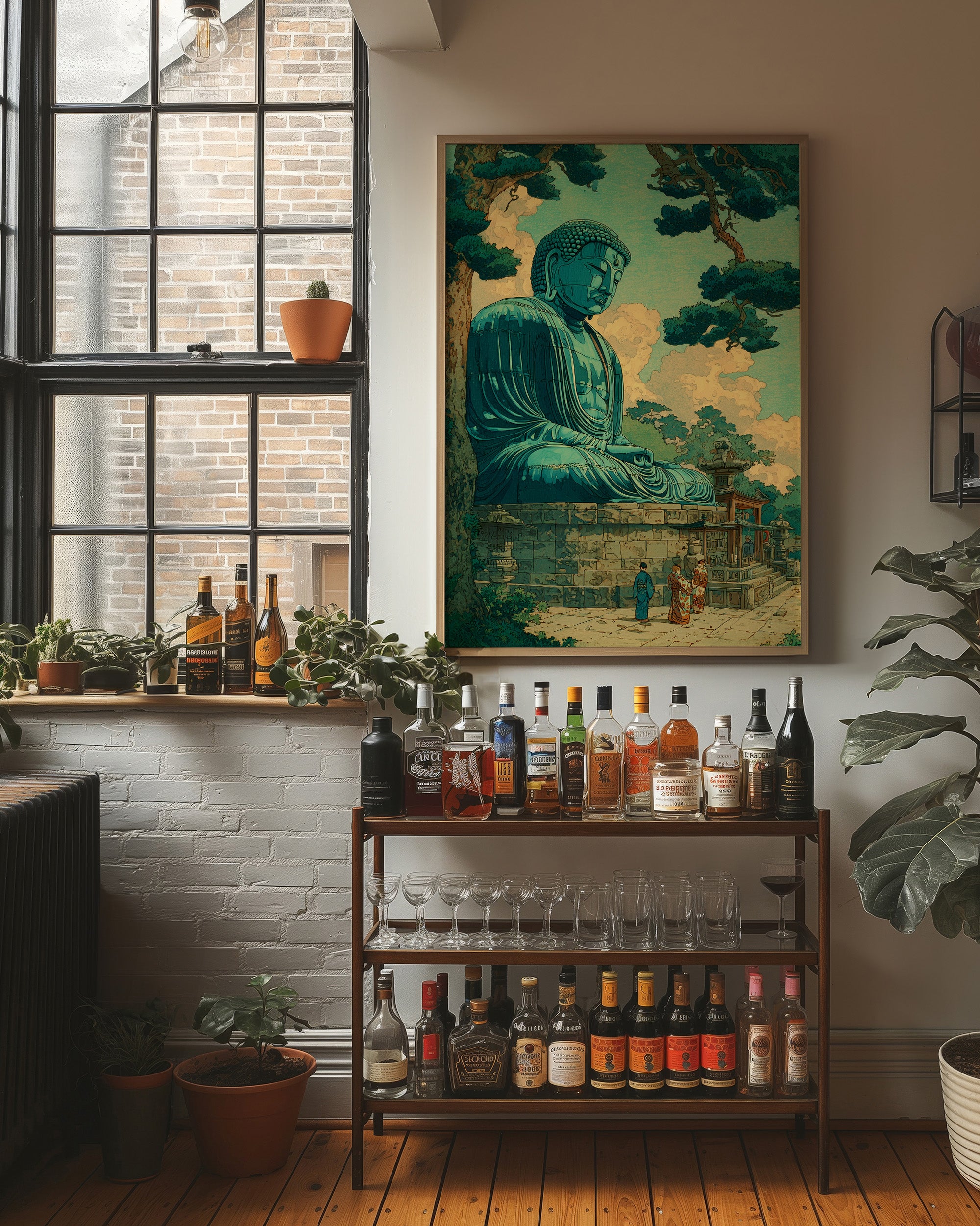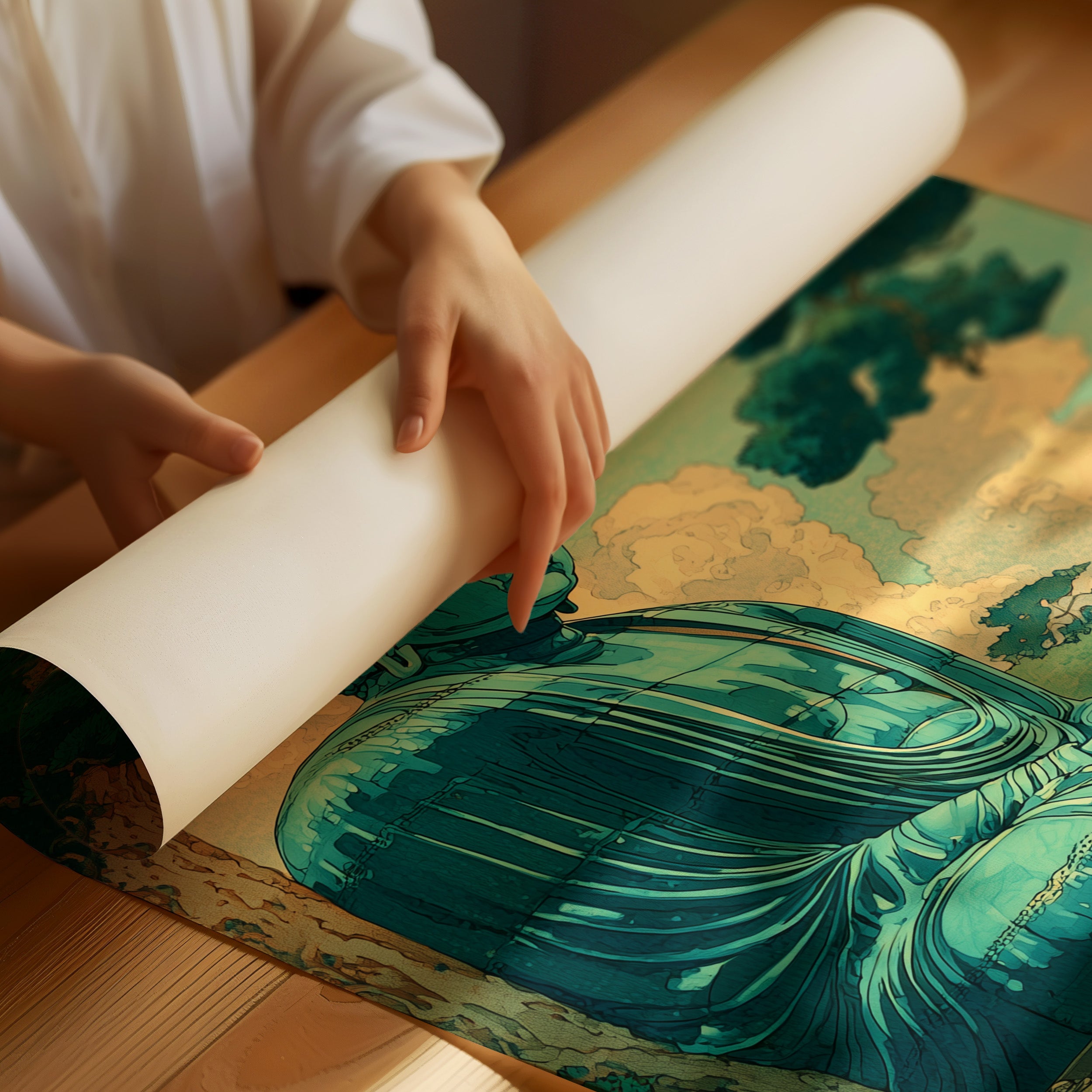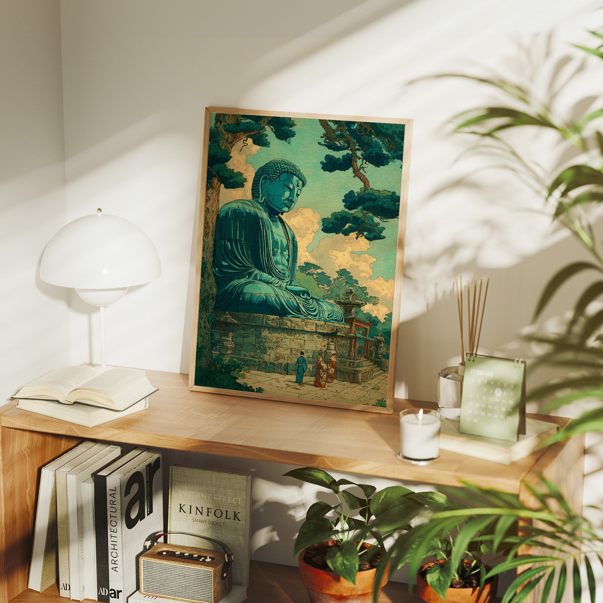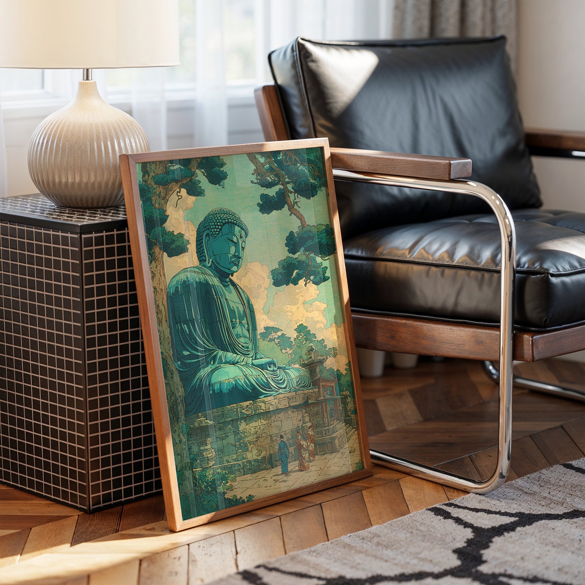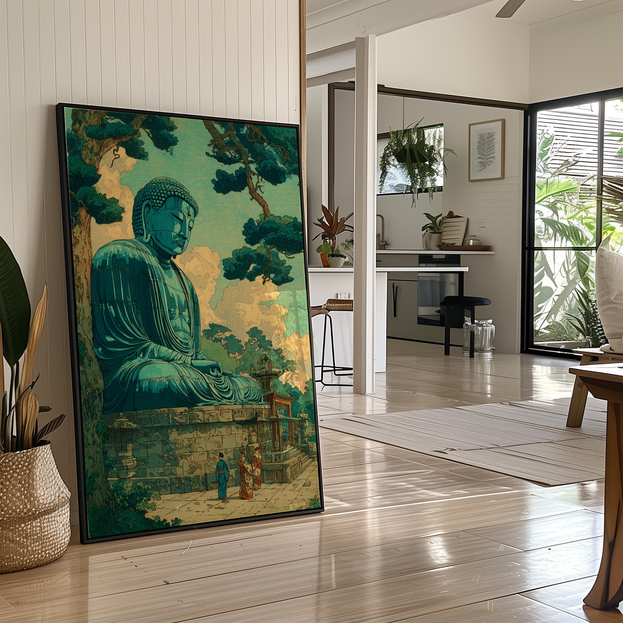 A monumental green Buddha statue sits in serene meditation, casting an ethereal presence against a backdrop of golden clouds and emerald foliage. The traditional Japanese scene captures two small figures at the base, their presence emphasizing the statue's magnificent scale while pine branches frame the composition with graceful curves. This striking piece merges contemporary color sensibilities with classical Eastern artistry, creating a powerful statement of tranquility and timeless wisdom. Perfect for modern minimalist spaces seeking a bold focal point that bridges cultural heritage with contemporary design. The dramatic scale and soothing color palette make it an ideal centerpiece for meditation rooms, spacious entryways, or zen-inspired living areas.