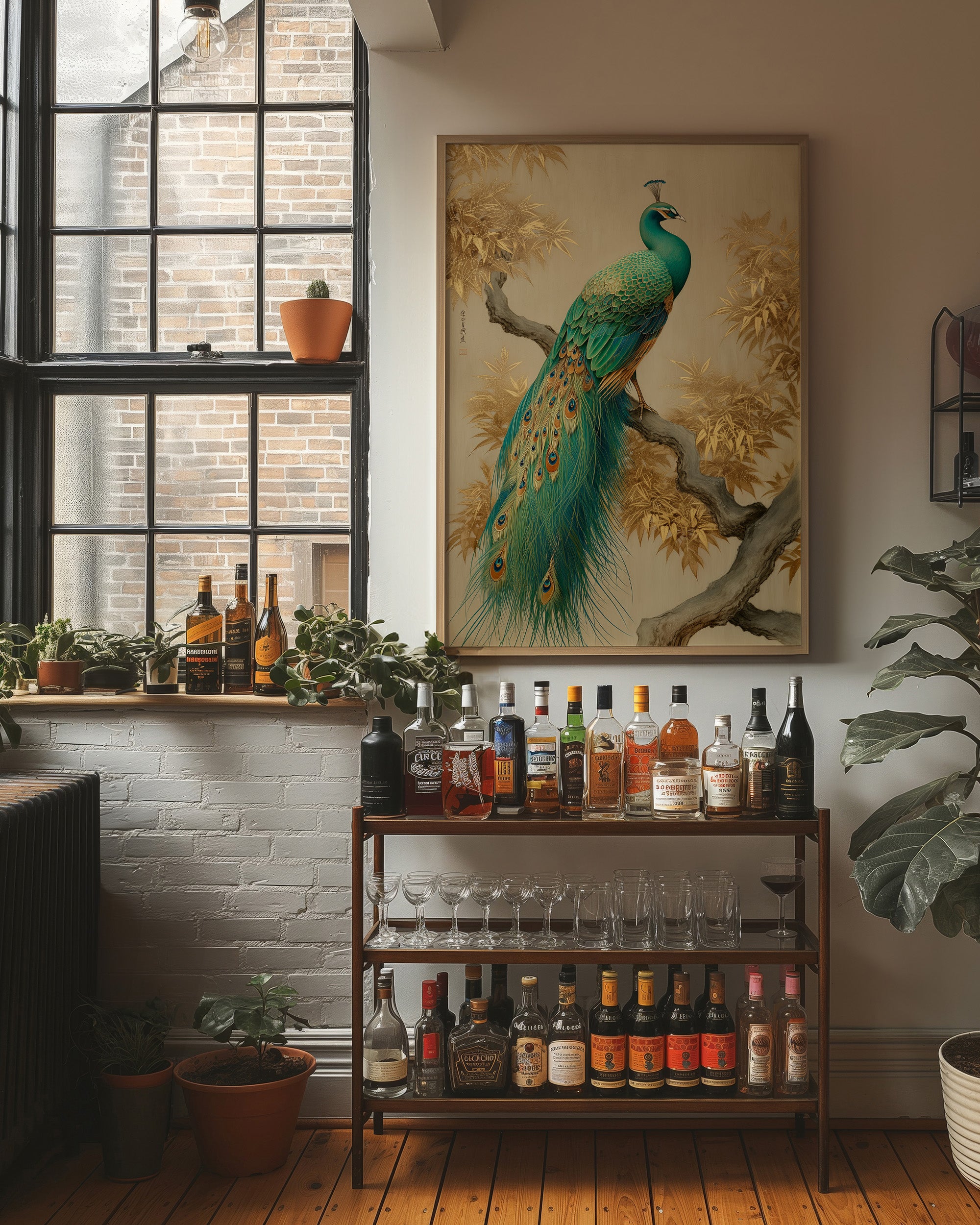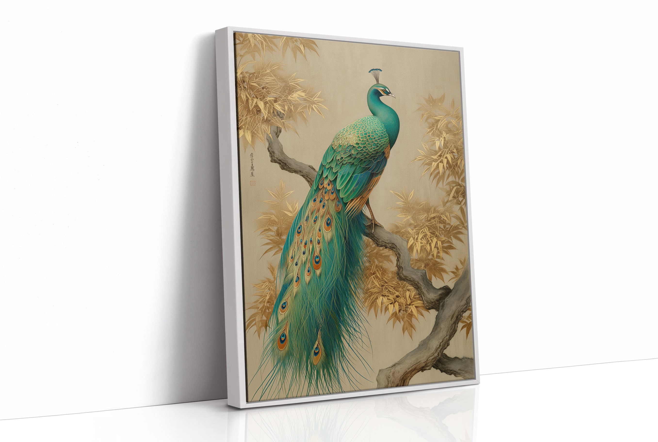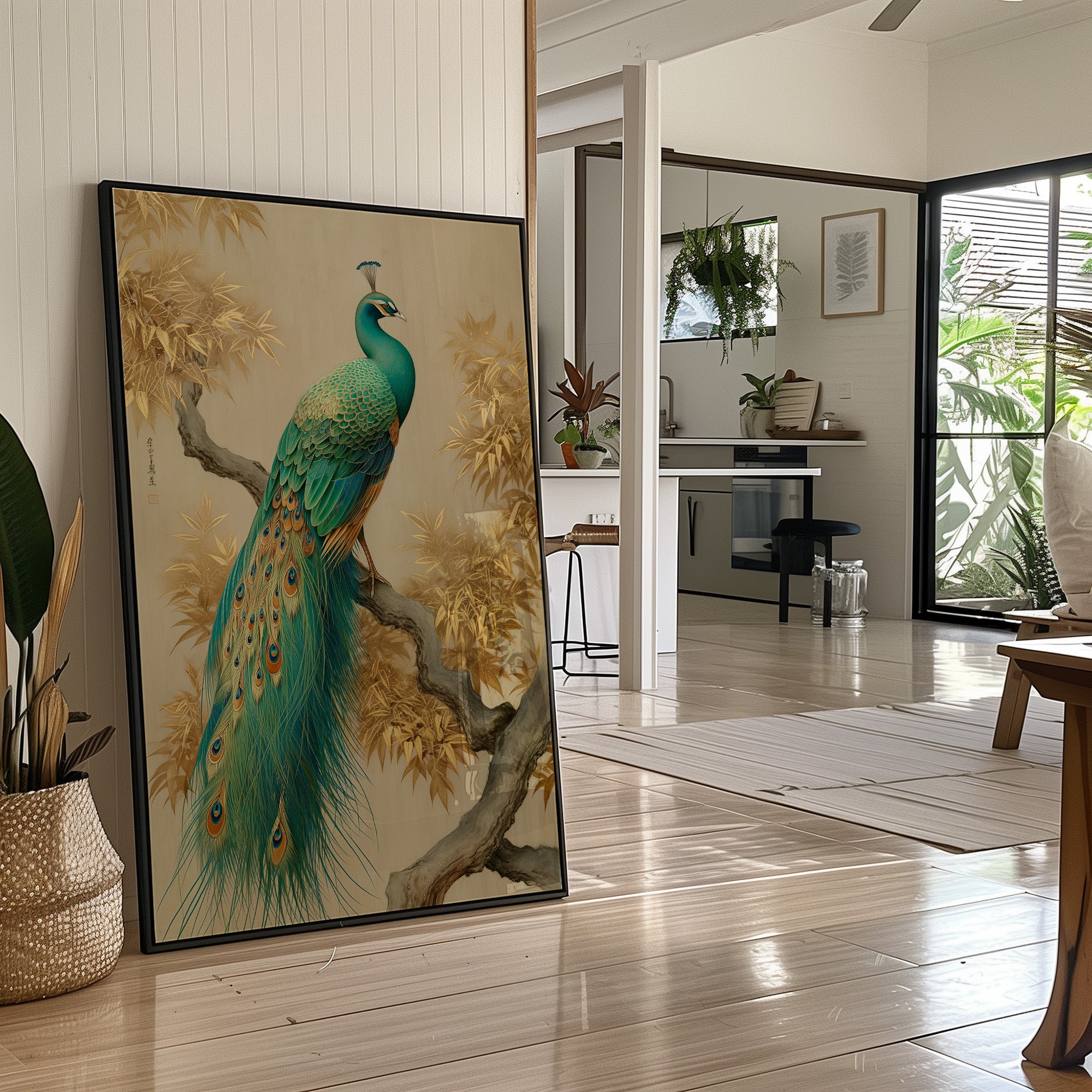 Sunlight streams across a serene Japanese-inspired scene, where a majestic peacock perches among delicate bamboo branches. The bird's iridescent turquoise plumage creates a stunning contrast against the soft golden background, each feather rendered with exquisite detail and grace. The composition balances refined elegance with natural beauty, capturing the essence of traditional Asian artistry through its careful brushwork and harmonious color palette. This piece would bring sophisticated tranquility to a modern living room or add cultured charm to a home office space.