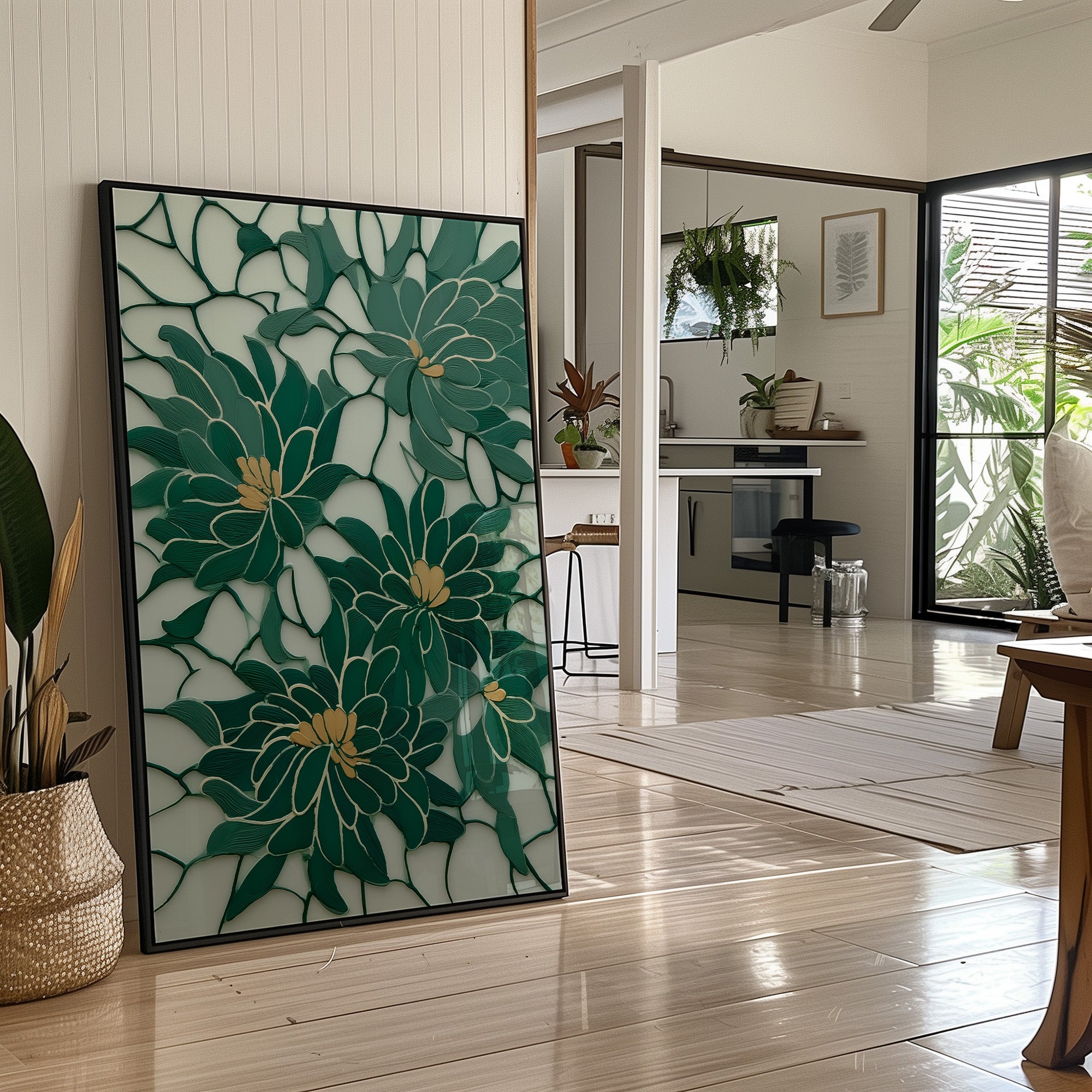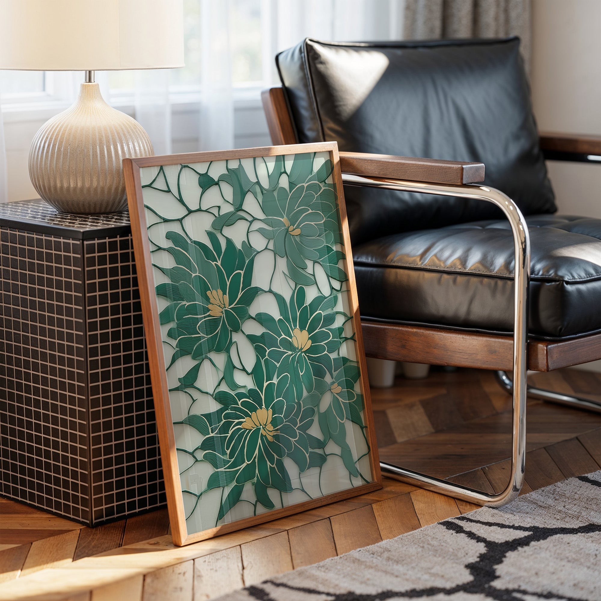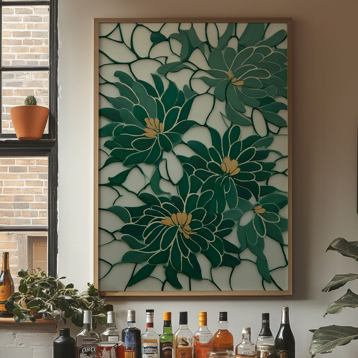 Sunlight streams across hardwood floors, illuminating an elegant botanical piece where emerald petals unfurl against cream-colored silk. The modern floral design captures the essence of nature's geometry, with layered jade blooms creating depth and movement through overlapping forms. Golden accents catch the light, adding warmth to the sophisticated composition that perfectly complements the mid-century modern furniture and contemporary decor surrounding it. This piece would elevate any modern living space, bringing a touch of organic elegance to a home office, reading nook, or sophisticated sitting room.