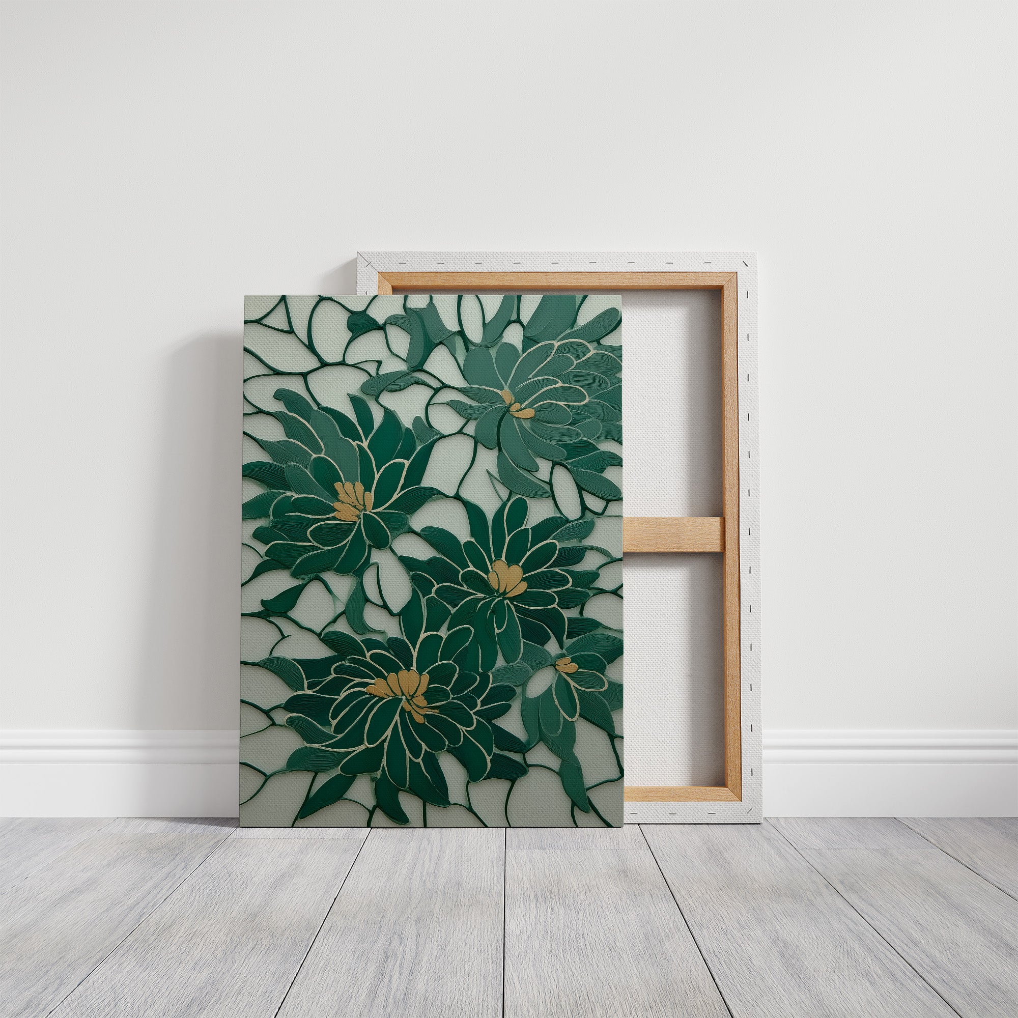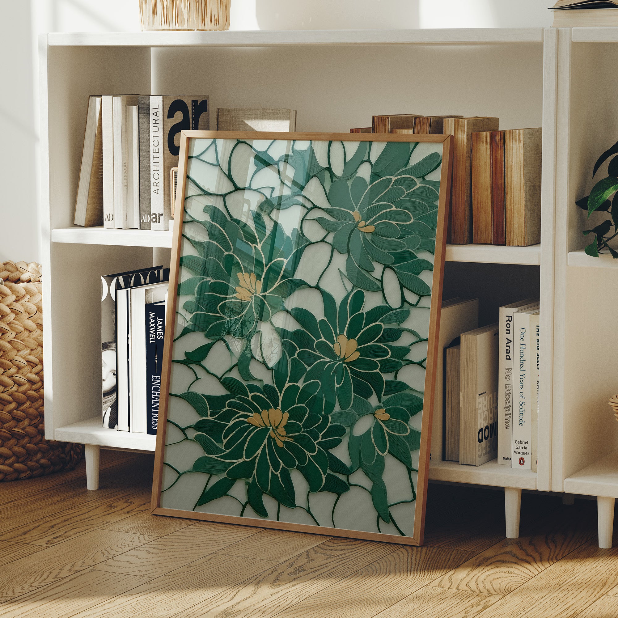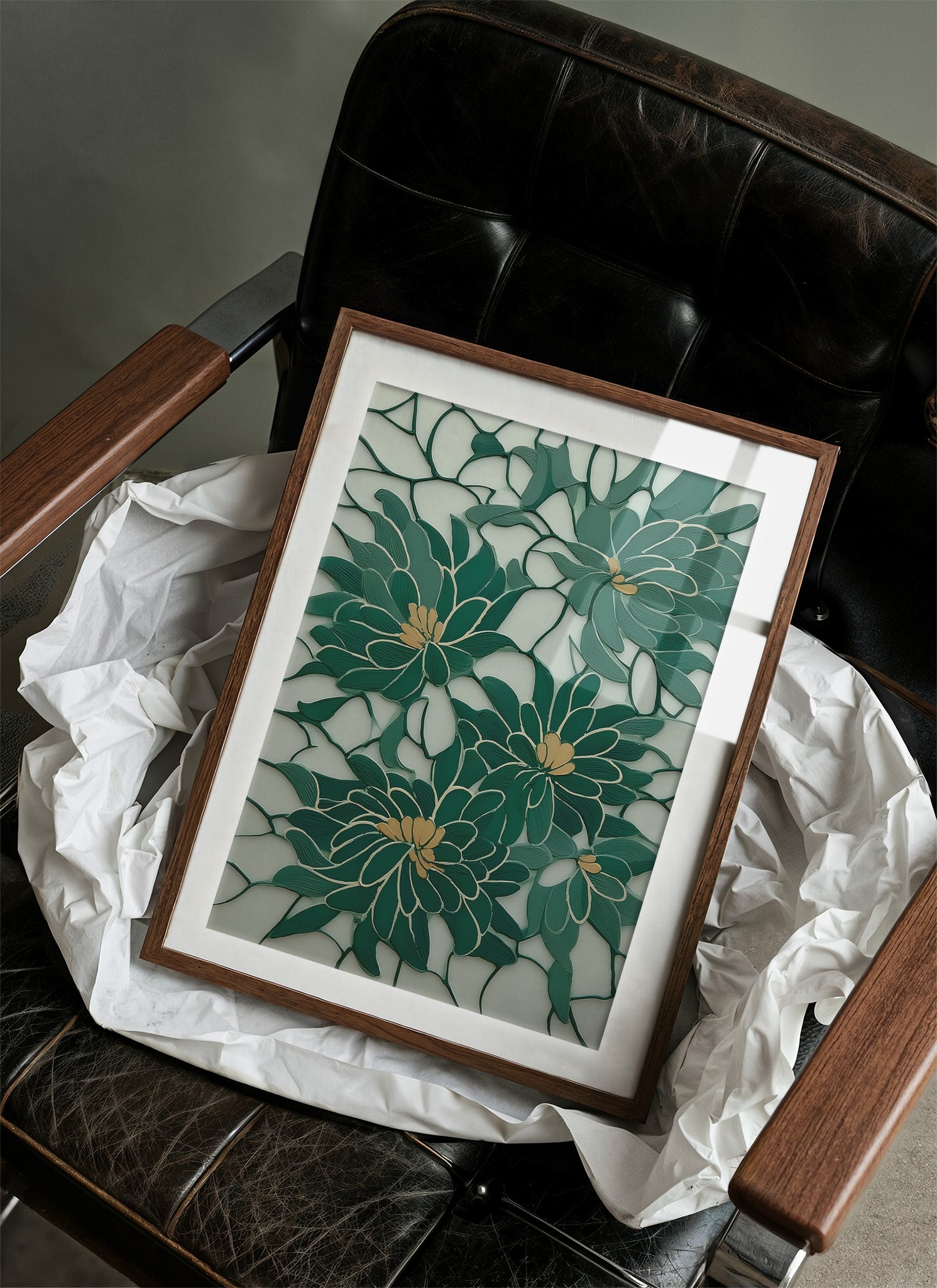 Sunlight streams across hardwood floors, illuminating an elegant botanical piece where emerald petals unfurl against cream-colored silk. The modern floral design captures the essence of nature's geometry, with layered jade blooms creating depth and movement through overlapping forms. Golden accents catch the light, adding warmth to the sophisticated composition that perfectly complements the mid-century modern furniture and contemporary decor surrounding it. This piece would elevate any modern living space, bringing a touch of organic elegance to a home office, reading nook, or sophisticated sitting room.