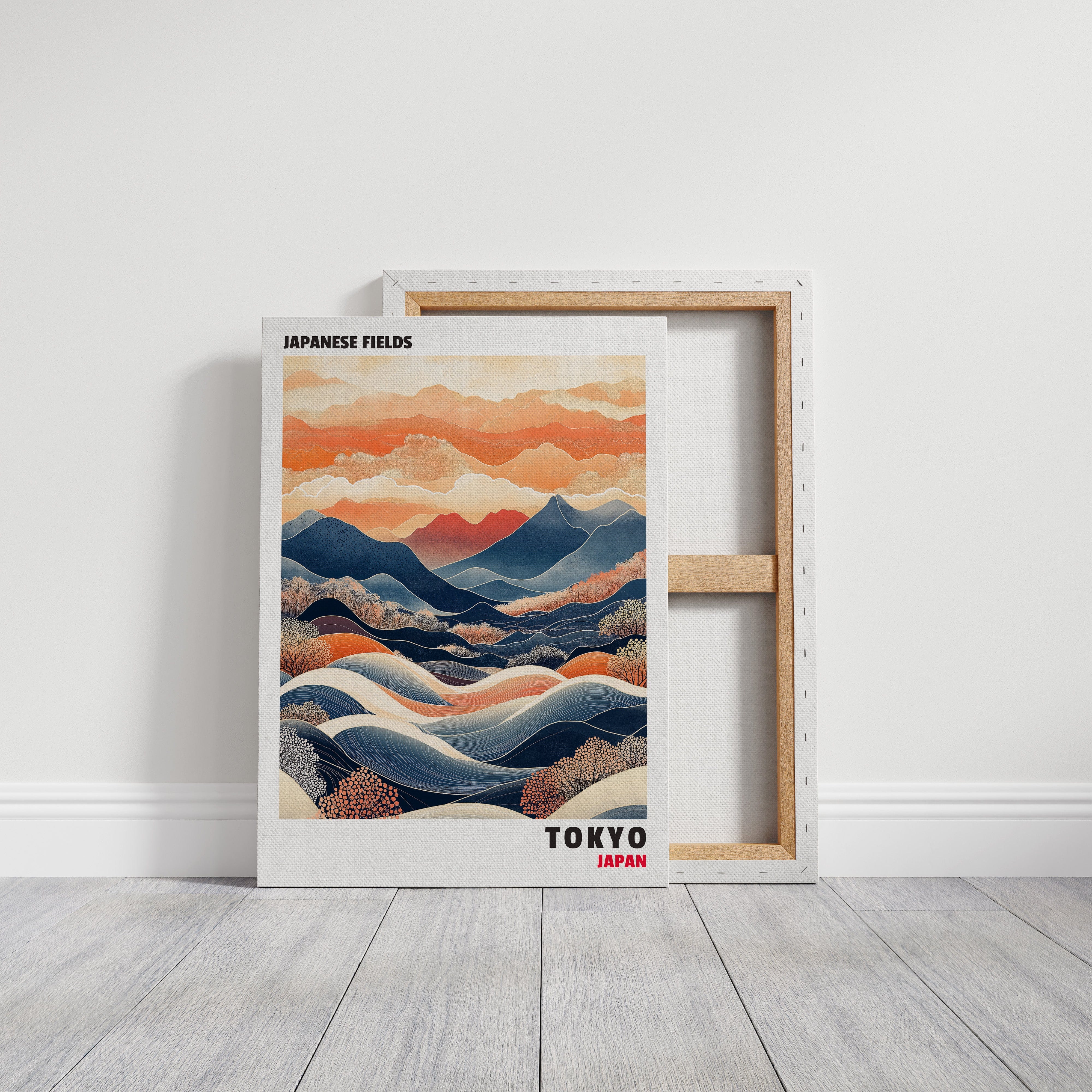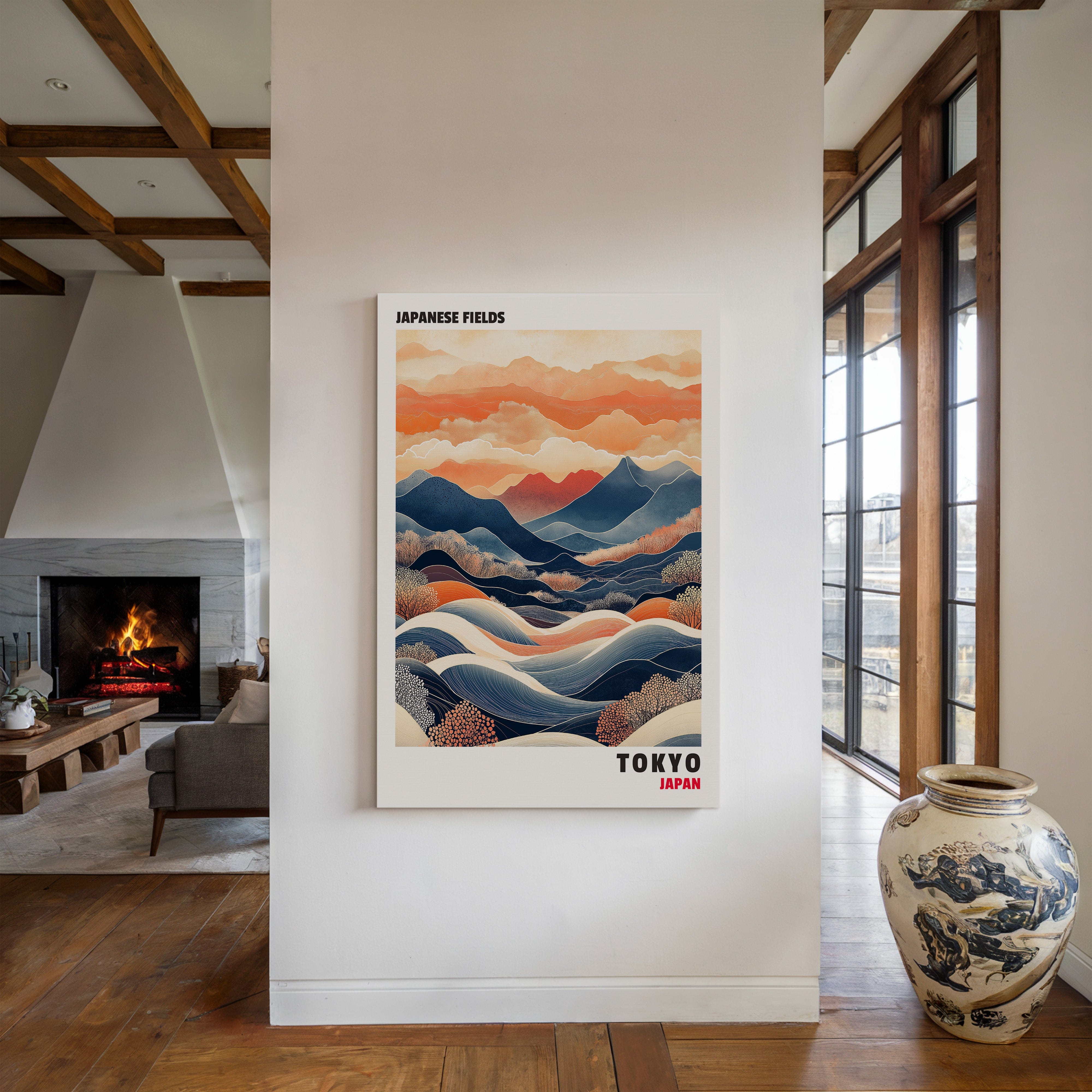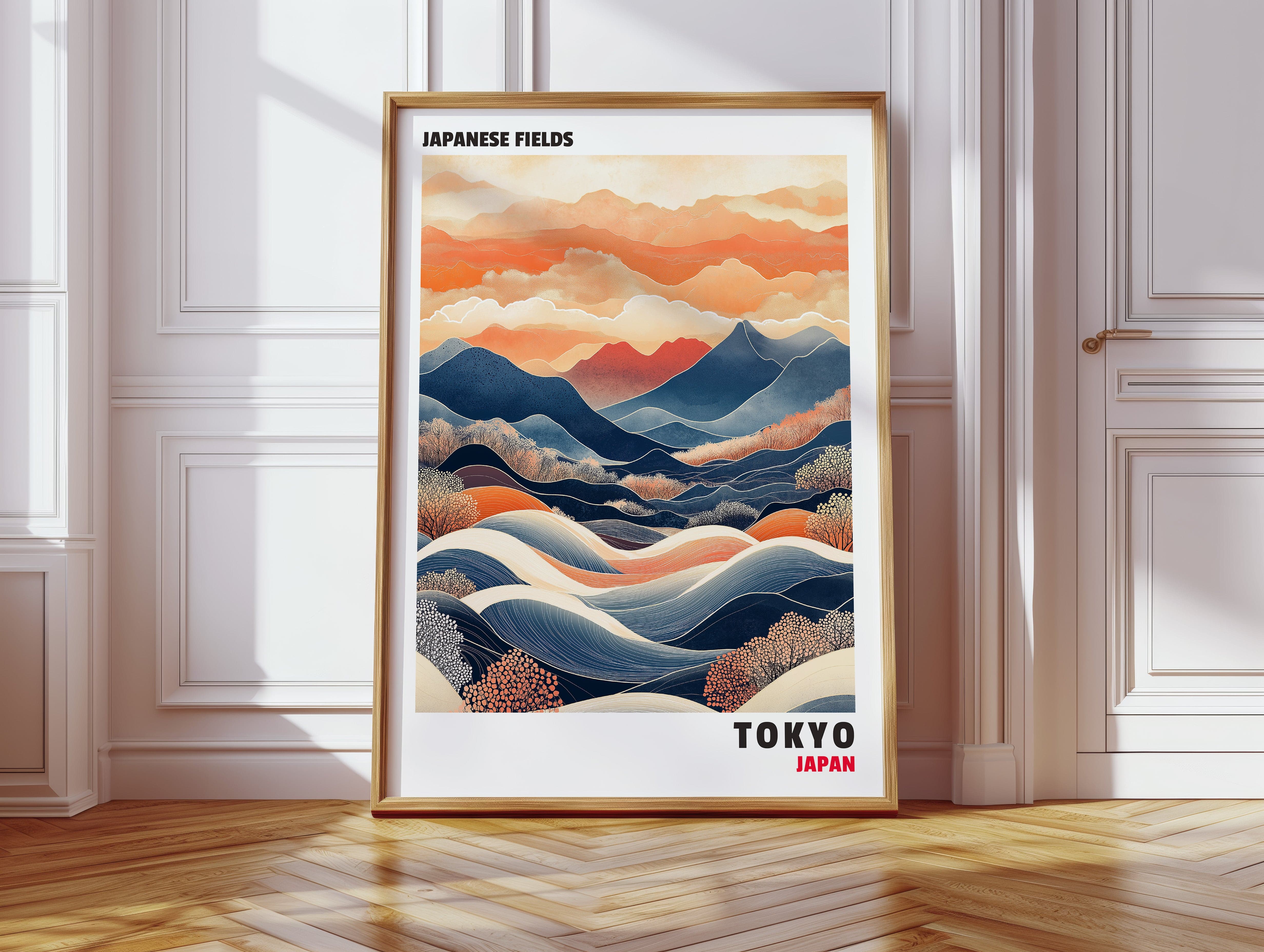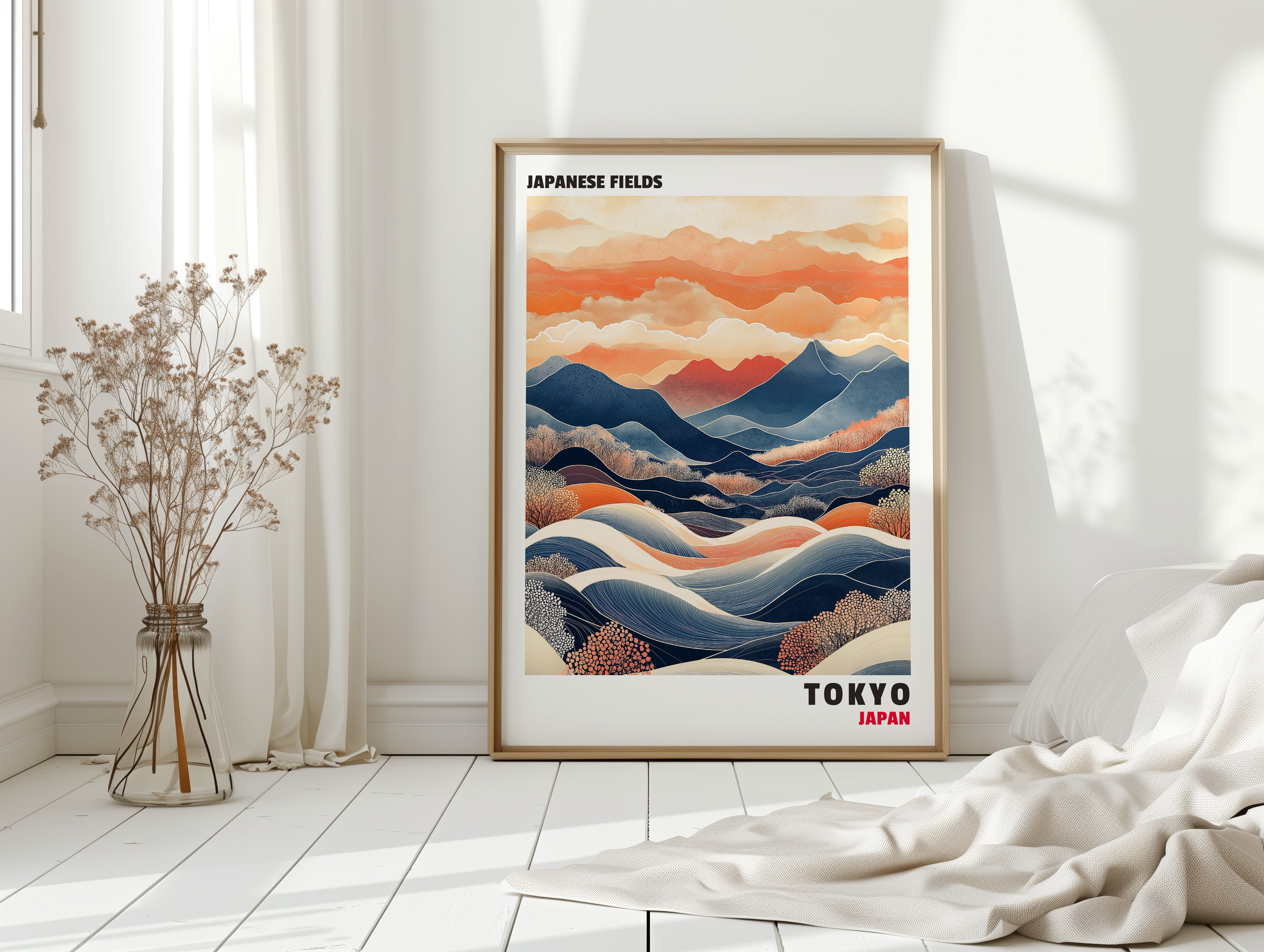 This captivating Japanese landscape print blends traditional and contemporary styles, featuring rolling hills, vibrant mountains, and dynamic waves of color. The contrast between deep blues and warm oranges evokes a sense of tranquility and movement, making it an ideal statement piece for any space inspired by Japanese aesthetics and nature’s harmony.