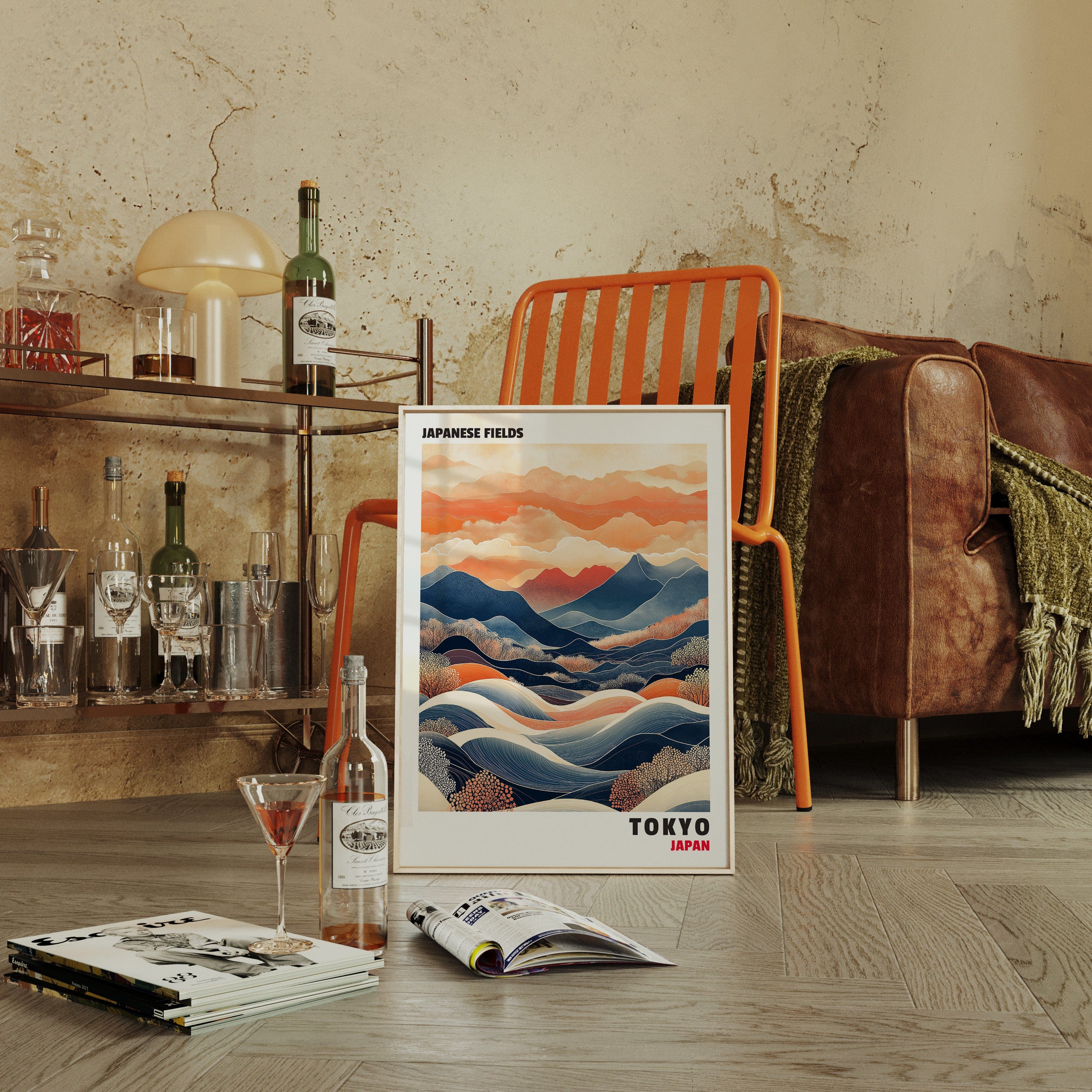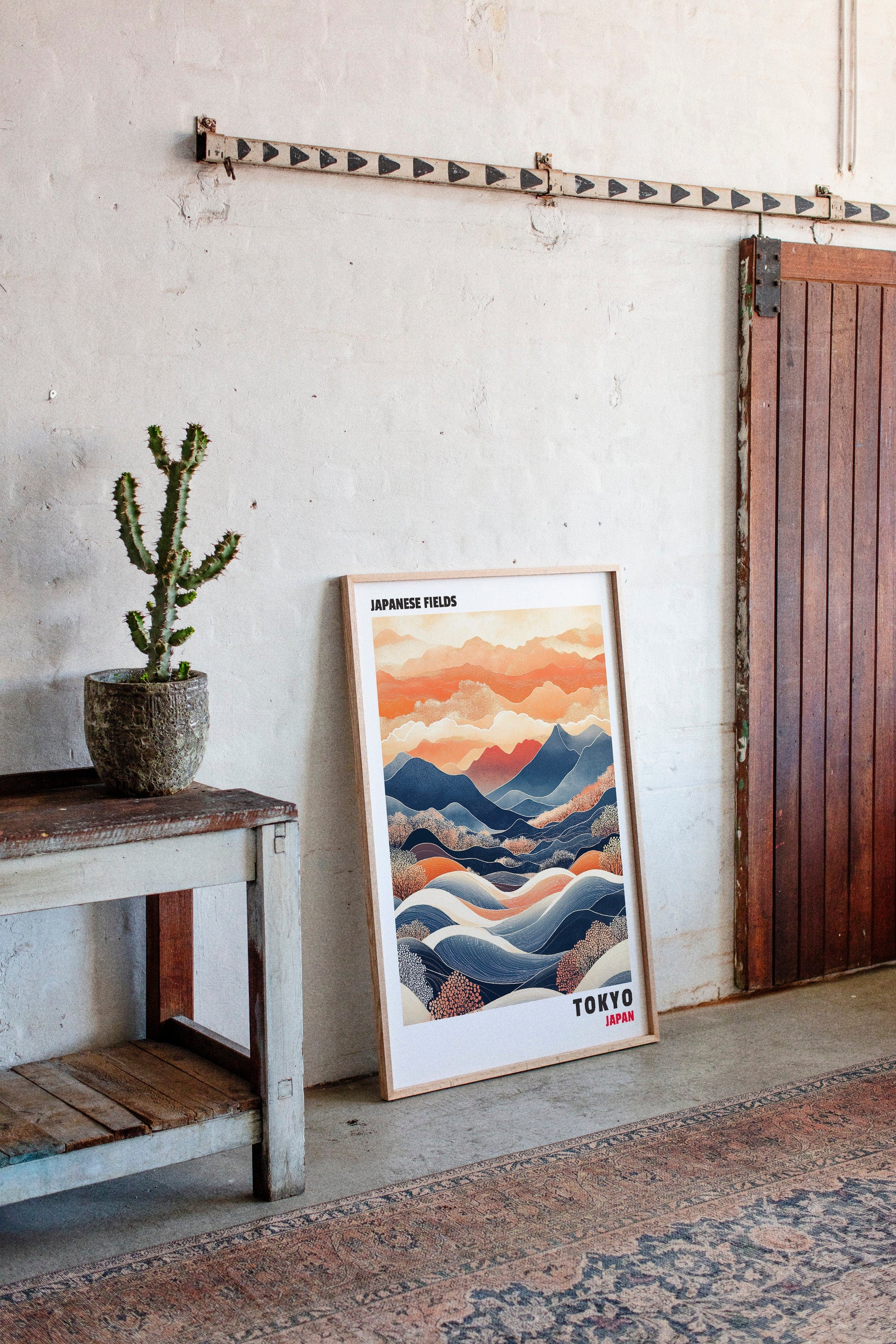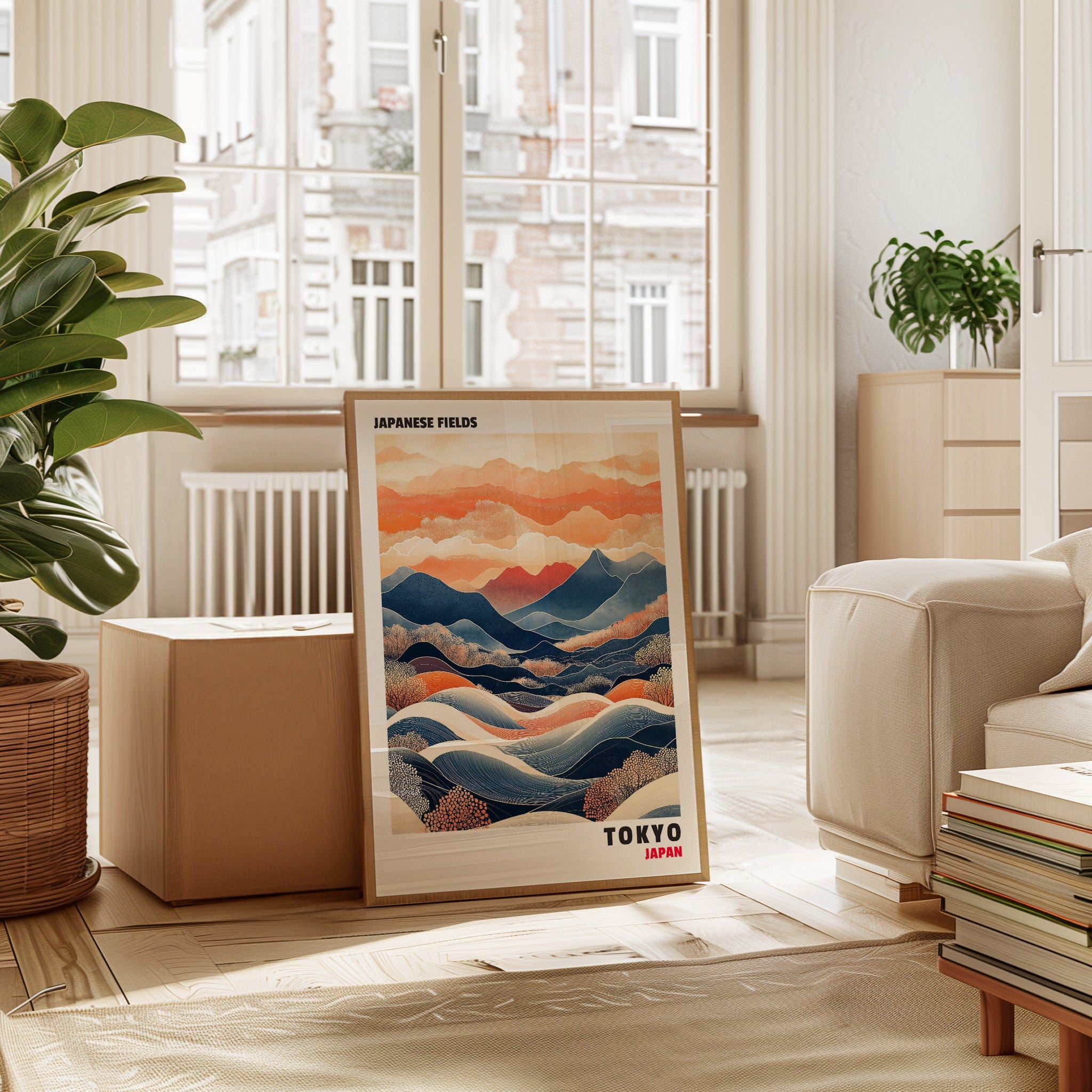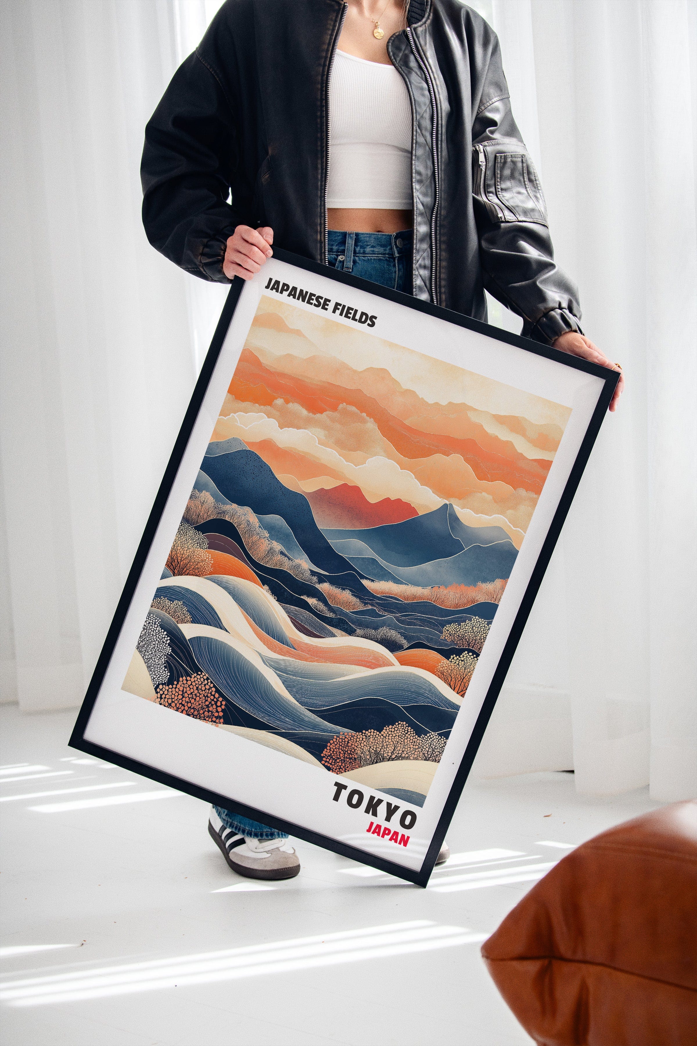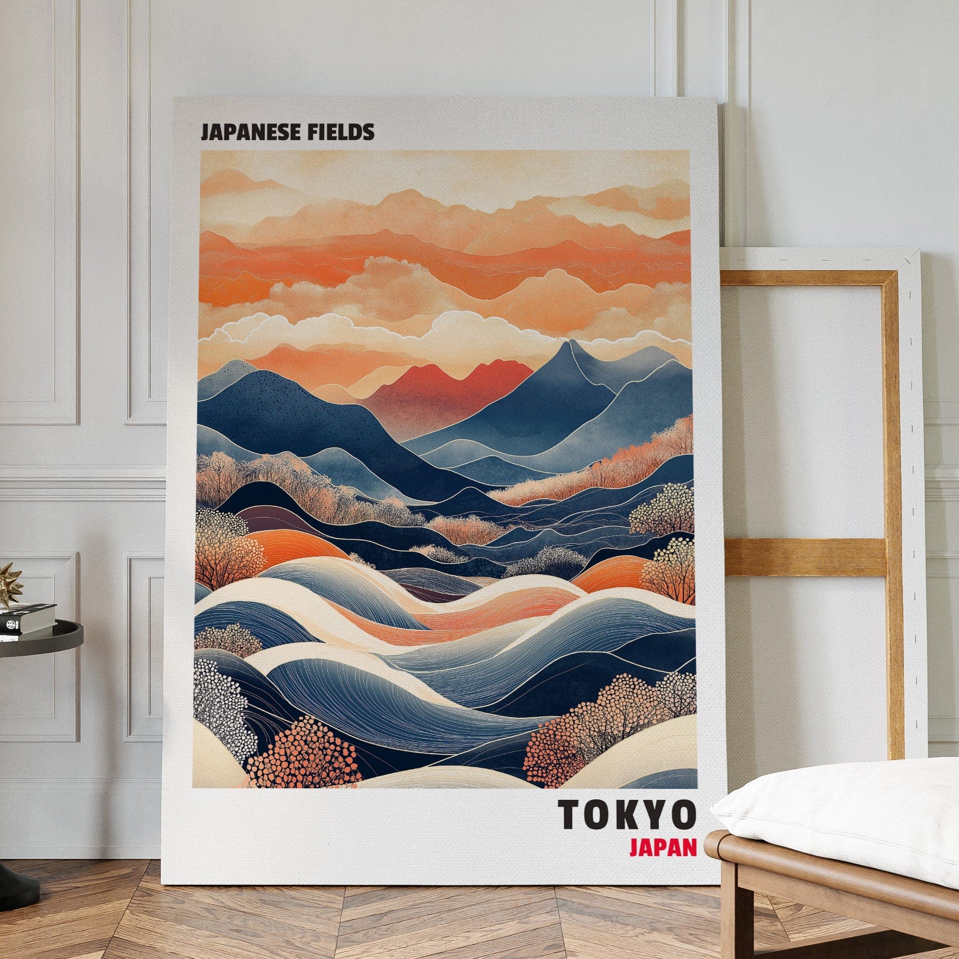 This captivating Japanese landscape print blends traditional and contemporary styles, featuring rolling hills, vibrant mountains, and dynamic waves of color. The contrast between deep blues and warm oranges evokes a sense of tranquility and movement, making it an ideal statement piece for any space inspired by Japanese aesthetics and nature’s harmony.