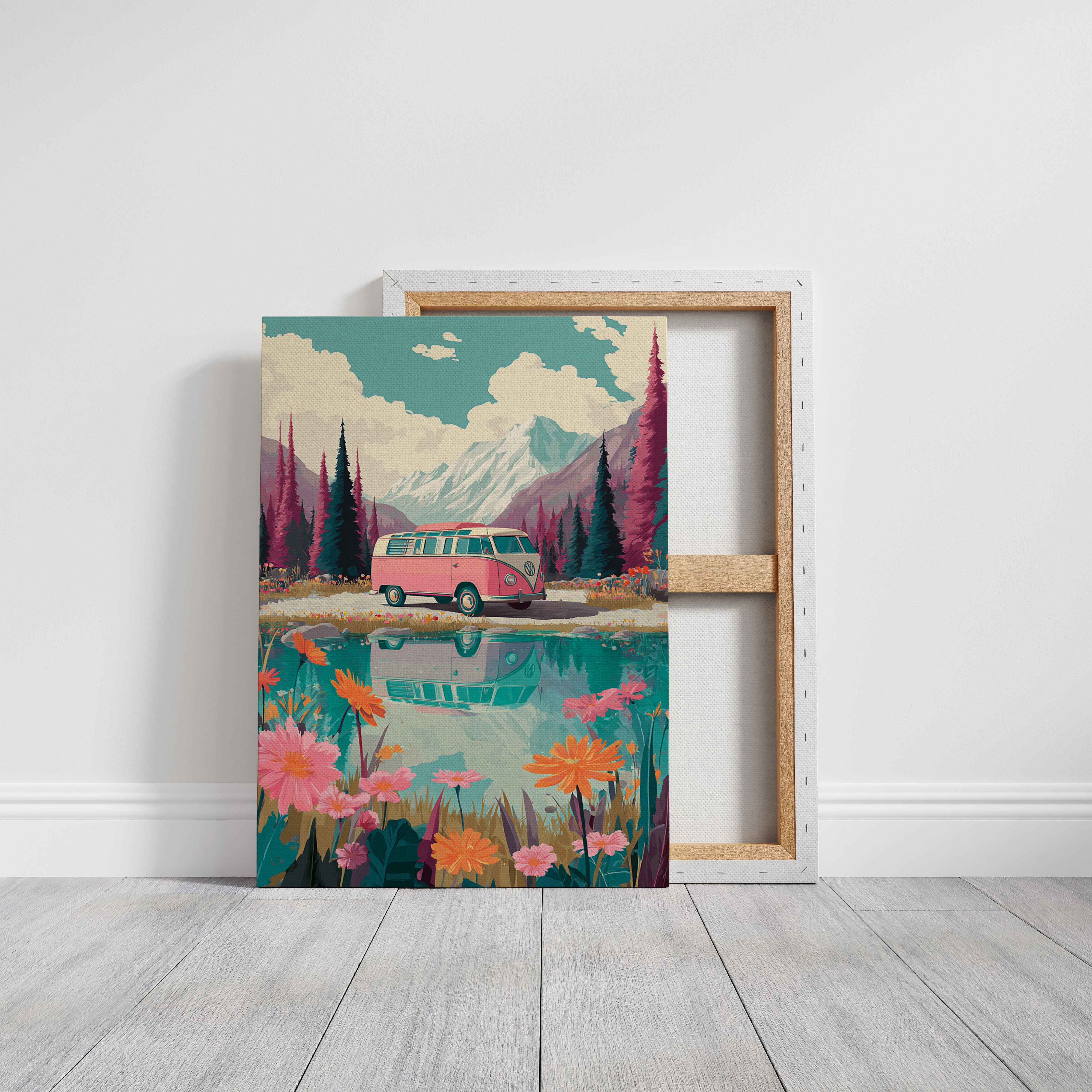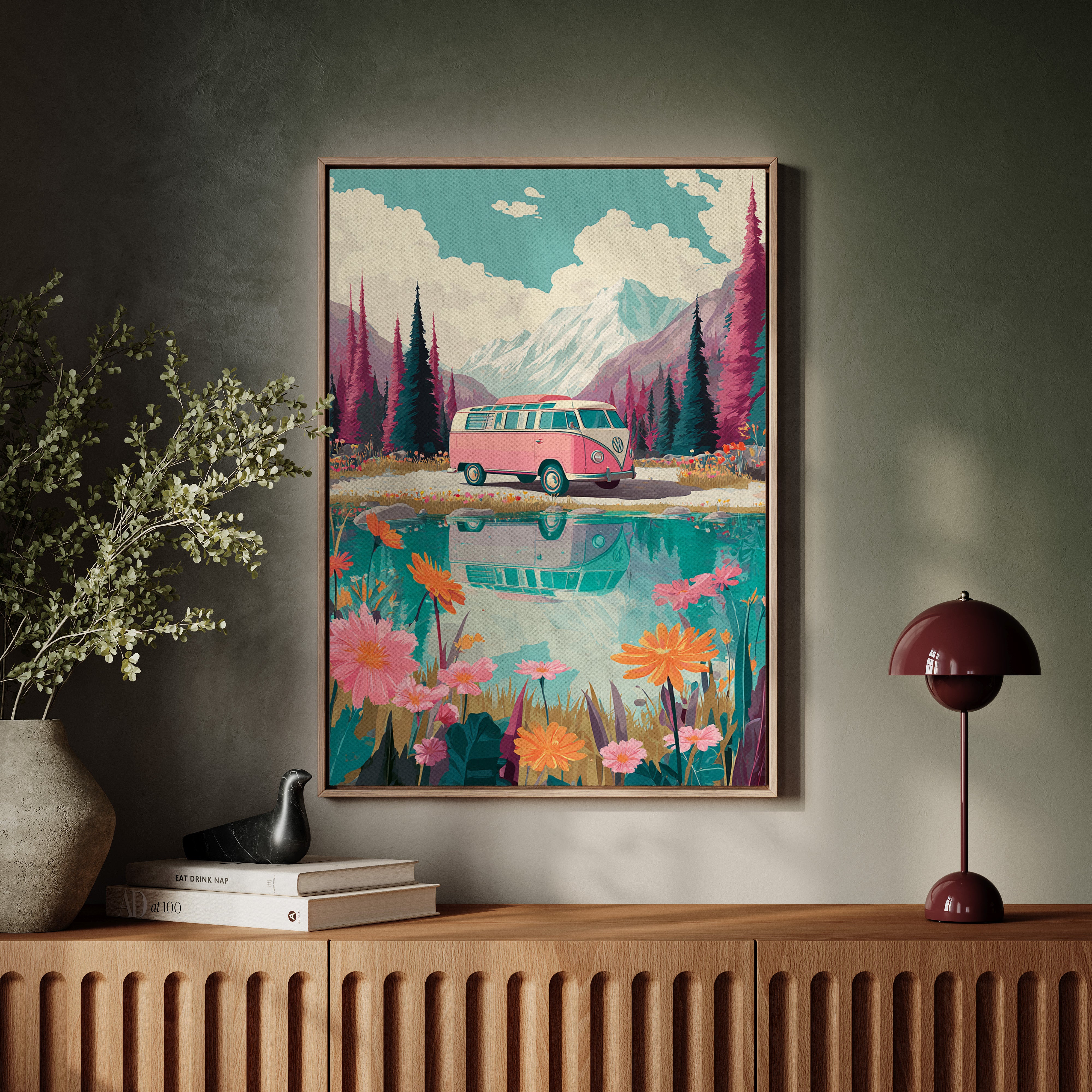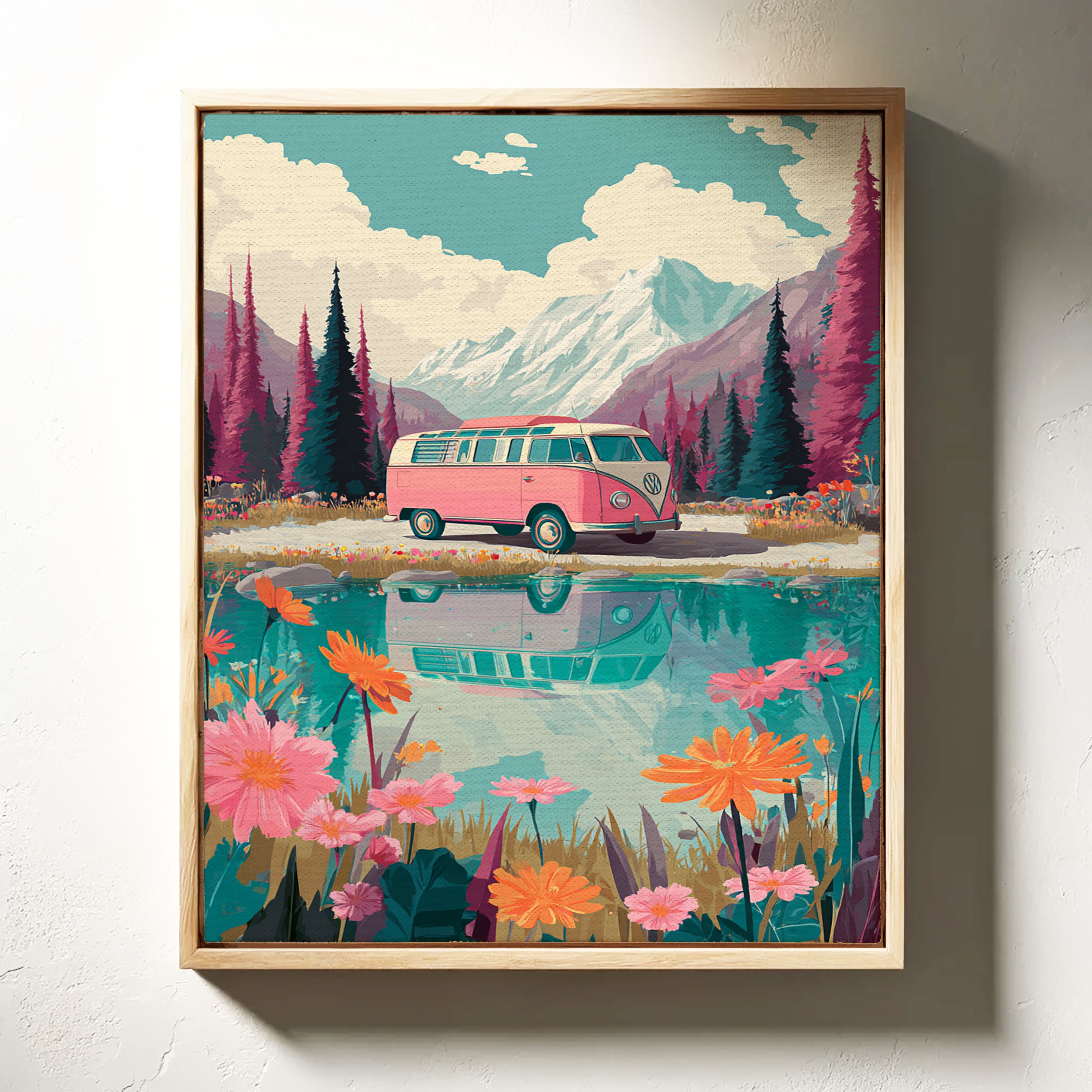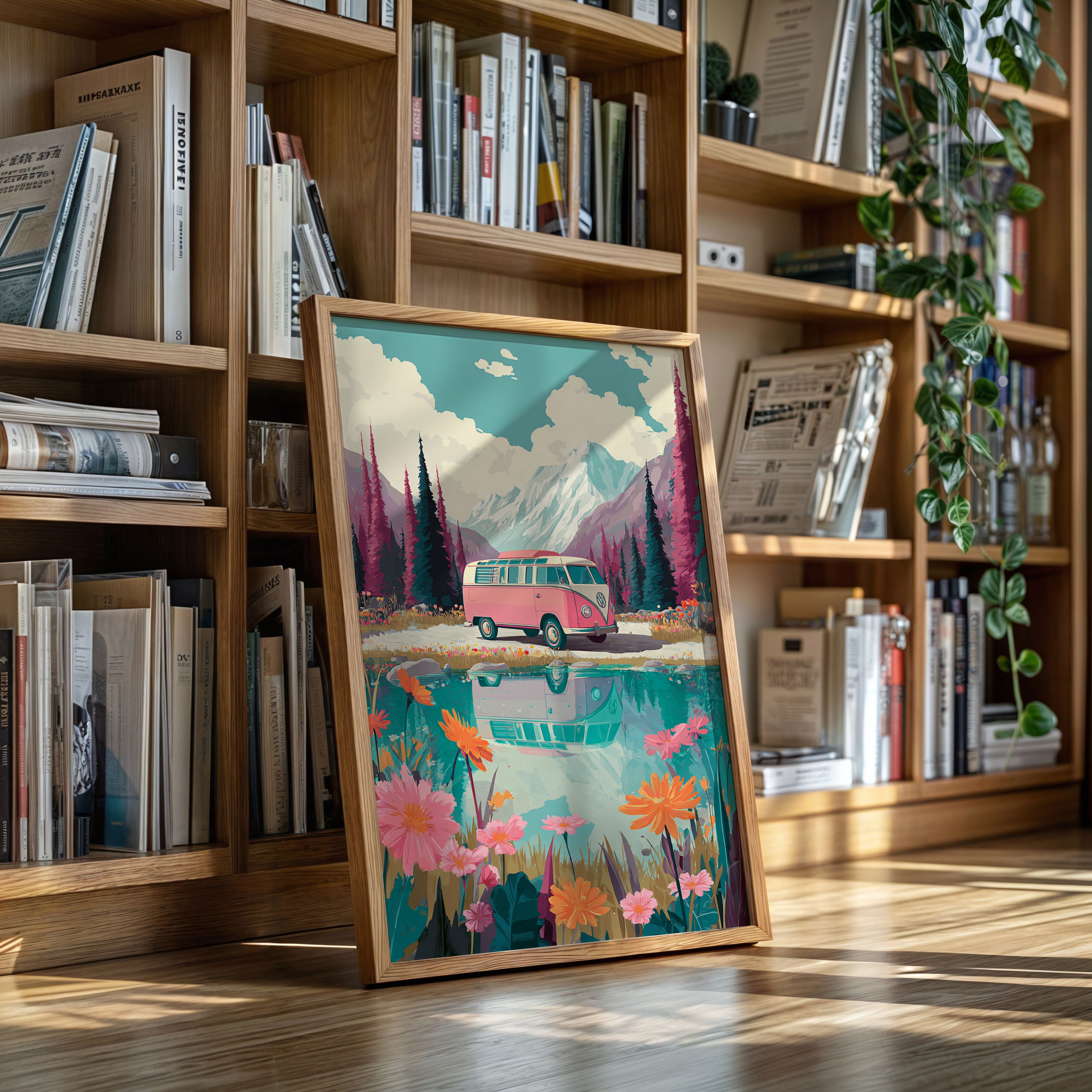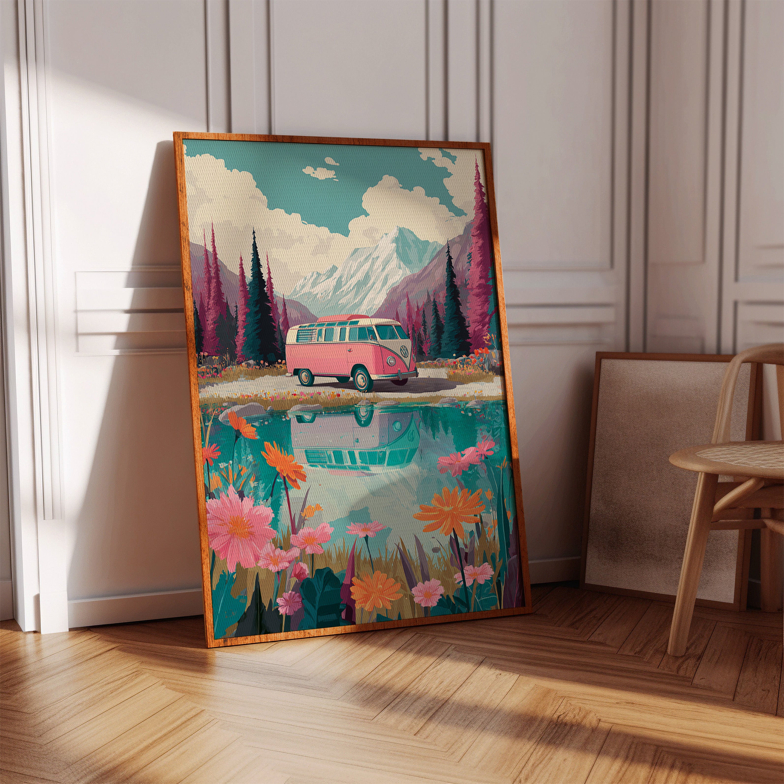 Beneath a sky painted in tranquil blues, a vintage van rests beside a shimmering lake, its vibrant hues harmonizing with the wildflowers that dance along the shore. This piece captures the essence of adventure and nostalgia found in the Artisanal collection. The mountains loom majestically in the background, their snowy peaks contrasting with the warm colors of the blooms, inviting viewers to reminisce about road trips and the beauty of nature's embrace. Perfect for a living room or a cozy reading nook, this scene invites contemplation and wanderlust.