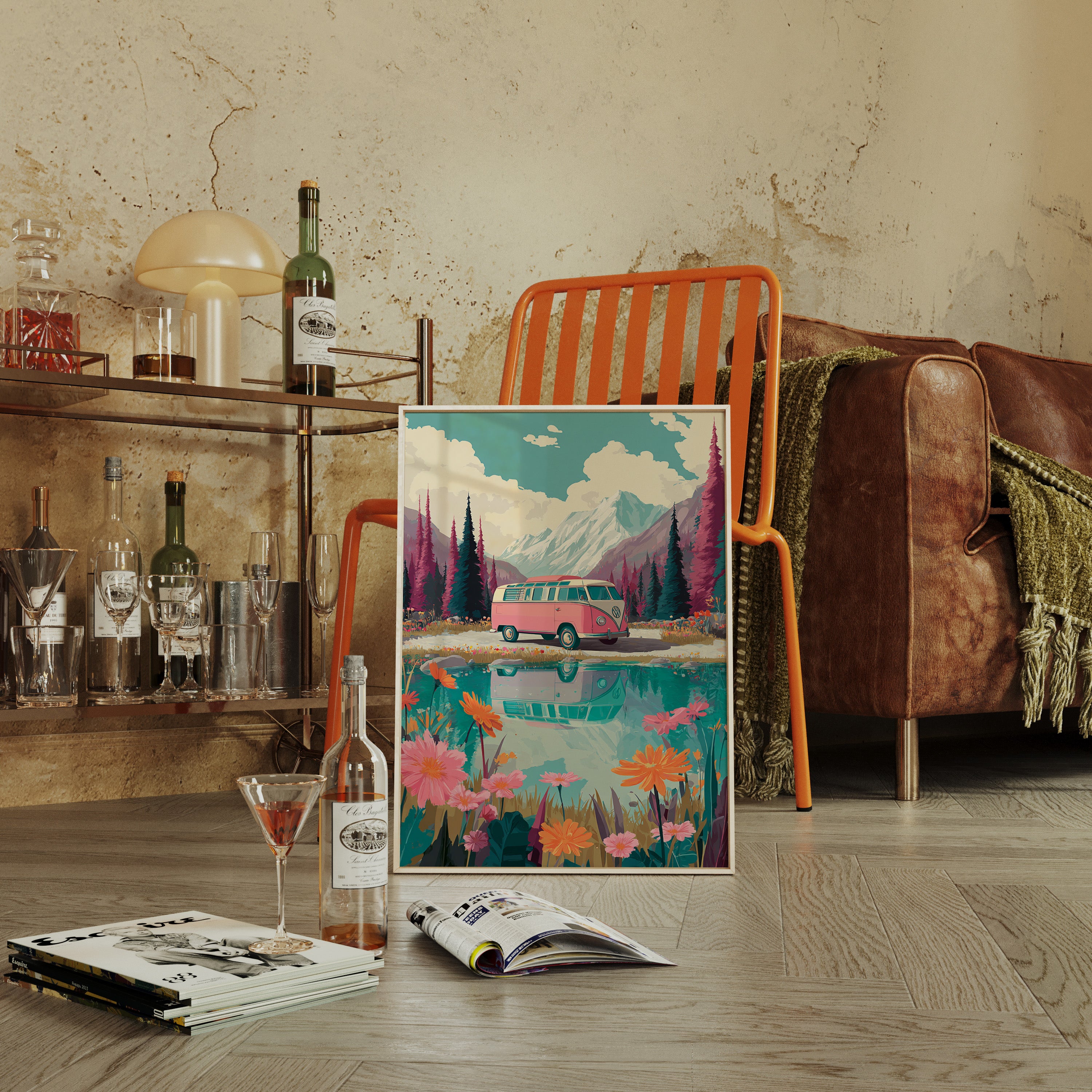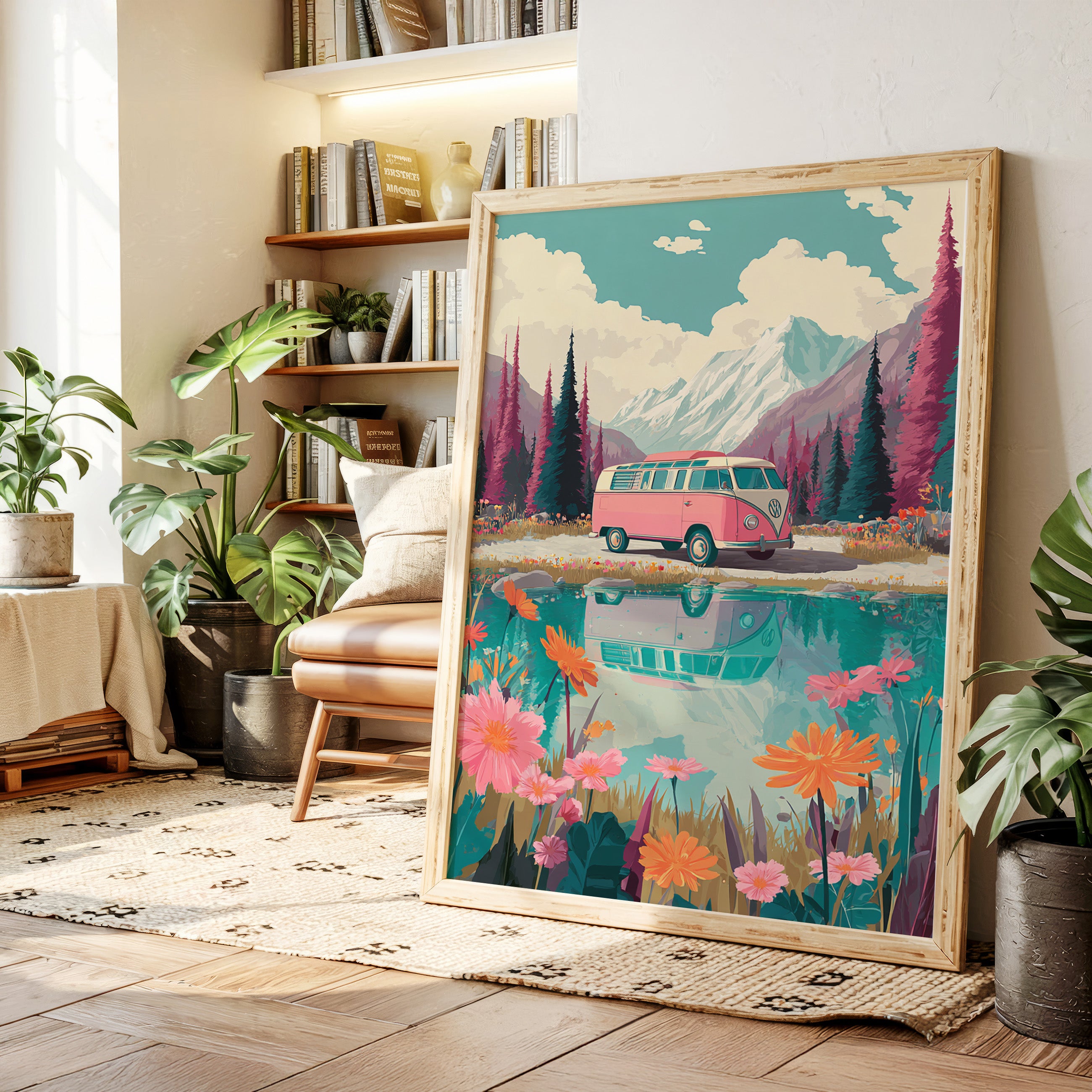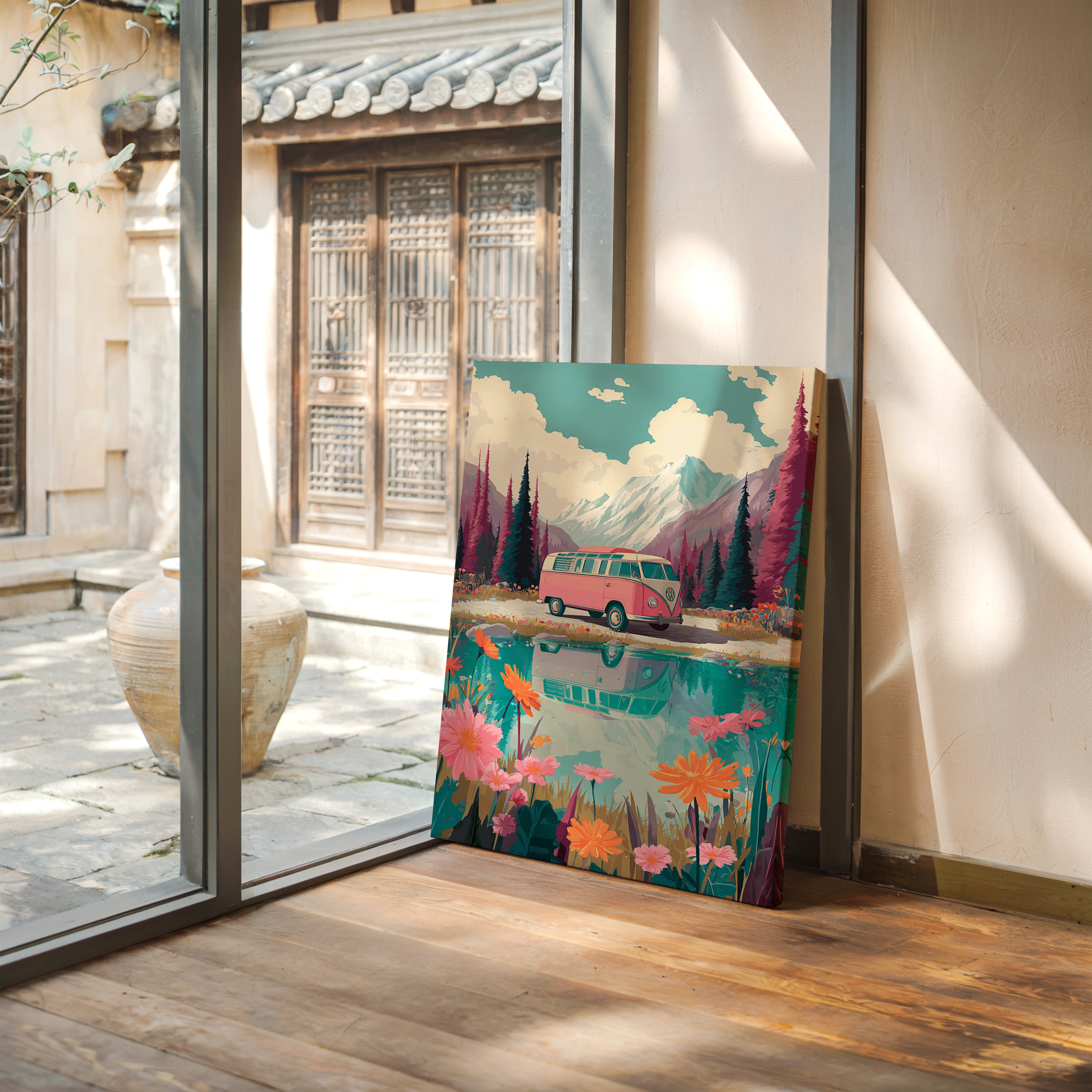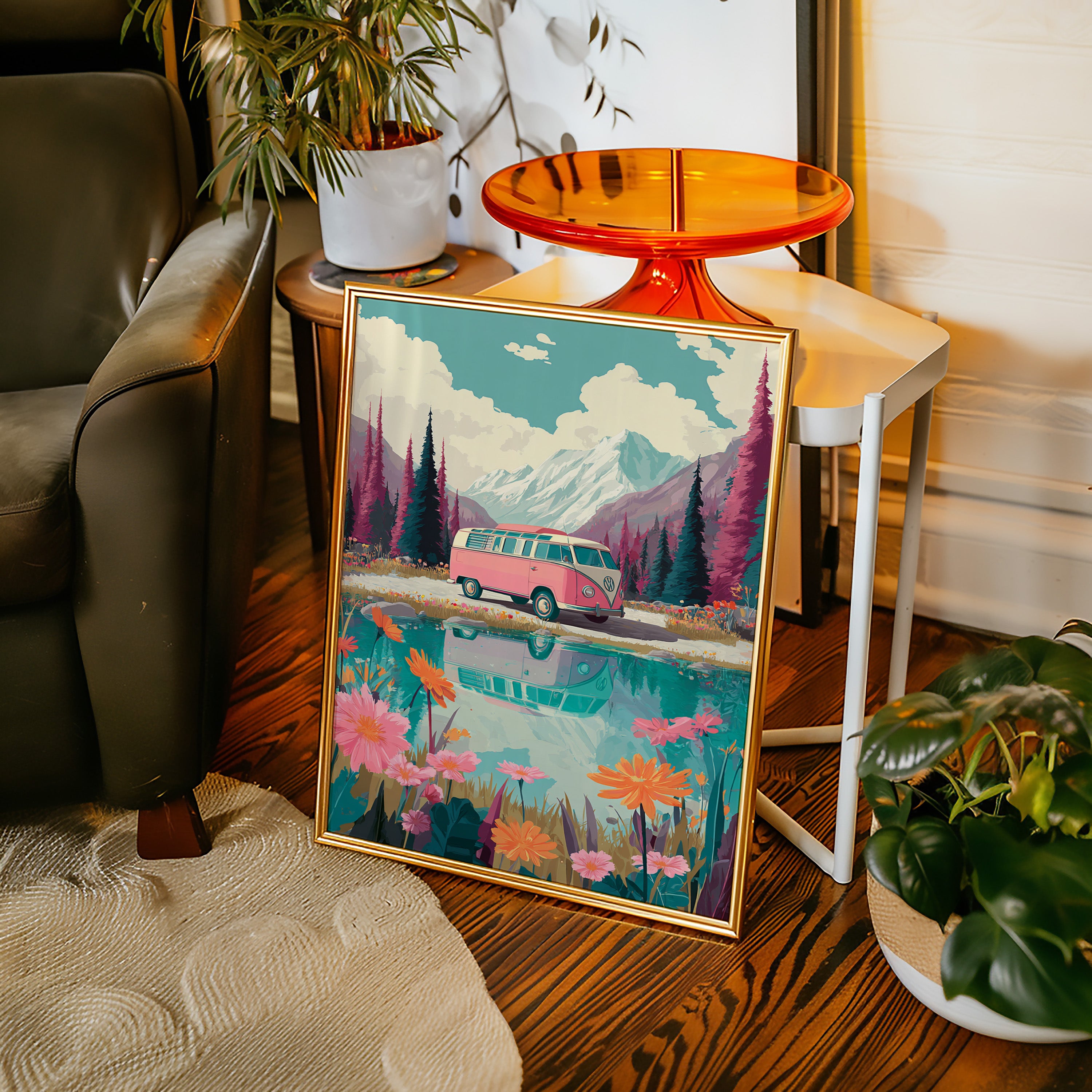 Beneath a sky painted in tranquil blues, a vintage van rests beside a shimmering lake, its vibrant hues harmonizing with the wildflowers that dance along the shore. This piece captures the essence of adventure and nostalgia found in the Artisanal collection. The mountains loom majestically in the background, their snowy peaks contrasting with the warm colors of the blooms, inviting viewers to reminisce about road trips and the beauty of nature's embrace. Perfect for a living room or a cozy reading nook, this scene invites contemplation and wanderlust.
