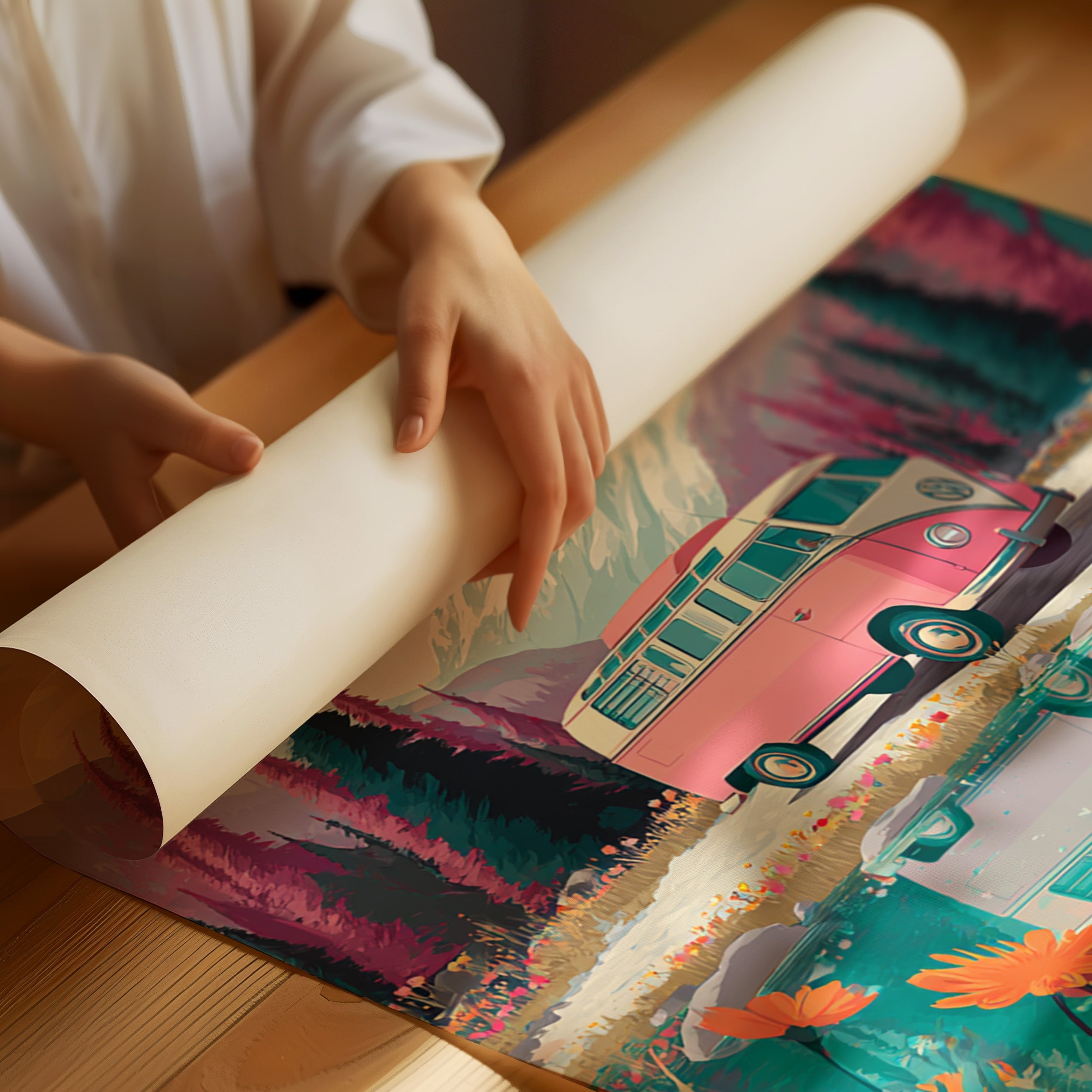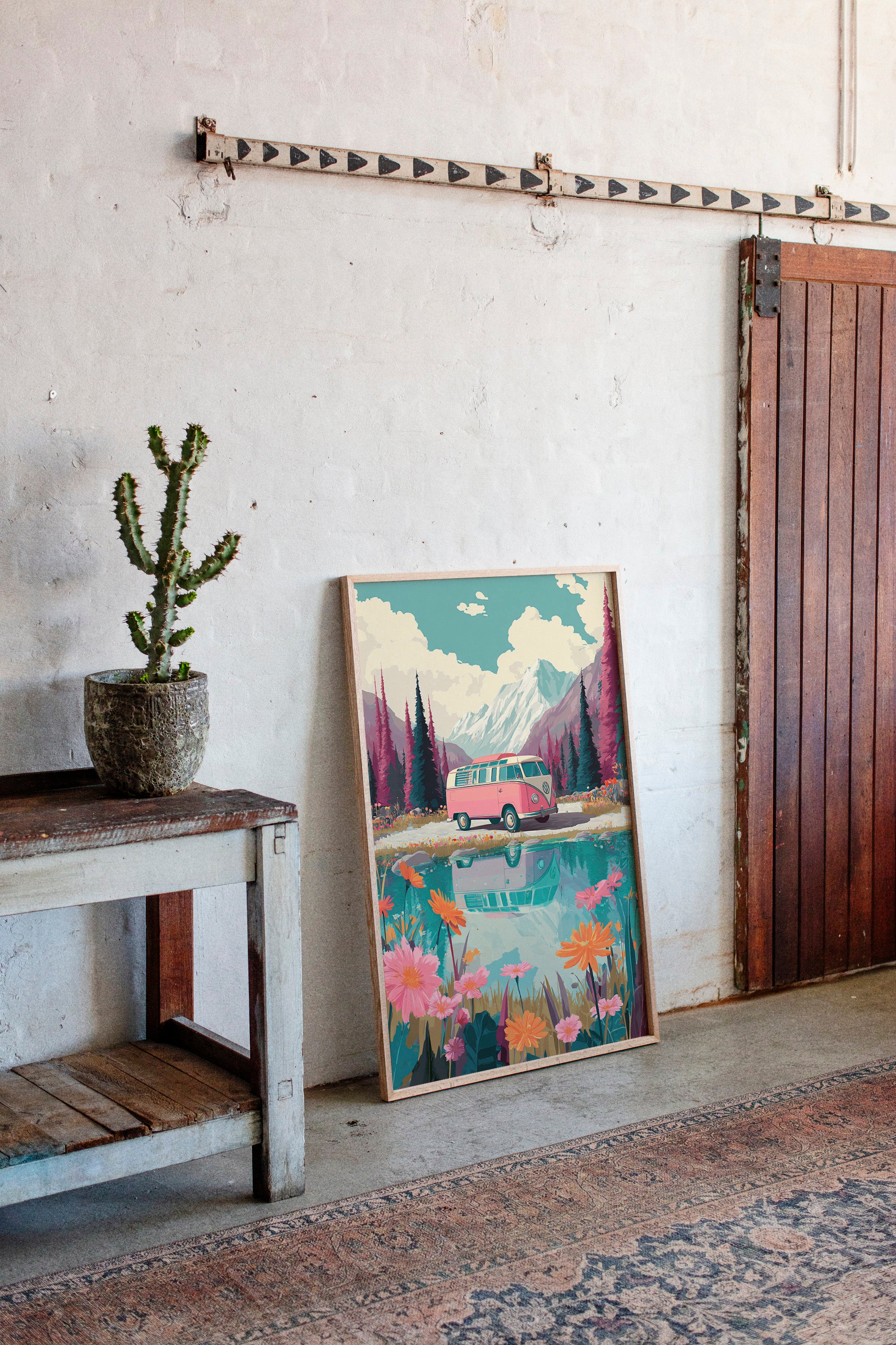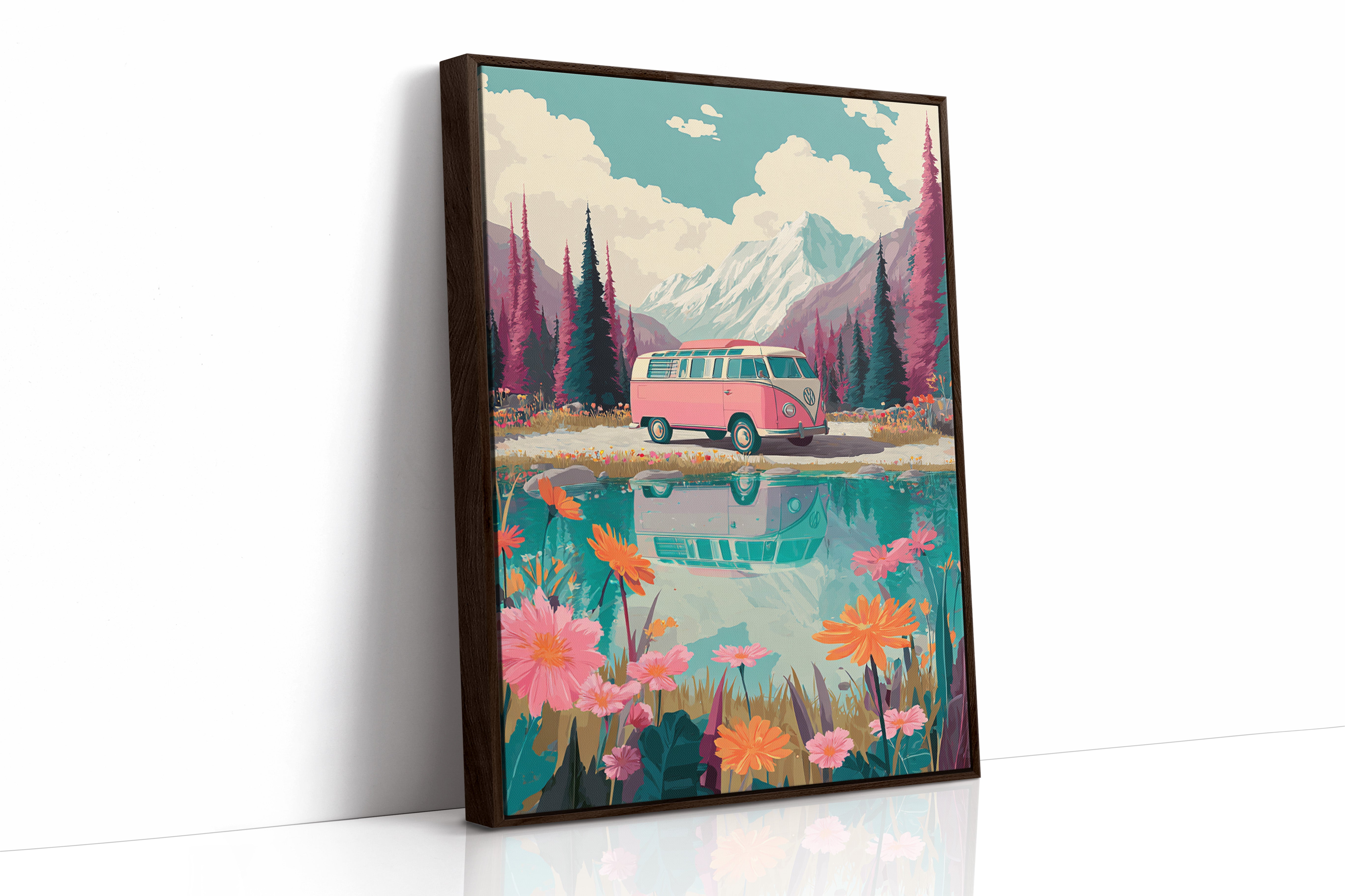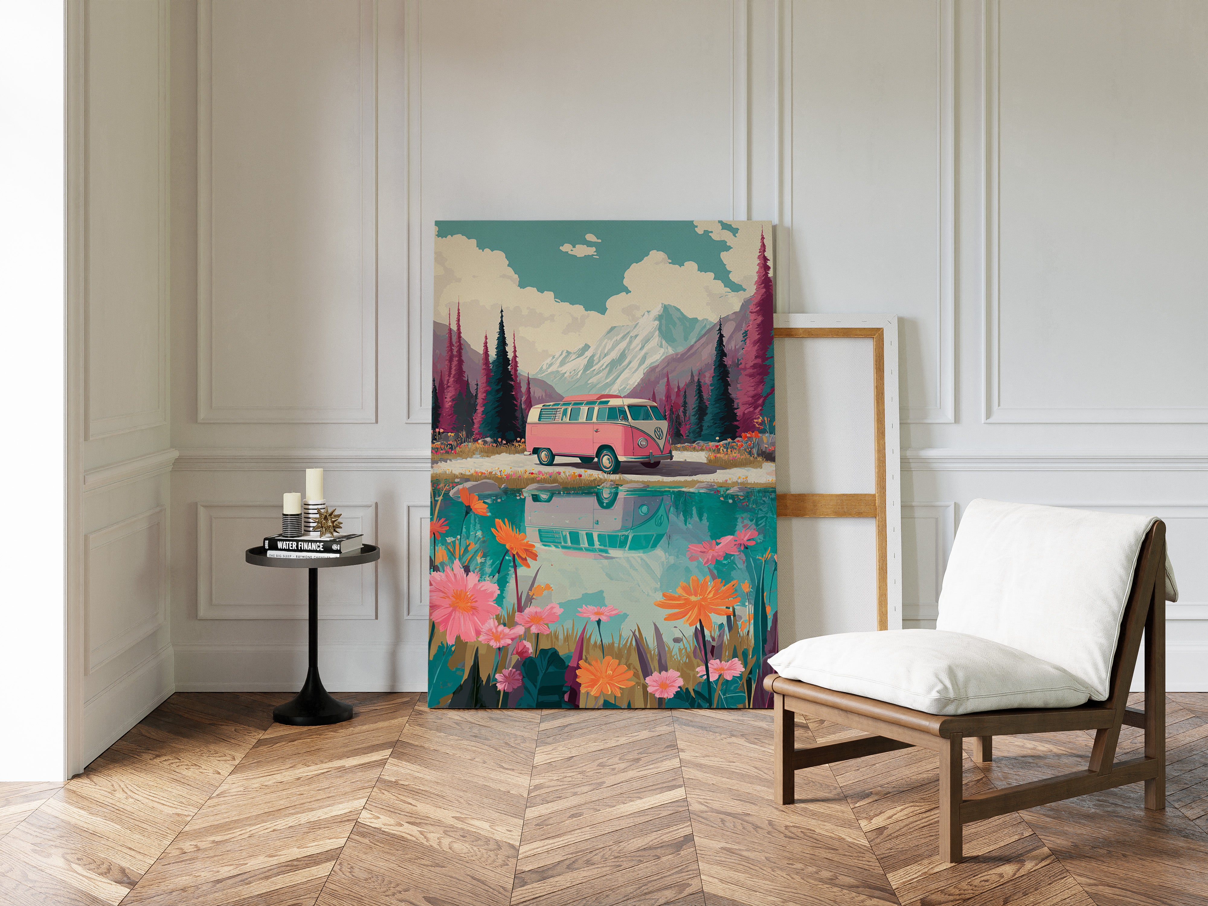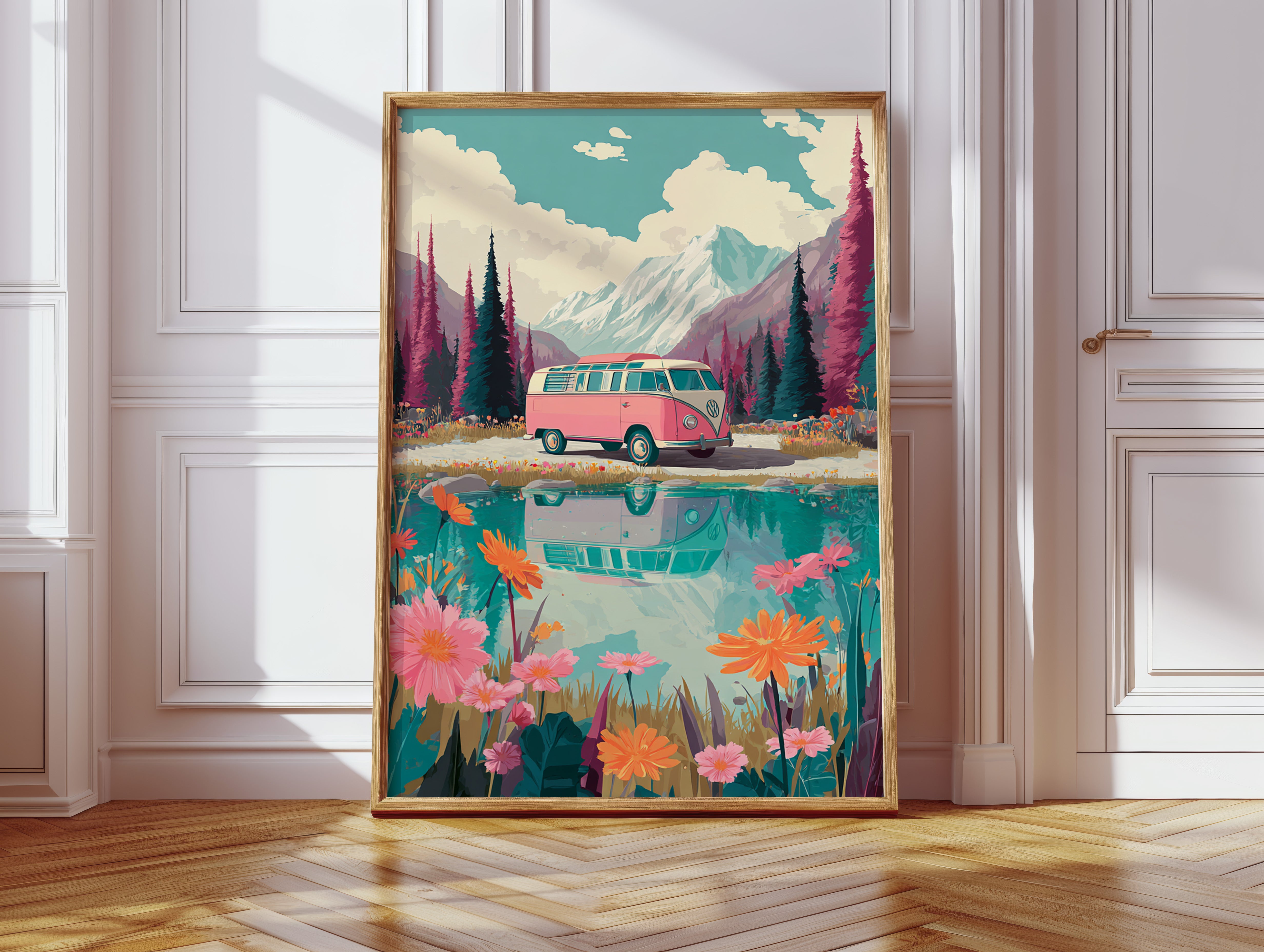 Beneath a sky painted in tranquil blues, a vintage van rests beside a shimmering lake, its vibrant hues harmonizing with the wildflowers that dance along the shore. This piece captures the essence of adventure and nostalgia found in the Artisanal collection. The mountains loom majestically in the background, their snowy peaks contrasting with the warm colors of the blooms, inviting viewers to reminisce about road trips and the beauty of nature's embrace. Perfect for a living room or a cozy reading nook, this scene invites contemplation and wanderlust.